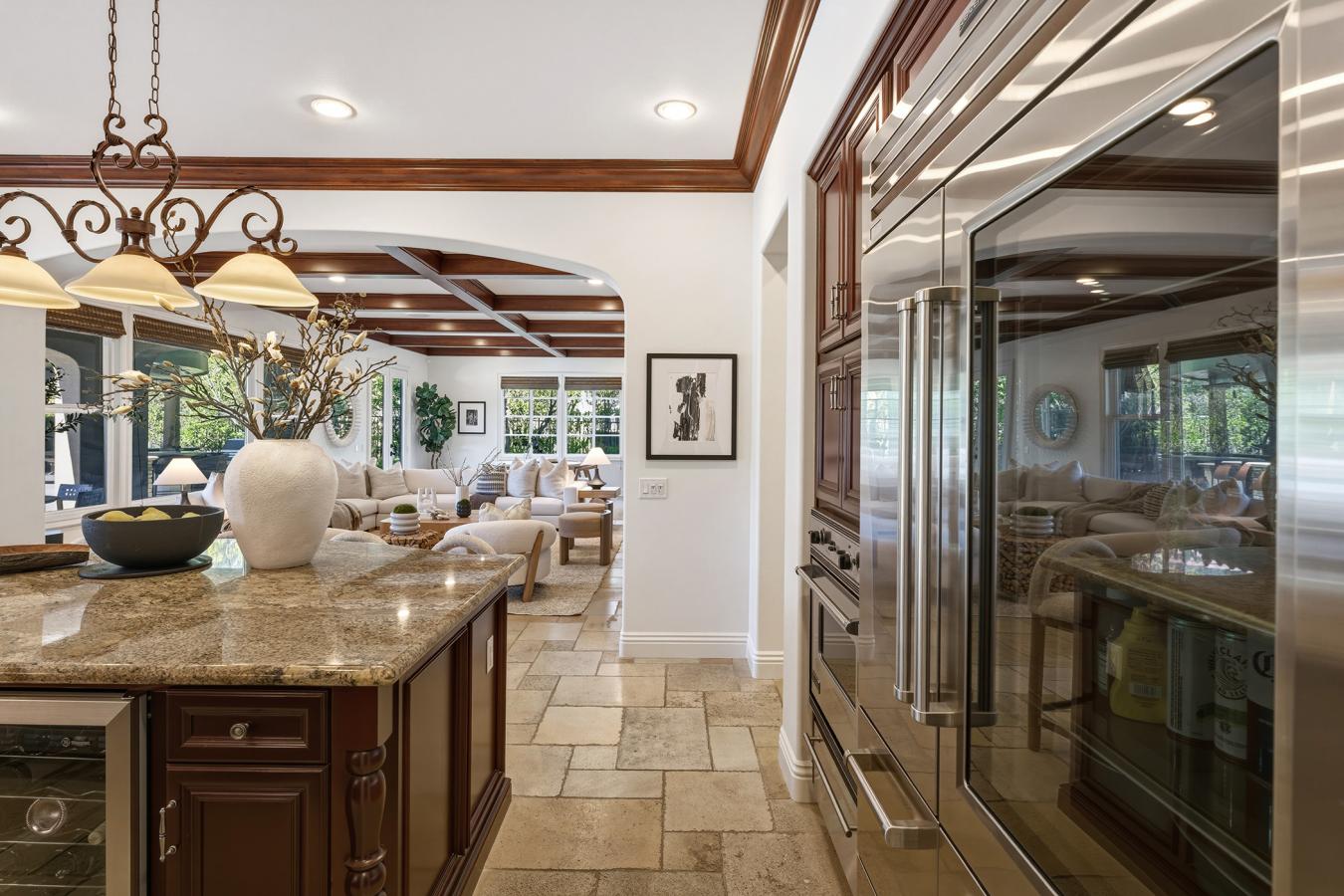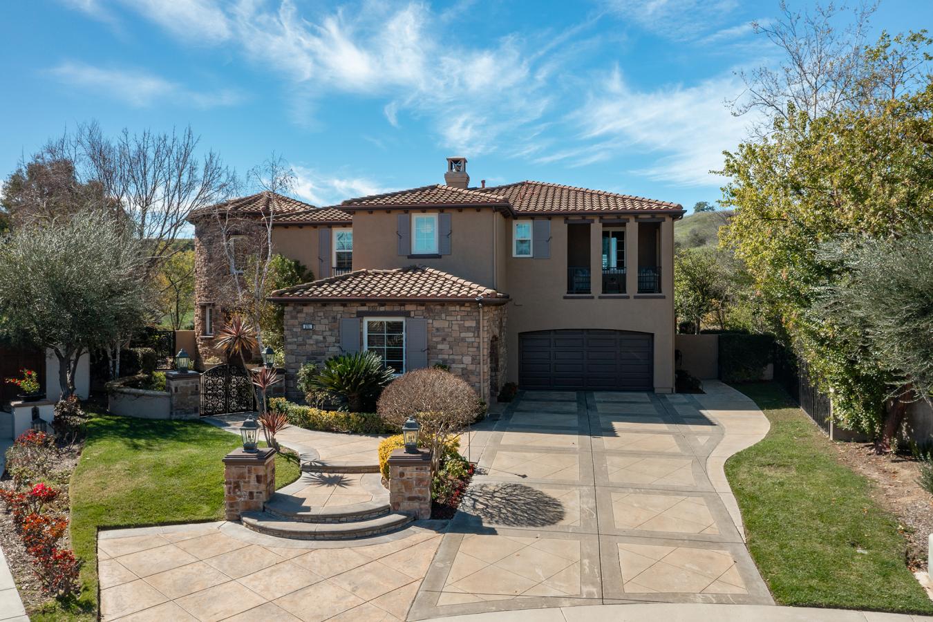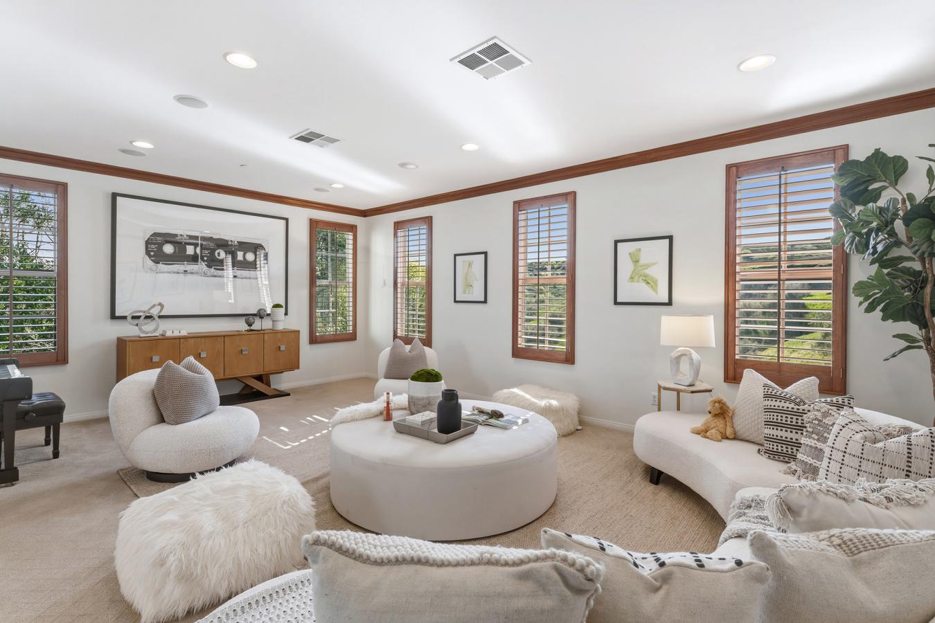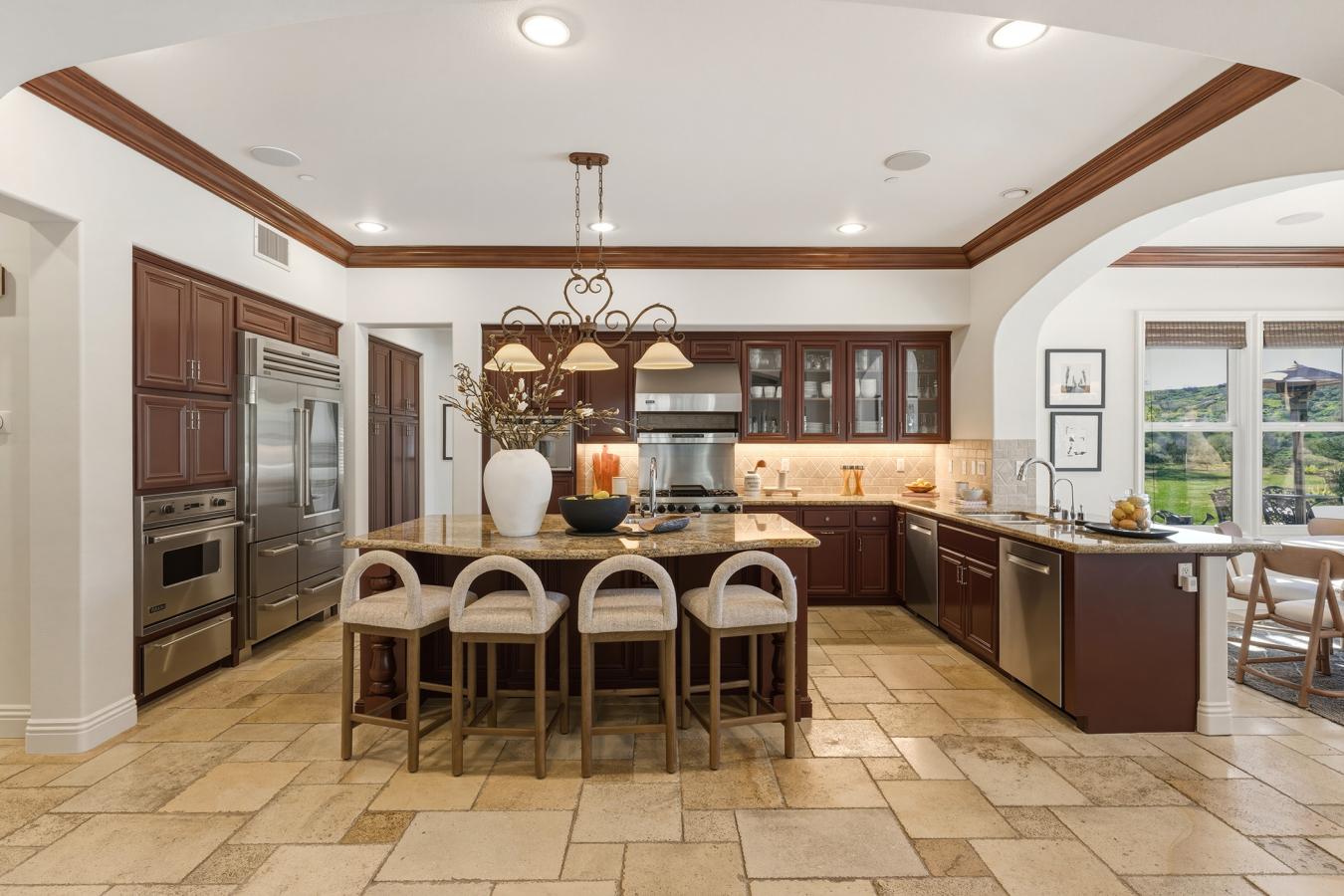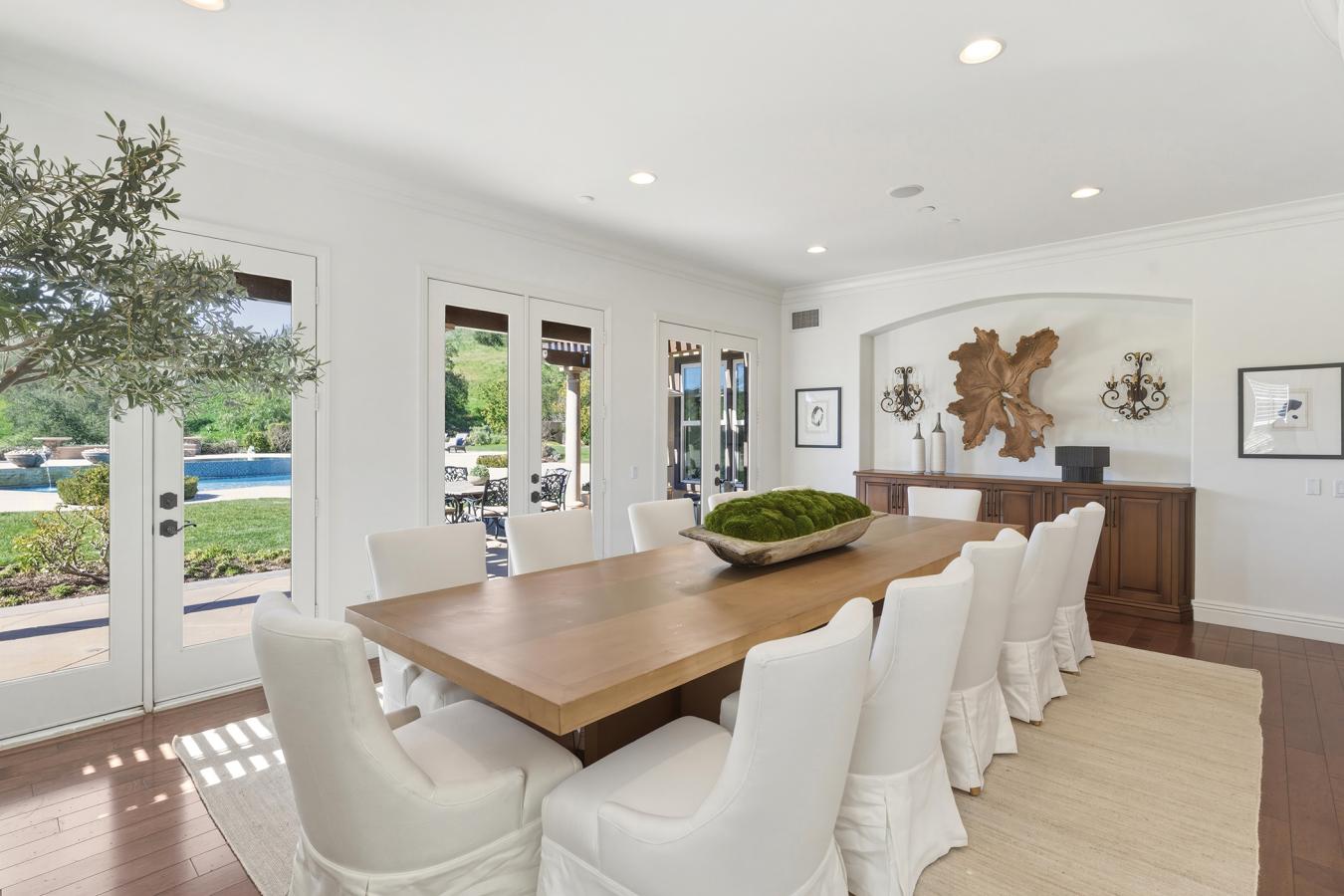 Located at the end of a quiet cul-de-sac within the prestigious guard-gated community of Mont Calabasas, this exceptional estate captures sweeping panoramic rolling hill views from nearly every vantage point. Set on an expansive 20,980 sq ft lot, the 4,994 sq ft residence blends refined design, thoughtful upgrades, and seamless indoor-outdoor living. A welcoming courtyard entry leads into a dramatic foyer highlighted by a grand spiral staircase, custom stone flooring, and architectural archways that lead into the formal dining room. The generous dining room features a fireplace and three sets of French doors showcasing the incredible view and is perfect for entertaining large groups. A cozy paneled den with outdoor access offers a respite to enjoy a glass of wine or catch up on work. The heart of the home is the open-concept eat-in kitchen and family room, designed to frame the breathtaking views. The chefs kitchen features a large center island, Viking appliances, a Sub-Zero glass door refrigerator/freezer, double ovens, and two dishwashers. The adjacent double-sized family room, enhanced with beamed ceilings, a fireplace, and built-ins, opens directly to the backyard, creating effortless flow for gatherings large and small. A large en-suite guest room that opens to the front patio as well as a powder room complete the first floor. Upstairs, the primary suite offers a private sanctuary with a fireplace, a large seating area, and a view balcony. The spa-like primary bath features separate vanities, a separate tub and shower, a spacious walk-in closet, and access to the large balcony overlooking the pool. Three additional en-suite bedrooms and a versatile bonus room provide flexibility for a media room, game room, or additional lounge space. The generous laundry room is also on the second floor. The outdoor setting is a true retreat. Completed in 2015, the resort-style backyard includes a sparkling pool and spa with a Jandy control system, an oversized infinity-edge hot tub, a gas fire pit, and a stunning 30-foot round covered sitting area with a fireplace, a tongue-and-groove ceiling, and overhead electric heaters. The fully equipped BBQ area with outdoor sink and remote hot water heater makes year-round entertaining both comfortable and convenient-all set against unobstructed, panoramic views. Extensive upgrades enhance comfort and efficiency, including a 5-zone indoor/outdoor surround sound system, smart WiFi-enabled controls for pool, irrigation, lighting, and water systems, overhead garage storage with built-in cabinets and workbench, epoxy garage floors, a modular emergency generator with a transfer switch, and a Ring alarm system. Located within the award-winning Las Virgenes Unified School District and just minutes from hiking trails, parks, and the shopping and dining of The Commons at Calabasas, with convenient access to Malibu and the beaches, this Mont Calabasas residence offers privacy, sophistication, and extraordinary views in one of the areas most sought-after communities.
