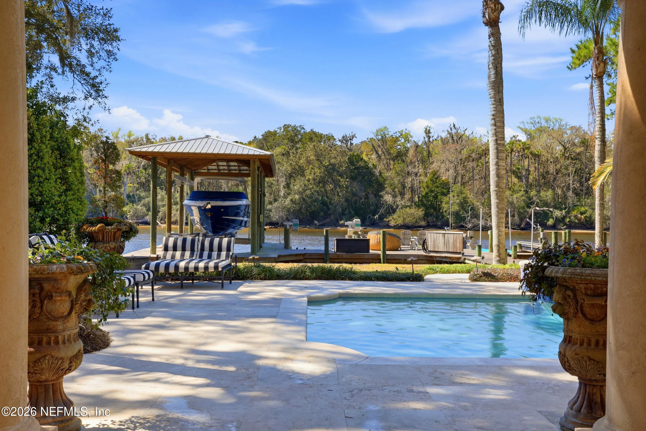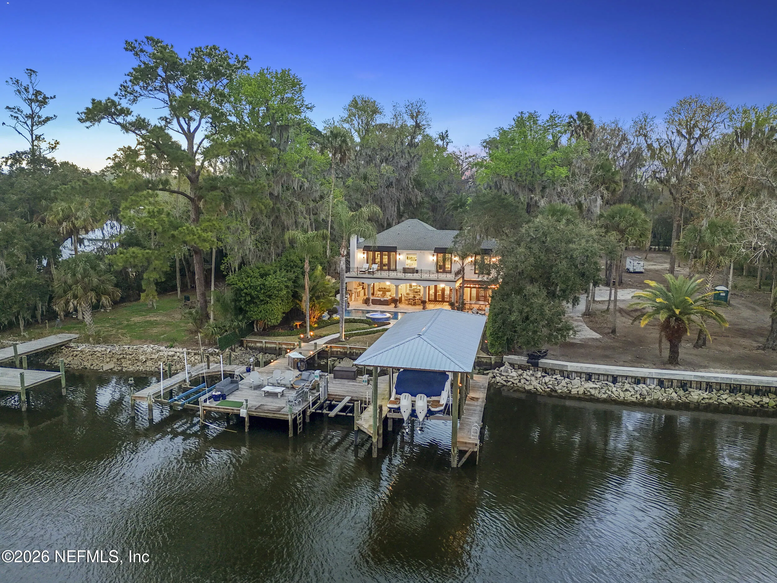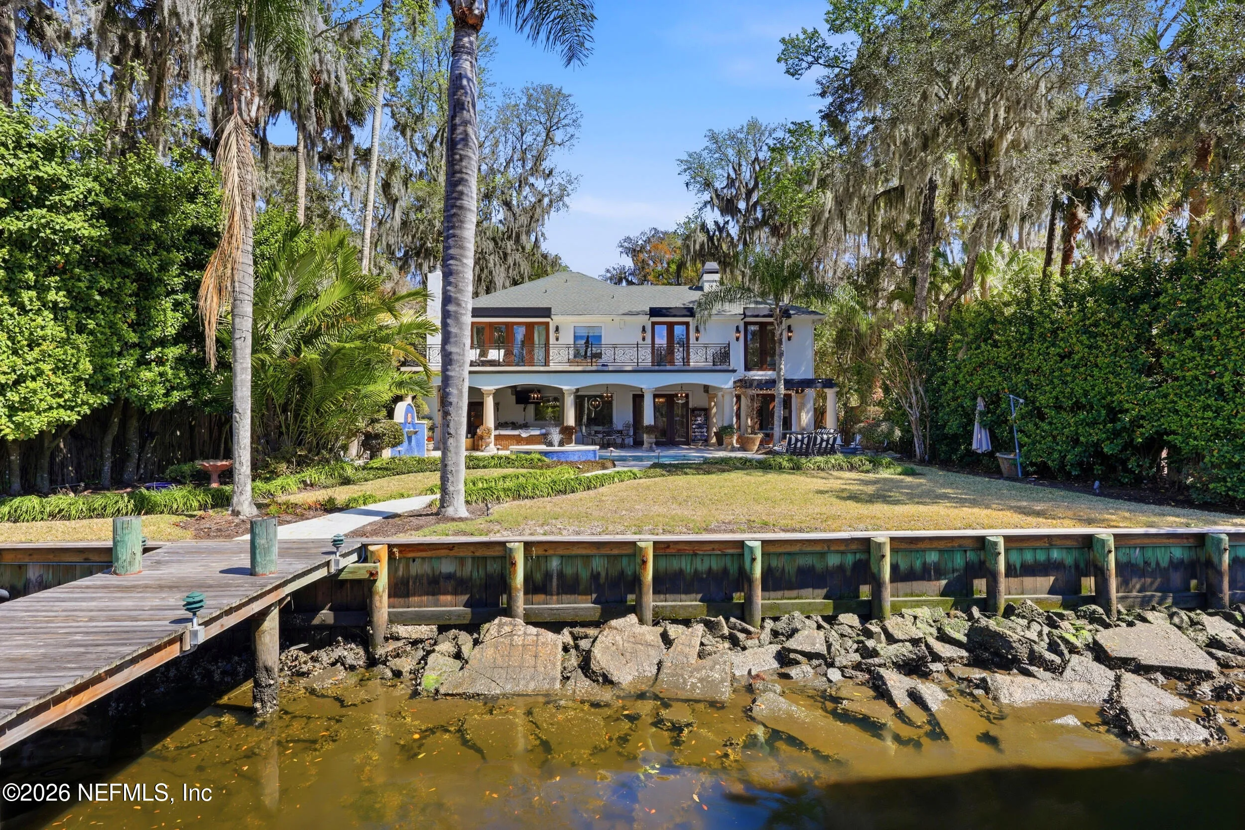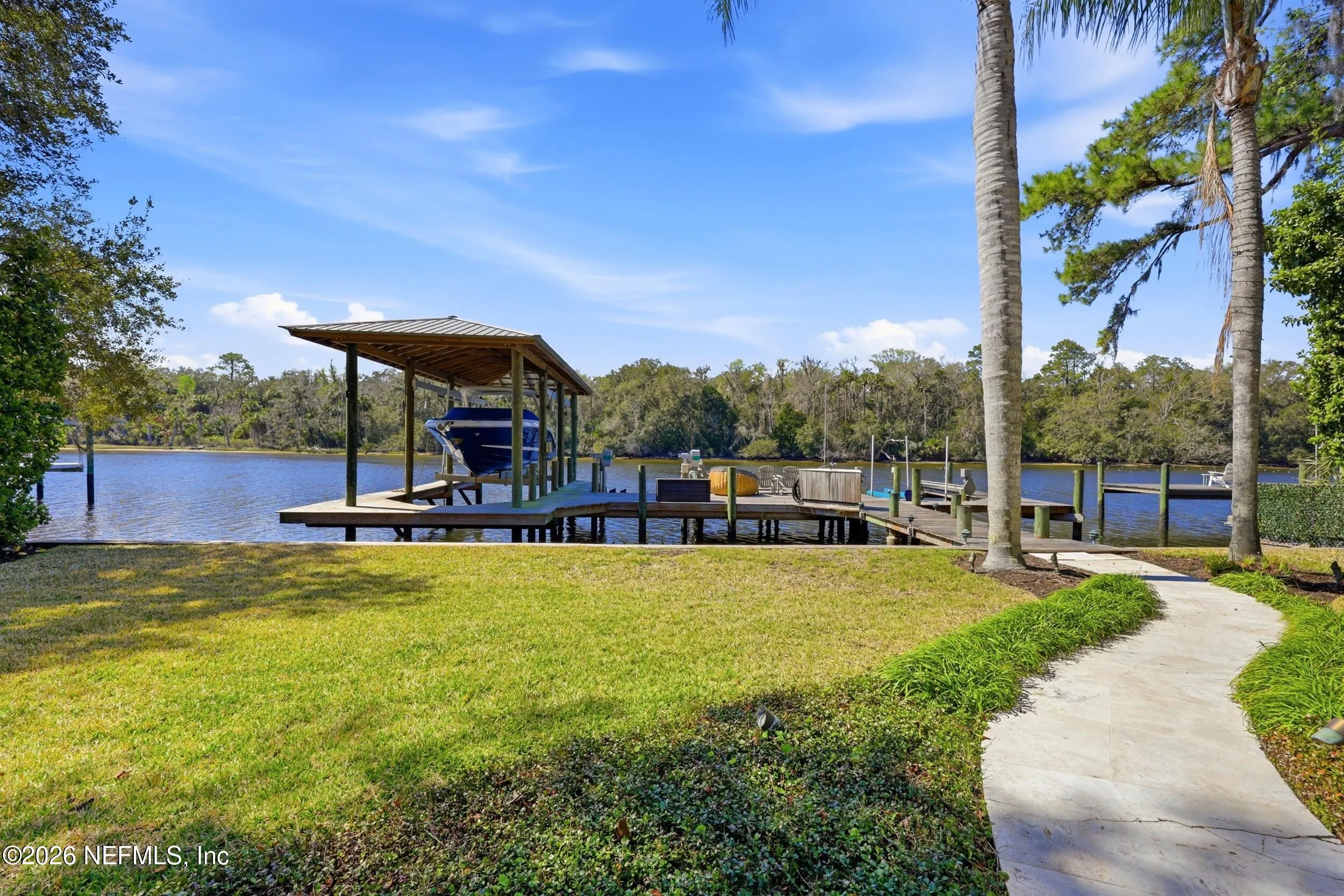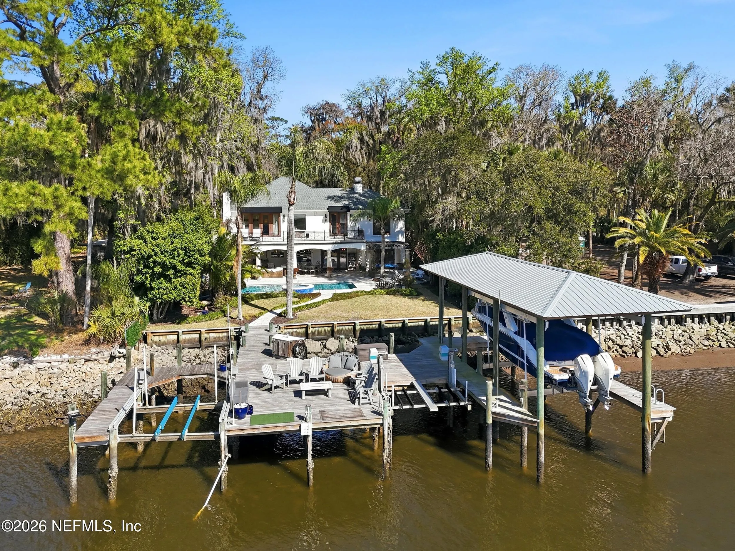 Welcome to your own private waterfront resort -- where the Intracoastal Waterway becomes your backyard and every day feels like a permanent vacation. This extraordinary five-bedroom, six-bathroom residence delivers resort-caliber living along the Intracoastal Waterway in one of Northeast Floridas most coveted coastal communities. Solid concrete construction on the first floor anchors this home with strength and permanence, delivering peace of mind alongside timeless elegance, with travertine and wood floors flowing throughout, while solid mahogany double front entry doors set a tone of elegance and grandeur from the very first step. The culinary kitchen is a chefs paradise, outfitted with a Viking gas range, SubZero refrigerator, Fischer Paykel dishwasher, Jenn Air refrigerator and freezer drawers, quartzite counters, and decorative cabinetry. A wine cellar flanked with imported brick from 17th century Polish church ruins stands ready for your finest vintages. The primary suite features a fireplace, custom walk-in closets, and a private balcony overlooking the waterway. Soak in the tub while savoring panoramic Intracoastal views through an expansive window -- because you deserve that kind of morning. Step outside to nearly a thousand square feet of covered lanai, a summer kitchen with fireplace and grill, and a massive swimming pool with hot tub. Extensive landscape lighting transforms evenings into something magical. For boating enthusiasts, this property is a dream -- situated equal distance between inlets at Mayport and St. Augustine. The private dock features three lifts accommodating vessels up to thirty-five feet, two jet skis, a 21 boat and a convenient wash station. A whole house generator and electric vehicle charger add modern functionality, while a long, gated driveway ensures privacy abounds. This is Northeast Florida waterfront living at its absolute finest.