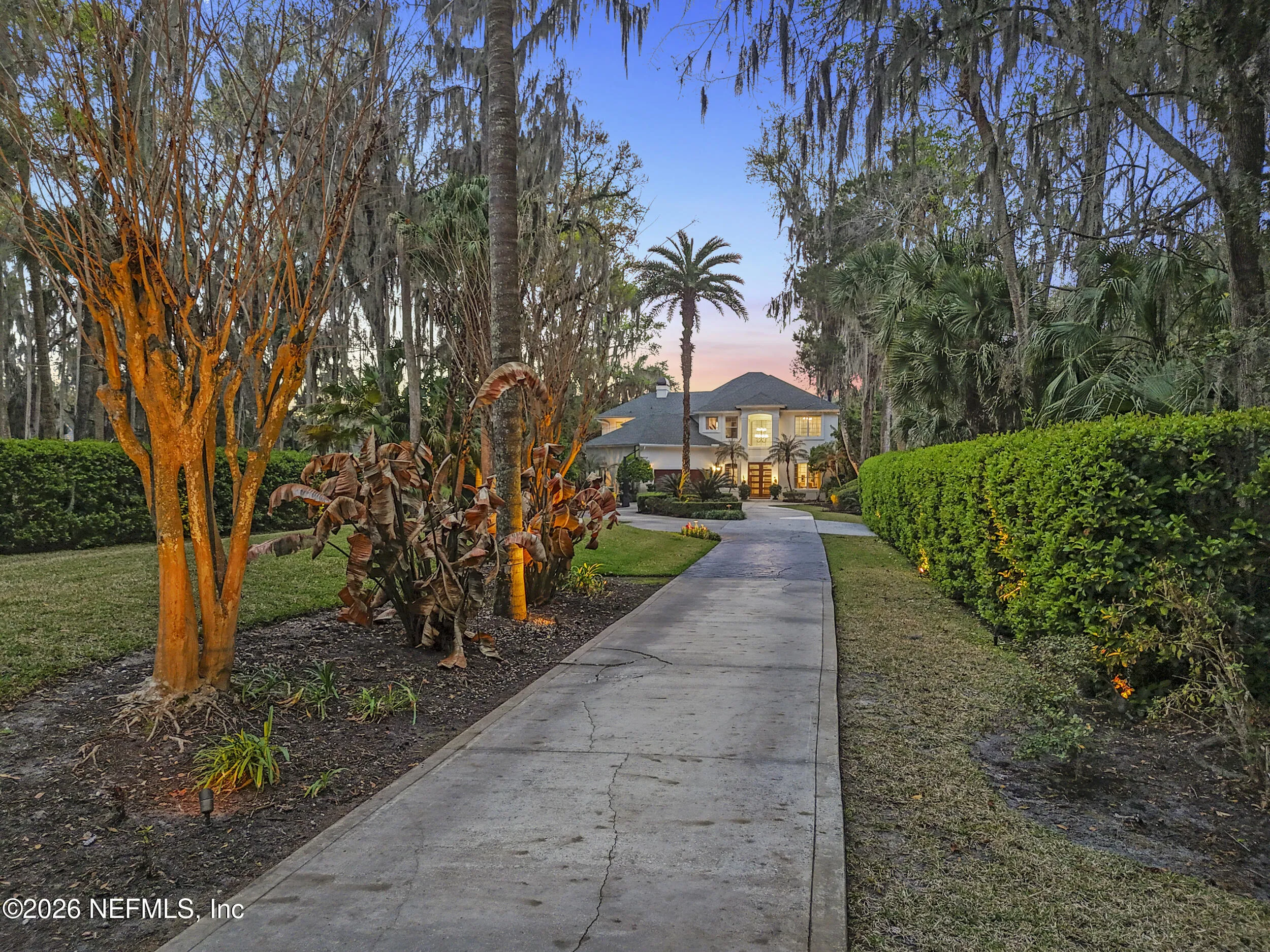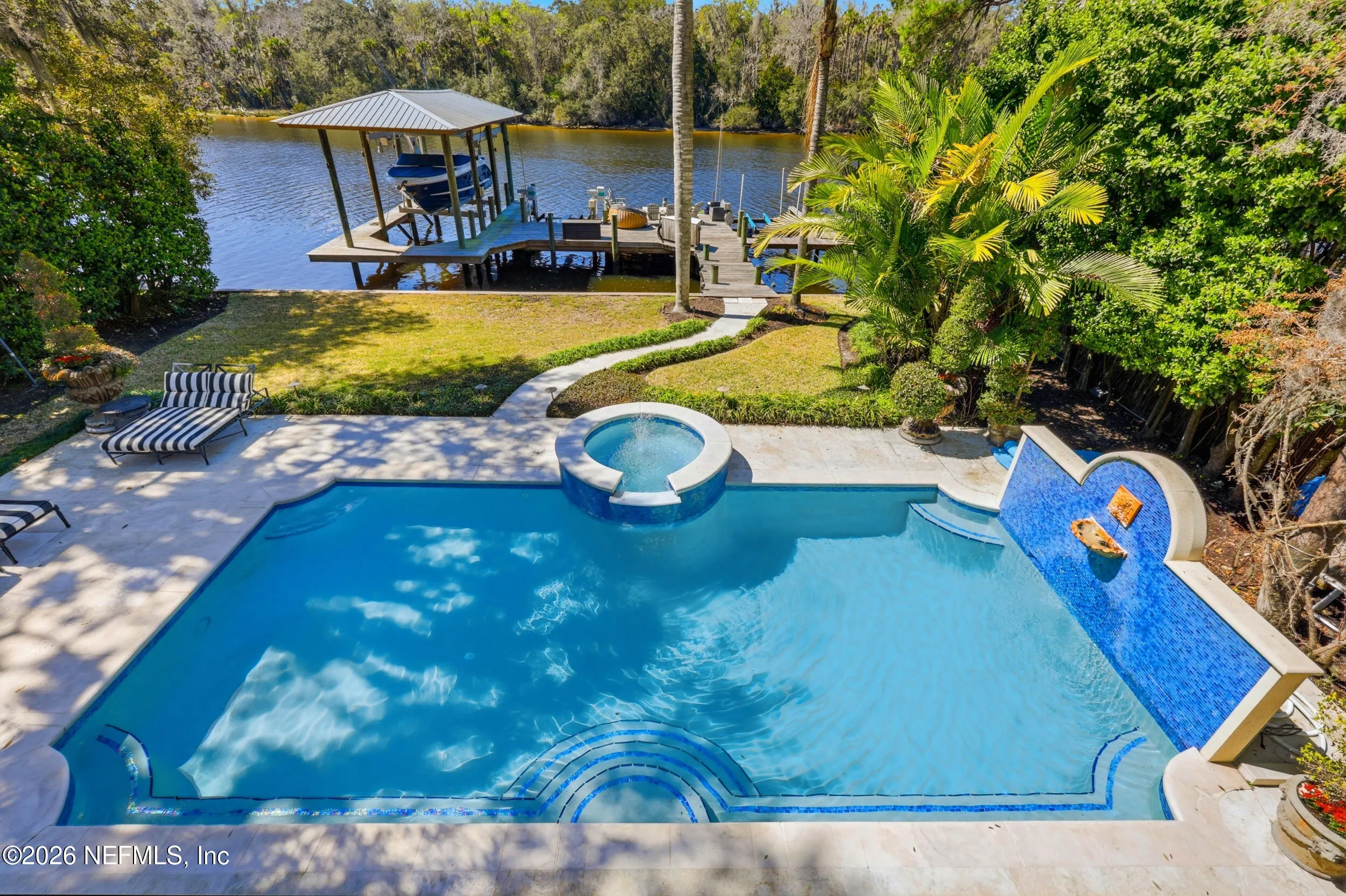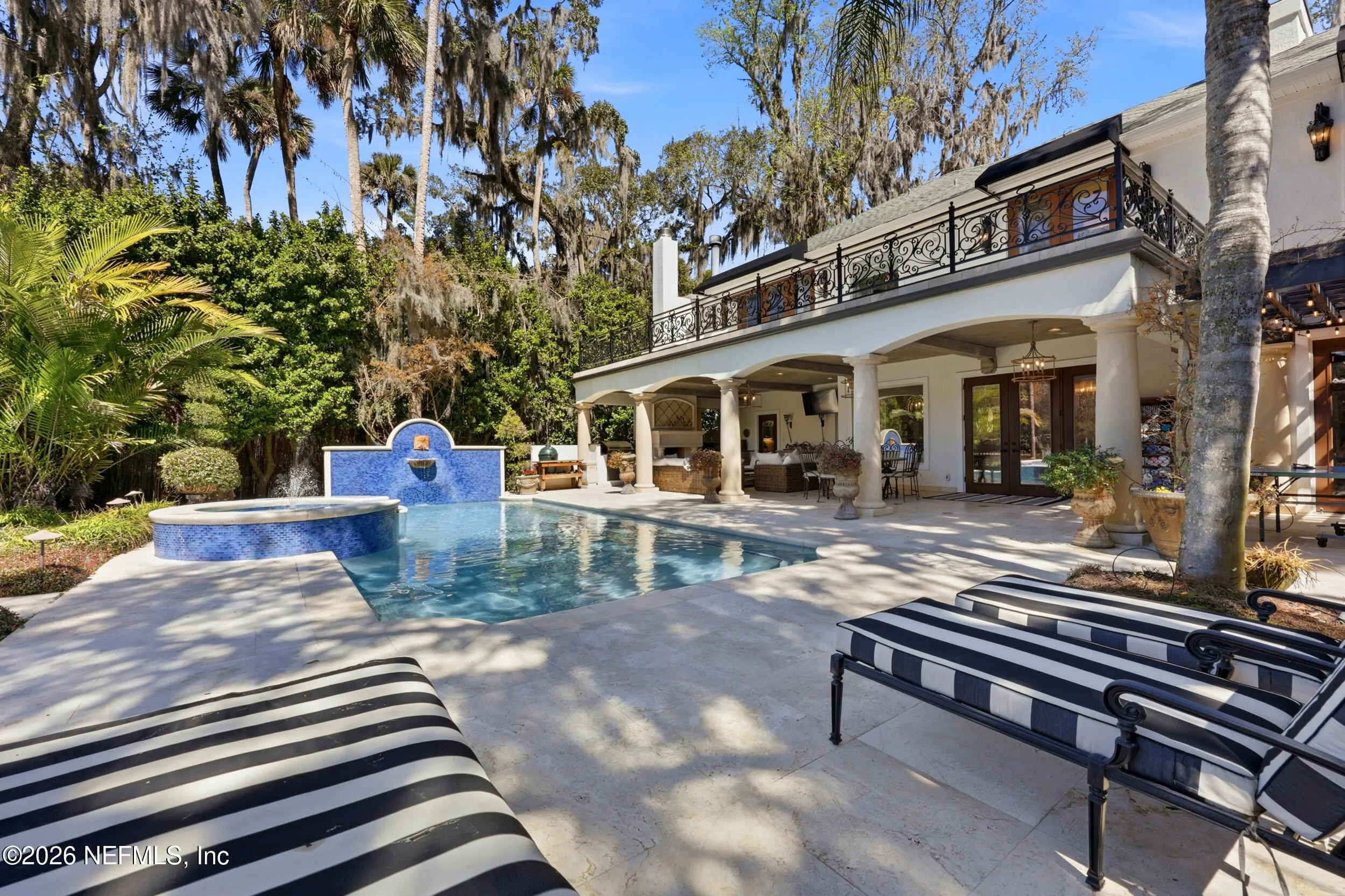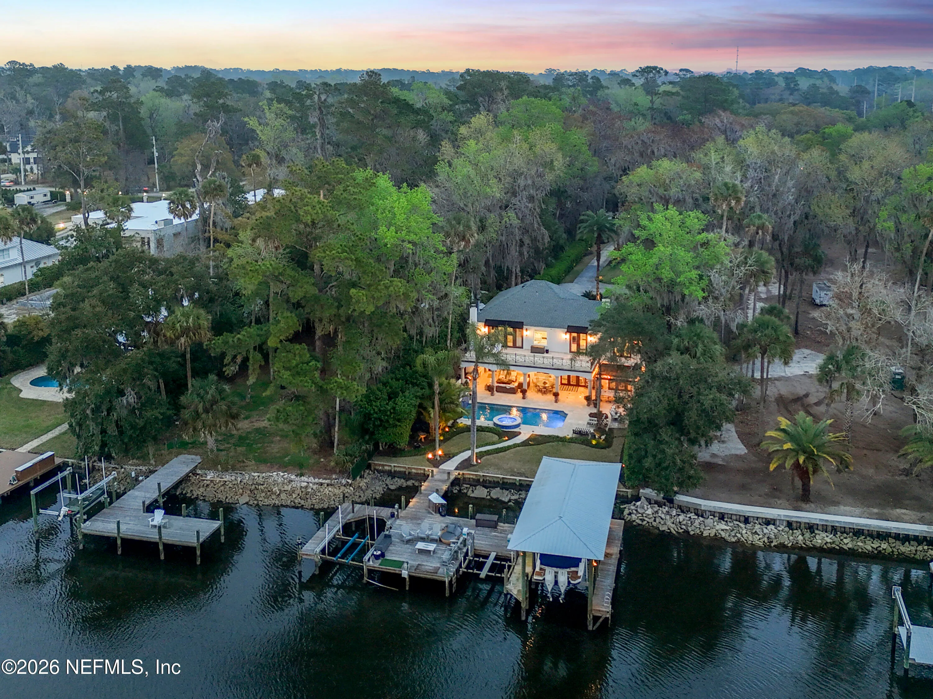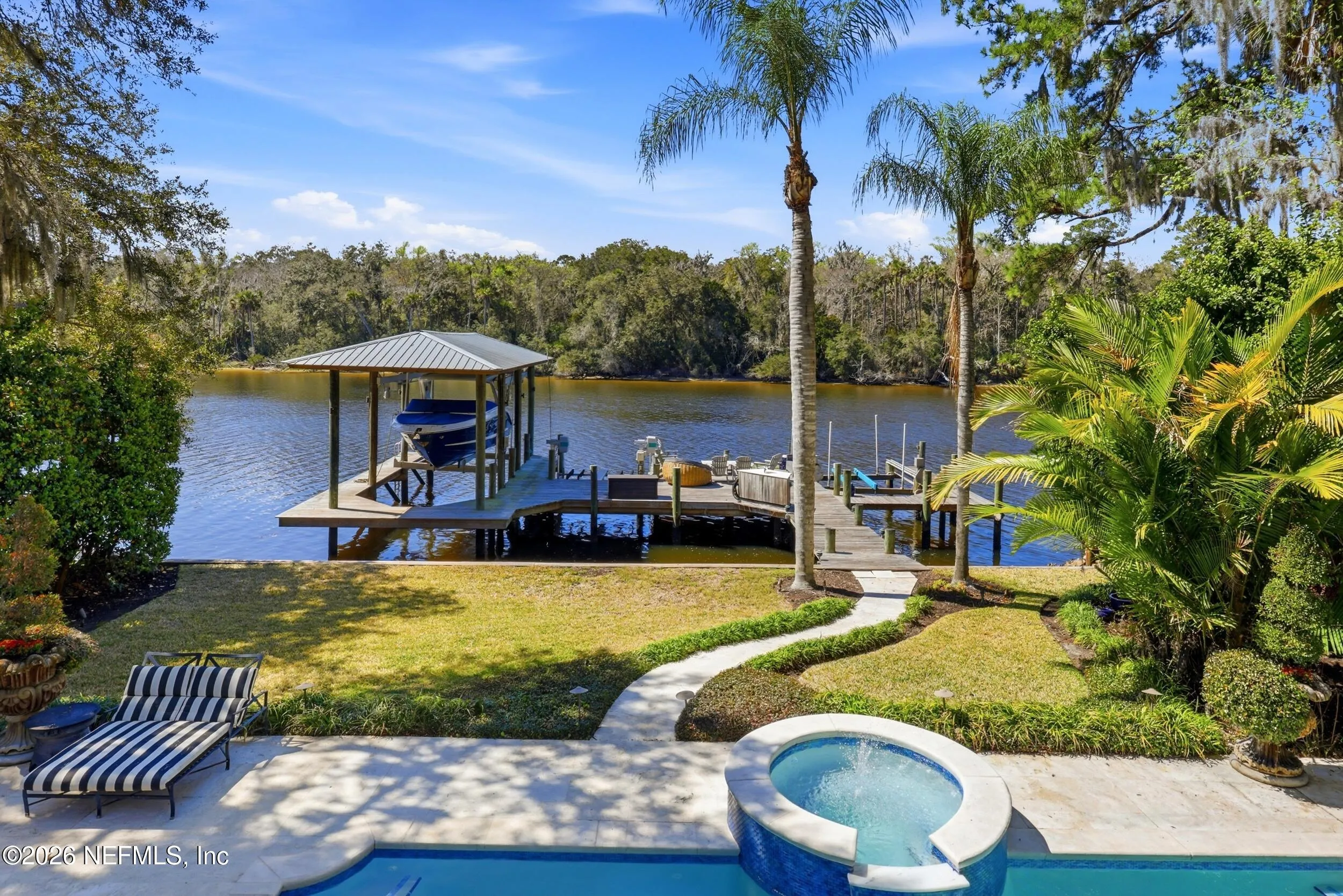 Welcome to your own private waterfront resort -- where the Intracoastal Waterway becomes your backyard and every day feels like a permanent vacation. This extraordinary five-bedroom, six-bathroom residence delivers resort-caliber living along the Intracoastal Waterway in one of Northeast Floridas most coveted coastal communities. Solid concrete construction on the first floor anchors this home with strength and permanence, delivering peace of mind alongside timeless elegance, with travertine and wood floors flowing throughout, while solid mahogany double front entry doors set a tone of elegance and grandeur from the very first step. The culinary kitchen is a chefs paradise, outfitted with a Viking gas range, SubZero refrigerator, Fischer Paykel dishwasher, Jenn Air refrigerator and freezer drawers, quartzite counters, and decorative cabinetry. A wine cellar flanked with imported brick from 17th century Polish church ruins stands ready for your finest vintages. The primary suite features a fireplace, custom walk-in closets, and a private balcony overlooking the waterway. Soak in the tub while savoring panoramic Intracoastal views through an expansive window -- because you deserve that kind of morning. Step outside to nearly a thousand square feet of covered lanai, a summer kitchen with fireplace and grill, and a massive swimming pool with hot tub. Extensive landscape lighting transforms evenings into something magical. For boating enthusiasts, this property is a dream -- situated equal distance between inlets at Mayport and St. Augustine. The private dock features three lifts accommodating vessels up to thirty-five feet, two jet skis, a 21 boat and a convenient wash station. A whole house generator and electric vehicle charger add modern functionality, while a long, gated driveway ensures privacy abounds. This is Northeast Florida waterfront living at its absolute finest.