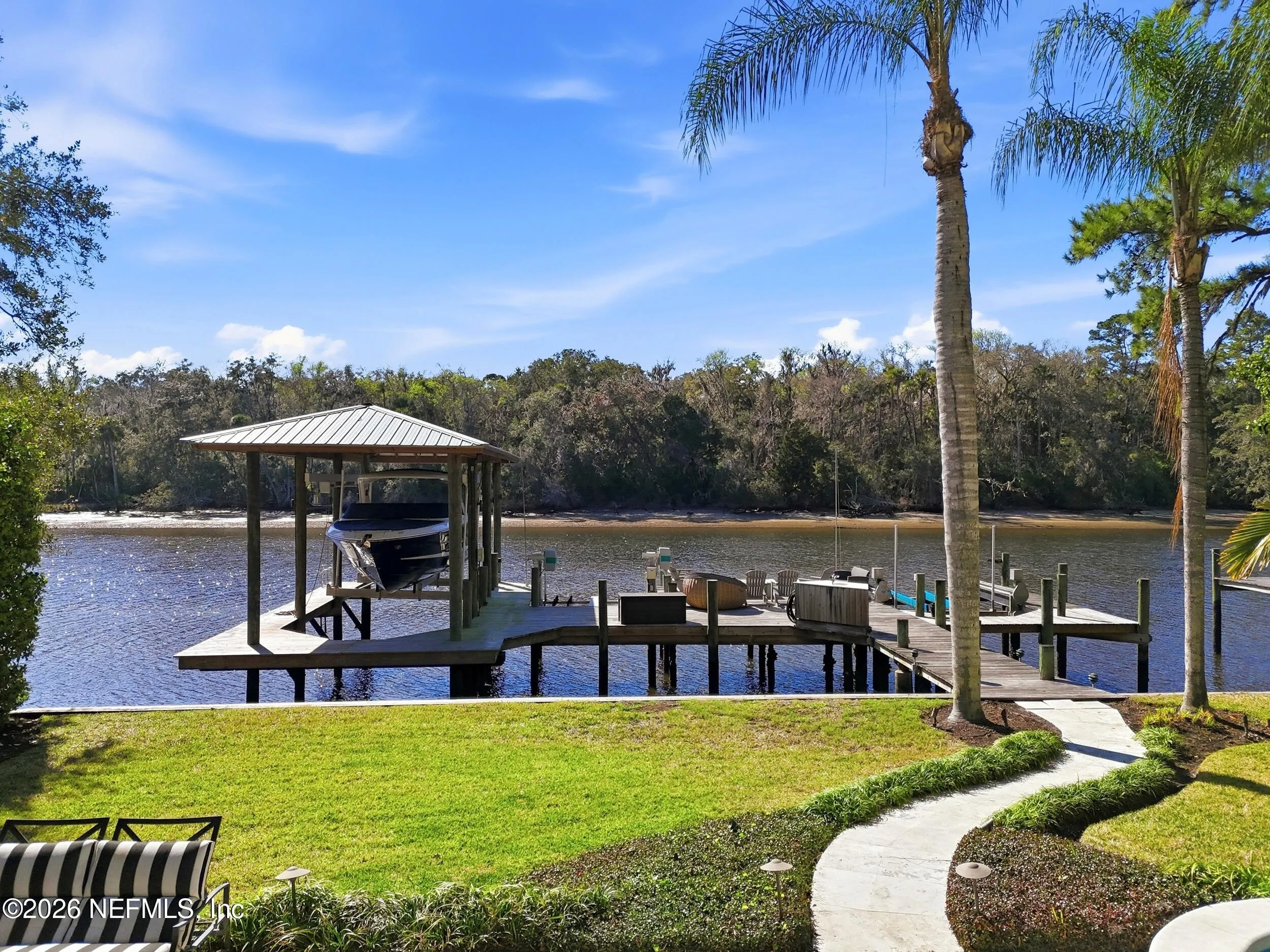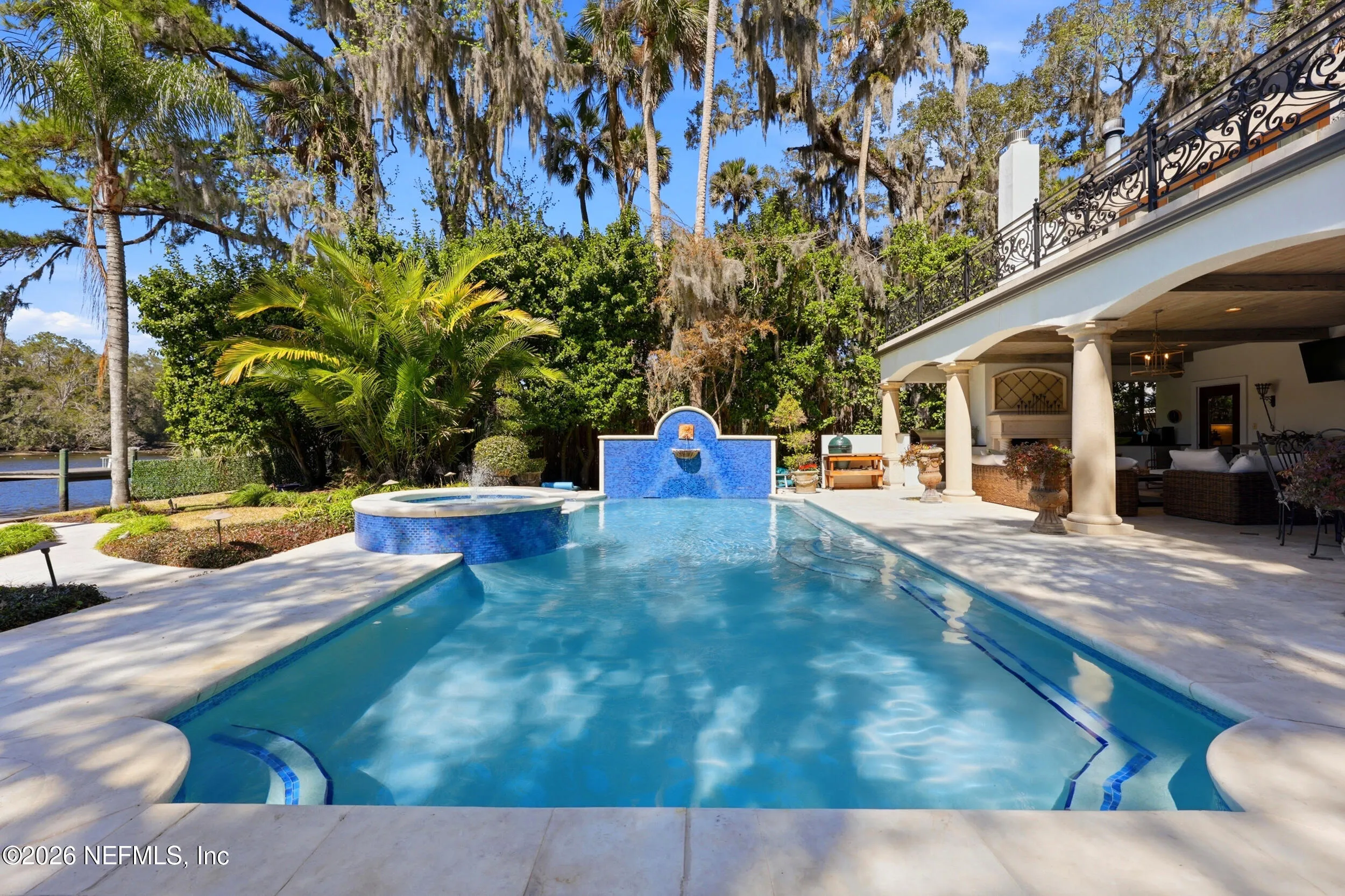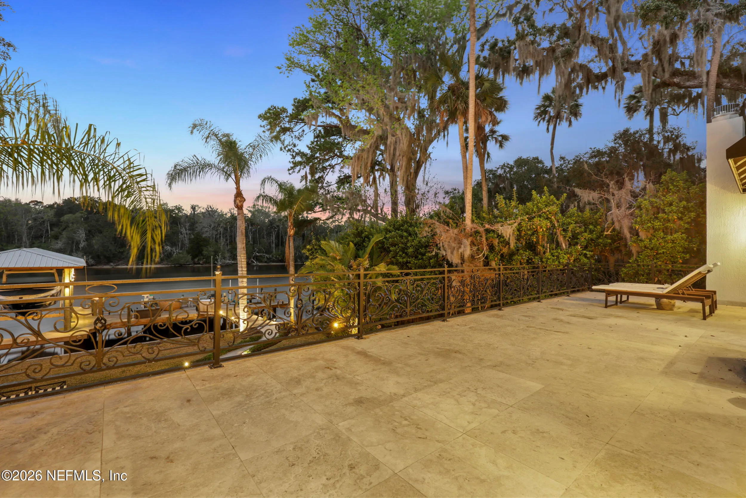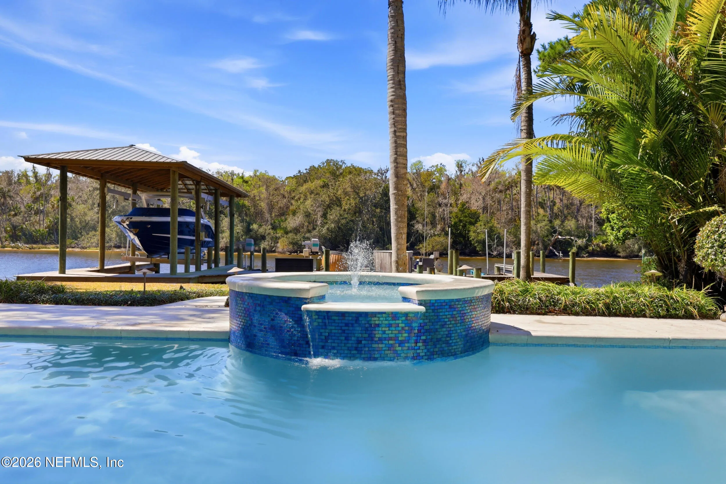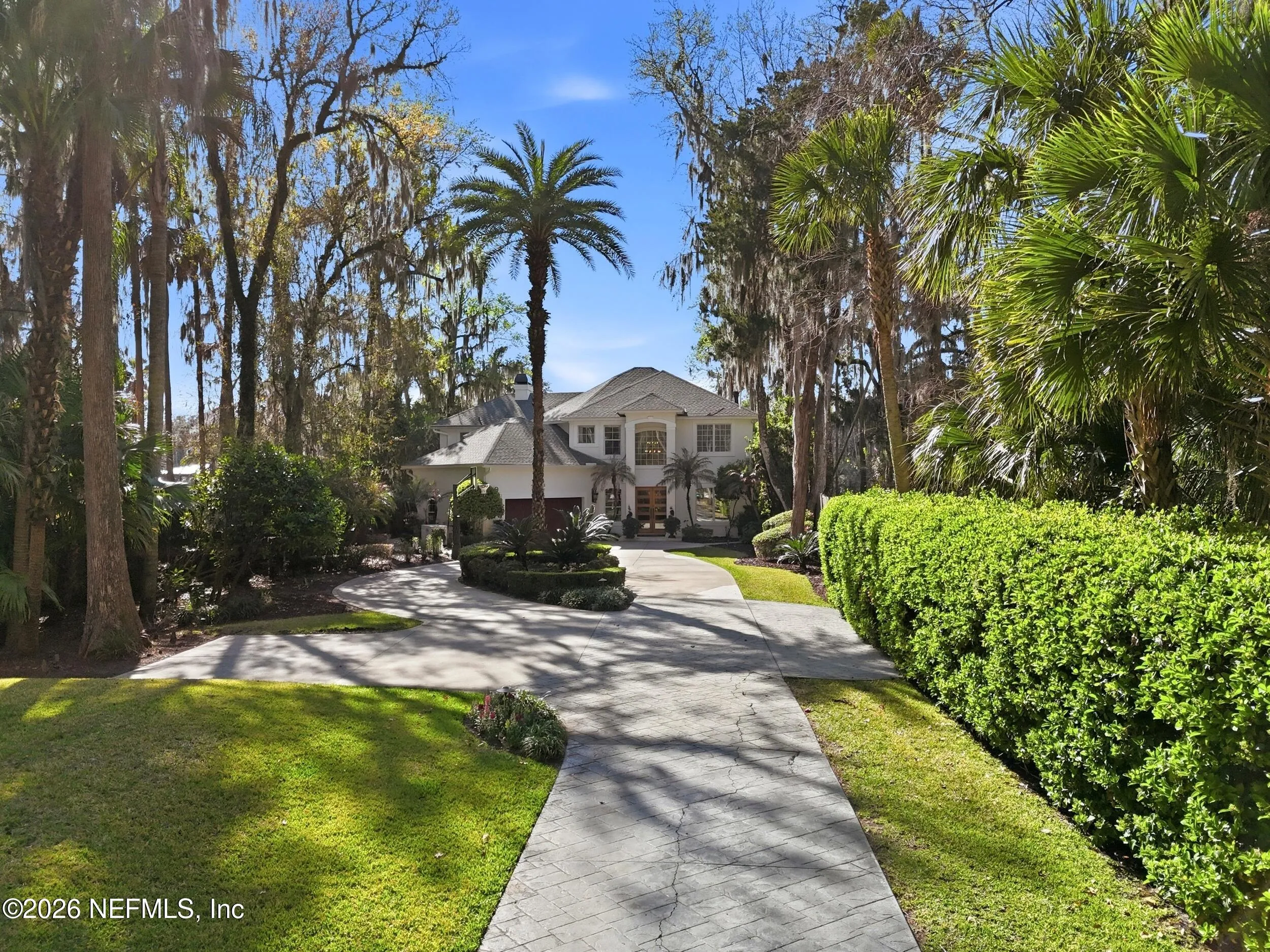 Welcome to your own private waterfront resort -- where the Intracoastal Waterway becomes your backyard and every day feels like a permanent vacation. This extraordinary five-bedroom, six-bathroom residence delivers resort-caliber living along the Intracoastal Waterway in one of Northeast Floridas most coveted coastal communities. Solid concrete construction on the first floor anchors this home with strength and permanence, delivering peace of mind alongside timeless elegance, with travertine and wood floors flowing throughout, while solid mahogany double front entry doors set a tone of elegance and grandeur from the very first step. The culinary kitchen is a chefs paradise, outfitted with a Viking gas range, SubZero refrigerator, Fischer Paykel dishwasher, Jenn Air refrigerator and freezer drawers, quartzite counters, and decorative cabinetry. A wine cellar flanked with imported brick from 17th century Polish church ruins stands ready for your finest vintages. The primary suite features a fireplace, custom walk-in closets, and a private balcony overlooking the waterway. Soak in the tub while savoring panoramic Intracoastal views through an expansive window -- because you deserve that kind of morning. Step outside to nearly a thousand square feet of covered lanai, a summer kitchen with fireplace and grill, and a massive swimming pool with hot tub. Extensive landscape lighting transforms evenings into something magical. For boating enthusiasts, this property is a dream -- situated equal distance between inlets at Mayport and St. Augustine. The private dock features three lifts accommodating vessels up to thirty-five feet, two jet skis, a 21 boat and a convenient wash station. A whole house generator and electric vehicle charger add modern functionality, while a long, gated driveway ensures privacy abounds. This is Northeast Florida waterfront living at its absolute finest.