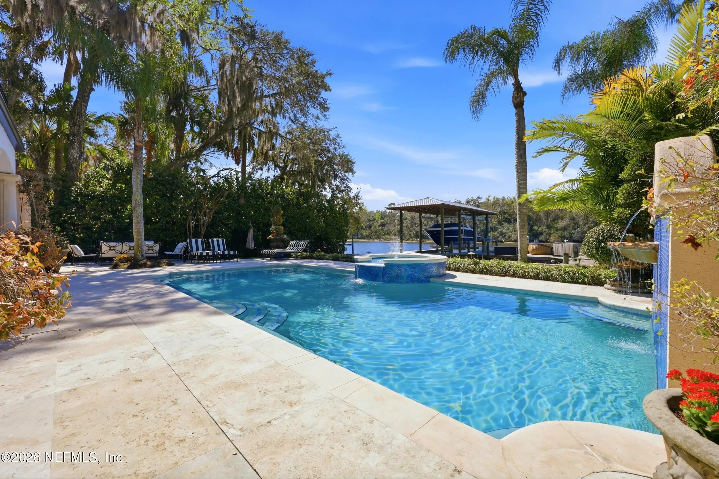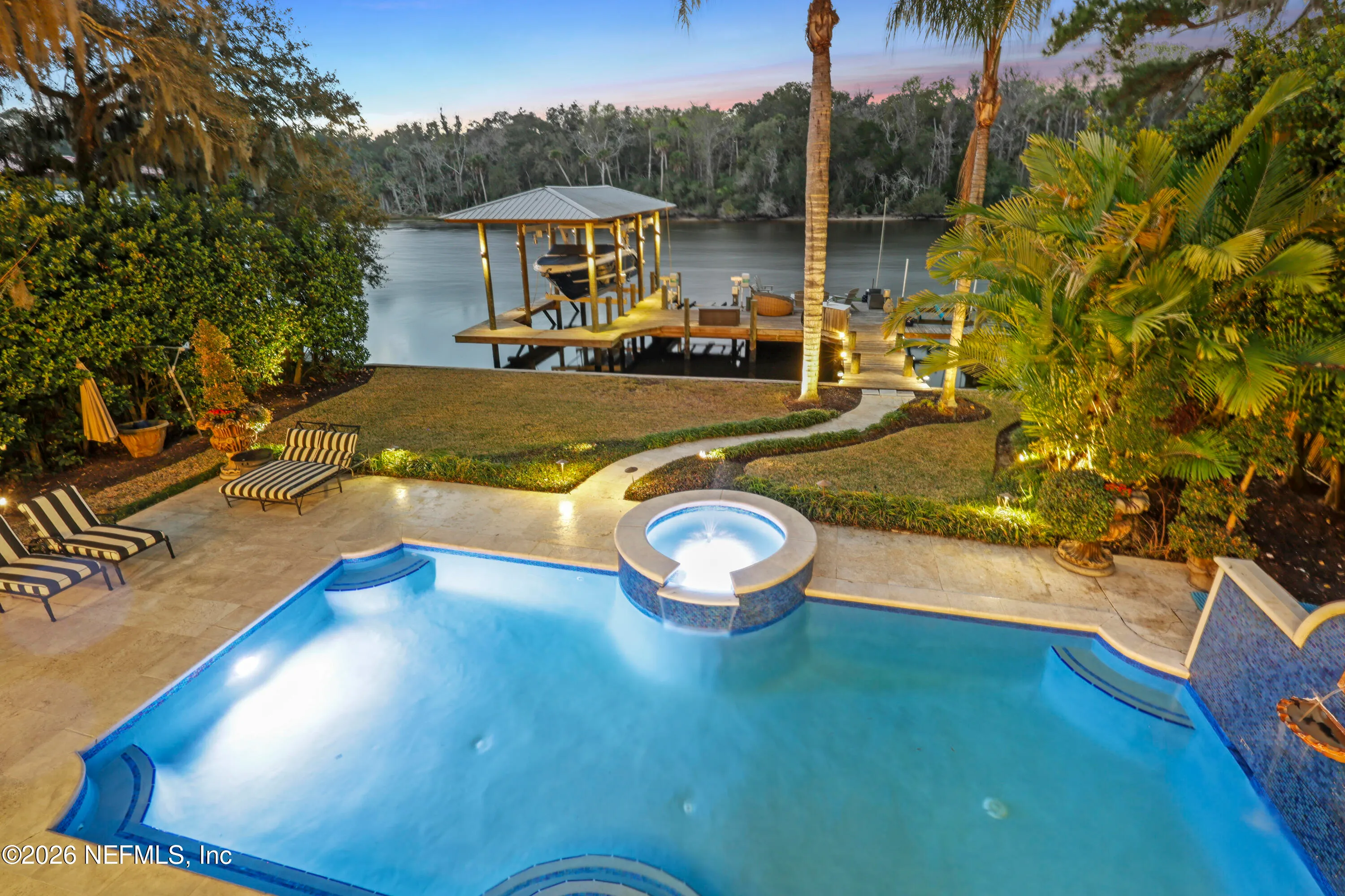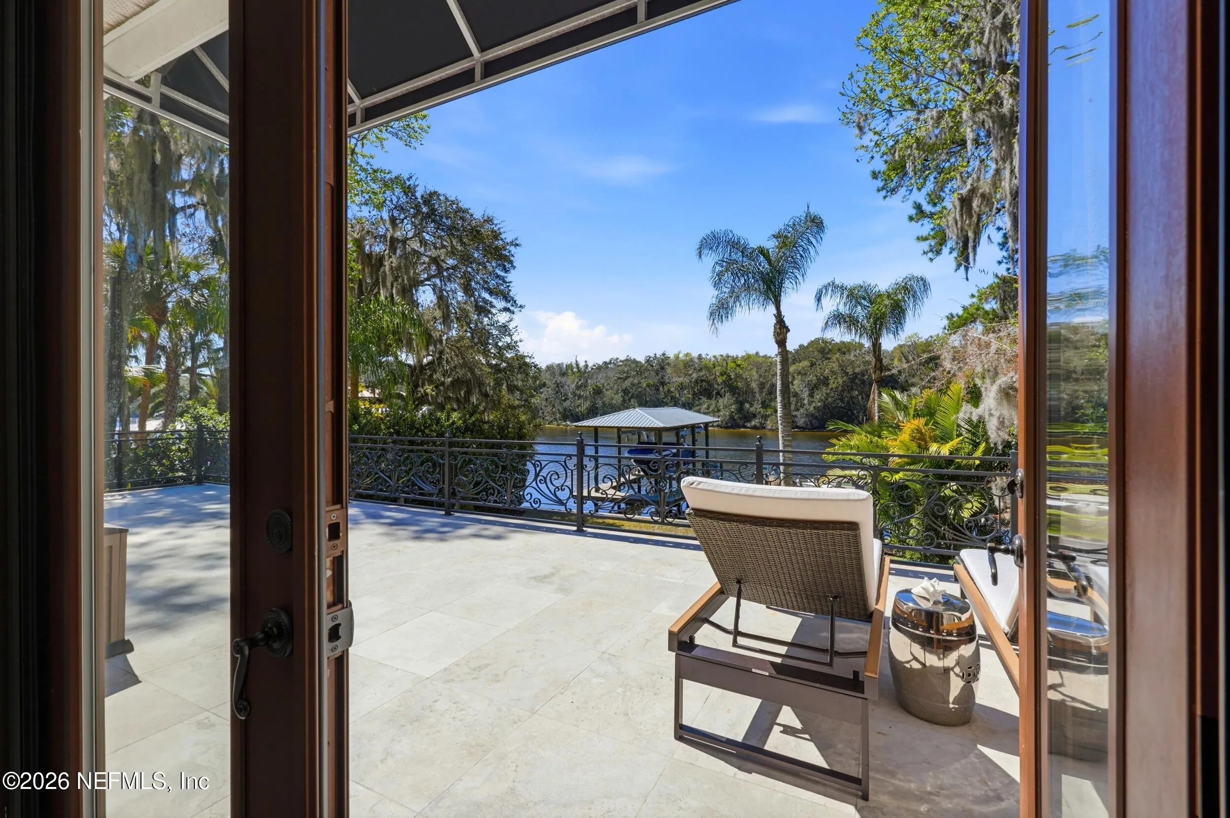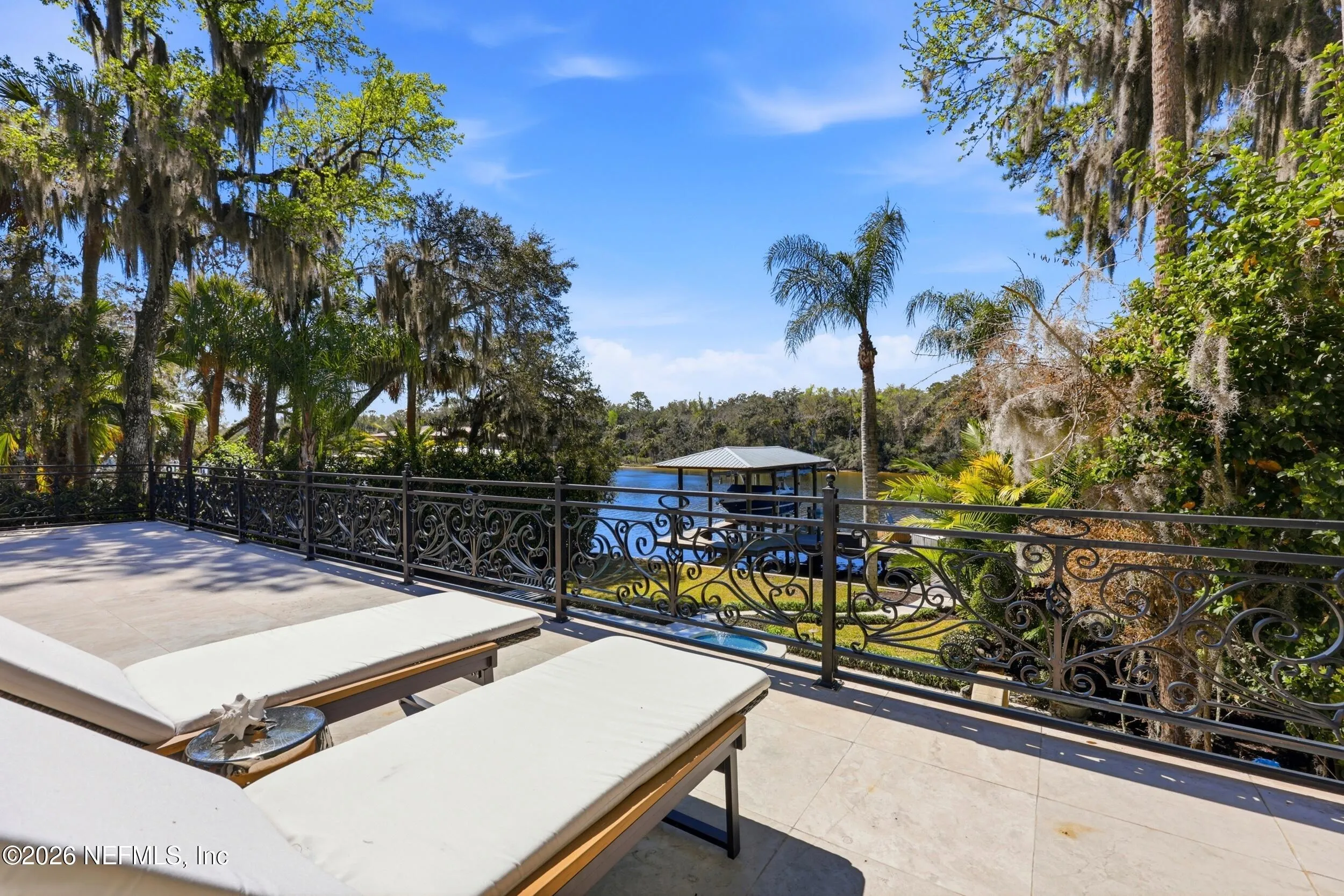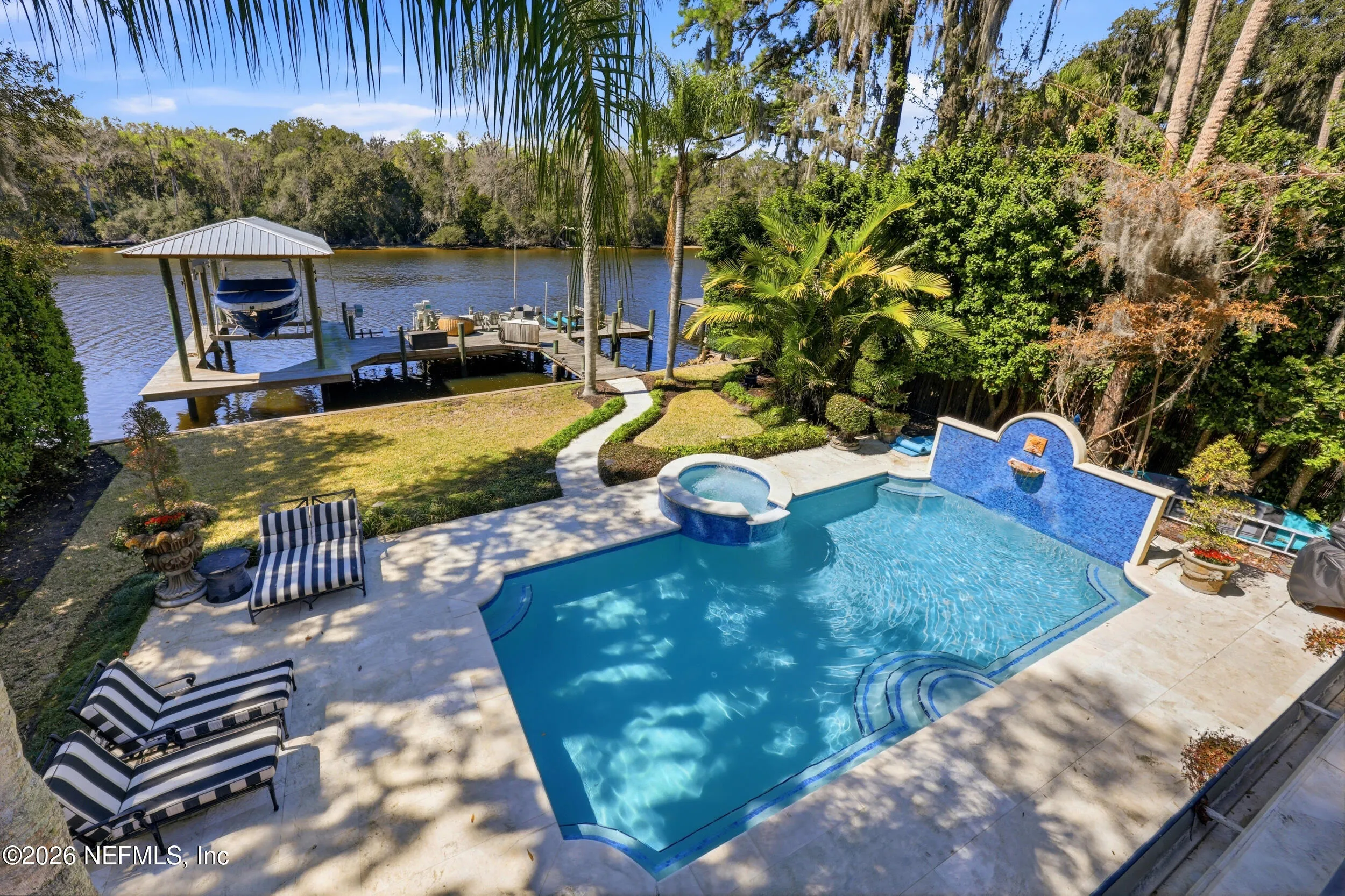 Welcome to your own private waterfront resort -- where the Intracoastal Waterway becomes your backyard and every day feels like a permanent vacation. This extraordinary five-bedroom, six-bathroom residence delivers resort-caliber living along the Intracoastal Waterway in one of Northeast Floridas most coveted coastal communities. Solid concrete construction on the first floor anchors this home with strength and permanence, delivering peace of mind alongside timeless elegance, with travertine and wood floors flowing throughout, while solid mahogany double front entry doors set a tone of elegance and grandeur from the very first step. The culinary kitchen is a chefs paradise, outfitted with a Viking gas range, SubZero refrigerator, Fischer Paykel dishwasher, Jenn Air refrigerator and freezer drawers, quartzite counters, and decorative cabinetry. A wine cellar flanked with imported brick from 17th century Polish church ruins stands ready for your finest vintages. The primary suite features a fireplace, custom walk-in closets, and a private balcony overlooking the waterway. Soak in the tub while savoring panoramic Intracoastal views through an expansive window -- because you deserve that kind of morning. Step outside to nearly a thousand square feet of covered lanai, a summer kitchen with fireplace and grill, and a massive swimming pool with hot tub. Extensive landscape lighting transforms evenings into something magical. For boating enthusiasts, this property is a dream -- situated equal distance between inlets at Mayport and St. Augustine. The private dock features three lifts accommodating vessels up to thirty-five feet, two jet skis, a 21 boat and a convenient wash station. A whole house generator and electric vehicle charger add modern functionality, while a long, gated driveway ensures privacy abounds. This is Northeast Florida waterfront living at its absolute finest.