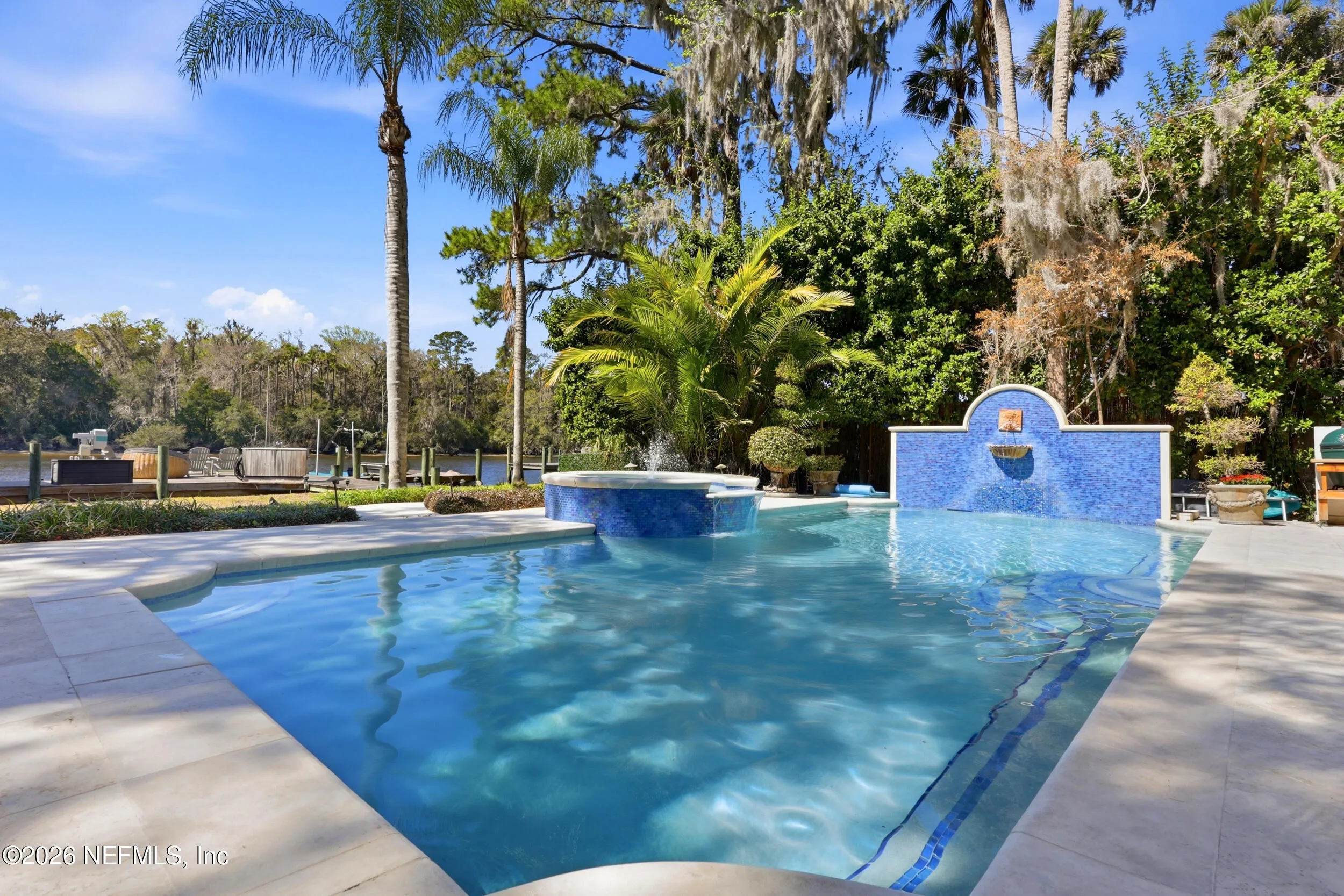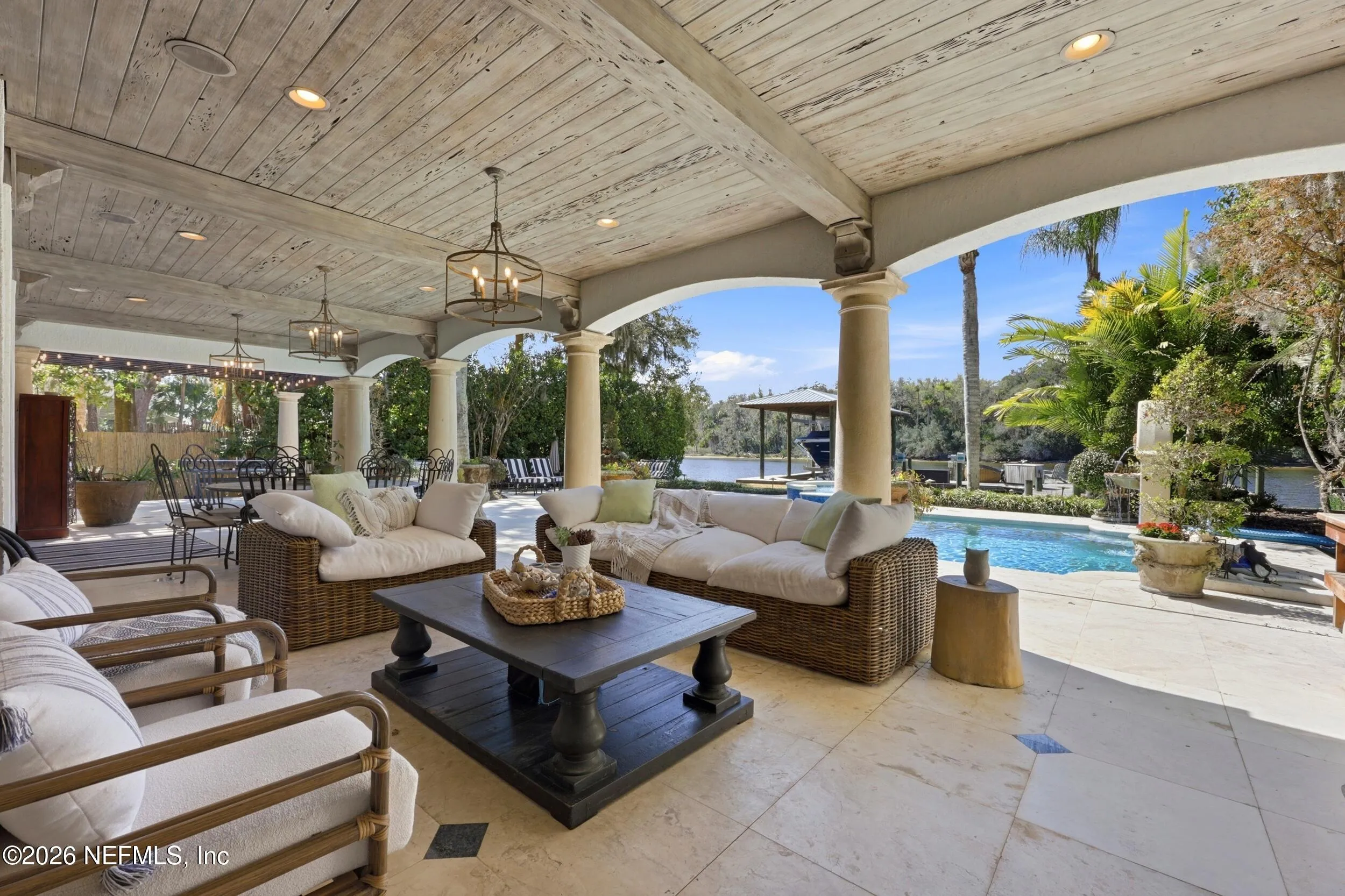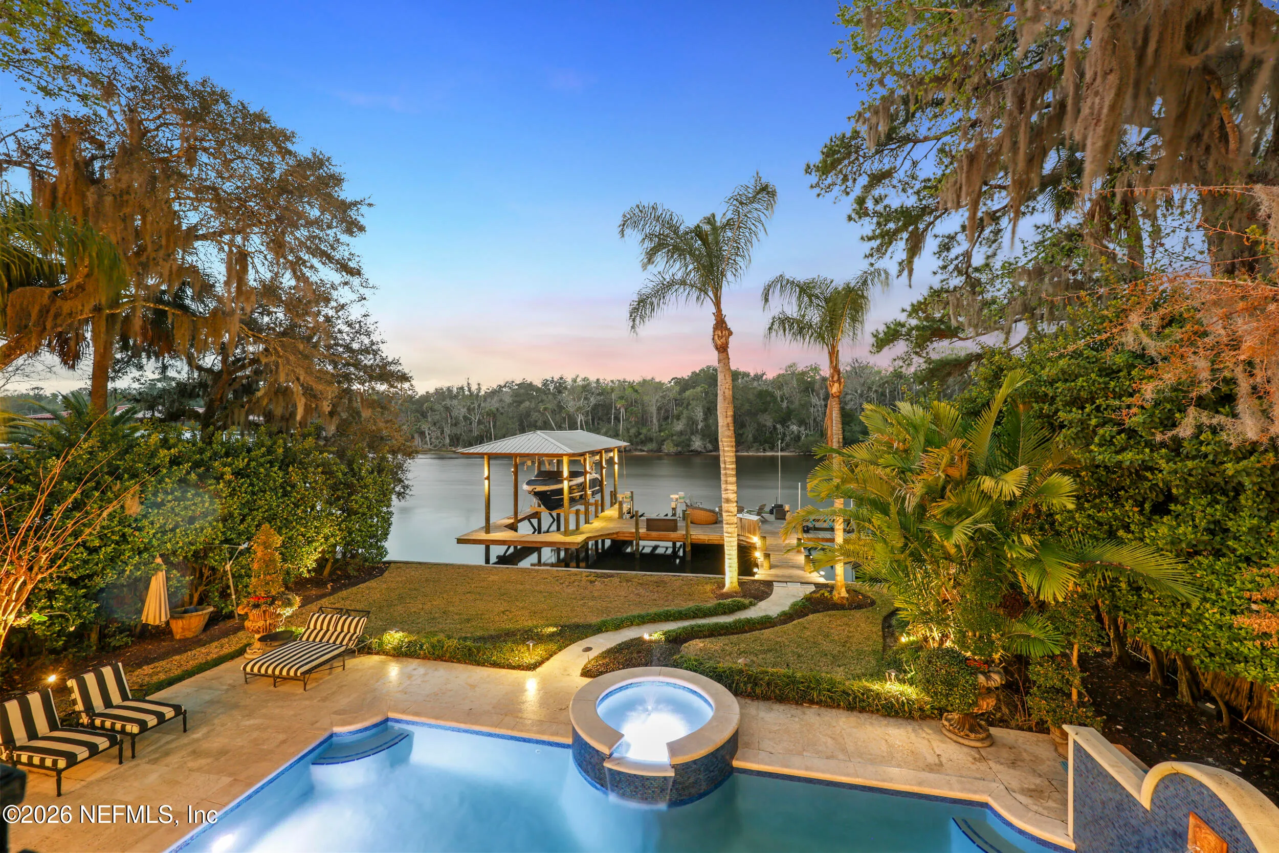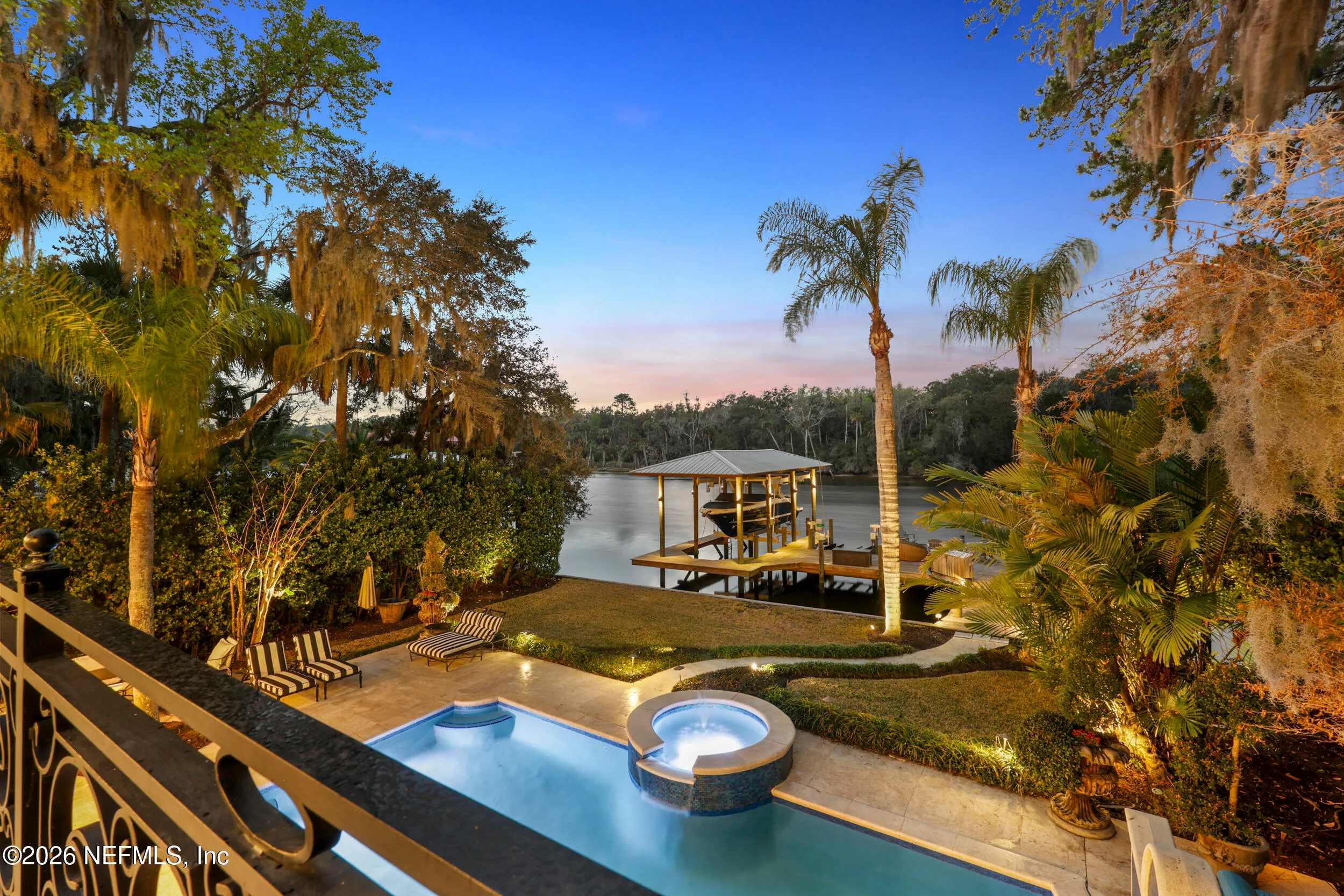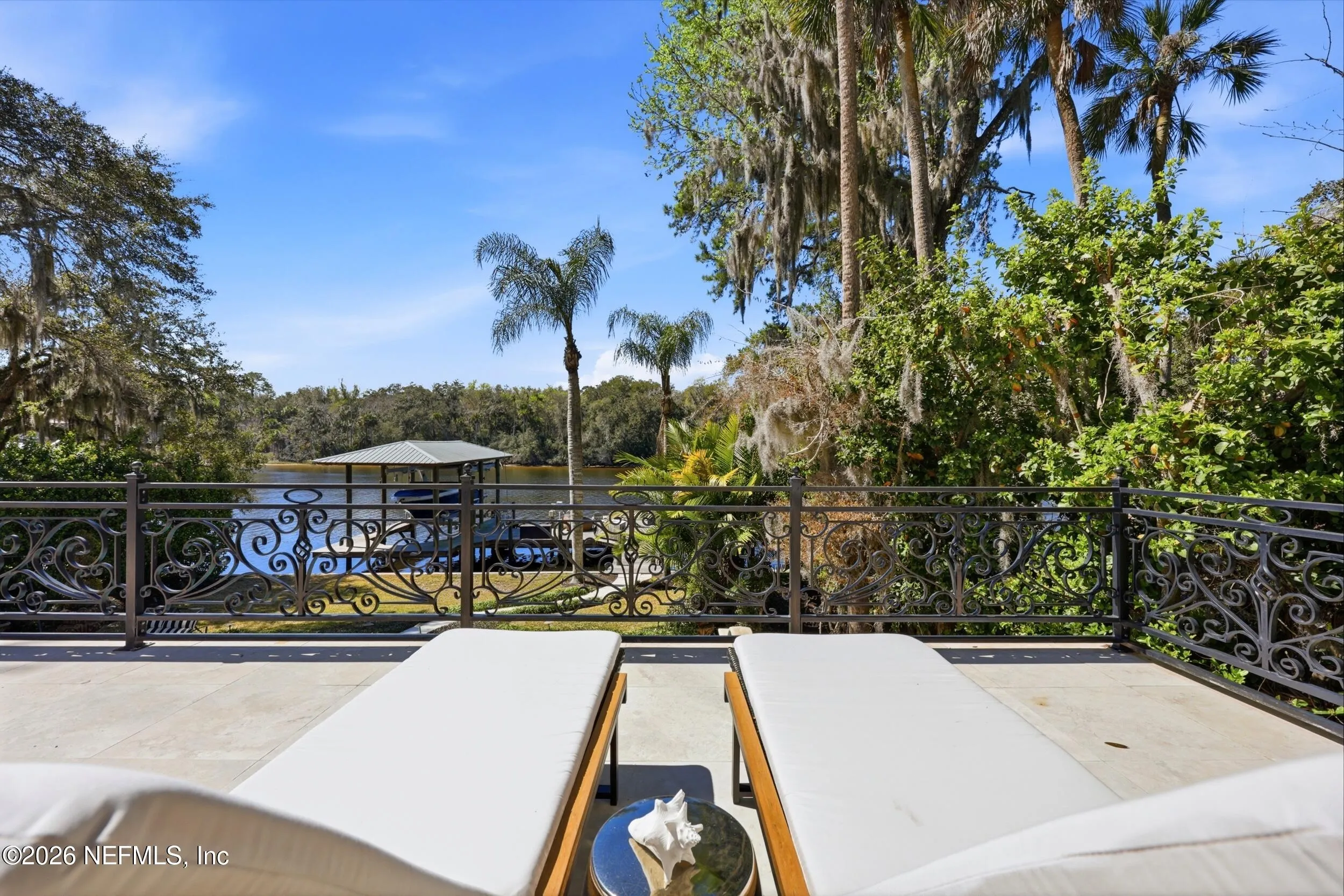 Welcome to your own private waterfront resort -- where the Intracoastal Waterway becomes your backyard and every day feels like a permanent vacation. This extraordinary five-bedroom, six-bathroom residence delivers resort-caliber living along the Intracoastal Waterway in one of Northeast Floridas most coveted coastal communities. Solid concrete construction on the first floor anchors this home with strength and permanence, delivering peace of mind alongside timeless elegance, with travertine and wood floors flowing throughout, while solid mahogany double front entry doors set a tone of elegance and grandeur from the very first step. The culinary kitchen is a chefs paradise, outfitted with a Viking gas range, SubZero refrigerator, Fischer Paykel dishwasher, Jenn Air refrigerator and freezer drawers, quartzite counters, and decorative cabinetry. A wine cellar flanked with imported brick from 17th century Polish church ruins stands ready for your finest vintages. The primary suite features a fireplace, custom walk-in closets, and a private balcony overlooking the waterway. Soak in the tub while savoring panoramic Intracoastal views through an expansive window -- because you deserve that kind of morning. Step outside to nearly a thousand square feet of covered lanai, a summer kitchen with fireplace and grill, and a massive swimming pool with hot tub. Extensive landscape lighting transforms evenings into something magical. For boating enthusiasts, this property is a dream -- situated equal distance between inlets at Mayport and St. Augustine. The private dock features three lifts accommodating vessels up to thirty-five feet, two jet skis, a 21 boat and a convenient wash station. A whole house generator and electric vehicle charger add modern functionality, while a long, gated driveway ensures privacy abounds. This is Northeast Florida waterfront living at its absolute finest.