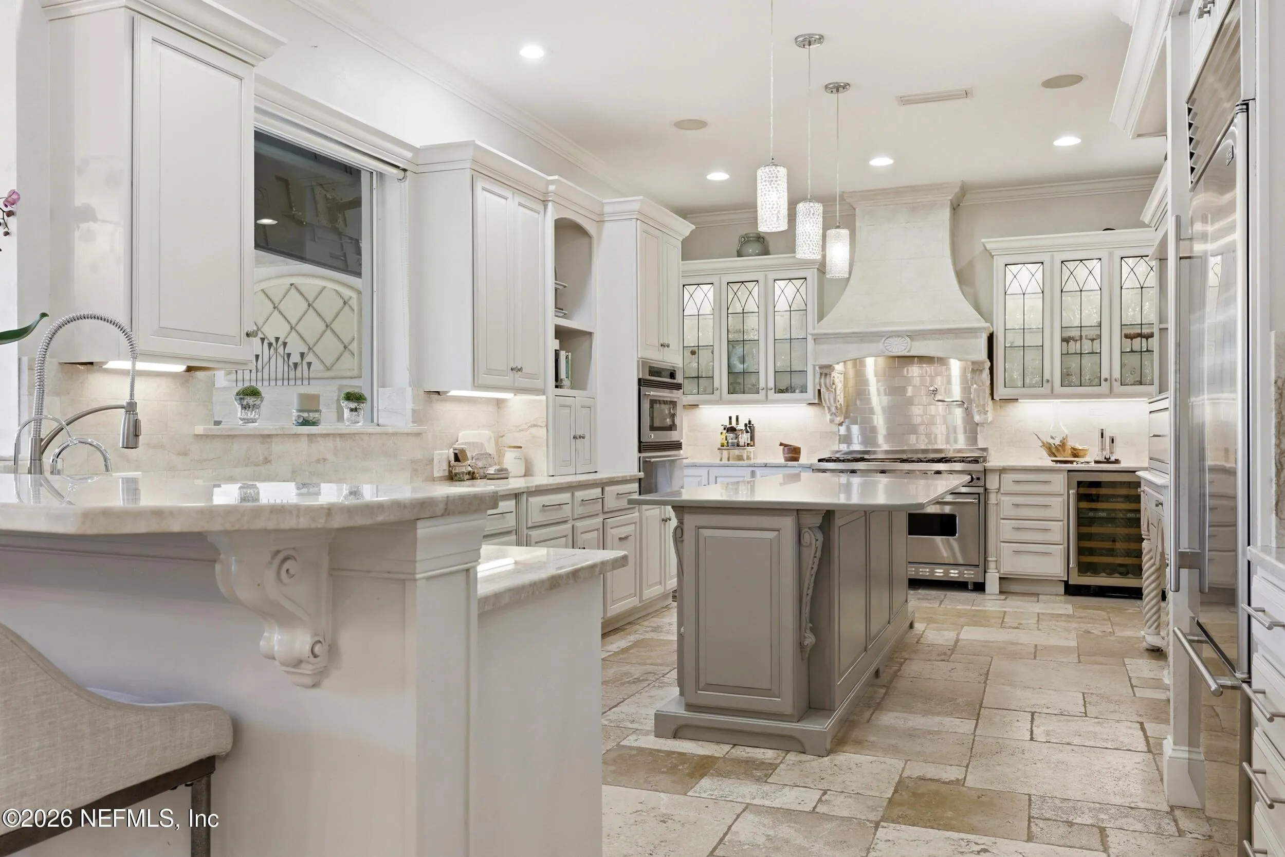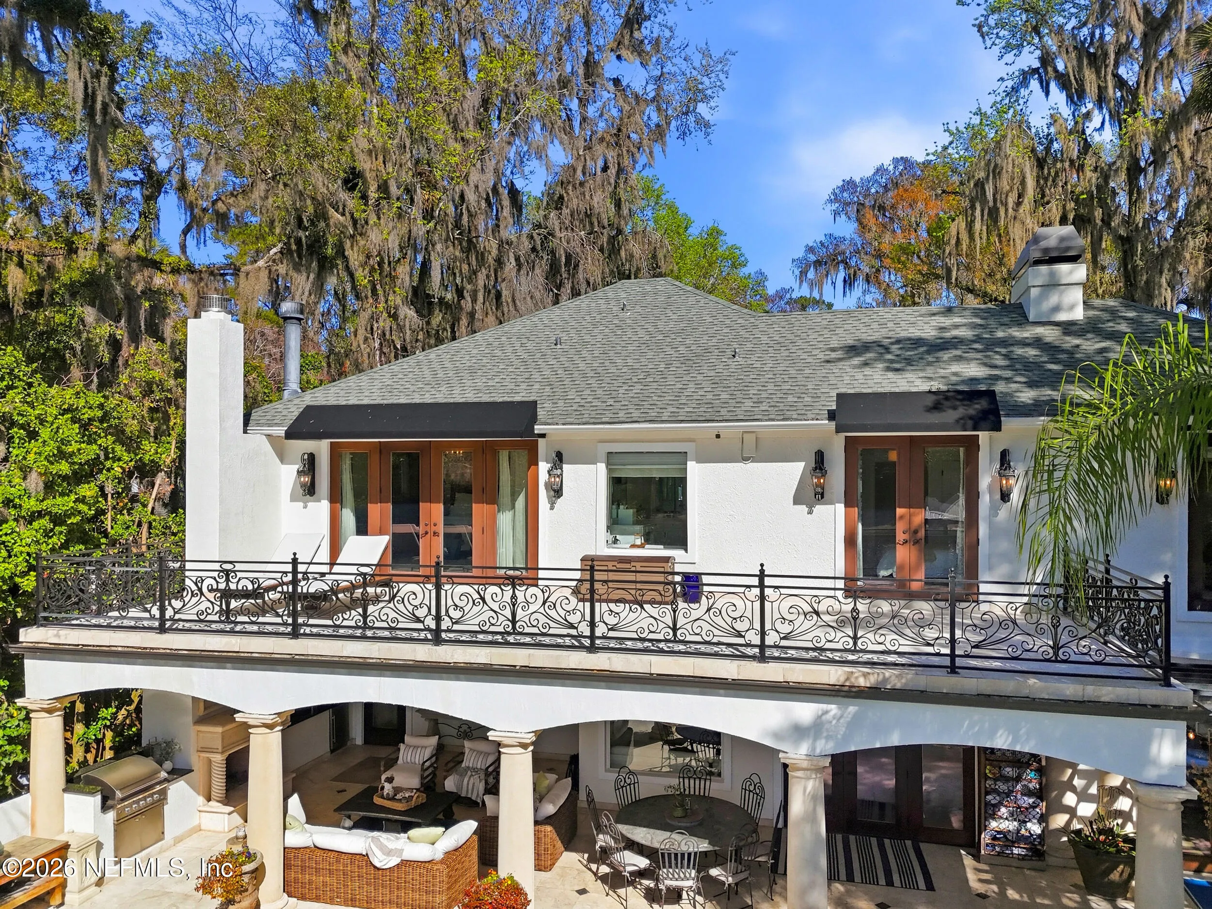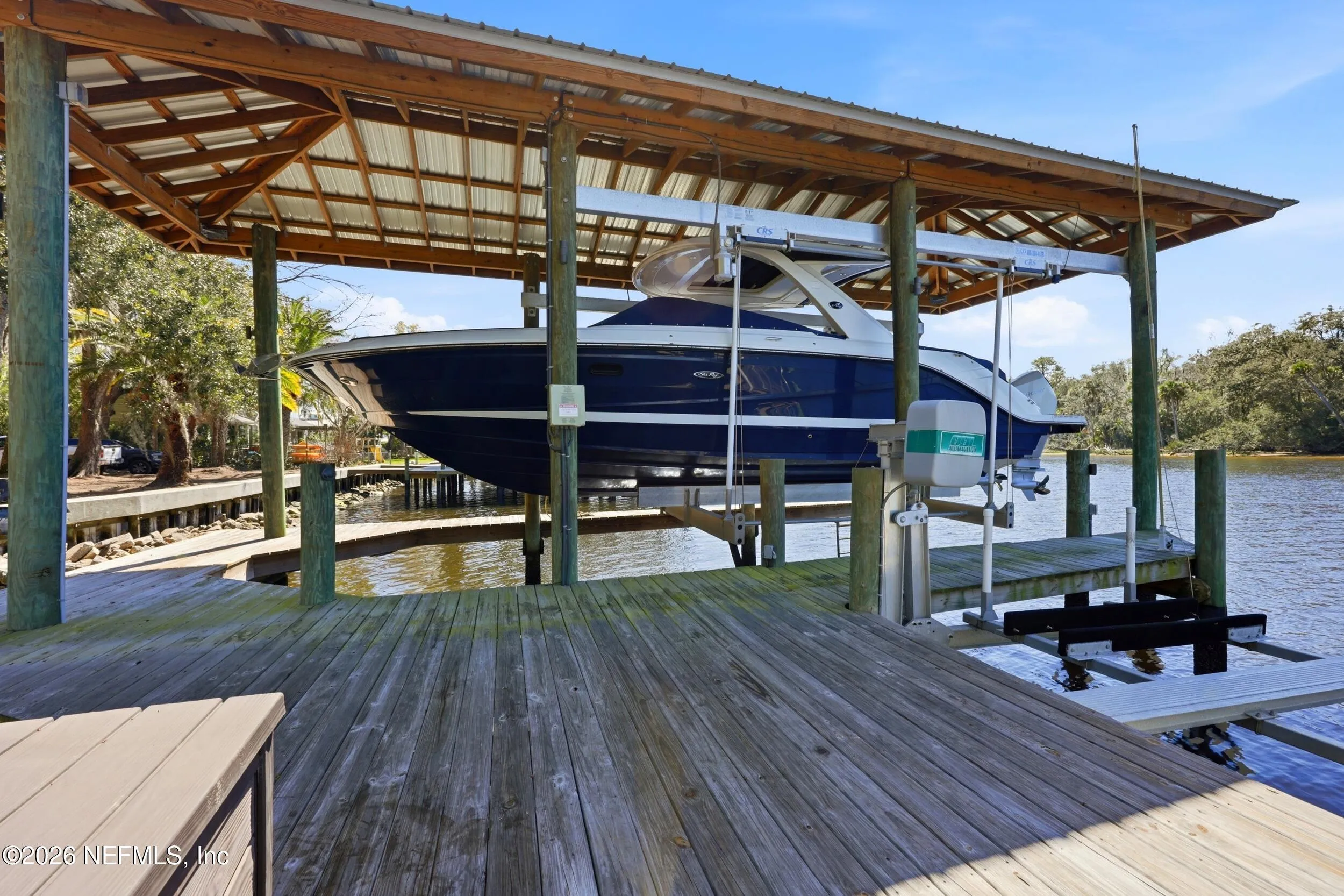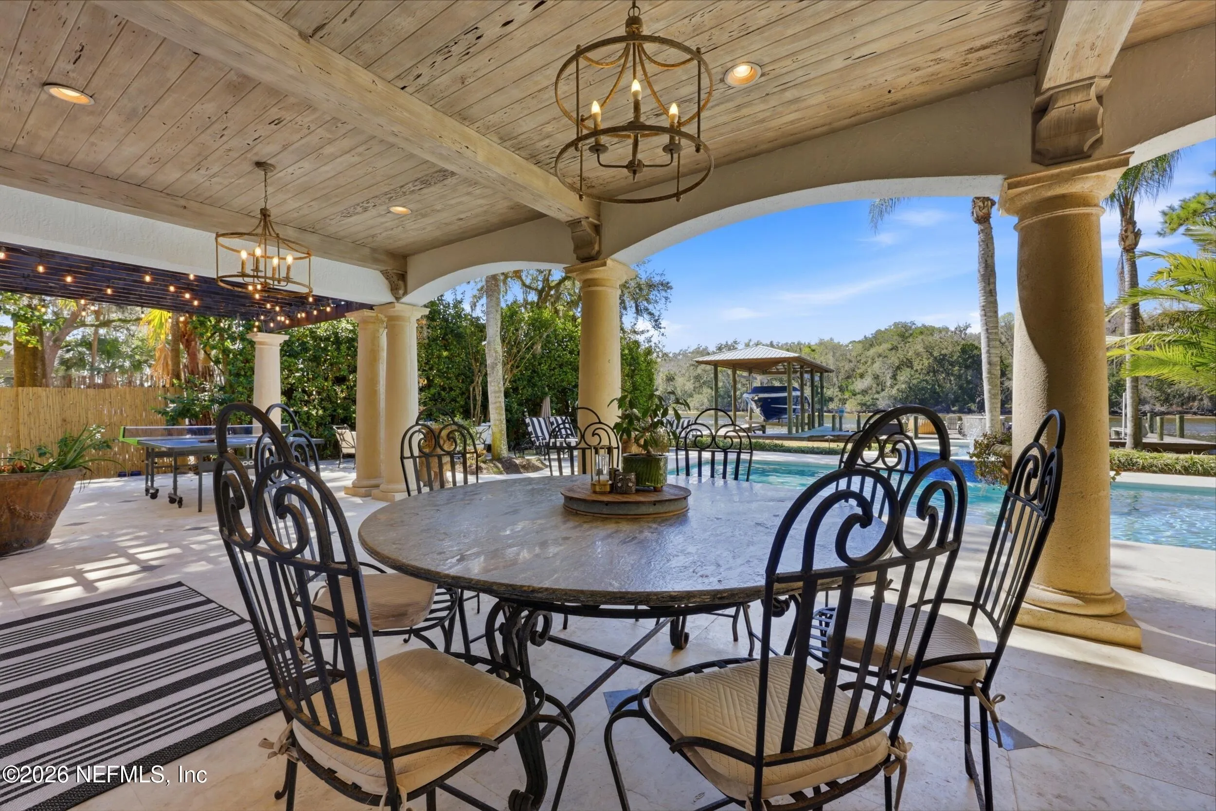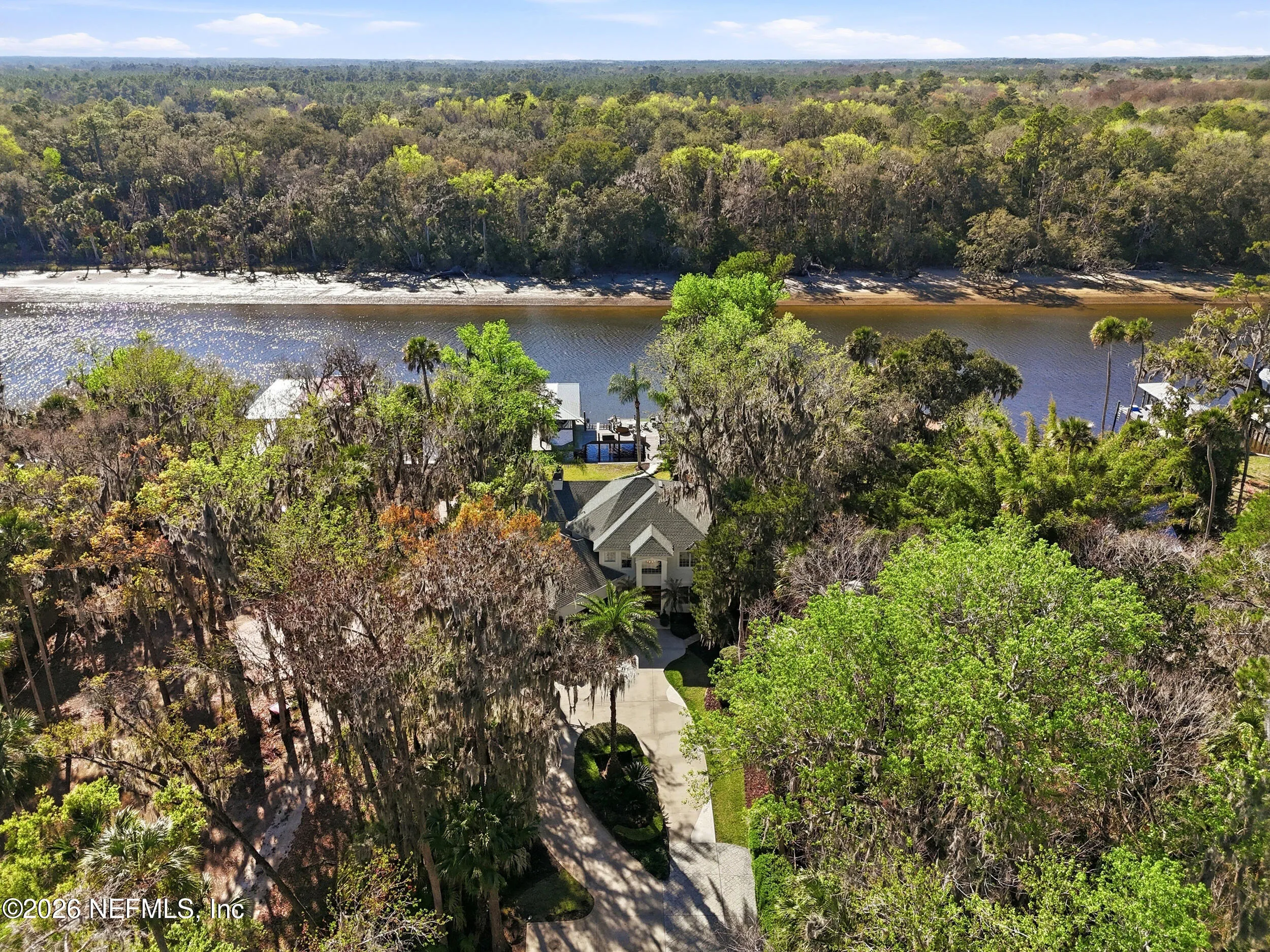 Welcome to your own private waterfront resort -- where the Intracoastal Waterway becomes your backyard and every day feels like a permanent vacation. This extraordinary five-bedroom, six-bathroom residence delivers resort-caliber living along the Intracoastal Waterway in one of Northeast Floridas most coveted coastal communities. Solid concrete construction on the first floor anchors this home with strength and permanence, delivering peace of mind alongside timeless elegance, with travertine and wood floors flowing throughout, while solid mahogany double front entry doors set a tone of elegance and grandeur from the very first step. The culinary kitchen is a chefs paradise, outfitted with a Viking gas range, SubZero refrigerator, Fischer Paykel dishwasher, Jenn Air refrigerator and freezer drawers, quartzite counters, and decorative cabinetry. A wine cellar flanked with imported brick from 17th century Polish church ruins stands ready for your finest vintages. The primary suite features a fireplace, custom walk-in closets, and a private balcony overlooking the waterway. Soak in the tub while savoring panoramic Intracoastal views through an expansive window -- because you deserve that kind of morning. Step outside to nearly a thousand square feet of covered lanai, a summer kitchen with fireplace and grill, and a massive swimming pool with hot tub. Extensive landscape lighting transforms evenings into something magical. For boating enthusiasts, this property is a dream -- situated equal distance between inlets at Mayport and St. Augustine. The private dock features three lifts accommodating vessels up to thirty-five feet, two jet skis, a 21 boat and a convenient wash station. A whole house generator and electric vehicle charger add modern functionality, while a long, gated driveway ensures privacy abounds. This is Northeast Florida waterfront living at its absolute finest.