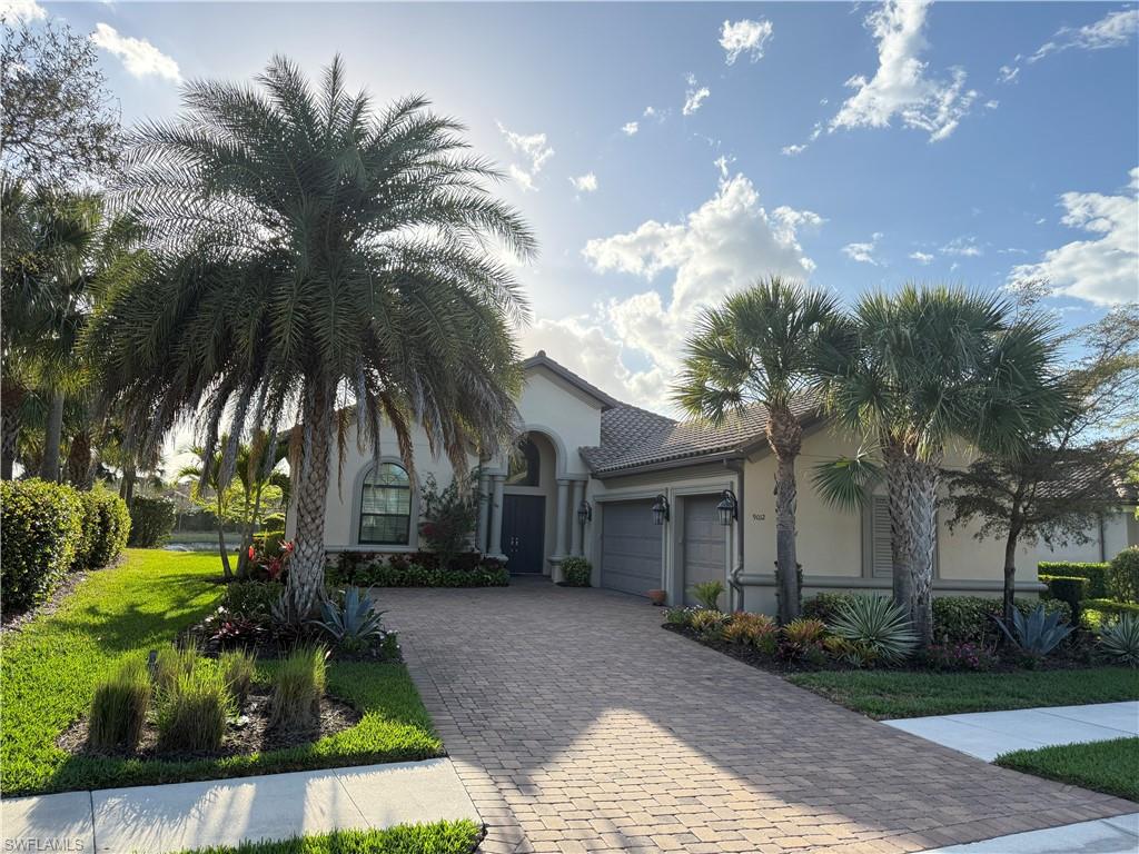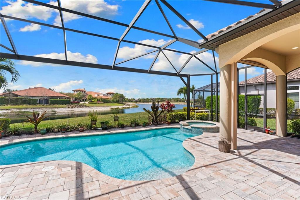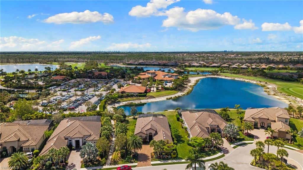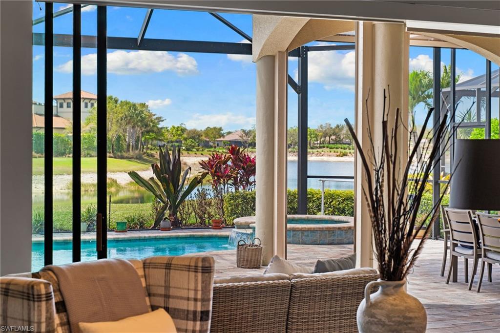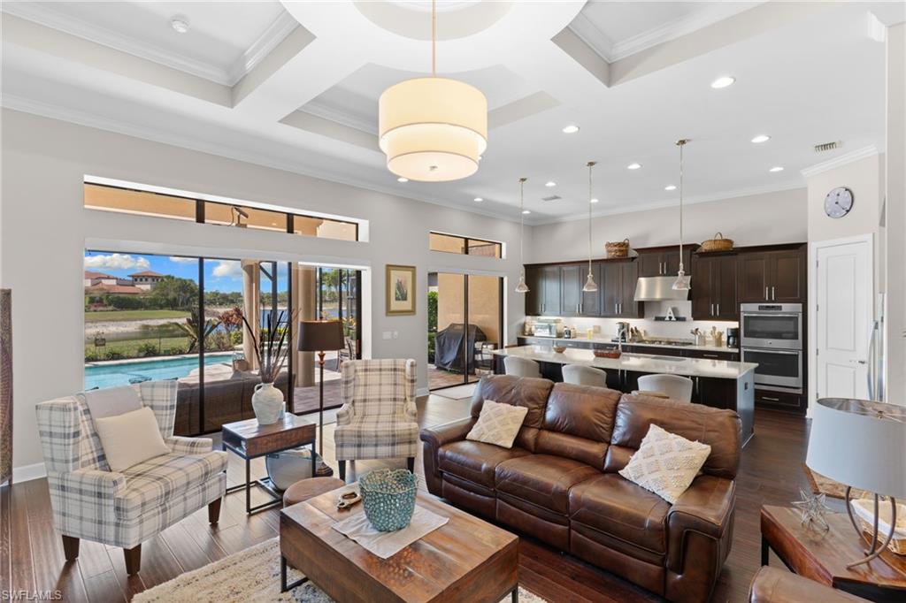 Discover unparalleled luxury and sophistication at 9012 Sorreno Ct, one of a kind home is nestled in the prestigious Esplanade Golf & Country Club of Naples. This Francesco floor plan sits on a premier, oversized lot with long water views, western exposure, and includes a FULL GOLF MEMBERSHIP. Located conveniently next to the club pathway, affording you privacy but quick access to all Esplanade has to offer. Inside the beautiful wood floors give way to a large open floor plan and up to soaring coffered ceilings. Waking up in the master suite is a treat - private, long lake views and warm sun flood the room through the large windows. For maximum privacy, your guest bedrooms are split to provide peace and tranquillity, each with private en-suite baths. The oversized pool and elevated spa sits under a modern, panoramic screen - allowing you to soak in every warm sunset over the lake. Open the pocketing sliding doors and let down your lanai hurricane screens to enjoy the true Florida indoor-outdoor lifestyle. Your 3-car-garage is ideal for car enthusiasts or for shop space - complete with elevated storage and workbench. Esplanade offers the ultimate Florida lifestyle, granting access to world-class amenities including an 18-hole private golf course, resort-style pool with cabanas and Bahama Bar, tennis, pickleball, bocce, Koquina Day Spa, fitness center, dog parks, 14 miles of biking and walking trails, and a 15,000-square-foot clubhouse with fine dining, bar, wine tasting room, wine lockers, and a coffee cafe all covered under low quarterly dues with no additional fees. Dont miss this rare opportunity to own a slice of paradise; schedule your private showing today!