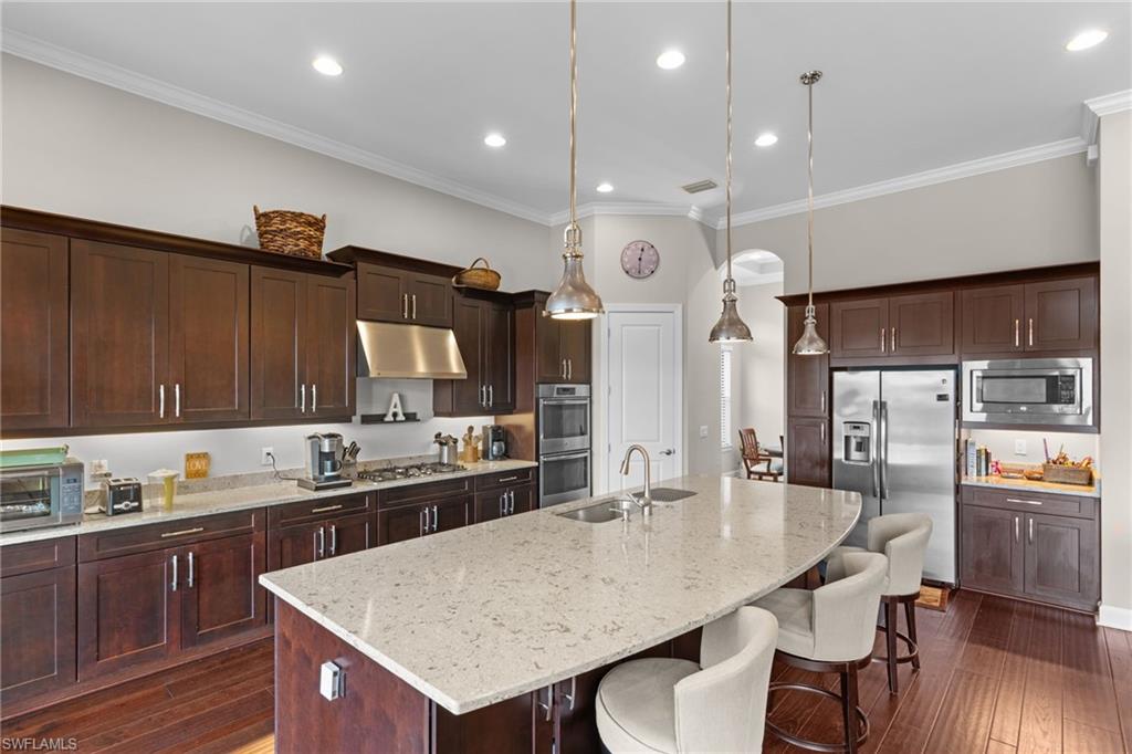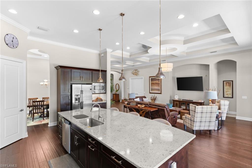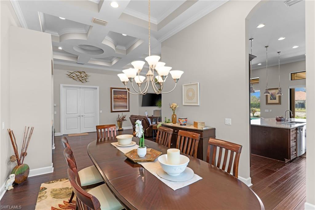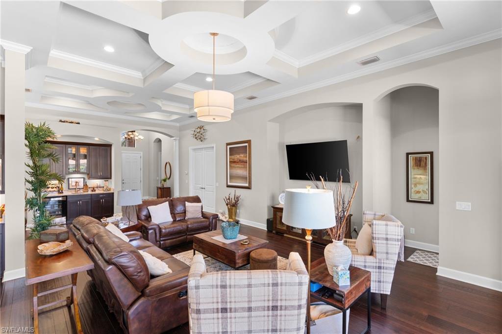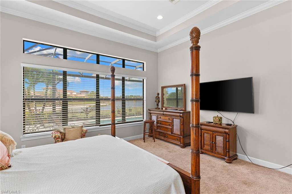 Discover unparalleled luxury and sophistication at 9012 Sorreno Ct, one of a kind home is nestled in the prestigious Esplanade Golf & Country Club of Naples. This Francesco floor plan sits on a premier, oversized lot with long water views, western exposure, and includes a FULL GOLF MEMBERSHIP. Located conveniently next to the club pathway, affording you privacy but quick access to all Esplanade has to offer. Inside the beautiful wood floors give way to a large open floor plan and up to soaring coffered ceilings. Waking up in the master suite is a treat - private, long lake views and warm sun flood the room through the large windows. For maximum privacy, your guest bedrooms are split to provide peace and tranquillity, each with private en-suite baths. The oversized pool and elevated spa sits under a modern, panoramic screen - allowing you to soak in every warm sunset over the lake. Open the pocketing sliding doors and let down your lanai hurricane screens to enjoy the true Florida indoor-outdoor lifestyle. Your 3-car-garage is ideal for car enthusiasts or for shop space - complete with elevated storage and workbench. Esplanade offers the ultimate Florida lifestyle, granting access to world-class amenities including an 18-hole private golf course, resort-style pool with cabanas and Bahama Bar, tennis, pickleball, bocce, Koquina Day Spa, fitness center, dog parks, 14 miles of biking and walking trails, and a 15,000-square-foot clubhouse with fine dining, bar, wine tasting room, wine lockers, and a coffee cafe all covered under low quarterly dues with no additional fees. Dont miss this rare opportunity to own a slice of paradise; schedule your private showing today!