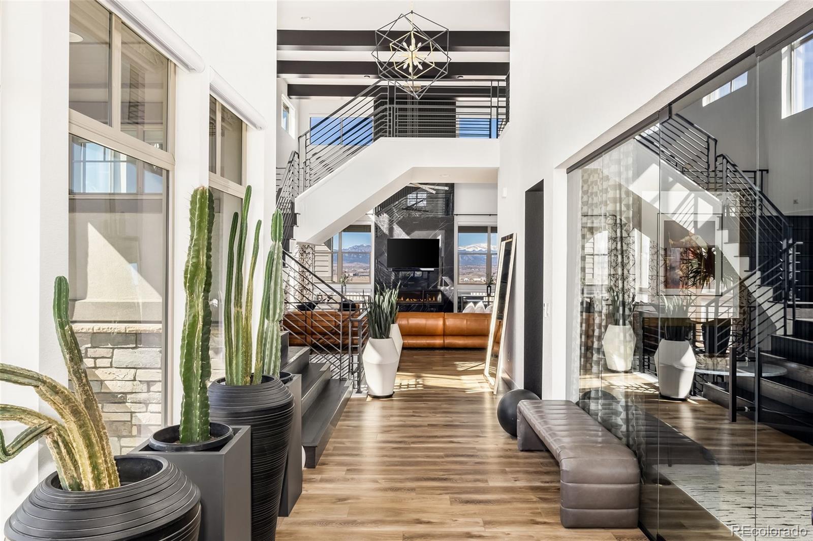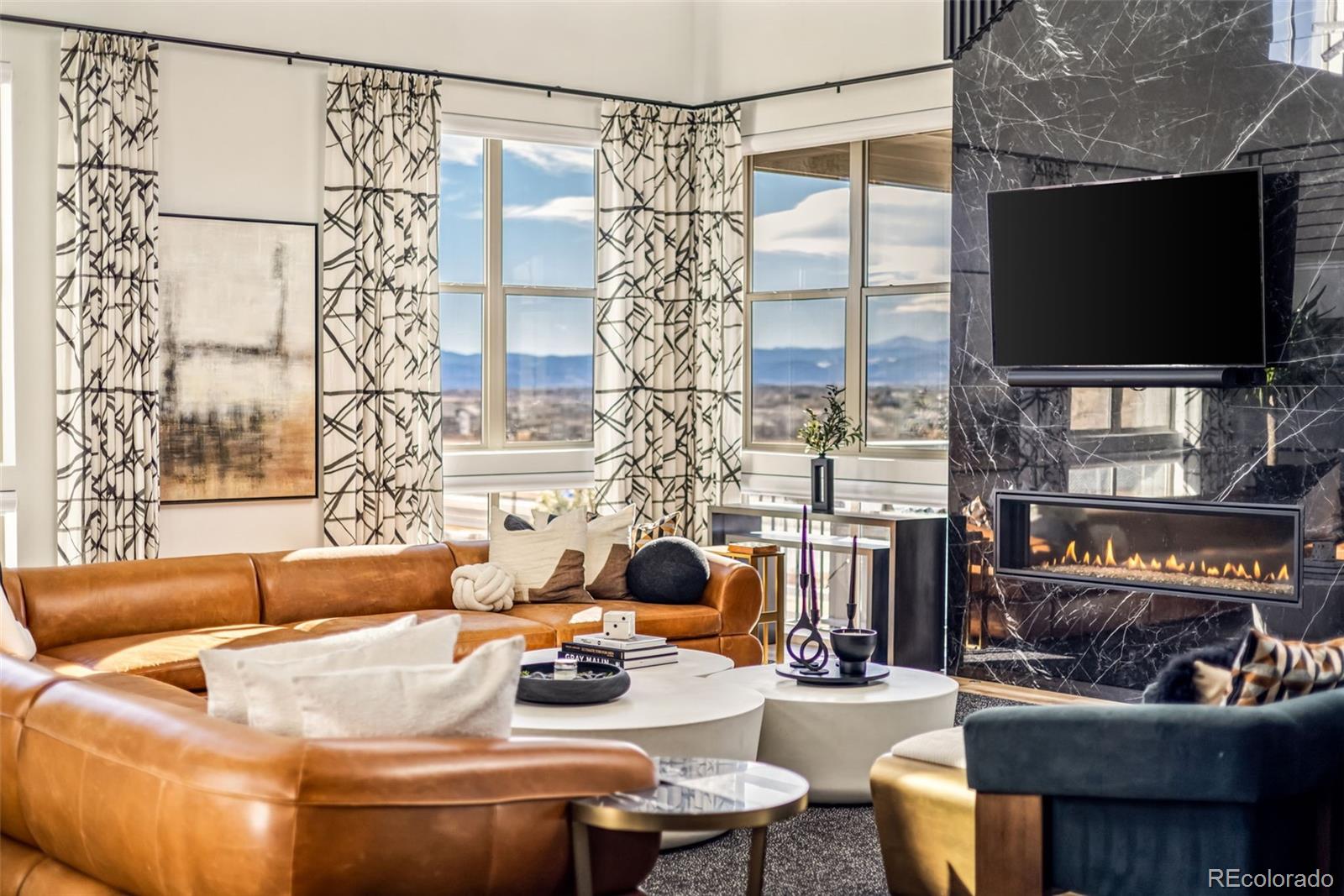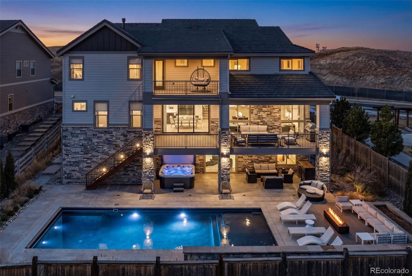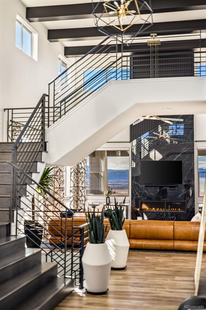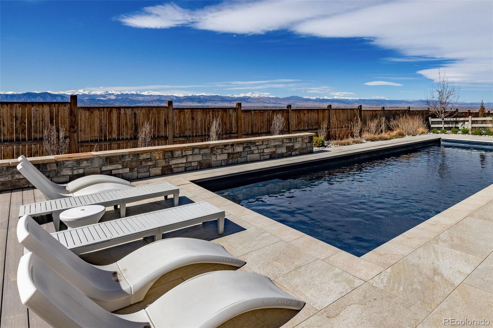Welcome to 15325 King Ct, an exceptional luxury residence in the highly sought-after Anthem community, offering 7 bedrooms, 7 bathrooms, & a 3-car garage with breathtaking Front Range mountain views & a premier lot siding to a park. Designed for both elegance & innovation, the home features whole-home Cat6 wiring, surround sound, remote blinds, & a tankless water heater. The dramatic great room showcases soaring ceilings & a Cosmo gas fireplace wrapped in black marble, framed by expansive windows capturing Colorado views. The chefs kitchen is equally impressive with a Wolf gas range, Miele built-in coffee system, Miele microwave, walk-in pantry, quartz countertops, marble backsplash, & oversized contrasting island. A sophisticated wet bar with beverage fridge, sink, & custom floating shelves makes entertaining effortless. A private glass-enclosed office features soundproofing & an imported moss wall, creating a striking workspace. The main-floor mother-in-law suite offers a wood slab accent wall, built-in dresser, private 3/4 bath, & direct deck access with mountain views. The mudroom includes built-ins, designer wallpaper, custom Roman shades, & walk-in closet. Upstairs, the primary retreat features tray ceiling, custom wallpaper, Cosmo fireplace, private covered deck with mountain views, & spa-inspired 5-piece bath with chandelier-lit water closet, wet room with freestanding tub & oversized shower, & walk-in closet. 3 additional bedrooms each include private ensuite baths, plus upstairs laundry. The finished basement provides a bedroom, gym, & flex space with wet bar with wine/beverage fridge, sink, & dishwasher, with walk-out backyard access. Outside, enjoy resort-style living with heated saltwater pool, custom gas firepit, natural gas line, & multiple outdoor spaces overlooking the mountains. A rare opportunity to own a fully integrated luxury home in Anthem combining design, technology, & Colorado views.