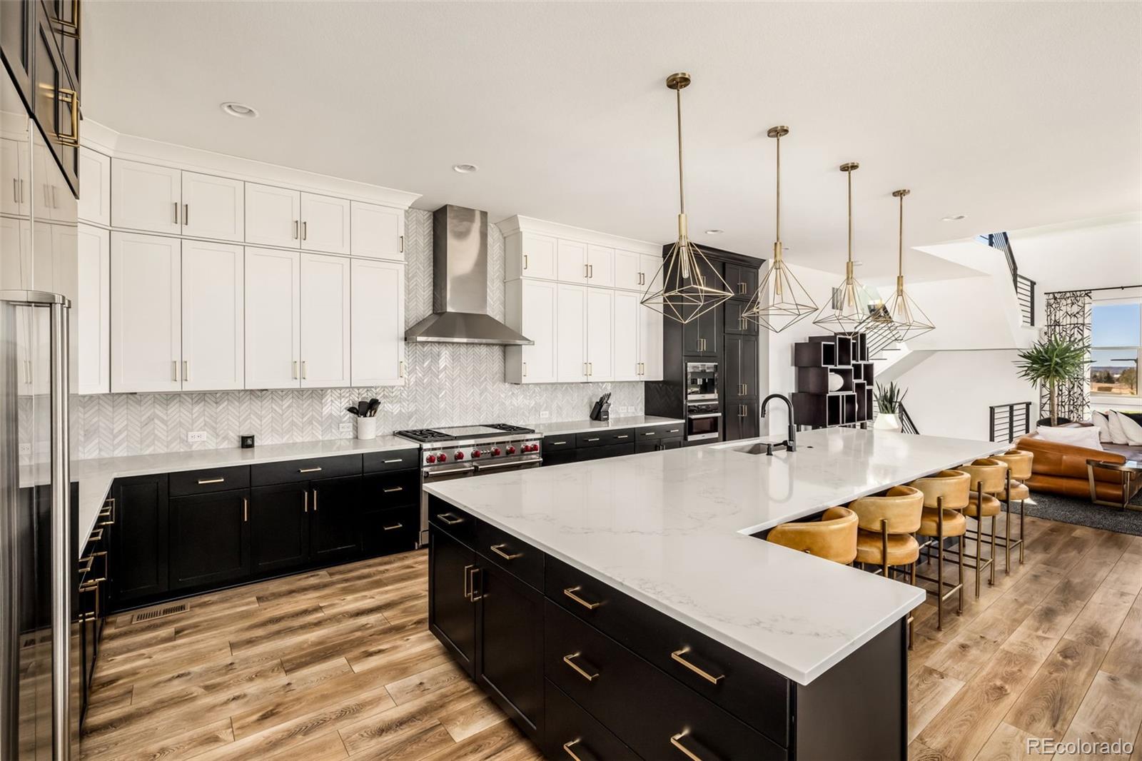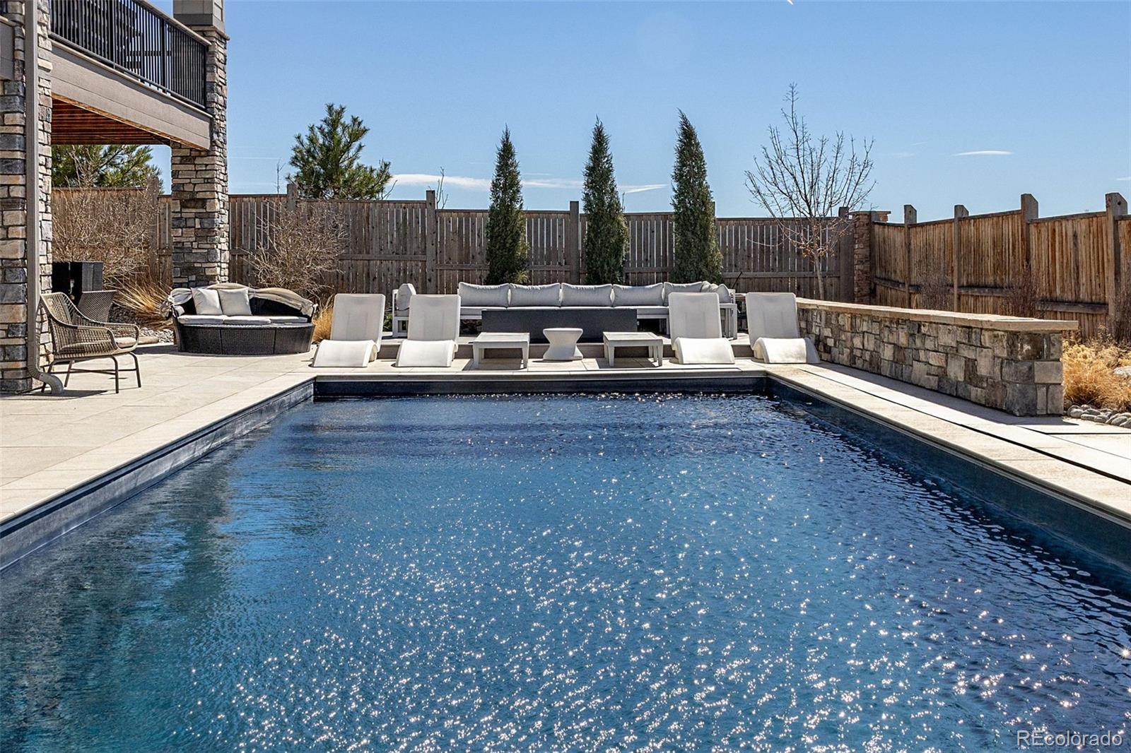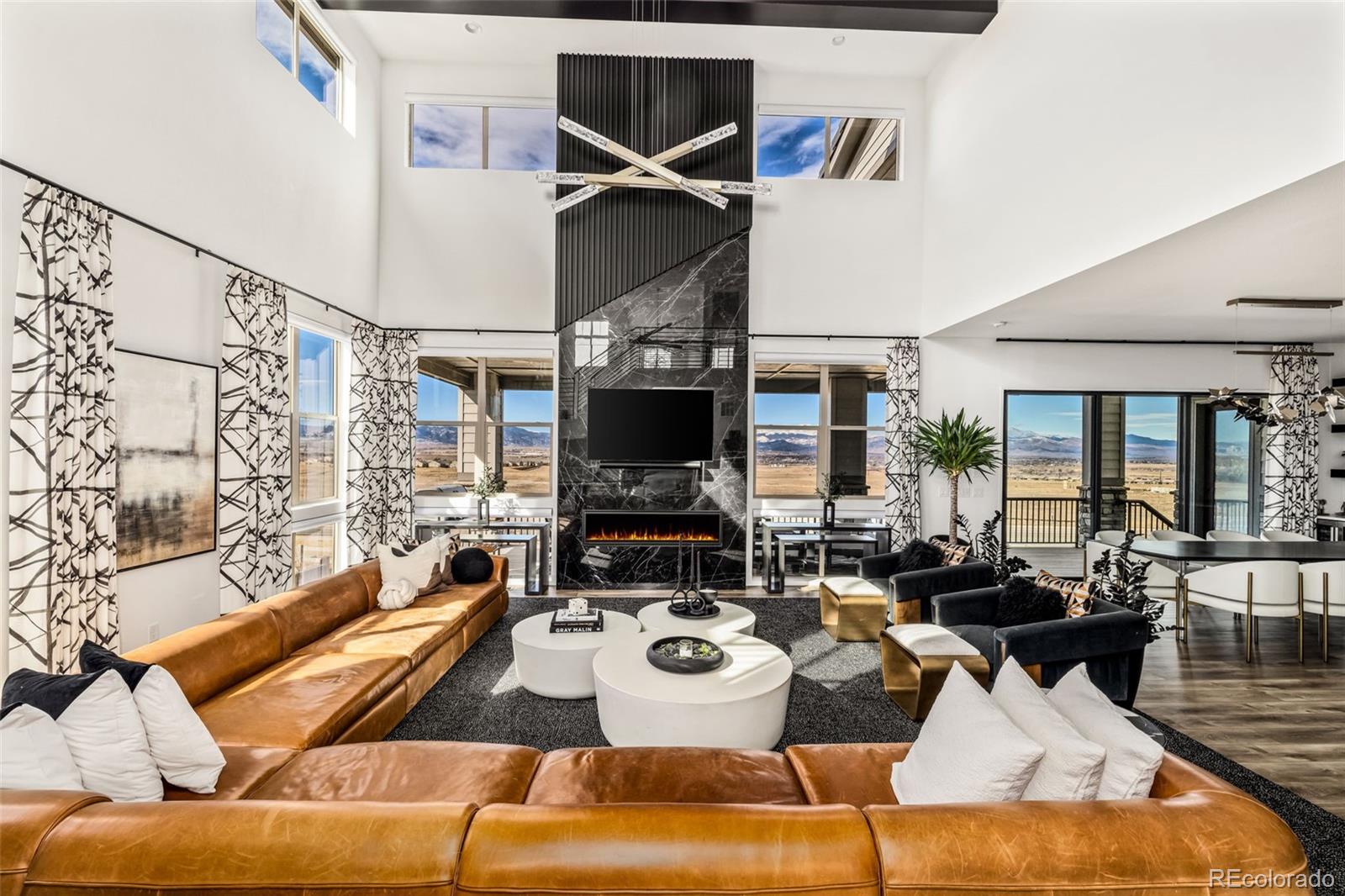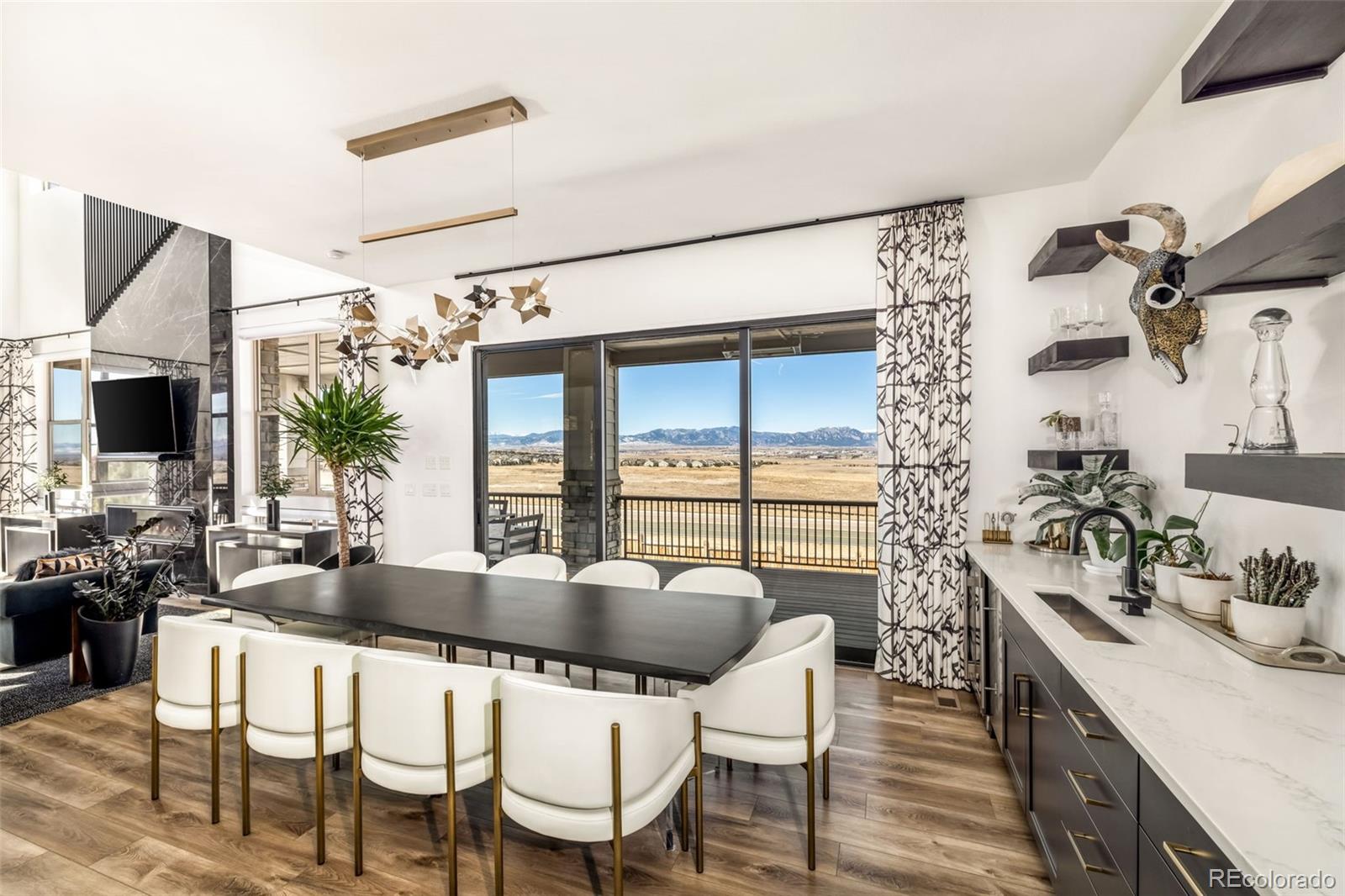 Welcome to 15325 King Ct, an exceptional luxury residence in the highly sought-after Anthem community, offering 7 bedrooms, 7 bathrooms, & a 3-car garage with breathtaking Front Range mountain views & a premier lot siding to a park. Designed for both elegance & innovation, the home features whole-home Cat6 wiring, surround sound, remote blinds, & a tankless water heater. The dramatic great room showcases soaring ceilings & a Cosmo gas fireplace wrapped in black marble, framed by expansive windows capturing Colorado views. The chefs kitchen is equally impressive with a Wolf gas range, Miele built-in coffee system, Miele microwave, walk-in pantry, quartz countertops, marble backsplash, & oversized contrasting island. A sophisticated wet bar with beverage fridge, sink, & custom floating shelves makes entertaining effortless. A private glass-enclosed office features soundproofing & an imported moss wall, creating a striking workspace. The main-floor mother-in-law suite offers a wood slab accent wall, built-in dresser, private 3/4 bath, & direct deck access with mountain views. The mudroom includes built-ins, designer wallpaper, custom Roman shades, & walk-in closet. Upstairs, the primary retreat features tray ceiling, custom wallpaper, Cosmo fireplace, private covered deck with mountain views, & spa-inspired 5-piece bath with chandelier-lit water closet, wet room with freestanding tub & oversized shower, & walk-in closet. 3 additional bedrooms each include private ensuite baths, plus upstairs laundry. The finished basement provides a bedroom, gym, & flex space with wet bar with wine/beverage fridge, sink, & dishwasher, with walk-out backyard access. Outside, enjoy resort-style living with heated saltwater pool, custom gas firepit, natural gas line, & multiple outdoor spaces overlooking the mountains. A rare opportunity to own a fully integrated luxury home in Anthem combining design, technology, & Colorado views.