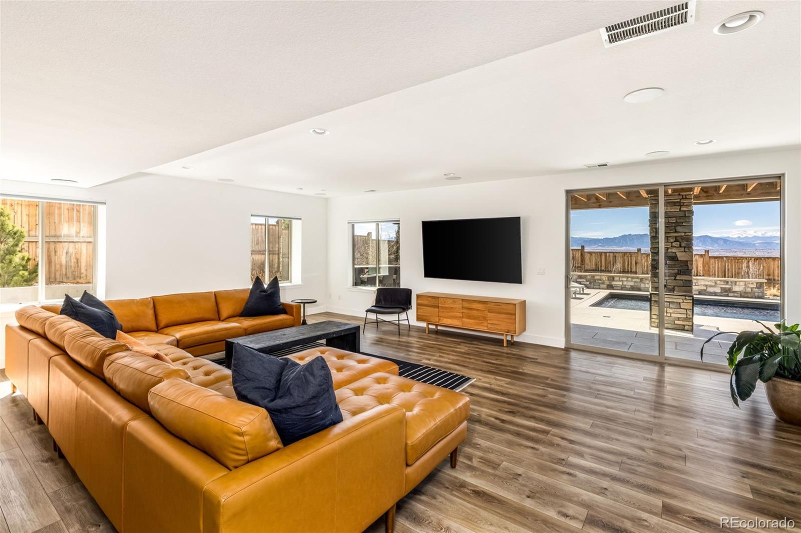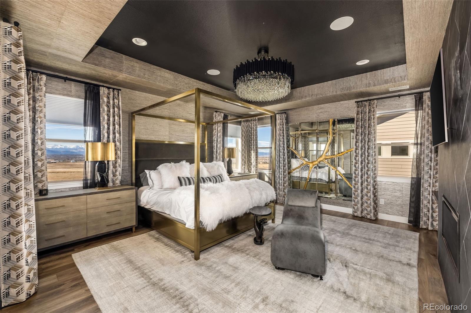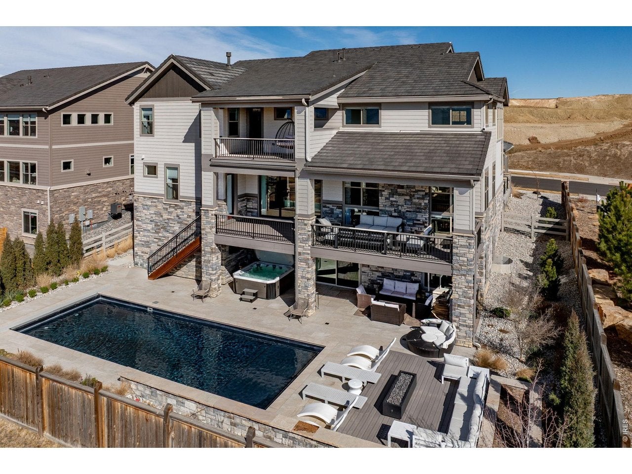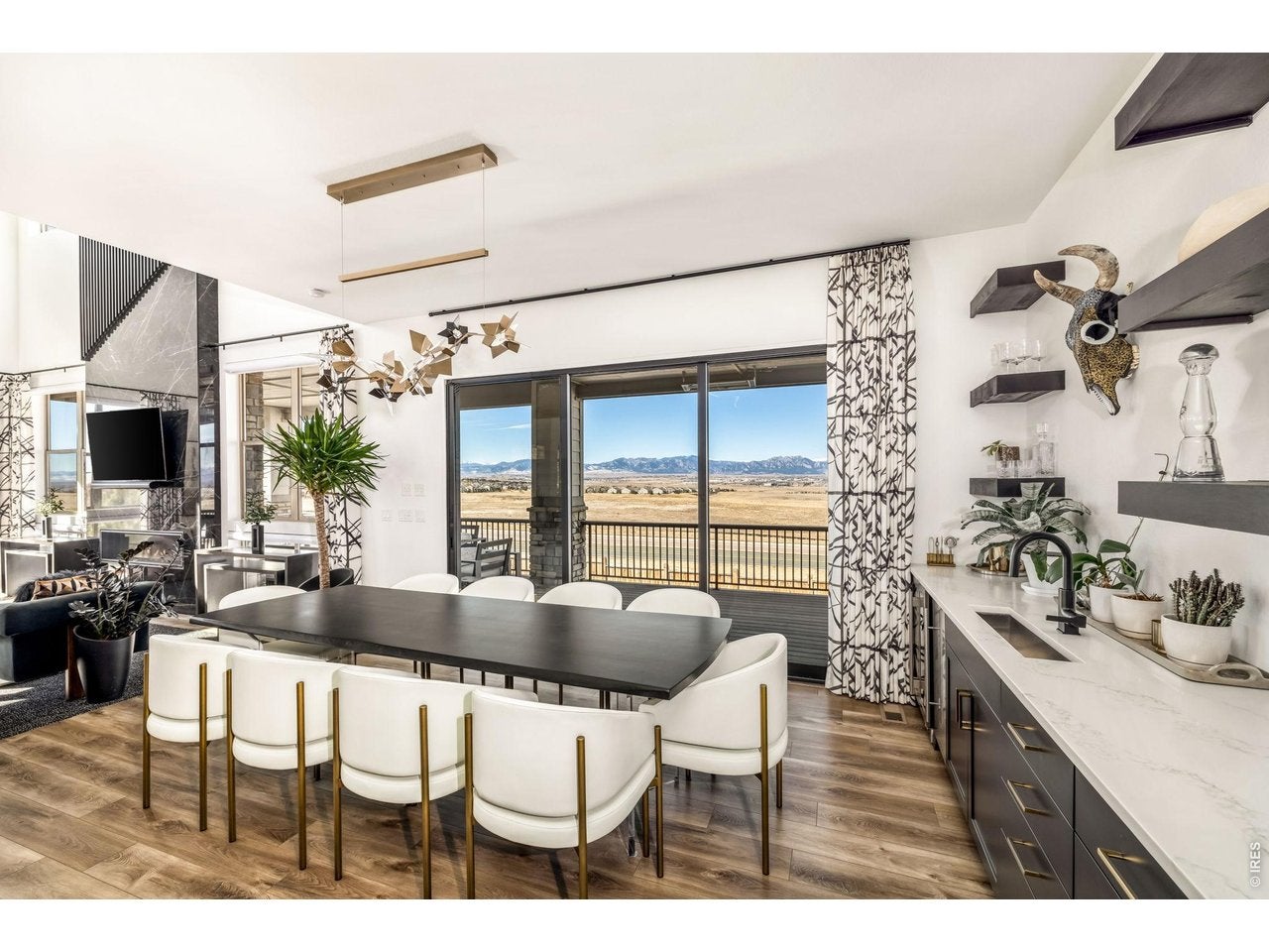 Welcome to 15325 King Ct, an exceptional luxury residence in the highly sought-after Anthem community, offering 7 bedrooms, 7 bathrooms, & a 3-car garage with breathtaking Front Range mountain views & a premier lot siding to a park. Designed for both elegance & innovation, the home features whole-home Cat6 wiring, surround sound, remote blinds, & a tankless water heater. The dramatic great room showcases soaring ceilings & a Cosmo gas fireplace wrapped in black marble, framed by expansive windows capturing Colorado views. The chefs kitchen is equally impressive with a Wolf gas range, Miele built-in coffee system, Miele microwave, walk-in pantry, quartz countertops, marble backsplash, & oversized contrasting island. A sophisticated wet bar with beverage fridge, sink, & custom floating shelves makes entertaining effortless. A private glass-enclosed office features soundproofing & an imported moss wall, creating a striking workspace. The main-floor mother-in-law suite offers a wood slab accent wall, built-in dresser, private 3/4 bath, & direct deck access with mountain views. The mudroom includes built-ins, designer wallpaper, custom Roman shades, & walk-in closet. Upstairs, the primary retreat features tray ceiling, custom wallpaper, Cosmo fireplace, private covered deck with mountain views, & spa-inspired 5-piece bath with chandelier-lit water closet, wet room with freestanding tub & oversized shower, & walk-in closet. 3 additional bedrooms each include private ensuite baths, plus upstairs laundry. The finished basement provides a bedroom, gym, & flex space with wet bar with wine/beverage fridge, sink, & dishwasher, with walk-out backyard access. Outside, enjoy resort-style living with heated saltwater pool, custom gas firepit, natural gas line, & multiple outdoor spaces overlooking the mountains. A rare opportunity to own a fully integrated luxury home in Anthem combining design, technology, & Colorado views.