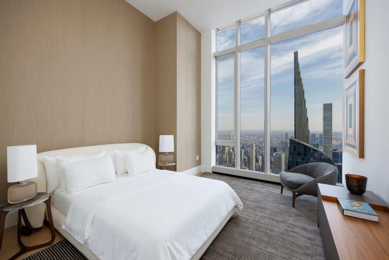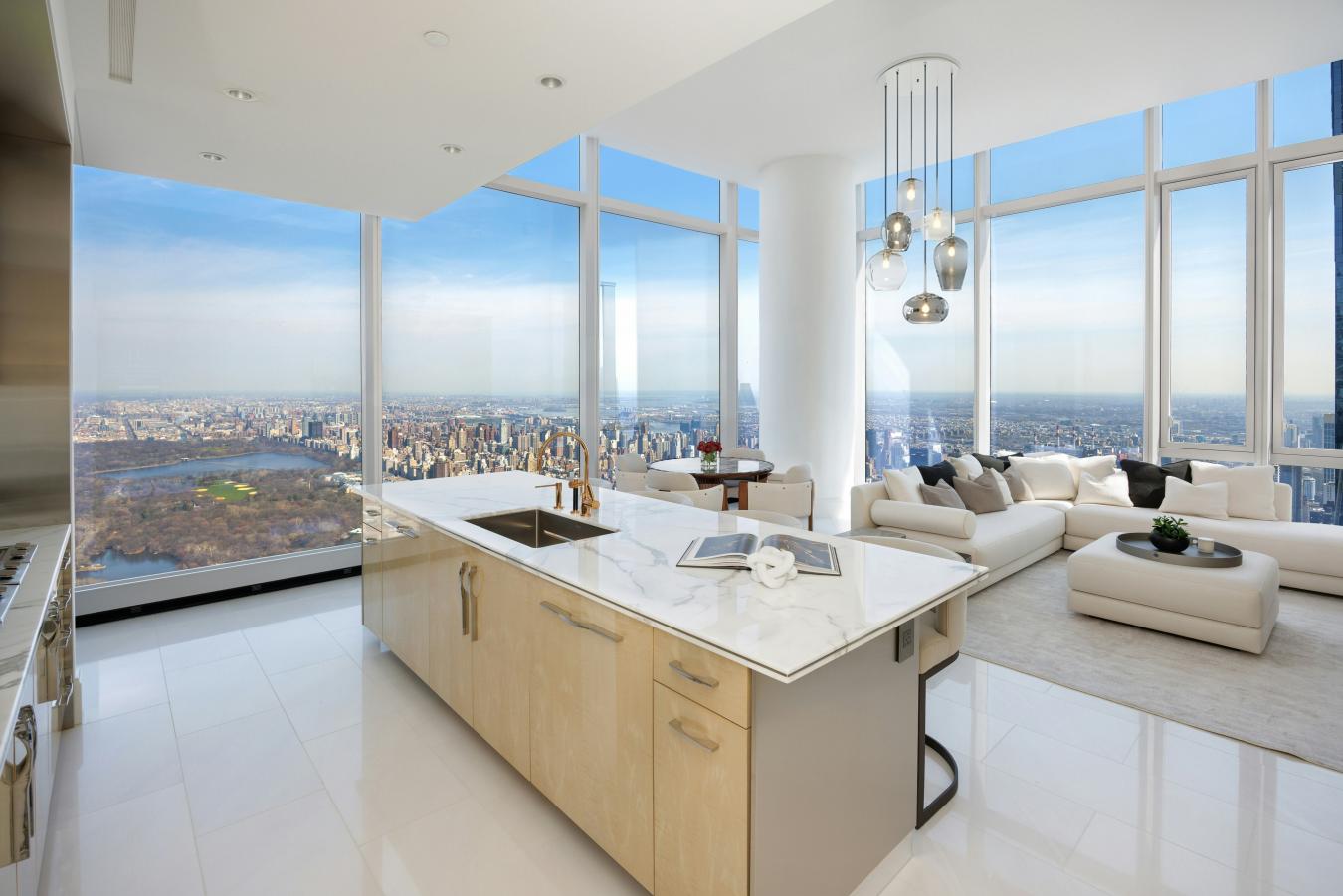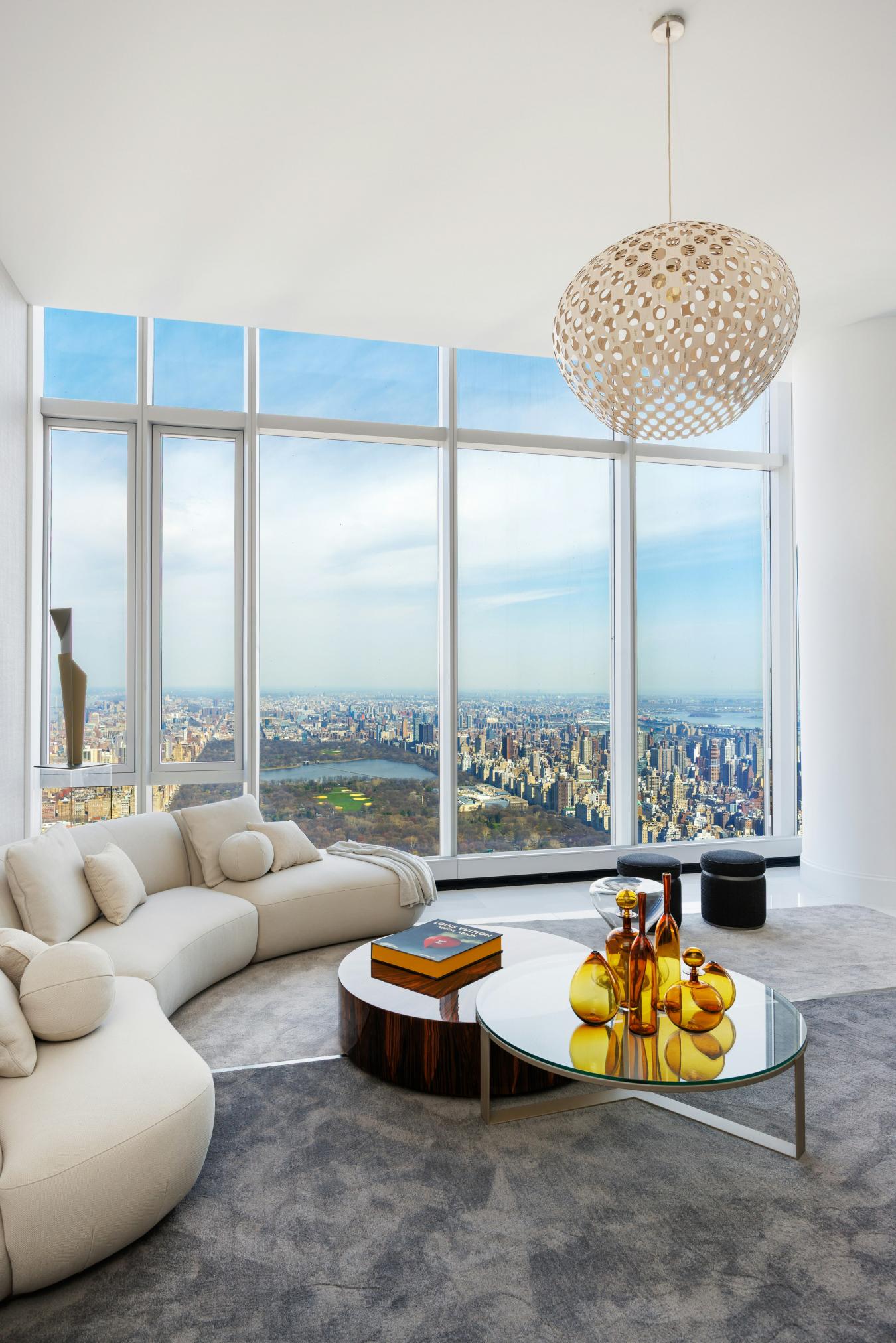 UNOBSTRUCTED views and EXTRA high ceilings. This jaw- dropping half-floor residence floats directly over Central Park, soaring 1,000 feet above New York City with Park views, unobstructed by any buildings. Welcome to Apartment 97E at Central Park Tower, a truly exquisite 4-bedroom, 4.5 bathroom, over 4250 square foot home, with 3 corner views and magnificent 136 ceiling heights, the highest in the building. This gorgeous residence is the epitome of ultra luxury, featuring floor-to-ceiling, sound-insulated glass walls that fill each space with natural light while showcasing expansive views in every direction. Enter via a formal entry foyer, where you are immediately captivated by the sweeping vistas overlooking Central Park and expanding to both the Hudson and East Rivers. The expansive 376" X 25" corner living and dining room is grand and gracious, leaving enough room for three separate living spaces and a large formal dining table. There is also a jewel box powder room off the foyer, and a walk-in coat closet. Conveniently adjacent to the living/dining room is the North and East corner, open chefs kitchen/great room, thoughtfully designed for both form and function. The kitchen features stunning custom cabinetry by Smallbone of Devizes, elegant stone slab counters, fully integrated Miele appliances, and an under-mount sink. The bedroom wing is appropriately separate, with 4 large bedrooms. Privately tucked away on the South East corner of the home is the primary bedroom suite, truly a tranquil retreat. Imagine waking up every morning to open East views and iconic South views of the Empire State Building, all the way to the Statue of Liberty! The primary suite also features a luxurious five-fixture bathroom and 2 extremely generous walk-in closets. There are 3 additional well-proportioned bedrooms, each with an en-suite bathroom and equally impressive views, a side by side full sized washer/dryer, and a state of the art HVAC system. Staging with custom made furniture by Artefacto and wallpaper by Wall Boutique/ Élitis. Rising along Manhattans prestigious Billionaires Row, Central Park Tower holds the distinction of being the tallest residential building in the world. Residents enjoy white-glove service, including 24-hour doormen and concierge service, as well as access to the exclusive Central Park Club-a 50,000-square-foot private amenity collection spanning three levels. Highlights include a grand ballroom, restaurant, lounge, wine cellar, and cigar room on the 100th floor; a 63-foot indoor saltwater pool, fitness center, spa, squash court, and half basketball court on the 16th floor; and a landscaped terrace on the 14th floor featuring a second 60-foot outdoor pool, sun deck, and private cabanas. A 40 square foot storage bin transfers with this apartment. Please note that there is a working capital contribution equal to 2 months of common charges paid by the purchaser. Please call for a private appointment.