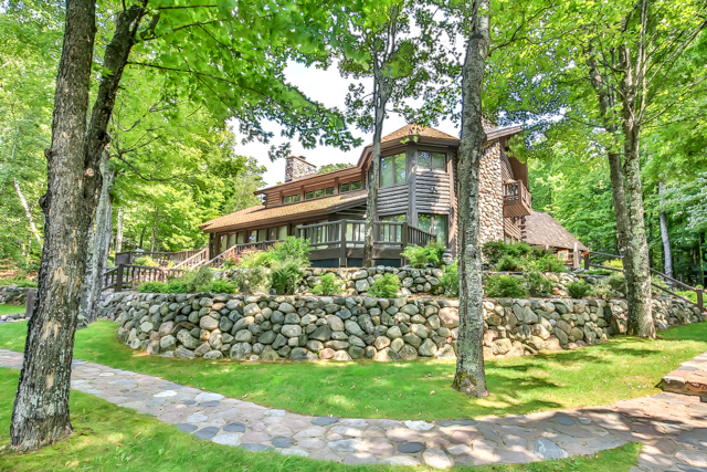 Improved Price! Designed with Distinction in this custom built modern-style home with handsome exterior of stone and hardi-board siding in a deep rich color palette and dramatic roof angles. Luxury interior featuring tucked away dedicated office or formal living room for privacy, elevated vaulted ceilings in the great room with expansive windows showcasing endless views of the lake and mountains, stone fireplace and steel railings compliment the warmth of the hardwood floors, gourmet kitchen with premium appliances / dual ovens / desirable gas range / large center island / lots of cabinets for ample storage plus large walk-in pantry, roomy dining area, seamless indoor-outdoor flow to the expansive covered deck for year-round entertaining. Primary bedroom with ensuite having generous tiled shower with multiple shower heads / dual sinks, walk-in closet with washer and dryer hookups. Additional bedroom with ensuite on main level, and mud room with half bath. The finished lower level is ideal for entertaining in the extensive family room complete with wet-bar and sliding doors to large covered patio and fire pit area, two additional comfortable bedrooms and 1 full bath. Thoughtfully designed bonus space just steps away featuring exercise room, theater room area and plenty of room for family game night. Ample space for vehicles, recreational toys and storage in the multi-car garage. Owner is a licensed real estate agent. Schedule via Aligned Showings.
