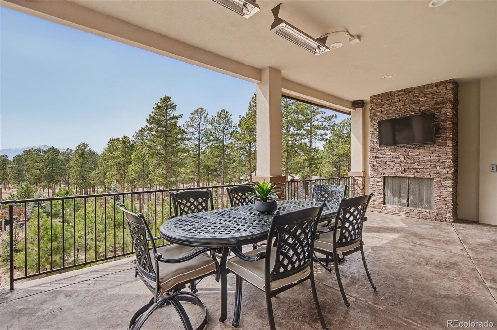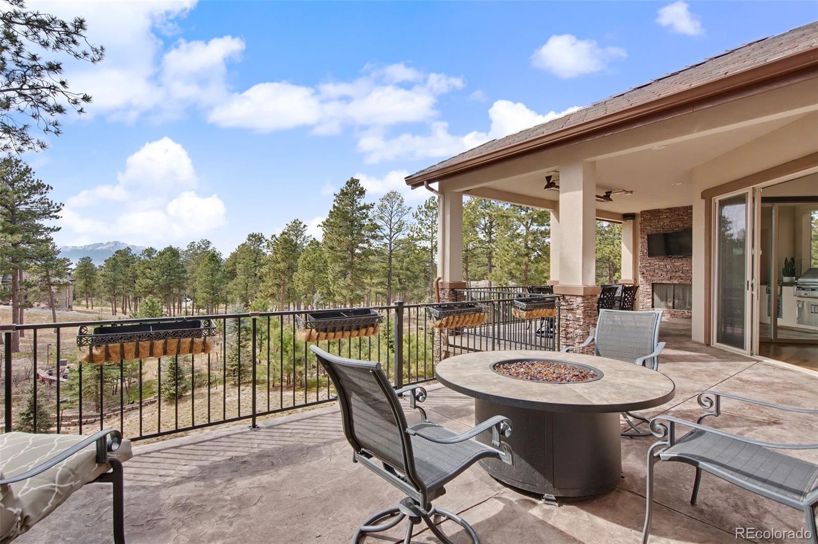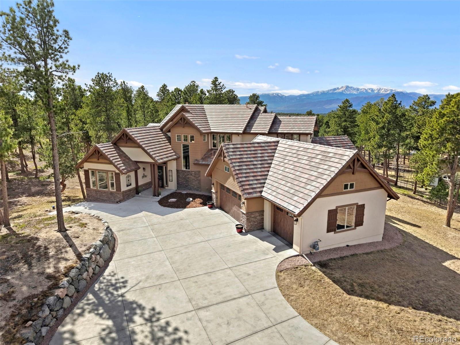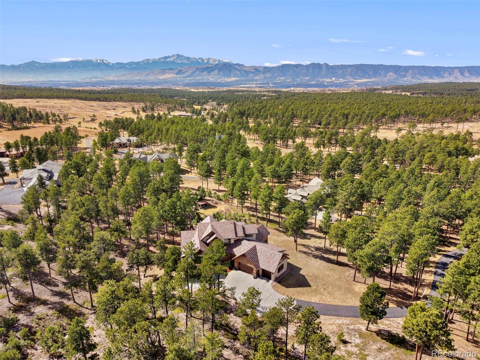Welcome to this stunning Cathedral Pines home, an exemplary custom residence featuring a 5-car garage that artfully combines luxury, craftsmanship, and a quintessential Colorado flair. As you enter, you are greeted by breathtaking framed views of Pikes Peak, complemented by a vaulted great room that showcases a stacked stone fireplace. The beautiful shiplap detailing and hickory floors establish an atmosphere of refined quality throughout. The gourmet kitchen features a substantial island adorned with a single slab of granite that boasts seamless veining. Equipped with double ovens and a 6-burner gas range, designed for functionality and style. Expansive 8-foot sliding doors illuminate the dining area and lead to an outdoor kitchen on a covered deck, complete with a fireplaceperfect for enjoying dining and observing sunsets around the firepit. On the main level, the primary suite serves as a private retreat, including a fireplace and a spa-style bath with a steam shower, soaking tub, and heated floors, along with a spacious walk-in closet. Additionally, this level includes a dedicated study and a large guest suite offering not only a bedroom, but a living room, wet bar, bathroom with heated floors, and a private deck. The walkout basement is tailored for entertaining, showcasing a family room and rec room that share a dual-sided fireplace. An inviting game area, a generous wet bar complete w/ a full-sized refrigerator and dishwasher, a theater area, and a temp-controlled wine cellar elevates this space. Also includes a bedroom and full bath. Venture upstairs to discover more of the stunning views from the loft and two bedrooms, & full bath. Addl highlights of this home are 3 furnaces, central air, a humidifier, a whole-house water filtration system, built-in speakers, Control 4, and dedicated storage. The neighborhood has a trail system ideal for hiking and biking, adjacent to Black Forest Regional Park. This residence is the very best of Colorado living!