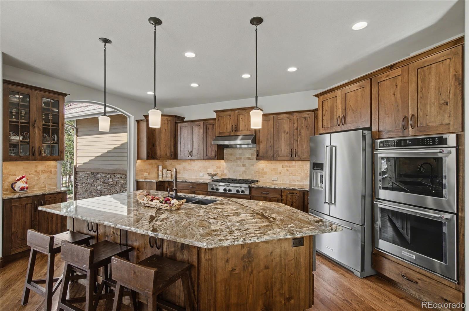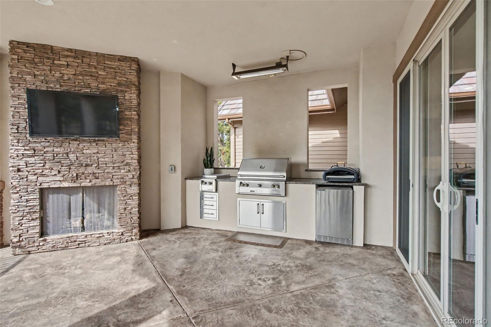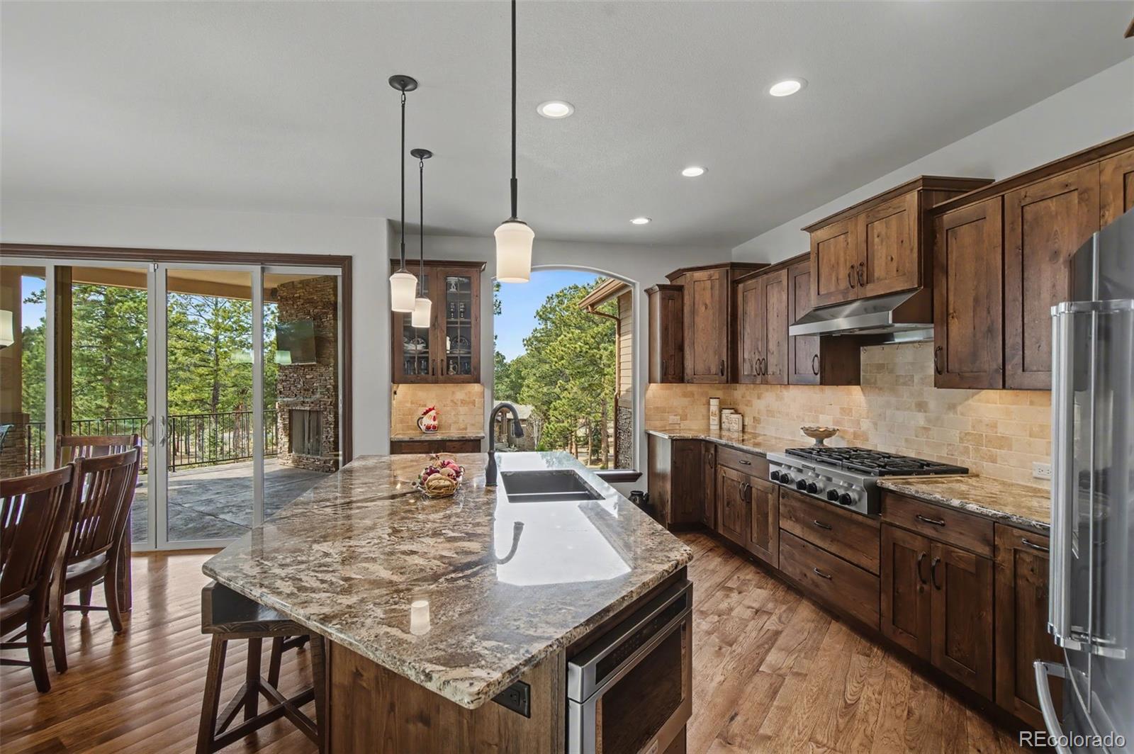 Welcome to this stunning Cathedral Pines home, an exemplary custom residence featuring a 5-car garage that artfully combines luxury, craftsmanship, and a quintessential Colorado flair. As you enter, you are greeted by breathtaking framed views of Pikes Peak, complemented by a vaulted great room that showcases a stacked stone fireplace. The beautiful shiplap detailing and hickory floors establish an atmosphere of refined quality throughout. The gourmet kitchen features a substantial island adorned with a single slab of granite that boasts seamless veining. Equipped with double ovens and a 6-burner gas range, designed for functionality and style. Expansive 8-foot sliding doors illuminate the dining area and lead to an outdoor kitchen on a covered deck, complete with a fireplaceperfect for enjoying dining and observing sunsets around the firepit. On the main level, the primary suite serves as a private retreat, including a fireplace and a spa-style bath with a steam shower, soaking tub, and heated floors, along with a spacious walk-in closet. Additionally, this level includes a dedicated study and a large guest suite offering not only a bedroom, but a living room, wet bar, bathroom with heated floors, and a private deck. The walkout basement is tailored for entertaining, showcasing a family room and rec room that share a dual-sided fireplace. An inviting game area, a generous wet bar complete w/ a full-sized refrigerator and dishwasher, a theater area, and a temp-controlled wine cellar elevates this space. Also includes a bedroom and full bath. Venture upstairs to discover more of the stunning views from the loft and two bedrooms, & full bath. Addl highlights of this home are 3 furnaces, central air, a humidifier, a whole-house water filtration system, built-in speakers, Control 4, and dedicated storage. The neighborhood has a trail system ideal for hiking and biking, adjacent to Black Forest Regional Park. This residence is the very best of Colorado living!