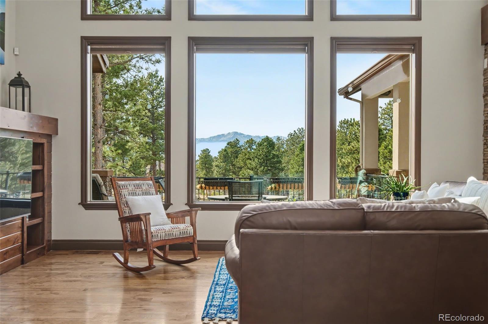 Welcome to this stunning Cathedral Pines home, an exemplary custom residence featuring a 5-car garage that artfully combines luxury, craftsmanship, and a quintessential Colorado flair. As you enter, you are greeted by breathtaking framed views of Pikes Peak, complemented by a vaulted great room that showcases a stacked stone fireplace.