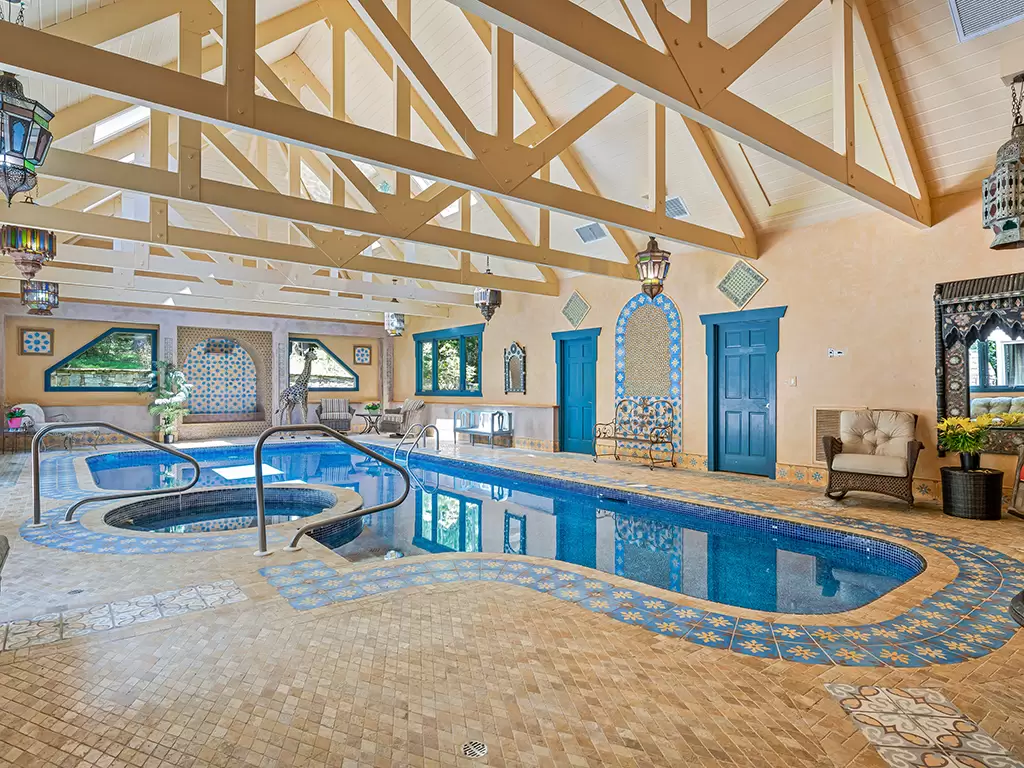 Welcome to the ideal home for entertaining, featuring a sweeping driveway with a circular parking area, two luxurious primary suites, an inviting indoor pool, and an elevator granting access to all levels. This exceptional home has just experienced a significant price reduction, making it an excellent investment for the price per square foot.