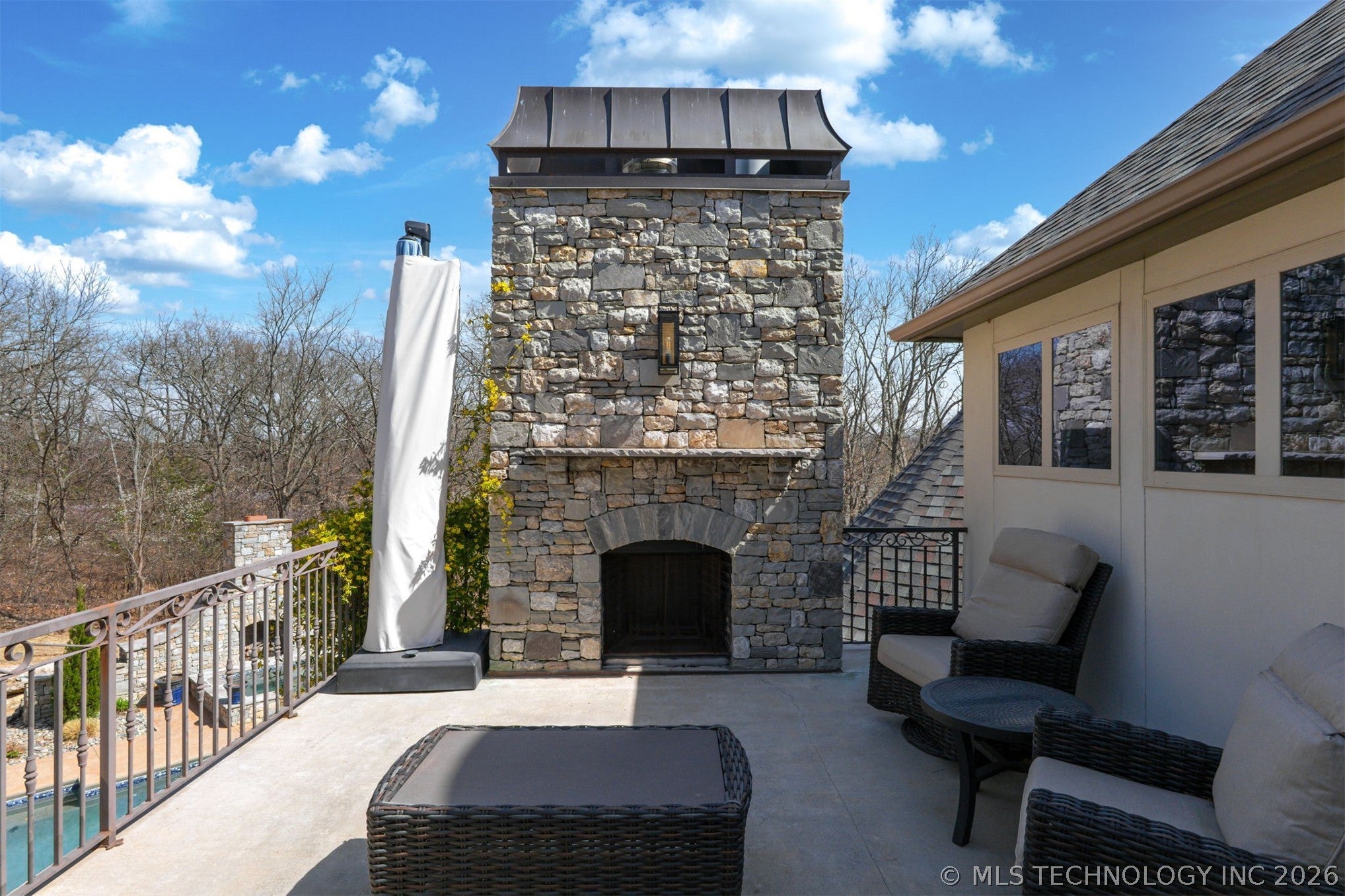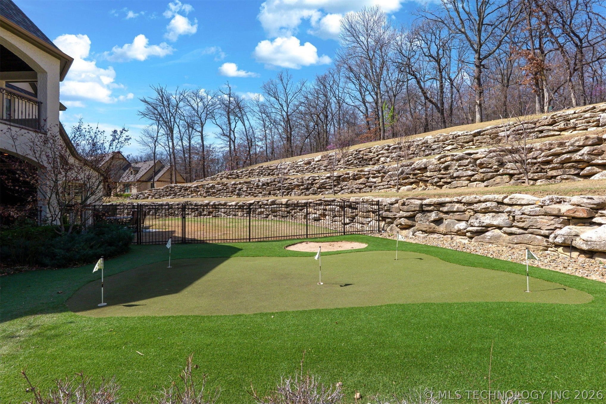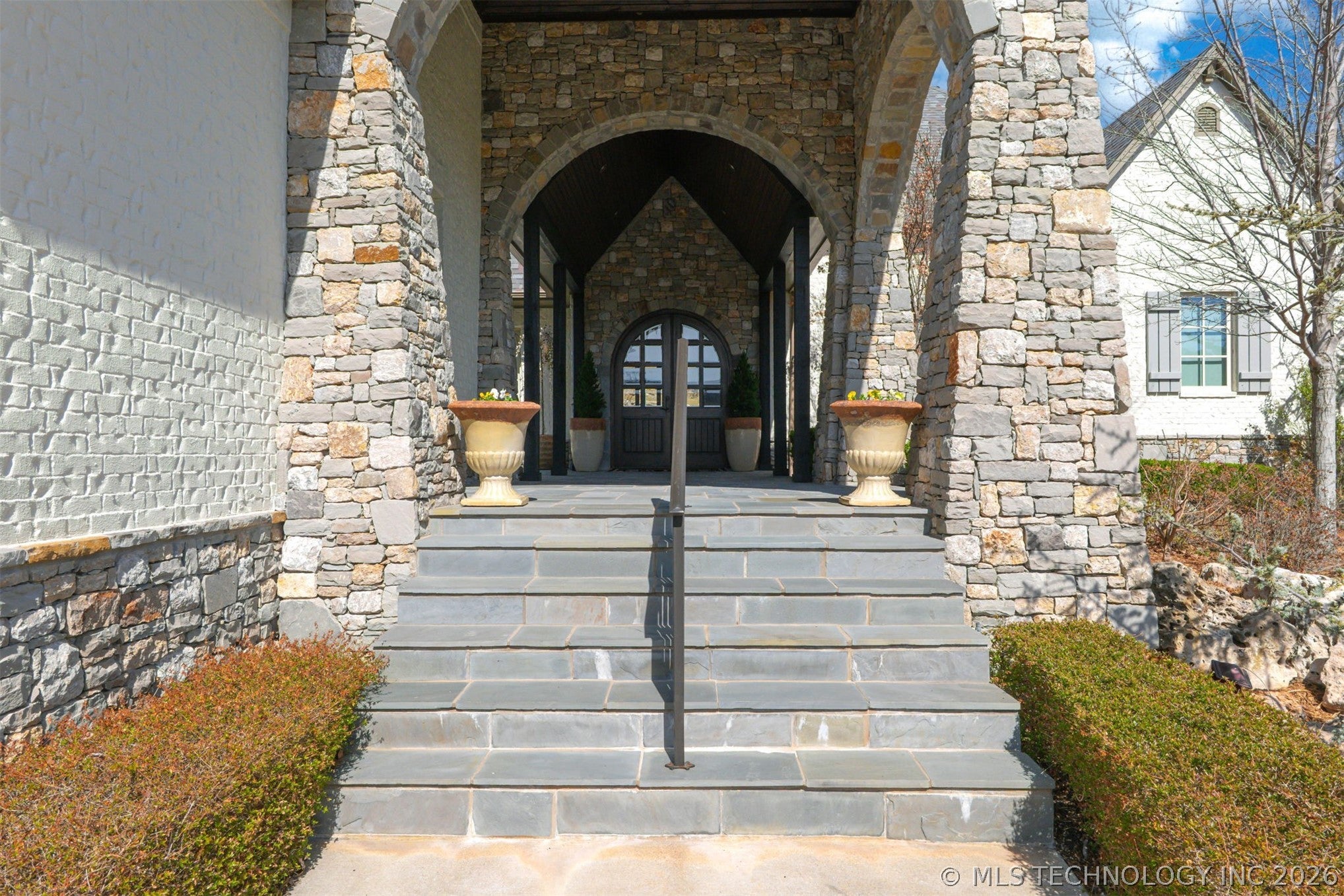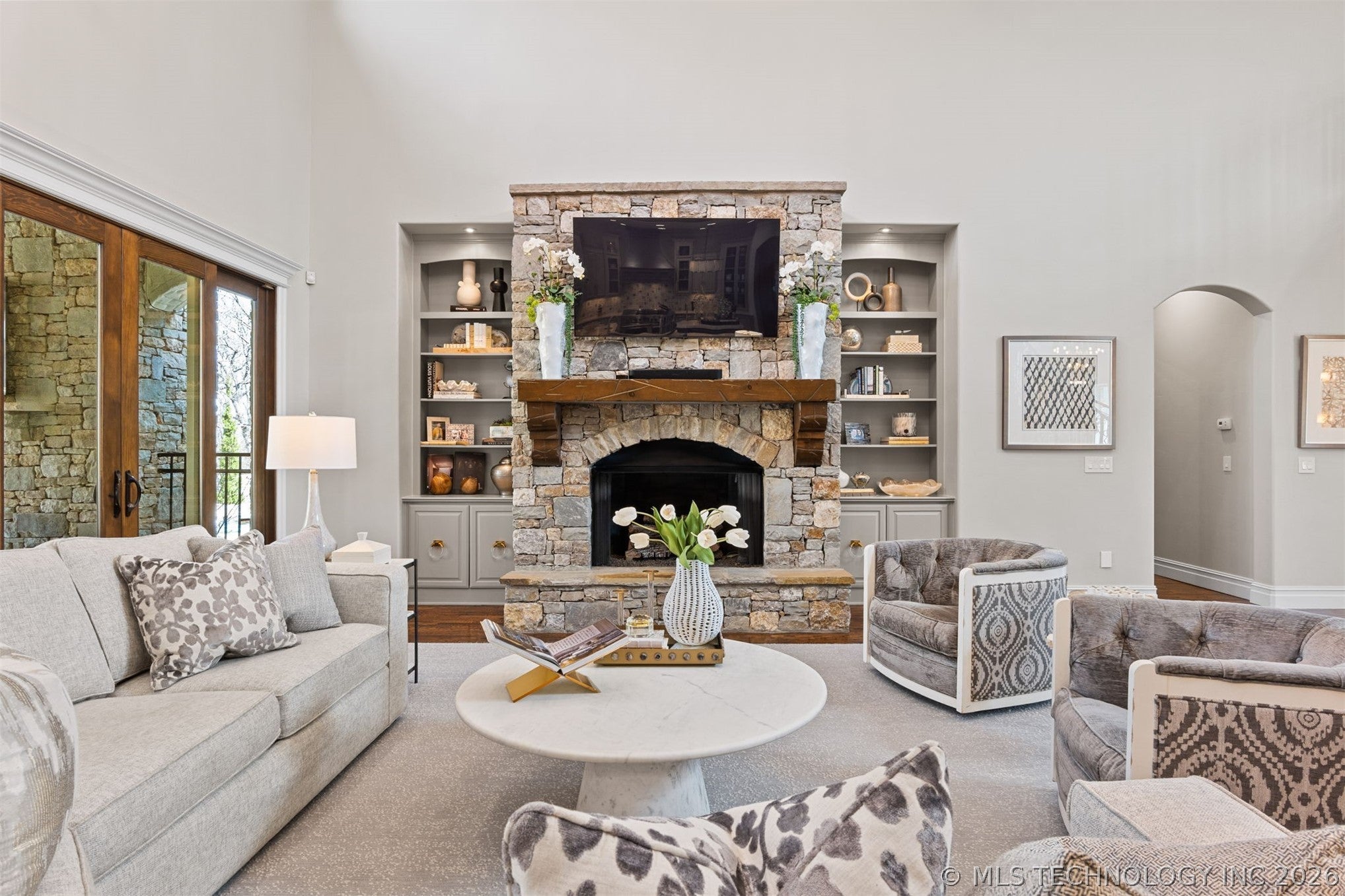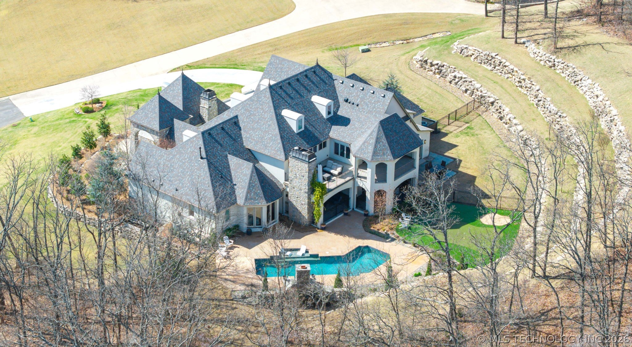 Situated on five elevated and beautifully manicured acres within the exclusive gated Featherstone community in the highly sought-after Jenks School District, this exceptional estate offers a rare blend of luxury, privacy, and resort-style living just minutes from Tulsa. This luxury home features five bedrooms, six full bathrooms, one half bath, and multiple living spaces designed for both everyday comfort and entertaining. The fully remodeled chefs kitchen showcases Taj Mahal quartz countertops, designer backsplash, updated fixtures and hardware, prep sink, dual built-in refrigerators, dual dishwashers, ice machine, wine refrigerator, and an expansive pantry with additional prep space. A striking wine cellar with wrought iron door and stacked stone sits just off the breakfast nook, creating an elegant focal point. The home offers four living areas including the main living room, a dedicated theater room with built-in wet bar, microwave, and refrigerator, a downstairs game room that opens to the outdoor living spaces (could be 6th bedroom) and a third-level exercise or flex space. The luxurious primary suite features a private exterior entrance with pool views, spa-style bath, large bathtub & shower enclosure, double sinks, built-in vanity, and spacious his-and-her closets. Hand scraped hardwood floors run throughout with carpet only in the theater, complemented by updated paint, fixtures, hardware and designer lighting. Outdoor living is unmatched with five separate spaces, four exterior fireplaces, a gunite pool with tanning ledge and bubbler, eight-person spa, pool bath, and a fully equipped outdoor kitchen with two grills, EVO cooktop, burners, sink, and refrigerator. A five-hole putting green with sand trap enhances the entertainment. The four-car garage includes epoxy floors and an in-ground safe room. Tankless hot water and a new roof complete this extraordinary offering.