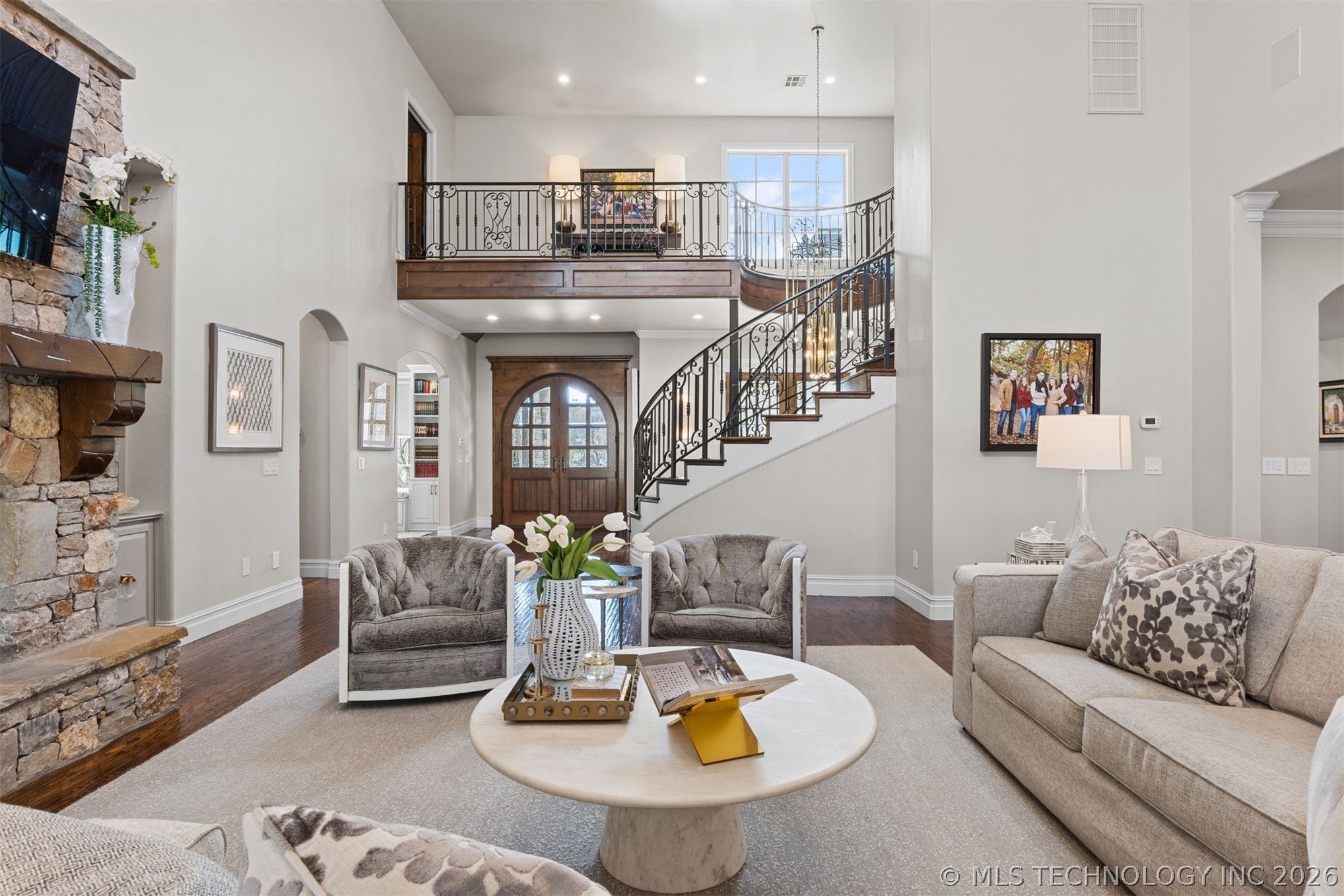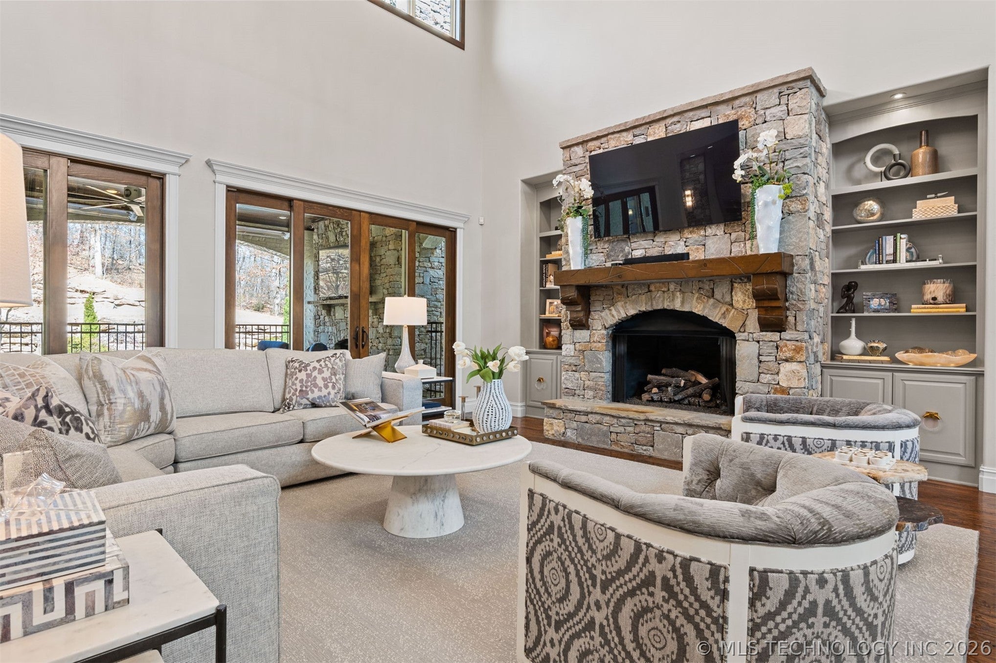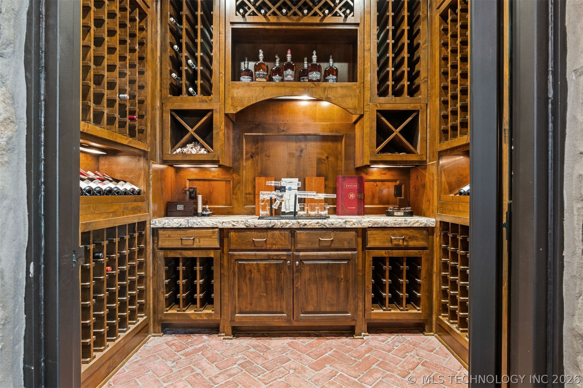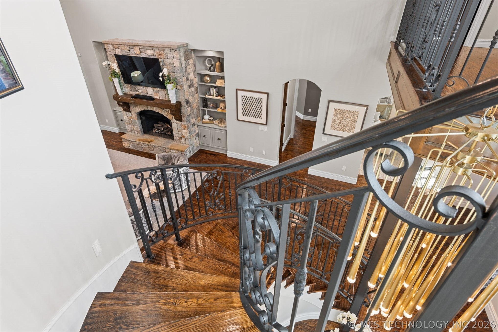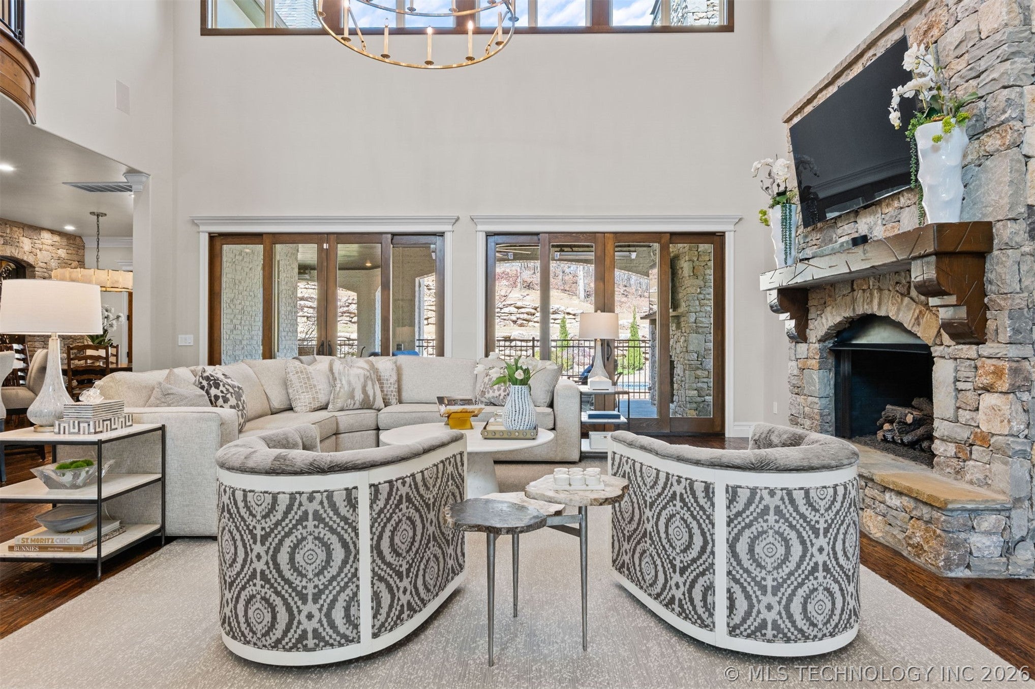 Situated on five elevated and beautifully manicured acres within the exclusive gated Featherstone community in the highly sought-after Jenks School District, this exceptional estate offers a rare blend of luxury, privacy, and resort-style living just minutes from Tulsa. This luxury home features five bedrooms, six full bathrooms, one half bath, and multiple living spaces designed for both everyday comfort and entertaining. The fully remodeled chefs kitchen showcases Taj Mahal quartz countertops, designer backsplash, updated fixtures and hardware, prep sink, dual built-in refrigerators, dual dishwashers, ice machine, wine refrigerator, and an expansive pantry with additional prep space. A striking wine cellar with wrought iron door and stacked stone sits just off the breakfast nook, creating an elegant focal point. The home offers four living areas including the main living room, a dedicated theater room with built-in wet bar, microwave, and refrigerator, a downstairs game room that opens to the outdoor living spaces (could be 6th bedroom) and a third-level exercise or flex space. The luxurious primary suite features a private exterior entrance with pool views, spa-style bath, large bathtub & shower enclosure, double sinks, built-in vanity, and spacious his-and-her closets. Hand scraped hardwood floors run throughout with carpet only in the theater, complemented by updated paint, fixtures, hardware and designer lighting. Outdoor living is unmatched with five separate spaces, four exterior fireplaces, a gunite pool with tanning ledge and bubbler, eight-person spa, pool bath, and a fully equipped outdoor kitchen with two grills, EVO cooktop, burners, sink, and refrigerator. A five-hole putting green with sand trap enhances the entertainment. The four-car garage includes epoxy floors and an in-ground safe room. Tankless hot water and a new roof complete this extraordinary offering.