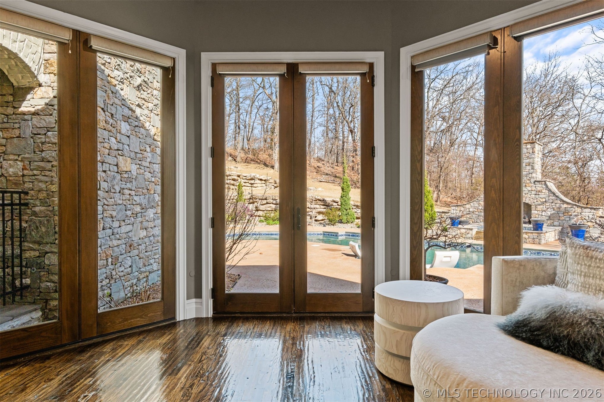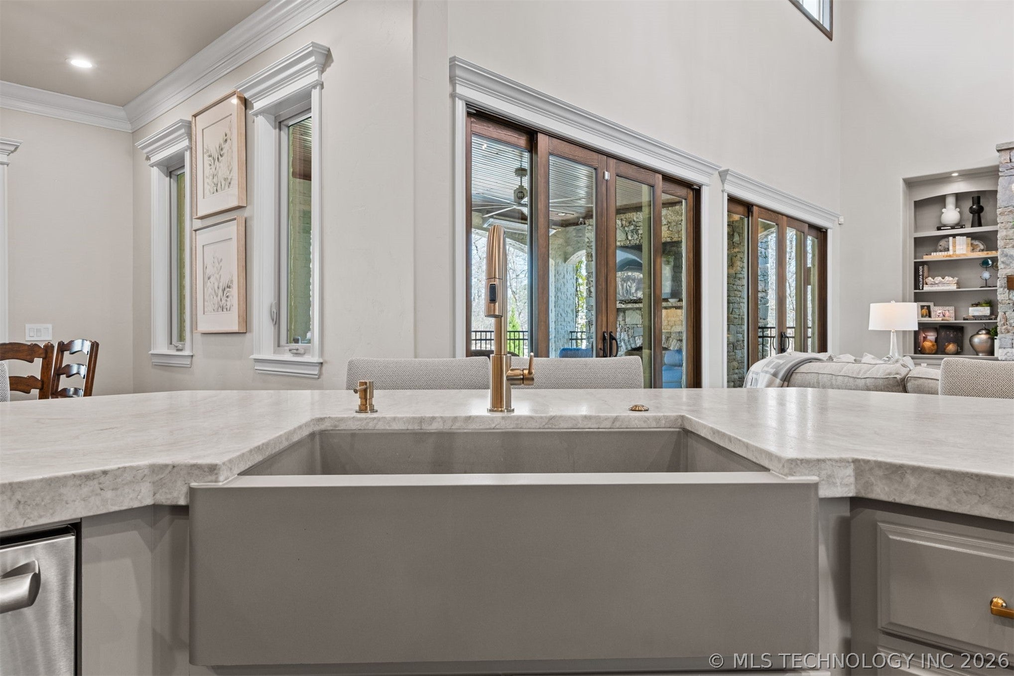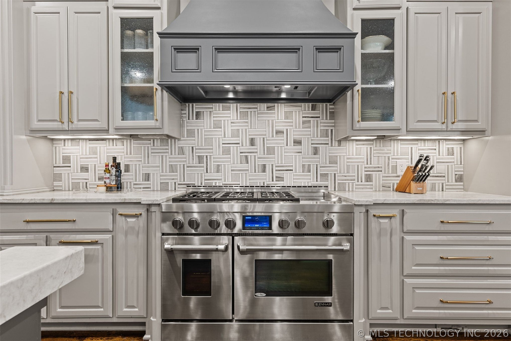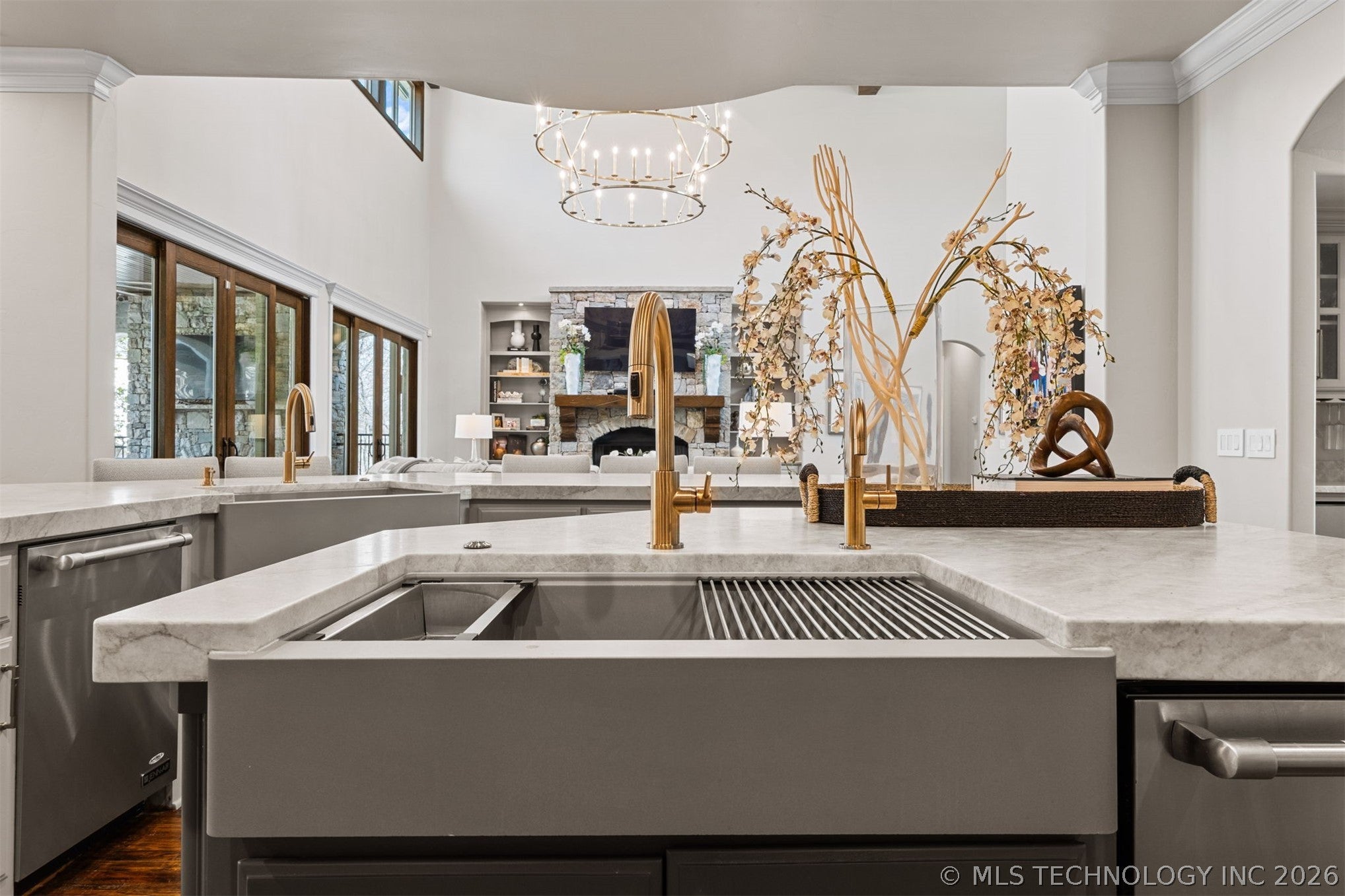 Situated on five elevated and beautifully manicured acres within the exclusive gated Featherstone community in the highly sought-after Jenks School District, this exceptional estate offers a rare blend of luxury, privacy, and resort-style living just minutes from Tulsa. This luxury home features five bedrooms, six full bathrooms, one half bath, and multiple living spaces designed for both everyday comfort and entertaining. The fully remodeled chefs kitchen showcases Taj Mahal quartz countertops, designer backsplash, updated fixtures and hardware, prep sink, dual built-in refrigerators, dual dishwashers, ice machine, wine refrigerator, and an expansive pantry with additional prep space. A striking wine cellar with wrought iron door and stacked stone sits just off the breakfast nook, creating an elegant focal point. The home offers four living areas including the main living room, a dedicated theater room with built-in wet bar, microwave, and refrigerator, a downstairs game room that opens to the outdoor living spaces (could be 6th bedroom) and a third-level exercise or flex space. The luxurious primary suite features a private exterior entrance with pool views, spa-style bath, large bathtub & shower enclosure, double sinks, built-in vanity, and spacious his-and-her closets. Hand scraped hardwood floors run throughout with carpet only in the theater, complemented by updated paint, fixtures, hardware and designer lighting. Outdoor living is unmatched with five separate spaces, four exterior fireplaces, a gunite pool with tanning ledge and bubbler, eight-person spa, pool bath, and a fully equipped outdoor kitchen with two grills, EVO cooktop, burners, sink, and refrigerator. A five-hole putting green with sand trap enhances the entertainment. The four-car garage includes epoxy floors and an in-ground safe room. Tankless hot water and a new roof complete this extraordinary offering.