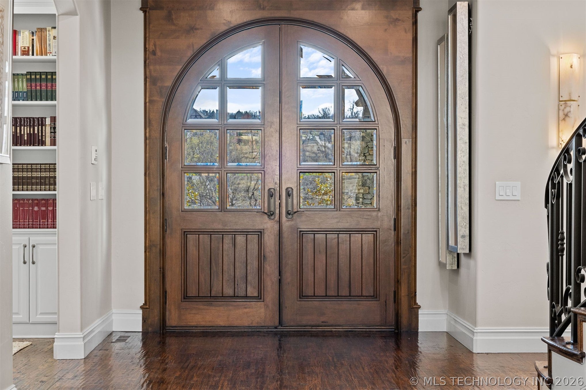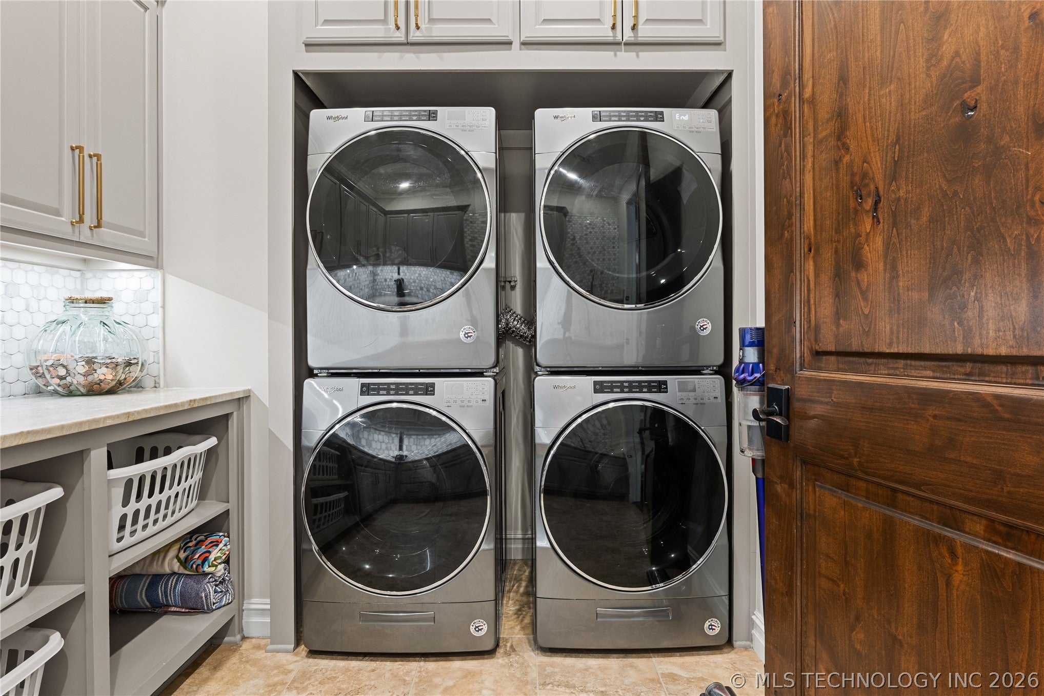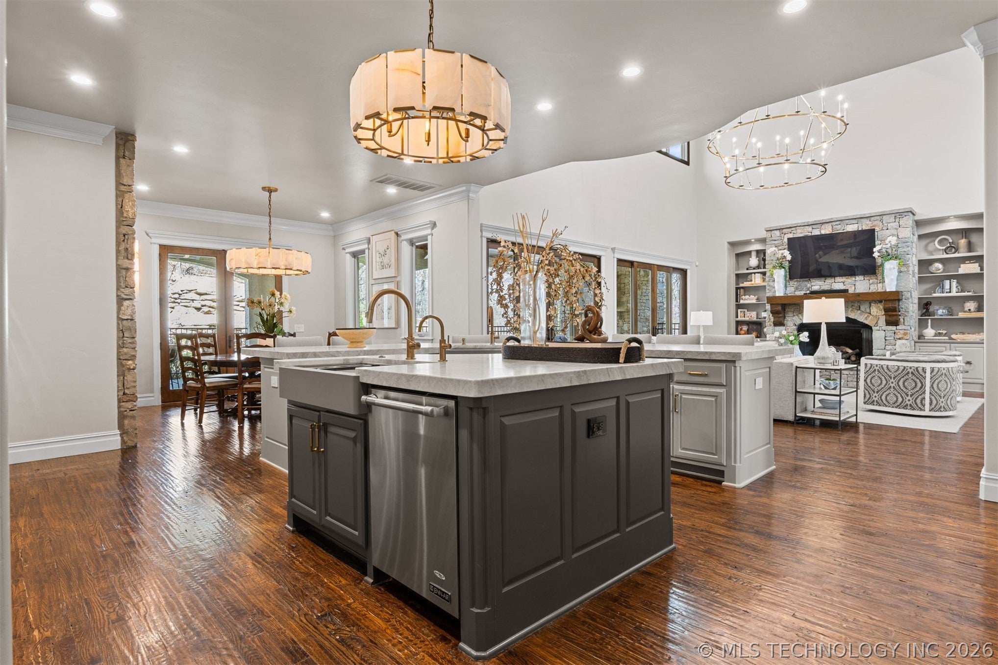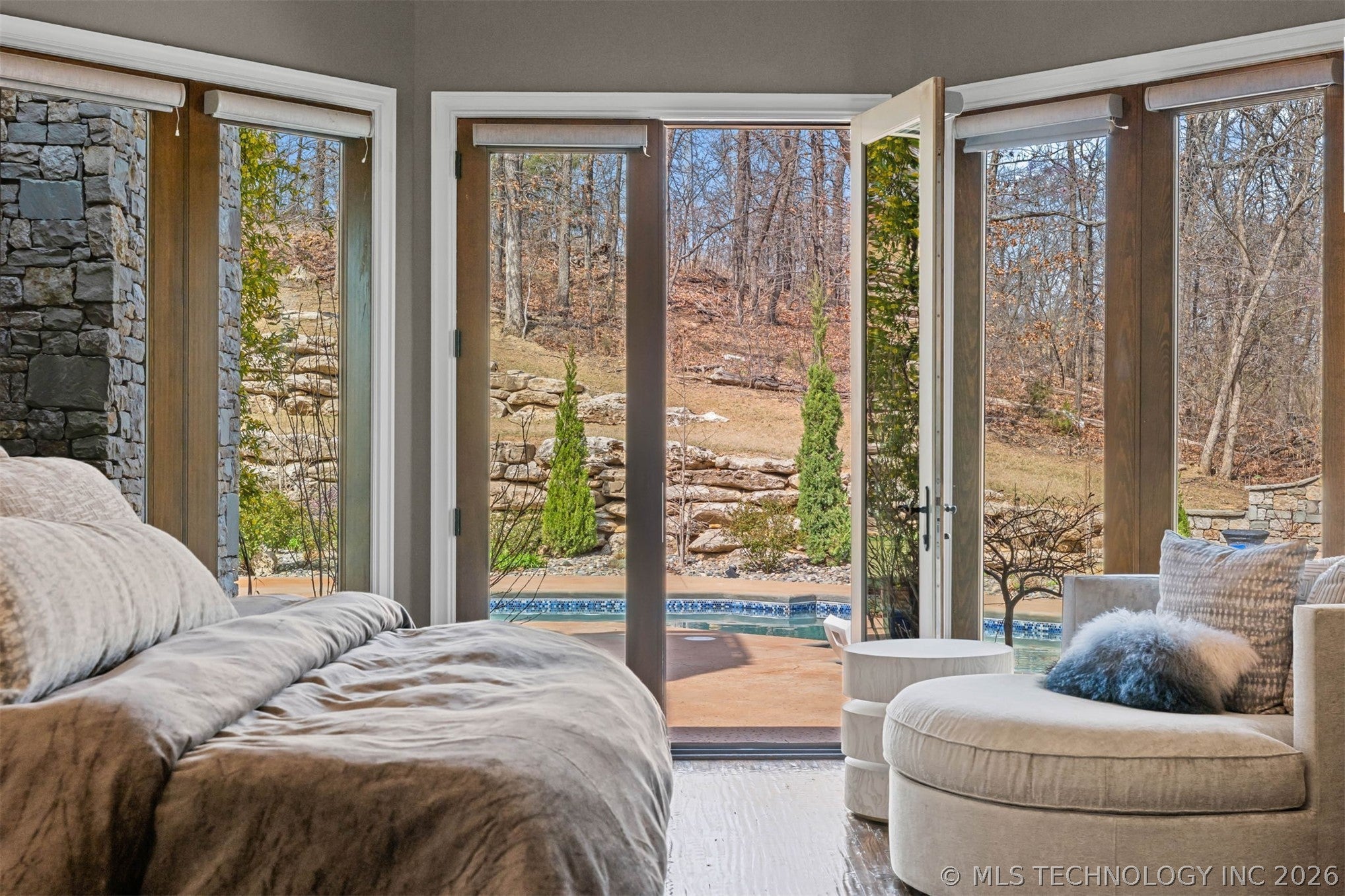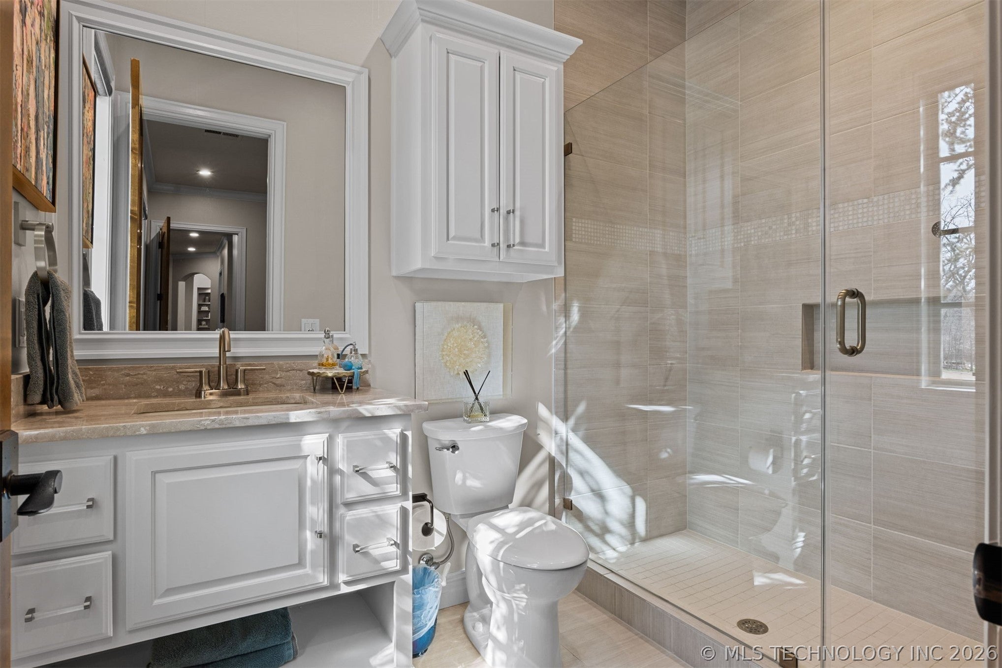 Situated on five elevated and beautifully manicured acres within the exclusive gated Featherstone community in the highly sought-after Jenks School District, this exceptional estate offers a rare blend of luxury, privacy, and resort-style living just minutes from Tulsa. This luxury home features five bedrooms, six full bathrooms, one half bath, and multiple living spaces designed for both everyday comfort and entertaining. The fully remodeled chefs kitchen showcases Taj Mahal quartz countertops, designer backsplash, updated fixtures and hardware, prep sink, dual built-in refrigerators, dual dishwashers, ice machine, wine refrigerator, and an expansive pantry with additional prep space. A striking wine cellar with wrought iron door and stacked stone sits just off the breakfast nook, creating an elegant focal point. The home offers four living areas including the main living room, a dedicated theater room with built-in wet bar, microwave, and refrigerator, a downstairs game room that opens to the outdoor living spaces (could be 6th bedroom) and a third-level exercise or flex space. The luxurious primary suite features a private exterior entrance with pool views, spa-style bath, large bathtub & shower enclosure, double sinks, built-in vanity, and spacious his-and-her closets. Hand scraped hardwood floors run throughout with carpet only in the theater, complemented by updated paint, fixtures, hardware and designer lighting. Outdoor living is unmatched with five separate spaces, four exterior fireplaces, a gunite pool with tanning ledge and bubbler, eight-person spa, pool bath, and a fully equipped outdoor kitchen with two grills, EVO cooktop, burners, sink, and refrigerator. A five-hole putting green with sand trap enhances the entertainment. The four-car garage includes epoxy floors and an in-ground safe room. Tankless hot water and a new roof complete this extraordinary offering.