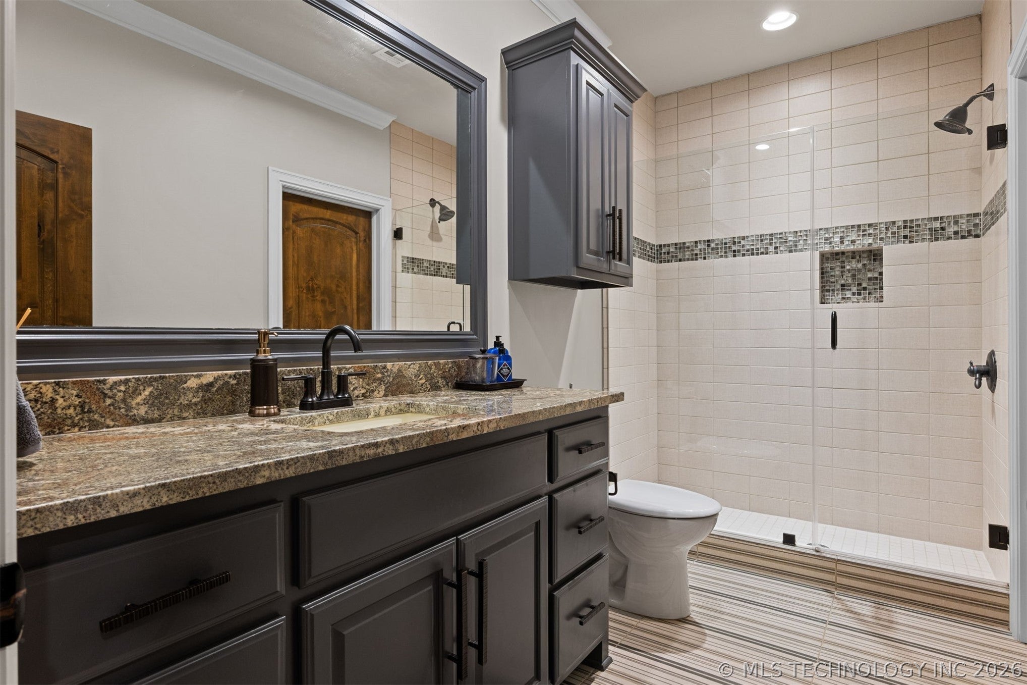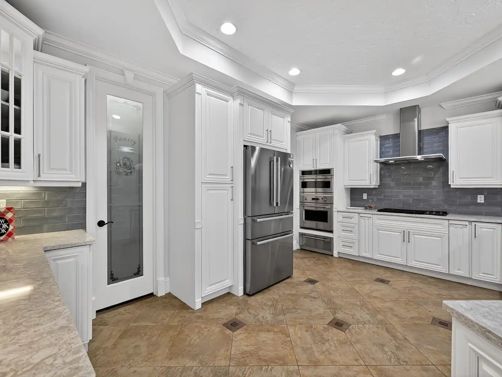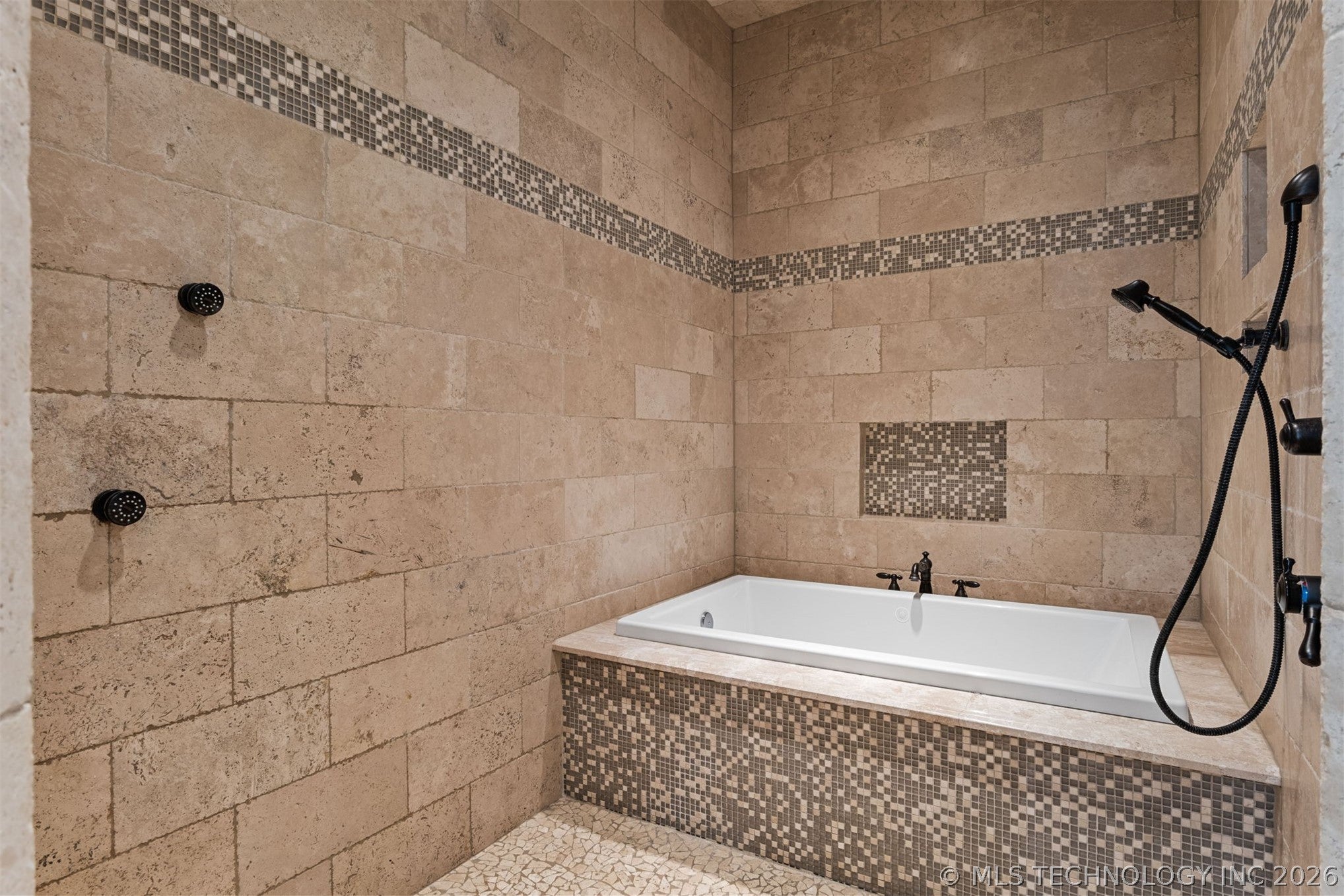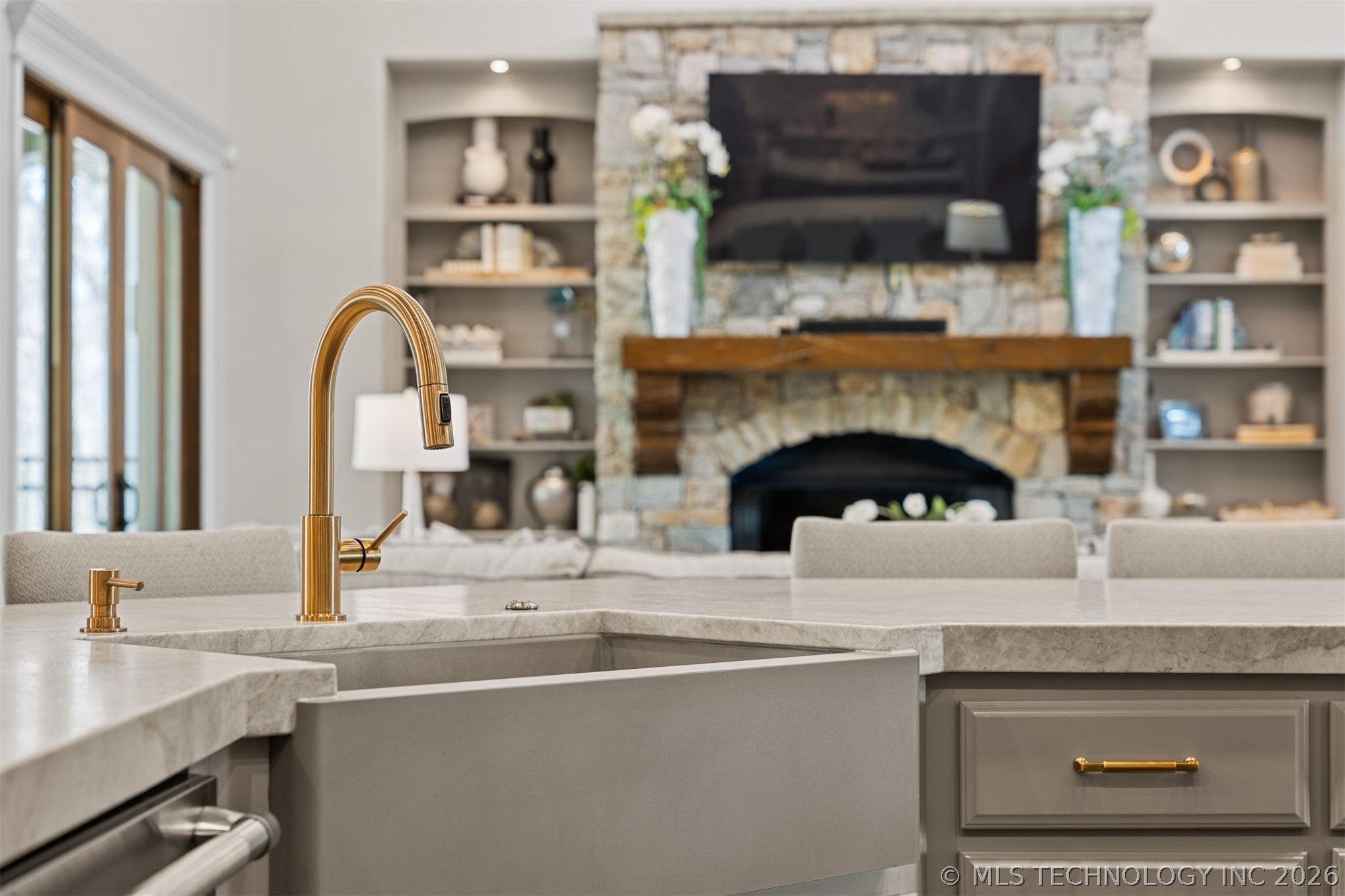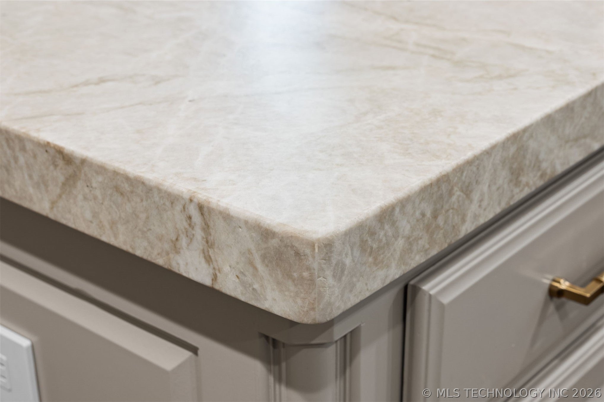 Situated on five elevated and beautifully manicured acres within the exclusive gated Featherstone community in the highly sought-after Jenks School District, this exceptional estate offers a rare blend of luxury, privacy, and resort-style living just minutes from Tulsa. This luxury home features five bedrooms, six full bathrooms, one half bath, and multiple living spaces designed for both everyday comfort and entertaining. The fully remodeled chefs kitchen showcases Taj Mahal quartz countertops, designer backsplash, updated fixtures and hardware, prep sink, dual built-in refrigerators, dual dishwashers, ice machine, wine refrigerator, and an expansive pantry with additional prep space. A striking wine cellar with wrought iron door and stacked stone sits just off the breakfast nook, creating an elegant focal point. The home offers four living areas including the main living room, a dedicated theater room with built-in wet bar, microwave, and refrigerator, a downstairs game room that opens to the outdoor living spaces (could be 6th bedroom) and a third-level exercise or flex space. The luxurious primary suite features a private exterior entrance with pool views, spa-style bath, large bathtub & shower enclosure, double sinks, built-in vanity, and spacious his-and-her closets. Hand scraped hardwood floors run throughout with carpet only in the theater, complemented by updated paint, fixtures, hardware and designer lighting. Outdoor living is unmatched with five separate spaces, four exterior fireplaces, a gunite pool with tanning ledge and bubbler, eight-person spa, pool bath, and a fully equipped outdoor kitchen with two grills, EVO cooktop, burners, sink, and refrigerator. A five-hole putting green with sand trap enhances the entertainment. The four-car garage includes epoxy floors and an in-ground safe room. Tankless hot water and a new roof complete this extraordinary offering.