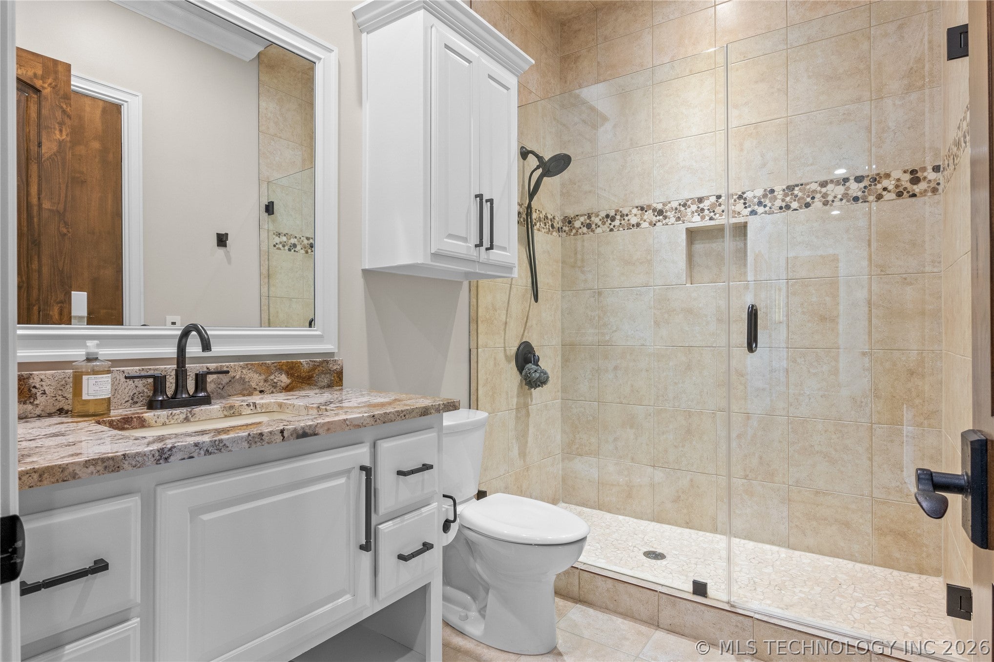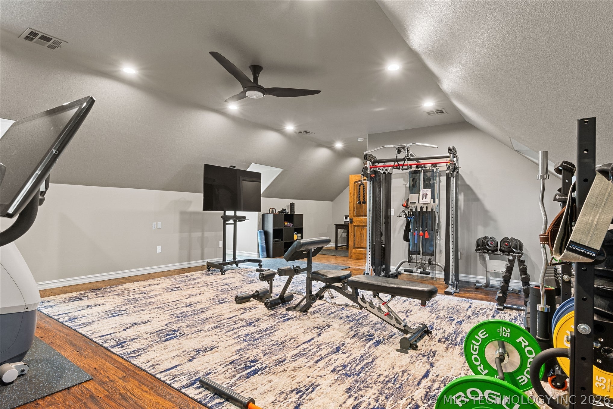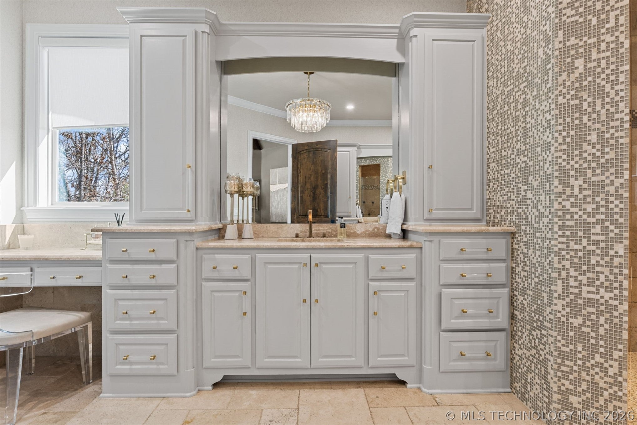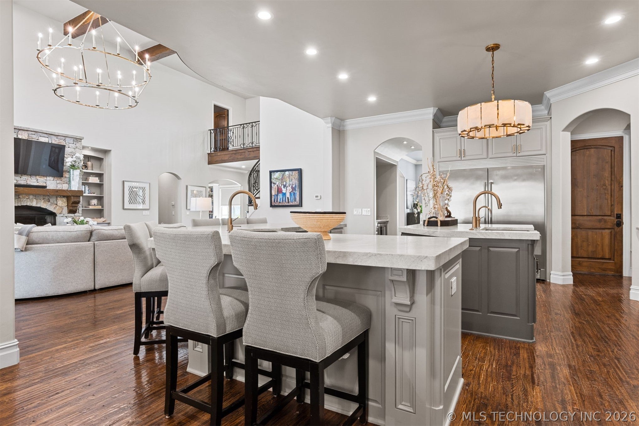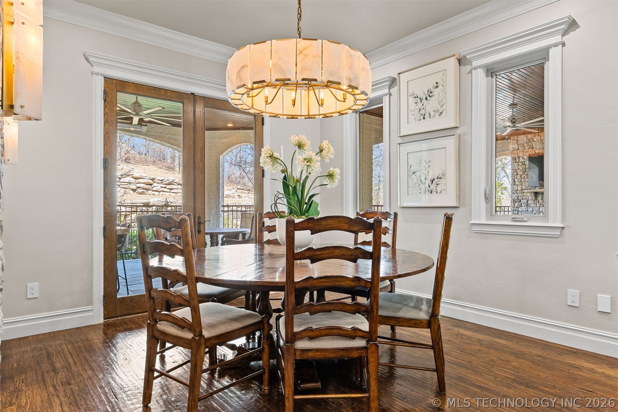Situated on five elevated and beautifully manicured acres within the exclusive gated Featherstone community in the highly sought-after Jenks School District, this exceptional estate offers a rare blend of luxury, privacy, and resort-style living just minutes from Tulsa. This luxury home features five bedrooms, six full bathrooms, one half bath, and multiple living spaces designed for both everyday comfort and entertaining. The fully remodeled chefs kitchen showcases Taj Mahal quartz countertops, designer backsplash, updated fixtures and hardware, prep sink, dual built-in refrigerators, dual dishwashers, ice machine, wine refrigerator, and an expansive pantry with additional prep space. A striking wine cellar with wrought iron door and stacked stone sits just off the breakfast nook, creating an elegant focal point. The home offers four living areas including the main living room, a dedicated theater room with built-in wet bar, microwave, and refrigerator, a downstairs game room that opens to the outdoor living spaces (could be 6th bedroom) and a third-level exercise or flex space. The luxurious primary suite features a private exterior entrance with pool views, spa-style bath, large bathtub & shower enclosure, double sinks, built-in vanity, and spacious his-and-her closets. Hand scraped hardwood floors run throughout with carpet only in the theater, complemented by updated paint, fixtures, hardware and designer lighting. Outdoor living is unmatched with five separate spaces, four exterior fireplaces, a gunite pool with tanning ledge and bubbler, eight-person spa, pool bath, and a fully equipped outdoor kitchen with two grills, EVO cooktop, burners, sink, and refrigerator. A five-hole putting green with sand trap enhances the entertainment. The four-car garage includes epoxy floors and an in-ground safe room. Tankless hot water and a new roof complete this extraordinary offering.