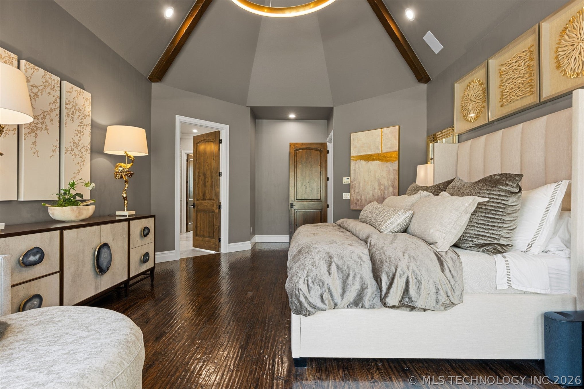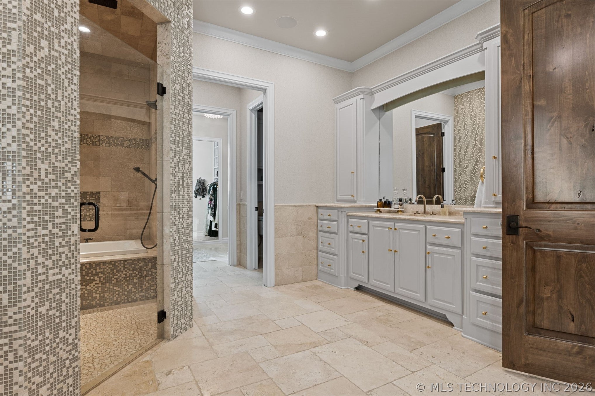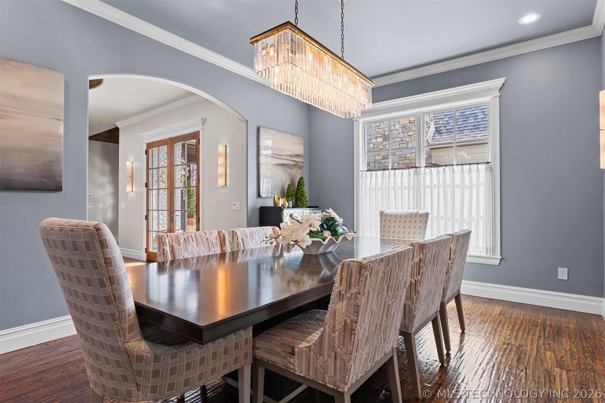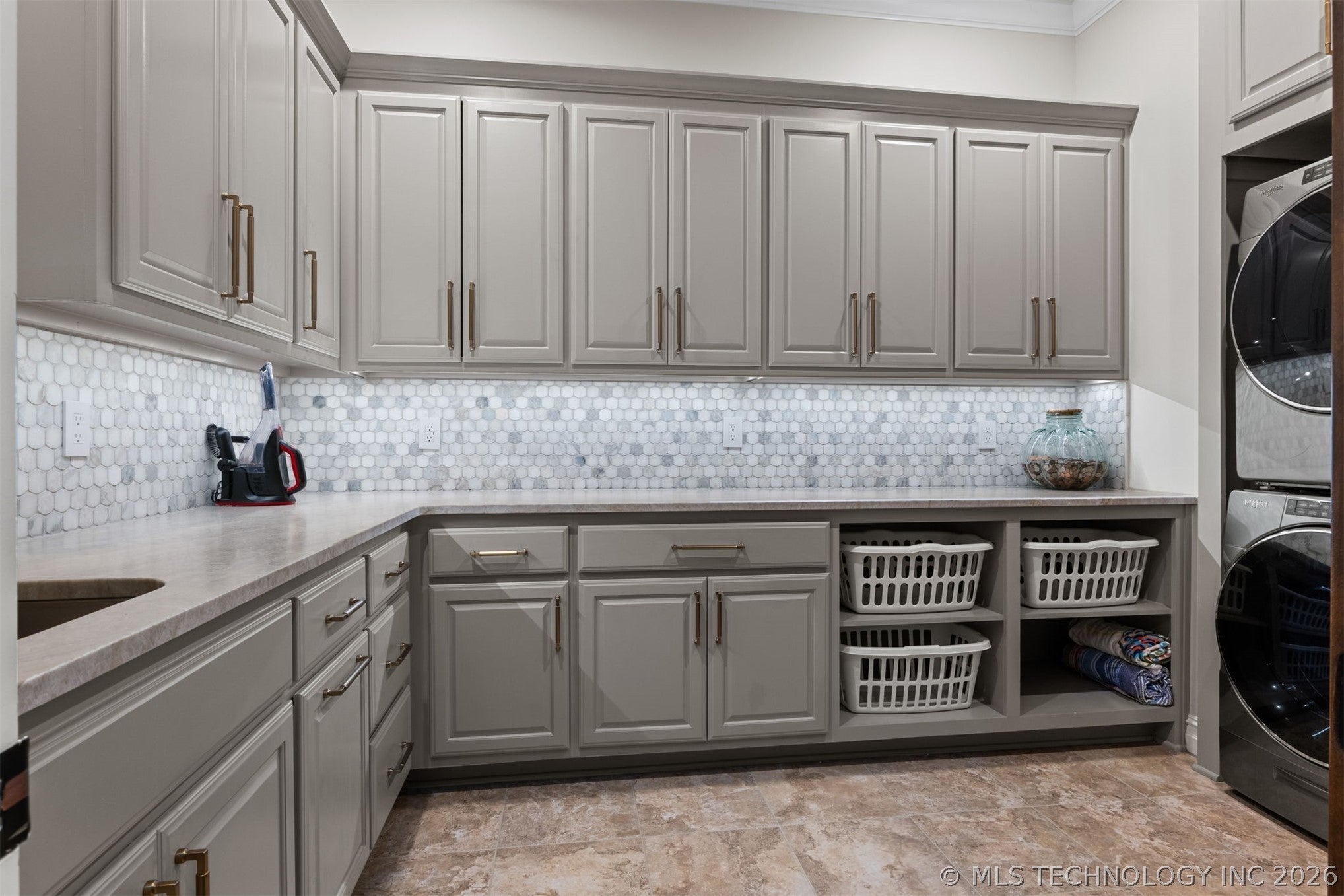 Situated on five elevated and beautifully manicured acres within the exclusive gated Featherstone community in the highly sought-after Jenks School District, this exceptional estate offers a rare blend of luxury, privacy, and resort-style living just minutes from Tulsa. This luxury home features five bedrooms, six full bathrooms, one half bath, and multiple living spaces designed for both everyday comfort and entertaining. The fully remodeled chefs kitchen showcases Taj Mahal quartz countertops, designer backsplash, updated fixtures and hardware, prep sink, dual built-in refrigerators, dual dishwashers, ice machine, wine refrigerator, and an expansive pantry with additional prep space. A striking wine cellar with wrought iron door and stacked stone sits just off the breakfast nook, creating an elegant focal point. The home offers four living areas including the main living room, a dedicated theater room with built-in wet bar, microwave, and refrigerator, a downstairs game room that opens to the outdoor living spaces (could be 6th bedroom) and a third-level exercise or flex space. The luxurious primary suite features a private exterior entrance with pool views, spa-style bath, large bathtub & shower enclosure, double sinks, built-in vanity, and spacious his-and-her closets. Hand scraped hardwood floors run throughout with carpet only in the theater, complemented by updated paint, fixtures, hardware and designer lighting. Outdoor living is unmatched with five separate spaces, four exterior fireplaces, a gunite pool with tanning ledge and bubbler, eight-person spa, pool bath, and a fully equipped outdoor kitchen with two grills, EVO cooktop, burners, sink, and refrigerator. A five-hole putting green with sand trap enhances the entertainment. The four-car garage includes epoxy floors and an in-ground safe room. Tankless hot water and a new roof complete this extraordinary offering.
