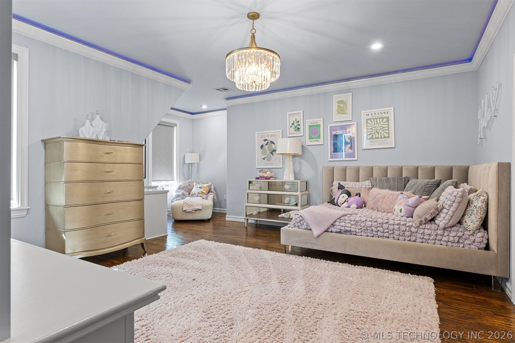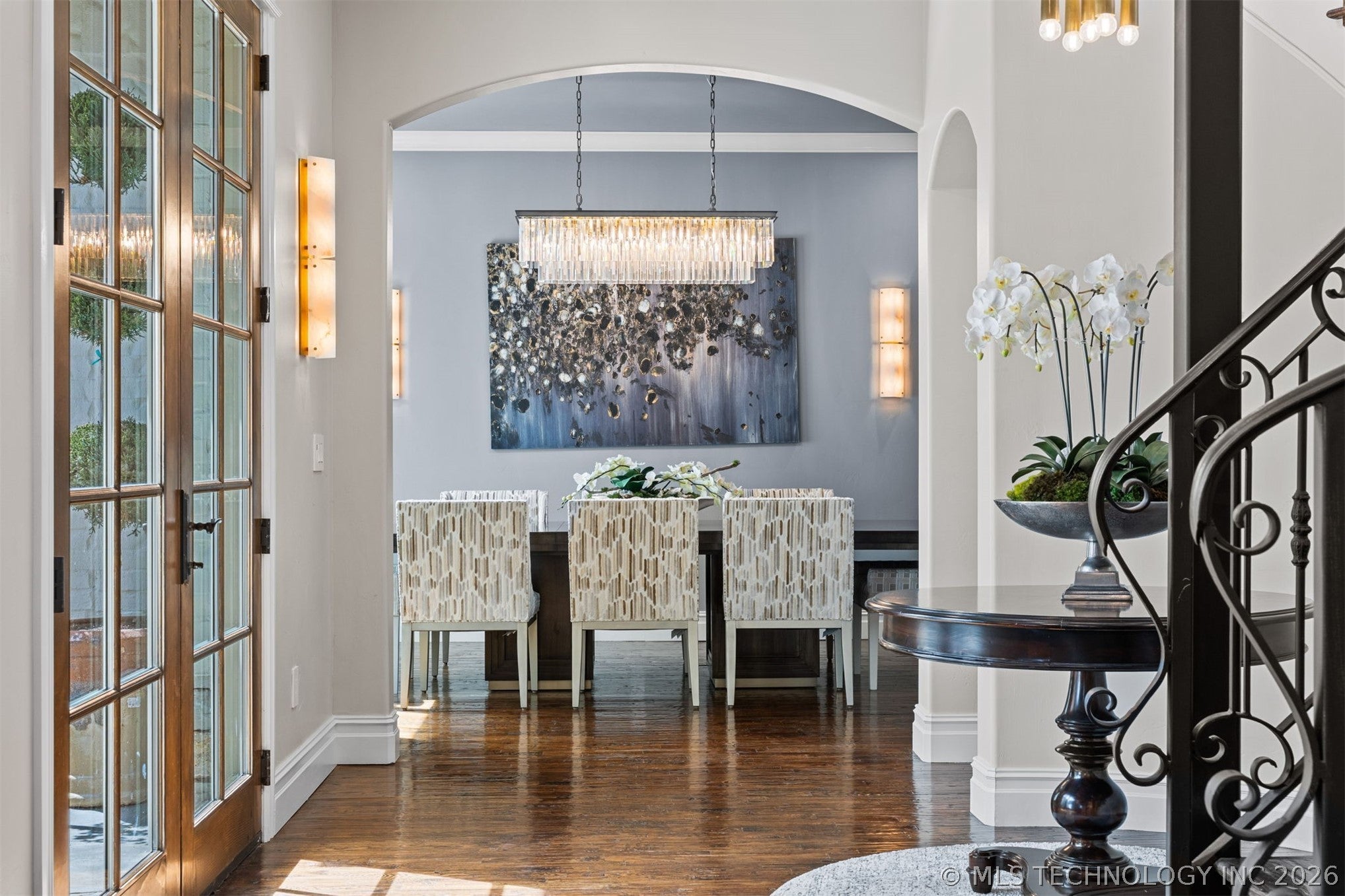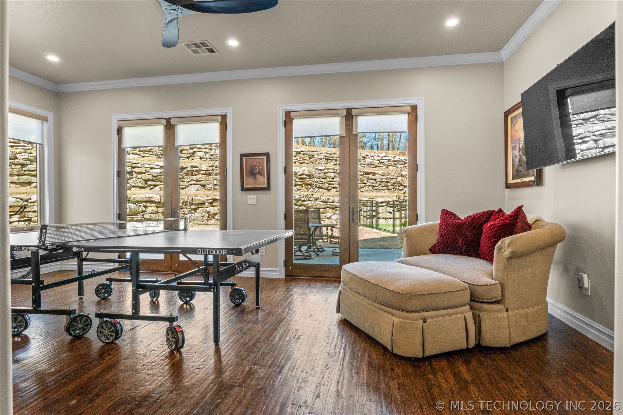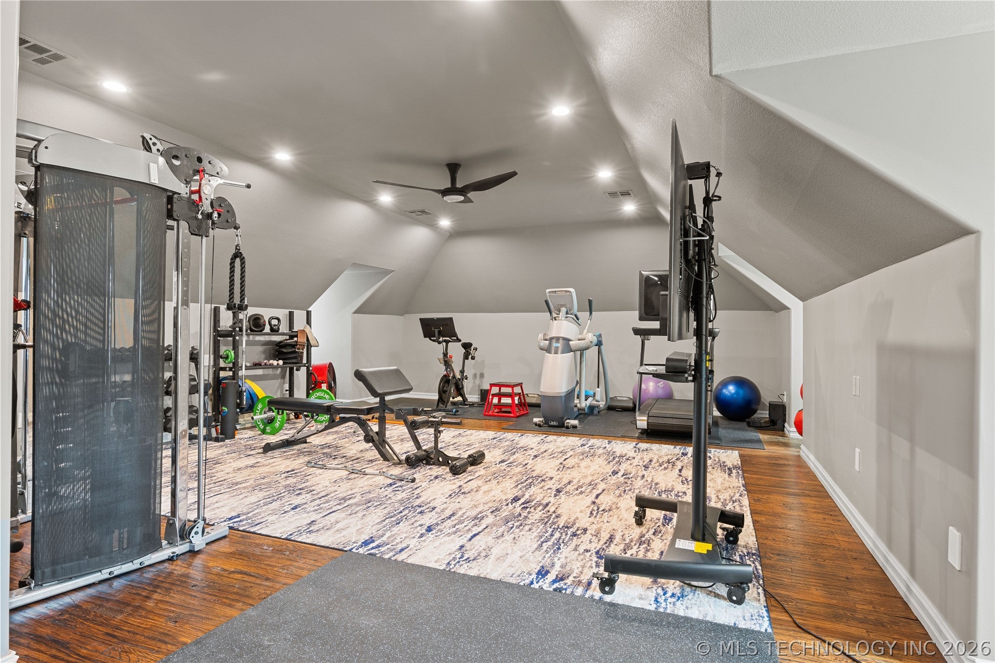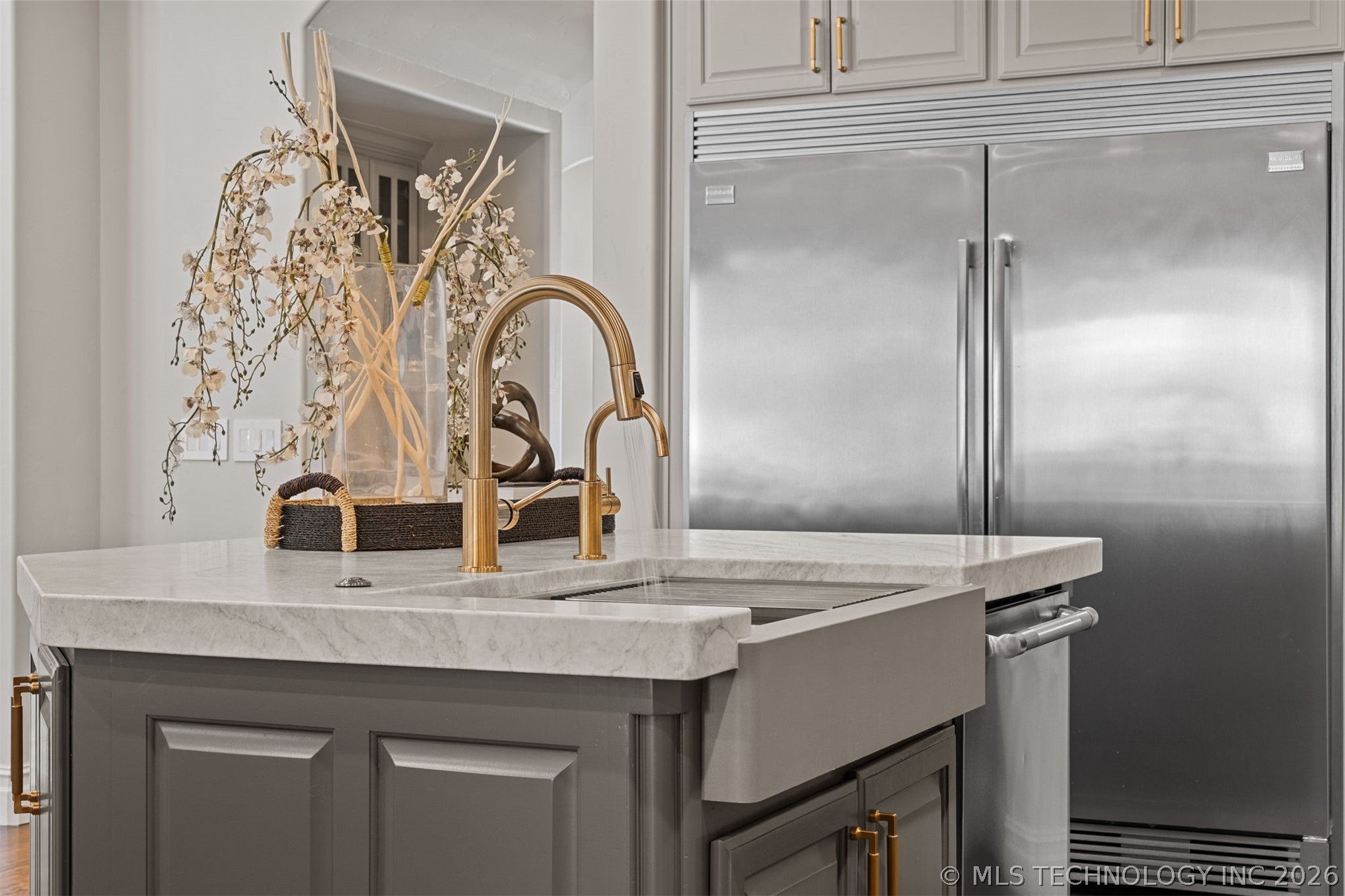 Situated on five elevated and beautifully manicured acres within the exclusive gated Featherstone community in the highly sought-after Jenks School District, this exceptional estate offers a rare blend of luxury, privacy, and resort-style living just minutes from Tulsa. This luxury home features five bedrooms, six full bathrooms, one half bath, and multiple living spaces designed for both everyday comfort and entertaining. The fully remodeled chefs kitchen showcases Taj Mahal quartz countertops, designer backsplash, updated fixtures and hardware, prep sink, dual built-in refrigerators, dual dishwashers, ice machine, wine refrigerator, and an expansive pantry with additional prep space. A striking wine cellar with wrought iron door and stacked stone sits just off the breakfast nook, creating an elegant focal point. The home offers four living areas including the main living room, a dedicated theater room with built-in wet bar, microwave, and refrigerator, a downstairs game room that opens to the outdoor living spaces (could be 6th bedroom) and a third-level exercise or flex space. The luxurious primary suite features a private exterior entrance with pool views, spa-style bath, large bathtub & shower enclosure, double sinks, built-in vanity, and spacious his-and-her closets. Hand scraped hardwood floors run throughout with carpet only in the theater, complemented by updated paint, fixtures, hardware and designer lighting. Outdoor living is unmatched with five separate spaces, four exterior fireplaces, a gunite pool with tanning ledge and bubbler, eight-person spa, pool bath, and a fully equipped outdoor kitchen with two grills, EVO cooktop, burners, sink, and refrigerator. A five-hole putting green with sand trap enhances the entertainment. The four-car garage includes epoxy floors and an in-ground safe room. Tankless hot water and a new roof complete this extraordinary offering.