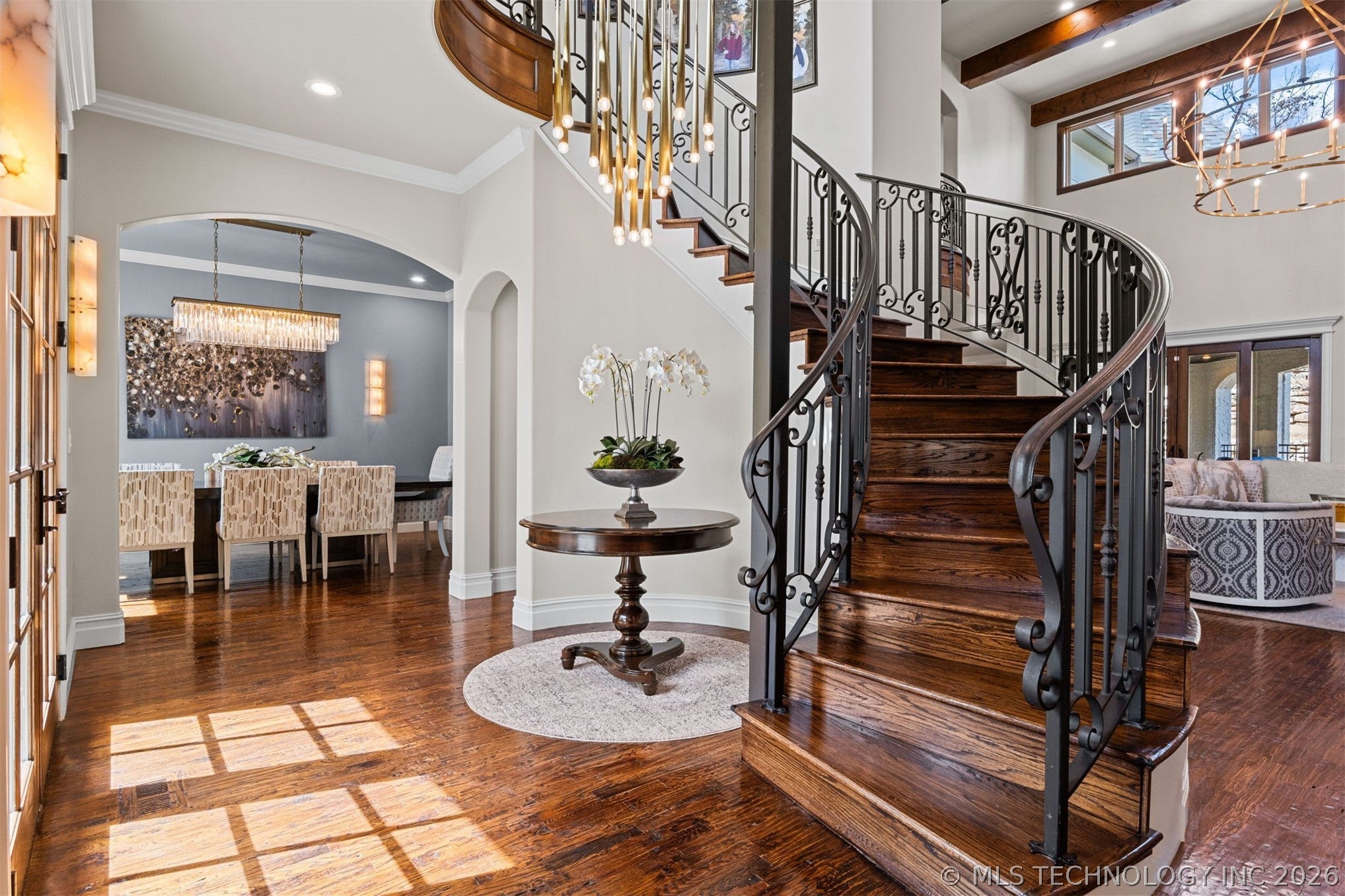 Situated on five elevated and beautifully manicured acres within the exclusive gated Featherstone community in the highly sought-after Jenks School District, this exceptional estate offers a rare blend of luxury, privacy, and resort-style living just minutes from Tulsa.