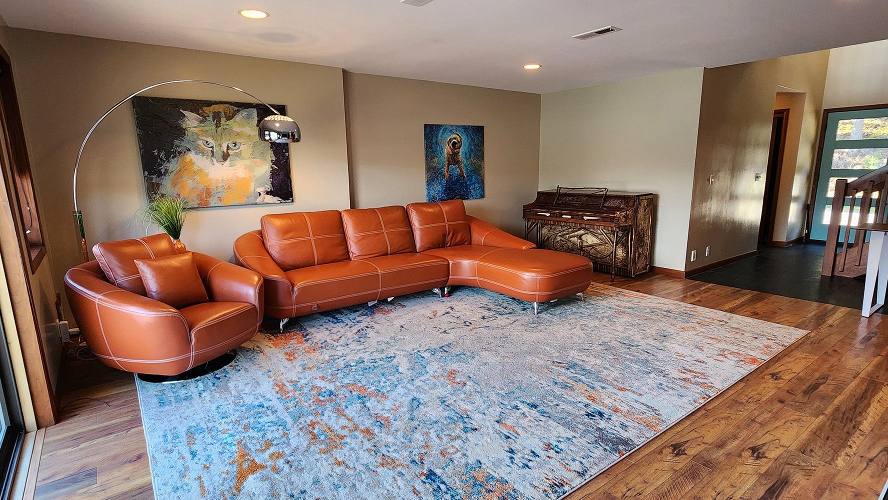 Exceptional custom-built home on 3.47 acres in Lakeville, offering luxurious design and everyday comfort in a serene acreage neighborhood. The main level features a dramatic great room with 18-ft vaulted ceilings, wood beams, white oak hardwood floors, and a floor-to-ceiling tiled fireplace.
