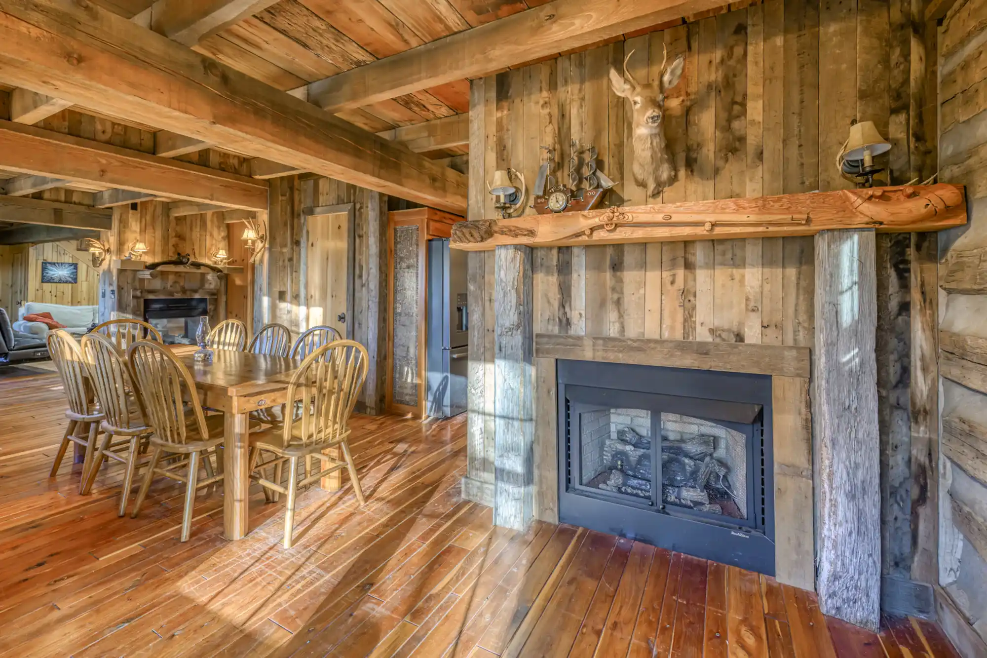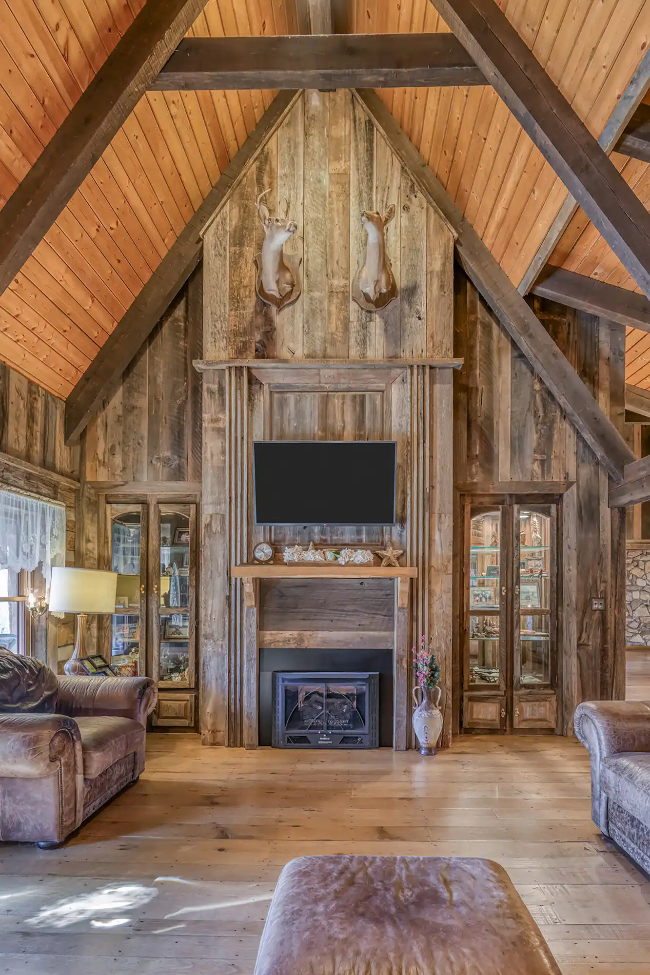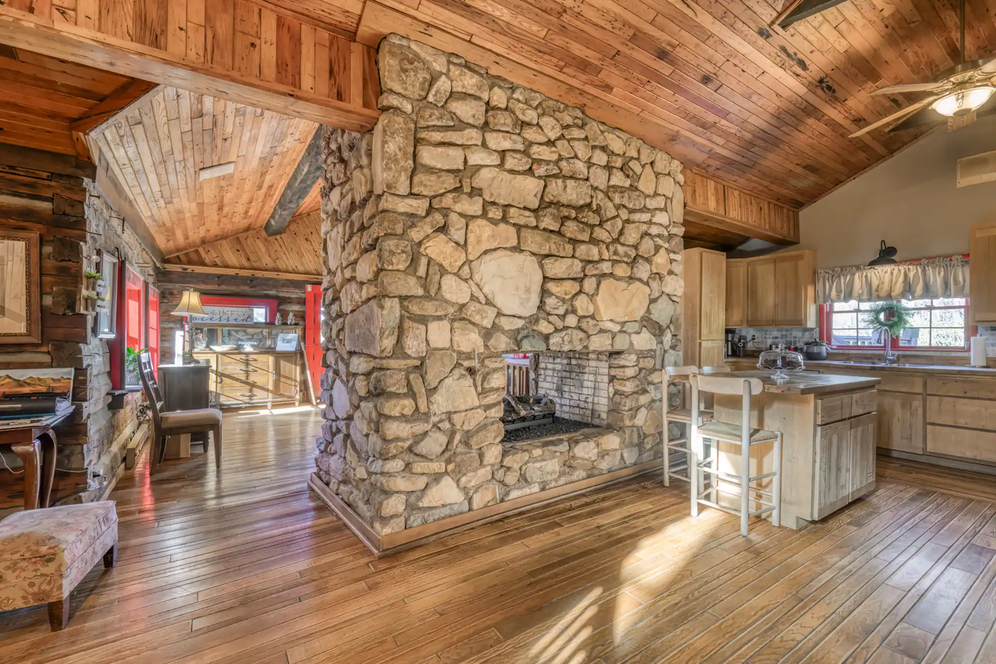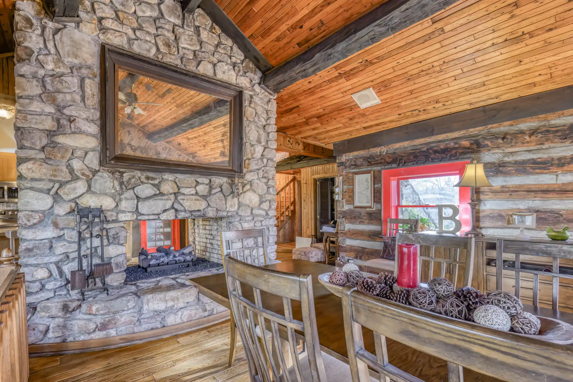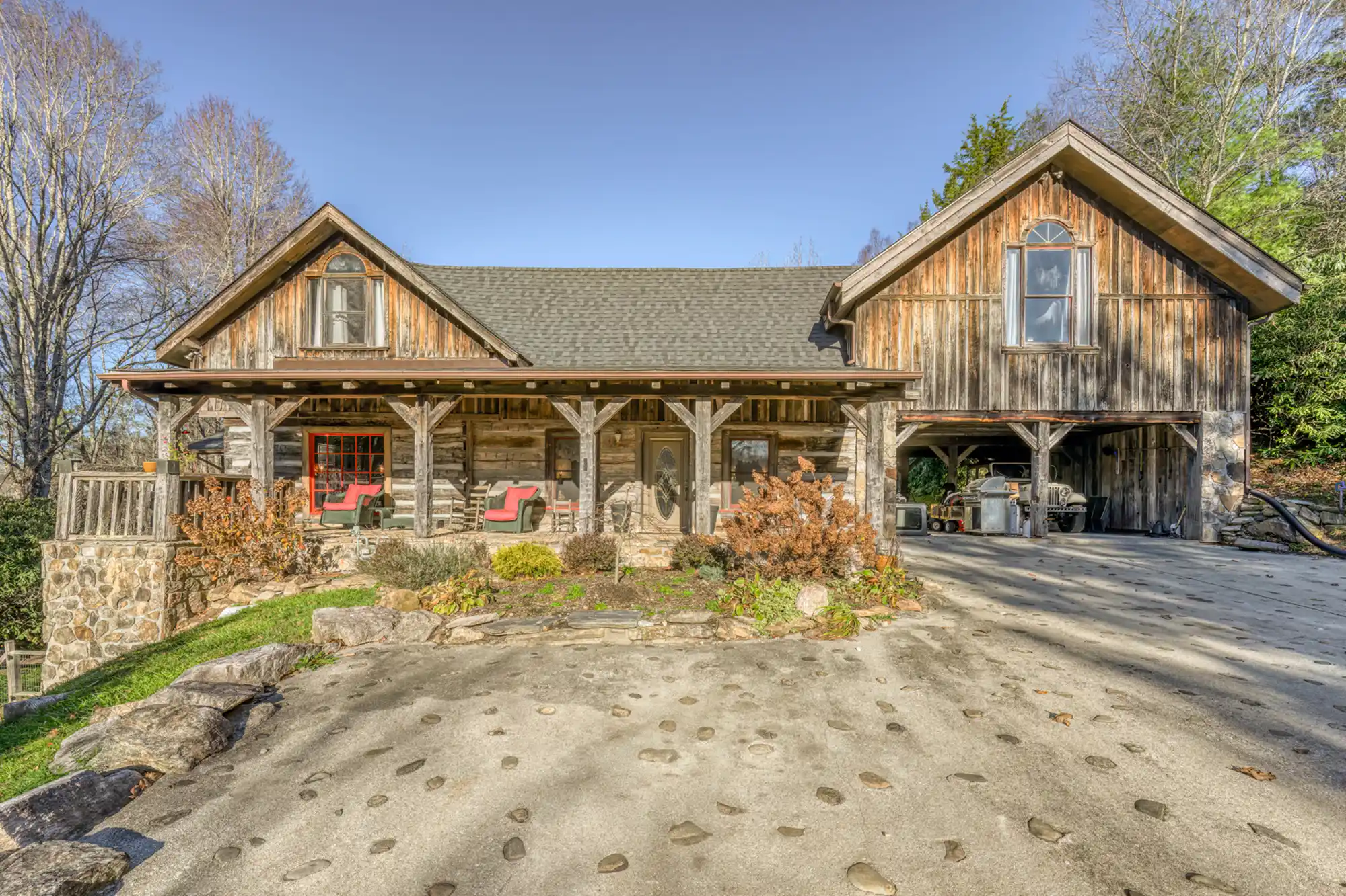 Discover a rare gem in the heart of the North Carolina mountains! This stunning estate features two handcrafted log homes on 1.98 park-like acres, complete with a tranquil pond. The 4,281 sq. ft. main house boasts 4 bedrooms, 4 bathrooms, custom woodwork, and hidden passageways leading to a private bunker. The 3,500 sq. ft. guest home offers 3 en-suite bedrooms and breathtaking carved fireplace mantels. Entertain in the 853 sq. ft. music pavilion with a full stage and bar. Just 10 minutes from the Blue Ridge Parkway and skiing, this unique property is an entertainer’s dream and a nature lover’s paradise!