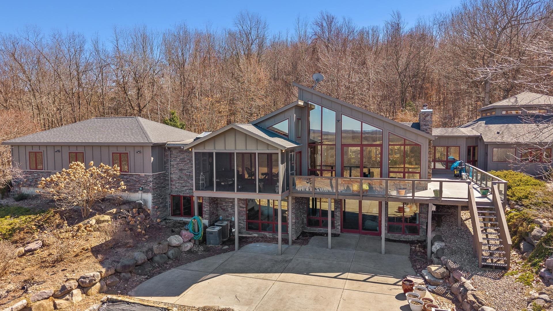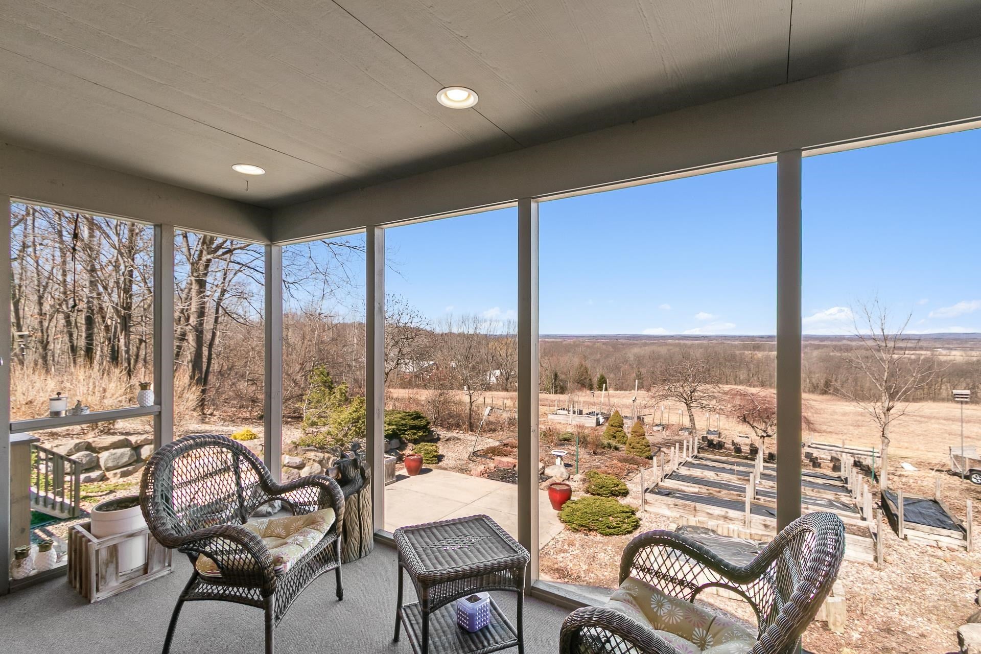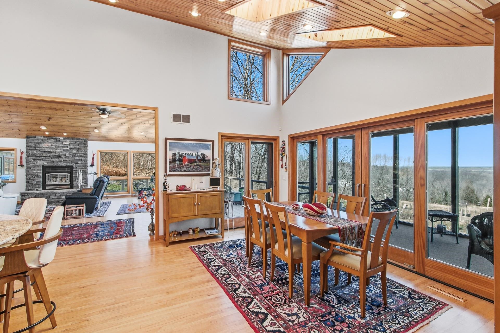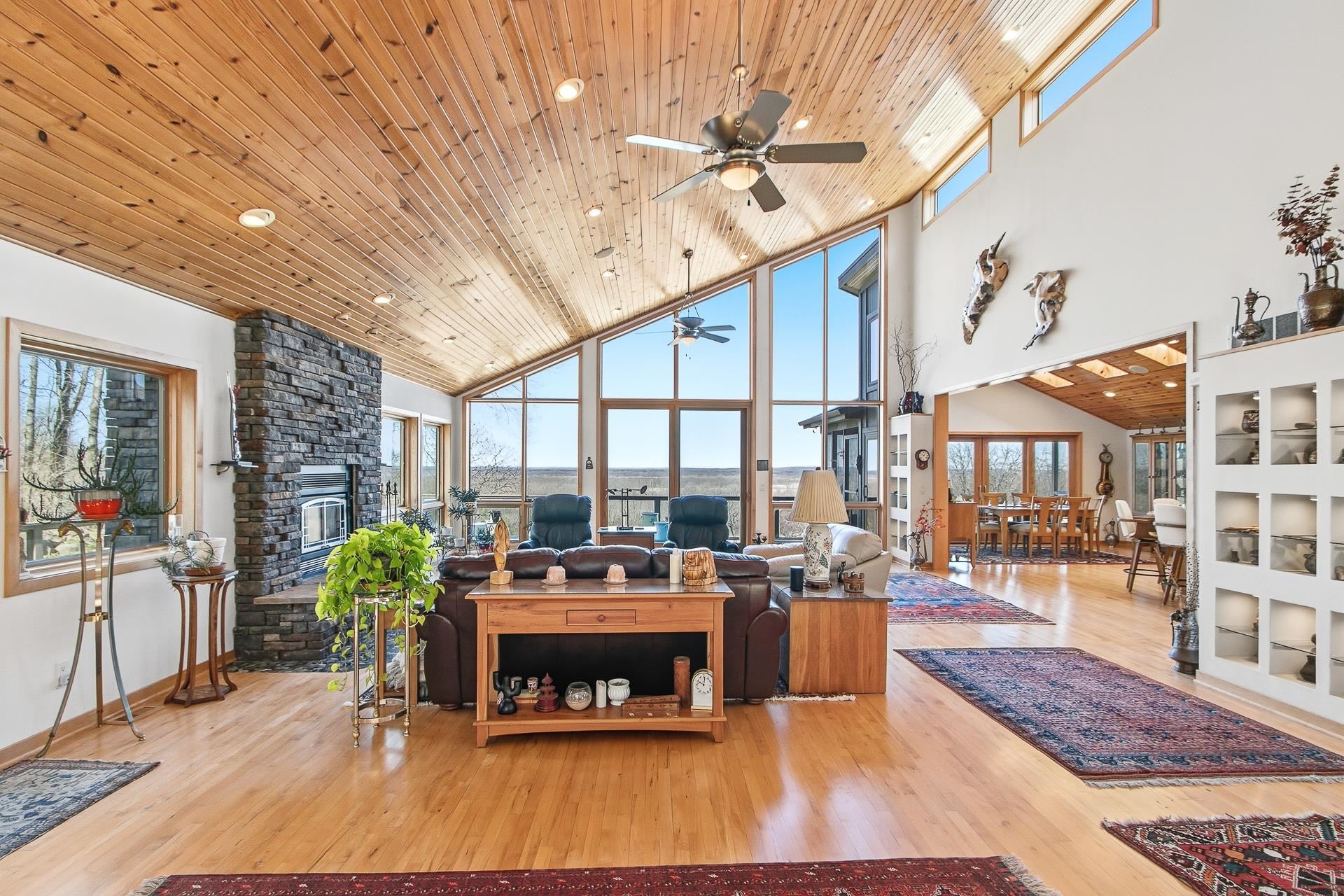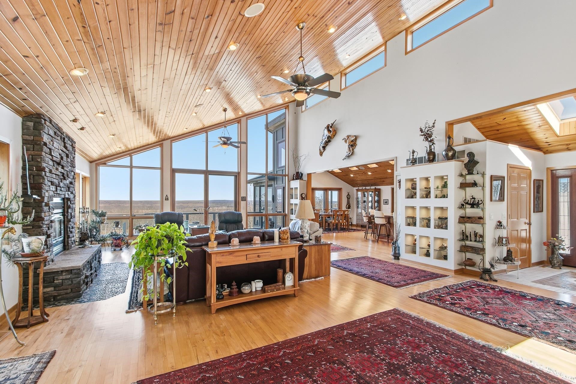Discover remarkable serenity & privacy at this custom meticulously designed 5,500 sq. ft. Ranch home w/4 bedrms & 3.5 baths set on 57 acres! Abundance of wildlife w/30 wooded acres & creek, ideal for hunting, residence or for STR/Airbnb. Just mins from Cascade, Wisc. Dells & Devils Lake. Exquisite home offers a seamless blend of architectural charm & nature viewing. M.L. offers a blend of warm wood flooring thru out. Enormous chefs kitchen w/massive center island, granite counters & cherry cabinetry that seamlessly connects to the expansive Great rm w/soaring high ceilings & wall of transom windows for incredible vistas & views! Open dining area, perfect for entertaining! Office, utility rm w/ built-ins & screen porch.Lg. lavish owners suite w/spa tub, tiled steam shower & 2 walk-in closets. Entertaining walk out LL boasts lg rec rm w/gas fpl, 3 bdrms & 2 full baths. Enjoy the huge patio, firepit, gardens for serene outdoor living. Spacious wrap around deck & sauna! Roof 6 yrs old.
