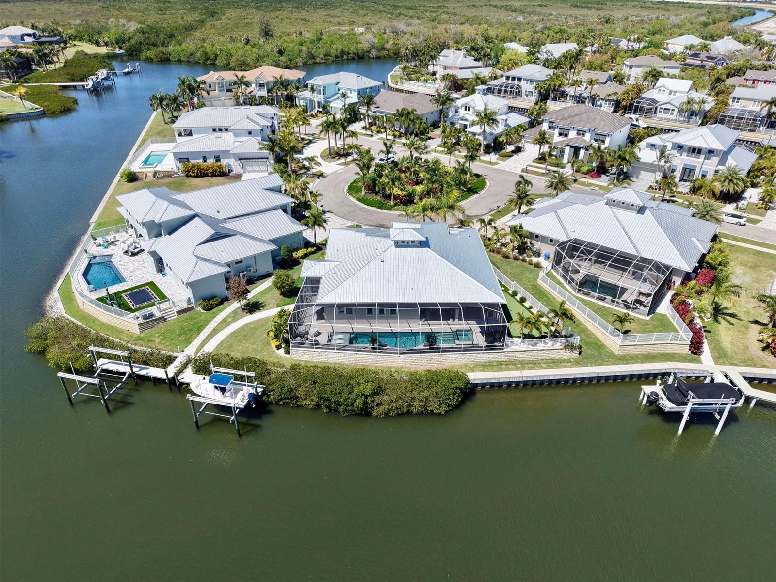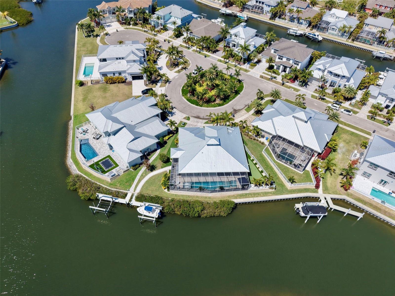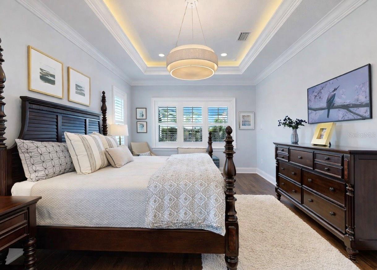 Welcome to an extraordinary waterfront retreat in the highly sought-after MiraBay community, where refined luxury meets effortless coastal living. Perfectly positioned on a quiet cul-de-sac with a tropical island backdrop, this exceptional residence captures the essence of Florida lifestyle with sweeping water views and an expansive extra-wide canal featuring a turning basin directly behind the home. Set on an oversized pie-shaped lot with an impressive 141-foot-wide backyard and preferred south/southeast exposure, this 3-bedroom plus office, 4-bathroom home offers nearly 3,000 square feet of beautifully curated living space. From the moment you enter, youre greeted by soaring 12-foot ceilings, rich engineered wood flooring throughout, crown molding, tray ceiling uplighting, and impeccable custom trim work that elevate every space. Designed for both everyday living and elevated entertaining, the chefs kitchen is a true showpiece, featuring a Wolf 6-burner gas range with dual ovens, Sub-Zero refrigeration, Bosch dishwasher, prep sink, and an expansive pantry. The seamless flow into the family and dining areas is enhanced by electric blinds, plantation shutters, and a whole-house sound system, creating a sophisticated yet comfortable ambiance. The primary suite is a private sanctuary, complete with a massive spa-inspired bathroom, dual walk-in closets, and elegant finishes throughout. Solid core 8-foot doors, designer lighting, and high-end ceiling fans further reflect the attention to detail found in every corner of the home. Step outside to your private waterfront oasis, where resort-style living takes center stage. The lap pool and 8-person spa are fully app-controlled, surrounded by a Shellock pool deck and complemented by a fully equipped outdoor kitchen with natural gas grill, sink, and storage. For the golf enthusiast, a 4-hole putting green and chipping area add a unique and luxurious touch. Boating enthusiasts will appreciate the 16,000 LB BOAT LIFT, private dock, and direct access to open water, all framed by a manicured mangrove-lined seawall. Evening ambiance is enhanced by solar dock lighting and natural gas exterior lighting, creating the perfect setting for sunset gatherings. Additional features include a 3-car garage with epoxy flooring and custom storage systems, whole-house generator, central vacuum, water filtration system, hurricane-rated windows and doors, and an interior A/C closet for added efficiency and longevity. This is more than a homeits a statement of lifestyle, where luxury, comfort, and waterfront living come together seamlessly in one of Tampa Bays premier coastal communities. Residents of MiraBay enjoy resort-style amenities including waterfront clubhouse dining, heated pools, fitness facilities, tennis and pickleball courts, and kayaking. Schedule your private tour today.