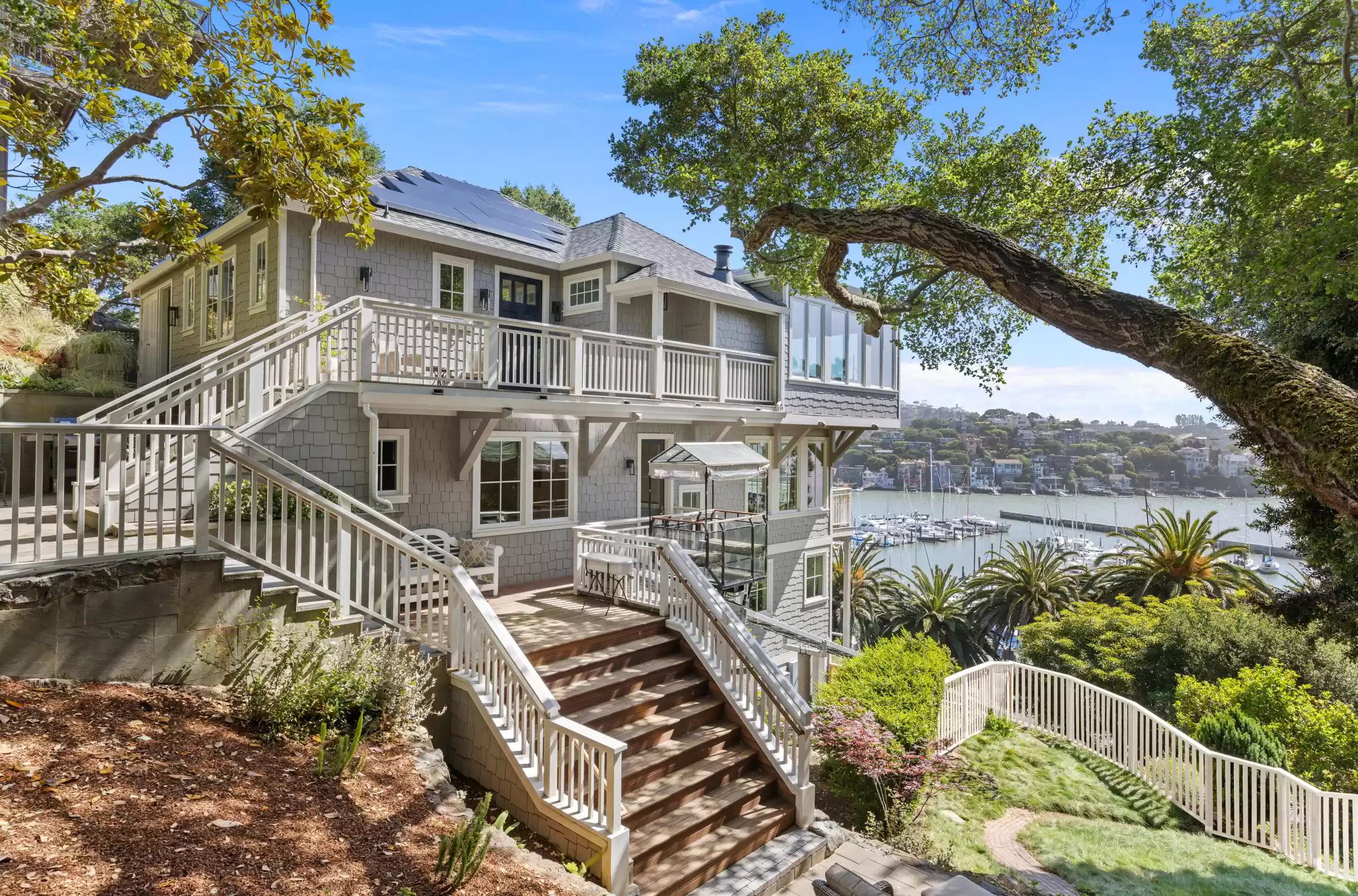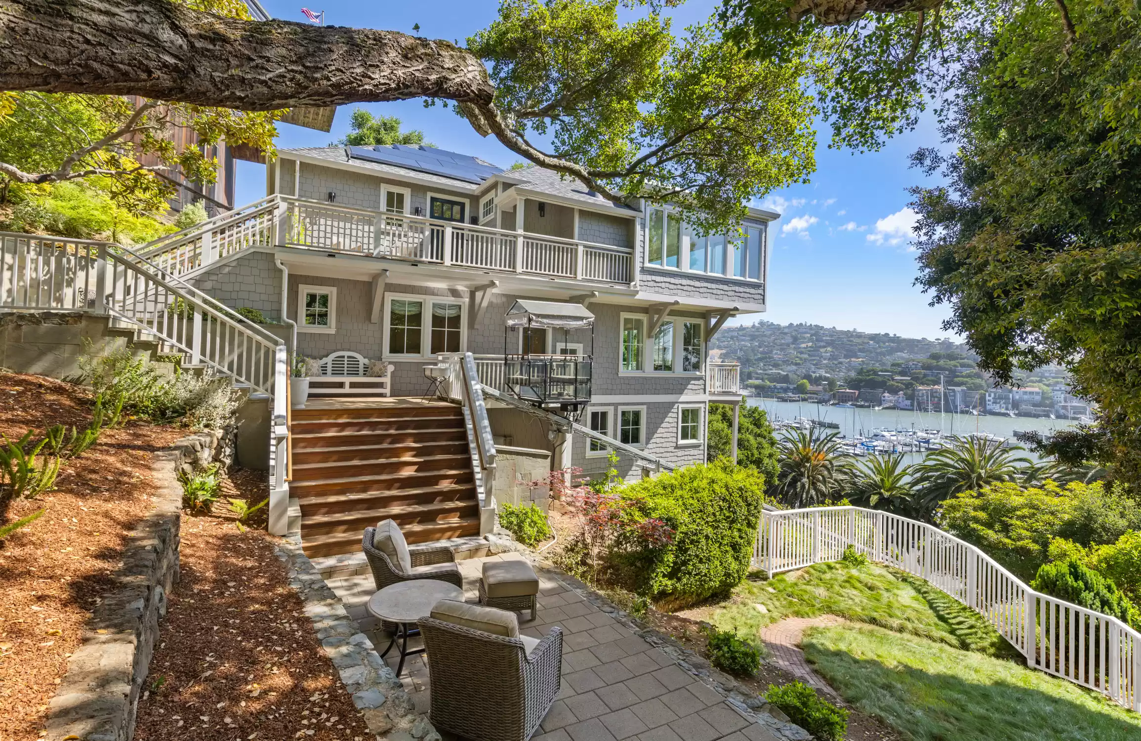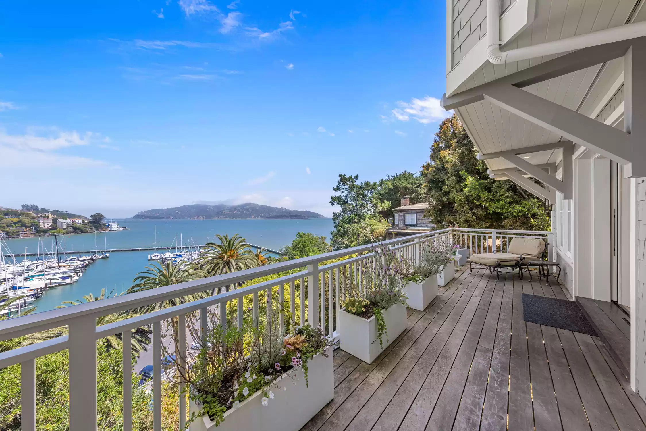 Offering an exceptional blend of contemporary style and comfort, this Belvedere Island gem embodies the coastal ambiance synonymous with the seaside lifestyle of the Belvedere-Tiburon Peninsula. Showcasing an extraordinary panorama of views reminiscent of the Amalfi Coast and Portofino in Italy, every aspect of this residence evokes a sense of timeless beauty, with breathtaking views of the bay, Angel Island, Belvedere Cove, Corinthian Island, and Racoon Strait.Significantly renovated and completed in 2019 by luxury builder Sausalito Construction, this impressive residence exemplifies meticulous attention to detail and the highest level of craftsmanship, boasting state-of-the-art finishes and an elevated design aesthetic.A top of the line hillavator gracefully ascends to the entrance of the residence, providing picturesque views as you make your way to this contemporary retreat.Offering a forward-thinking design style, this residence features stunning finishes such as beautiful European Oak hardwood floors, quartz countertops, custom lighting, Marvin windows and doors, custom cabinetry, and imported porcelain tile in all bathrooms.The main level of the residence unfolds with a series of open, light-filled rooms featuring high ceilings and world-class views, creating an ideal setting for both everyday living and easy entertaining.The family room, featuring a chic gas fireplace with Carrera marble surround, connects to the living room, enhancing the versatility and scale of this impressive space.The heart of the residence is the captivating living room, where floor-to-ceiling windows showcase mesmerizing views of the bay, Angel Island, Belvedere Cove, and Corinthian Island.Ideal for hosting intimate dinners or large gatherings, the dining room features bay windows that perfectly frame the sweeping views, effortlessly connecting with the living room and kitchen to enhance the ease of entertaining.Elevating the art of entertaining, the phenomenal chef’s kitchen boasts a sleek aesthetic with modern wood cabinetry, stunning quartz countertops, a center island, two sinks, a walk-in pantry, and high-end stainless steel Thermador appliances, including a 6-burner gas range with a griddle, range hood, double ovens, a large refrigerator, and dishwasher.Adjacent to the kitchen is a Whisper Cool temperature-controlled wine room and an office nook, complete with a built-in desk, shelving, and access to the outdoors.A chic powder bathroom with quartz countertops and stylish light fixtures serves as the main-level guest bathroom.Level 2Level 2 of the residence features a luxurious primary suite, two ensuite bedrooms, a laundry room, and a convenient secondary entrance with direct access to the hillavator.The magazine-worthy primary suite offers a luxurious sanctuary of unparalleled comfort and elegance, with high ceilings, abundant natural light, large windows, an impressive walk-in closet with a custom wardrobe system, and sliding glass doors opening to a private deck that showcases a coveted panorama of iconic views. Indulge in a spa-like experience in the lavish primary bathroom, featuring quartz countertops, porcelain tile floors, an oversized stall shower, a soaking tub, built-in cabinetry, a vanity with dual sinks, a makeup vanity, a water closet, an oversized mirror reflecting the scenic backdrop, and French doors opening to the deck.The second bedroom features recessed lighting, good closet space, and a stylish bathroom complete with a floating vanity with quartz countertops, porcelain tile floors, and a shower/tub combination.The spacious third bedroom features recessed lighting, a sizable closet, great natural light, and a bathroom with a floating vanity, quartz countertops, porcelain tile floors, and a large stall shower.The laundry room is equipped with an LG washer and dryer, as well as built-in cabinetry, providing ample storage space for linens.Level 3The third level of the residence features two bedrooms and a stunning full bathroom.The fourth bedroom, or ideal home office, features farm doors, recessed lighting, good closet space, and incredible views.The fifth bedroom features built-in shelving, recessed lighting, a spacious closet, and inspiring views.The full bathroom features porcelain tile flooring, quartz countertops, a floating vanity with dual sinks, and a large stall shower.Embracing the property’s sweeping views, the outdoor living spaces offer an enchanting setting with a lush lawn, manicured landscaping, multiple patios, terraced gardens, and meandering pathways all enclosed by a new Cedar fence. This dream setting is perfect for both entertaining and everyday living, offering endless opportunities to enhance and personalize your outdoor living experience.1 car garage and street parking.Just across from the renowned San Francisco Yacht Club, this premier location offers close proximity to waterfront pathways, island pathways, Belvedere Park, acclaimed local schools, San Francisco and Angel Island ferry services, downtown Tiburon’s Main Street, waterfront restaurants, and boutique shops.Additional Features and Highlights: European 7" wide plank oak floorsModern custom cabinetry throughoutThermador appliancesStunning Quartz countersWarm Zone radiant heatWhisper Kool temperature-controlled wine roomMarvin windows and doorsLG Washer and DryerIPE decksEmtek door hardware throughoutRH kitchen handlesGas fireplaceNewly installed Hardie-Cement shingle siding (fire retardant)Fidelity new roof and guttersUpdated electrical, plumbing, and heatingCustom lighting throughoutImported porcelain tile in all bathroomsBluestone patiosAdditional landscape lightingTree Care – Artistry in TreesSony wall-mounted TV and Sonos speakers4-person custom Hillavator by Hill-HikerSolar Film installed on windows in the dining room, living room, primary bedroomCalifornia Closets installation in primary bedroom closet and laundry roomWindow Coverings installed in all bedrooms and powder roomTesla Sola