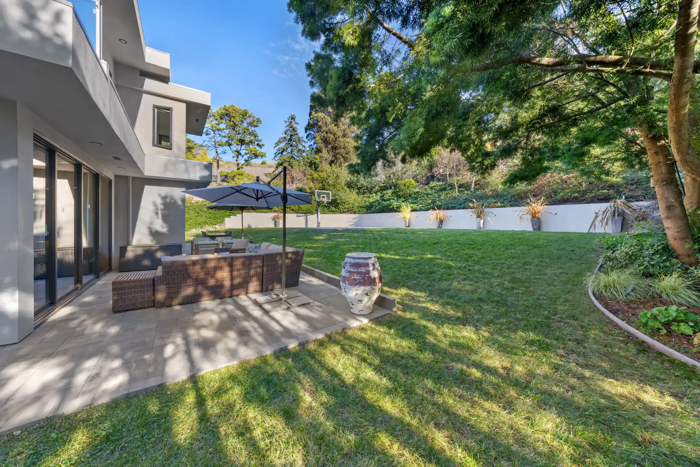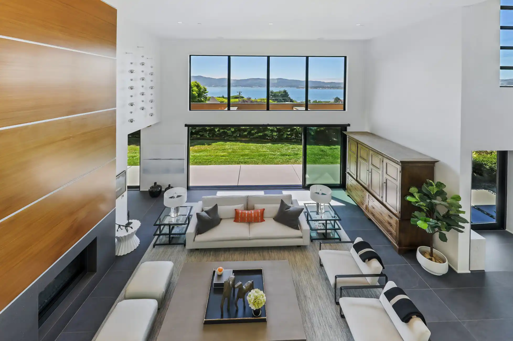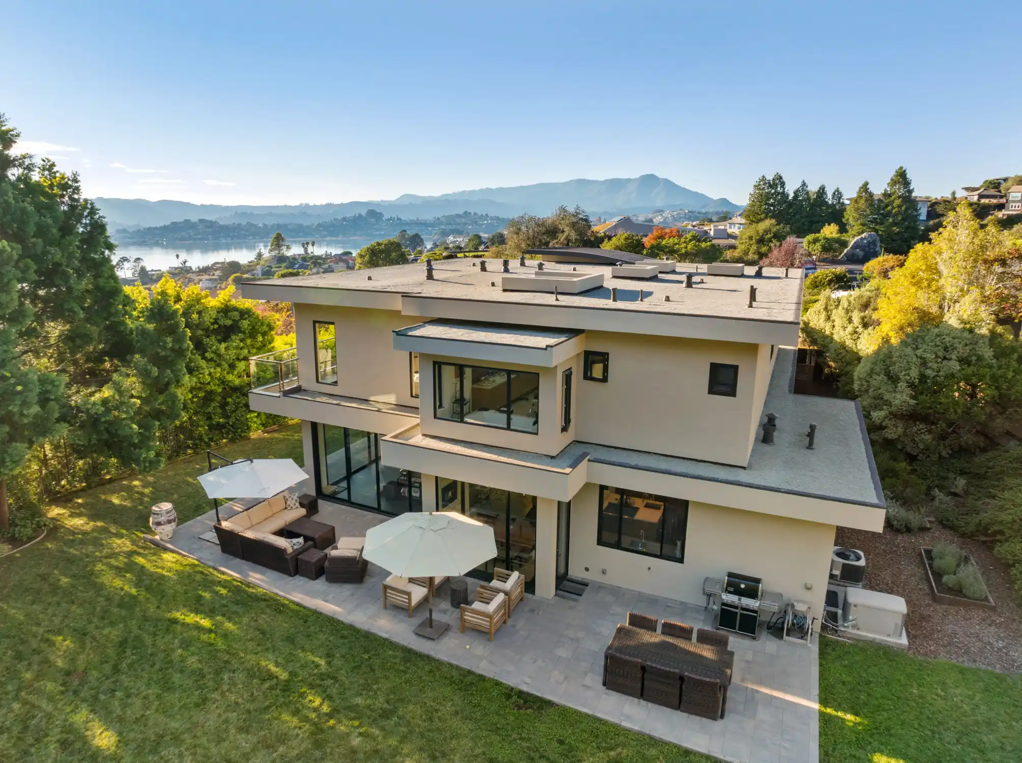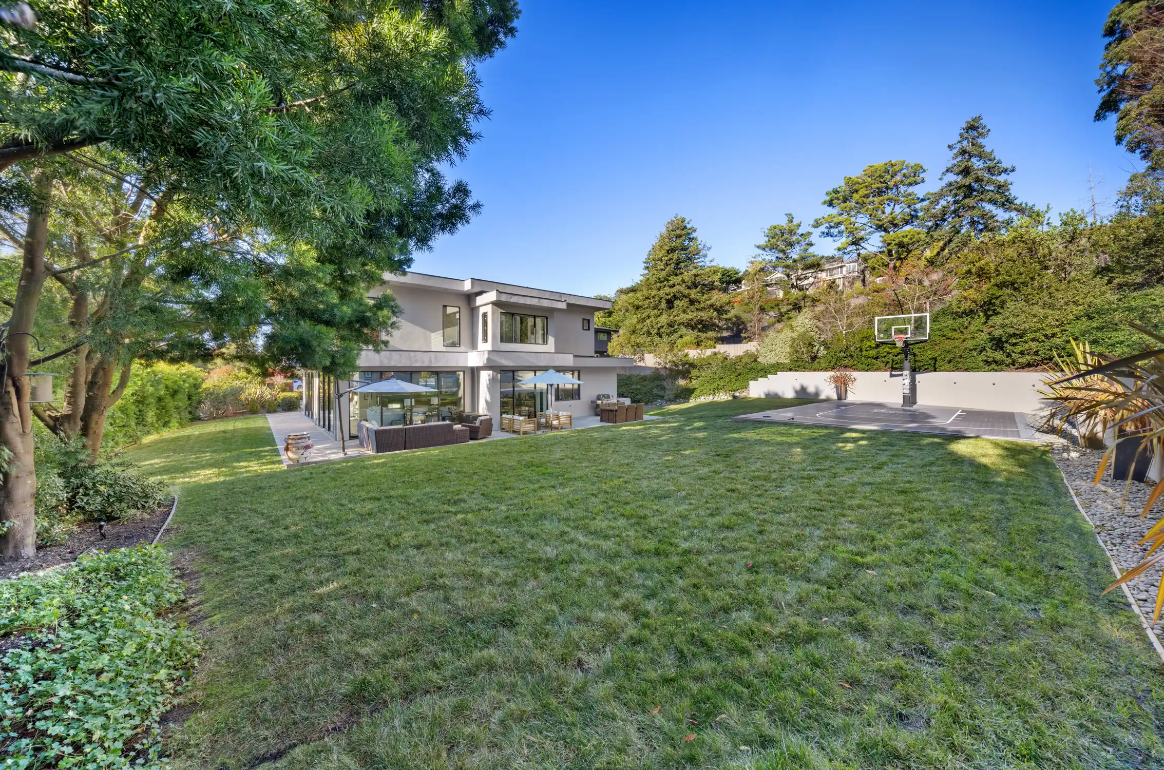 This stylish and contemporary residence exemplifies meticulous attention to detail and the highest level of craftsmanship, boasting state-of-the-art finishes and an elevated design aesthetic.Custom built and completed in 2011, no expense was spared in effortlessly integrating modern amenities and high-quality finishes to create timeless and stylish living spaces.This exceptional residence is an entertainer’s dream, offering unrivaled amenities and seamlessly connected indoor/outdoor living spaces that elevate your lifestyle to new heights of luxury and relaxation.The private outdoors include a huge sunny backyard (the perfect pool site), a sport court, a lush level lawn, and multiple entertainment areas.The architecturally stunning living room boasts soaring ceilings, a double-sided gas fireplace framed by a wood accent wall, and sliding glass doors opening to the outdoors.This elegant dining room showcases modern sophistication and thoughtful architectural details, anchored by a tray ceiling with a stunning chandelier, sliding glass doors that open to the outdoors, and a glass-enclosed wine room with two Allavino wine fridges that enhance the space while seamlessly complementing its refined design.Experience elevated functionality and style in the stunning chef's kitchen, featuring a center island with an attached glass breakfast bar, rich wood cabinetry, high-end stainless steel appliances, a pantry, and a sunny breakfast area.The inviting family room features a double-sided gas fireplace, built-in cabinetry, and expansive sliding glass doors that provide seamless access to the wrap-around entertainment patio and lush backyard.A stylish en-suite bedroom, an incredible home office, a powder room, and the laundry/mud room complete the main level of the residence.A breathtaking floating staircase featuring sleek glass paneling gracefully ascends to the upper level of the residence, featuring a lavish primary suite, two comfortable bedrooms, and a full bathroom.The lavish primary suite features carpeting, a walk-in closet with custom wardrobe system, breathtaking views of the bay, and sliding glass doors that open to a private terrace.Indulge in a spa-like retreat within the luxurious primary bathroom, featuring sleek floors, a floating vanity with dual sinks and elegant stone counters, a soaking tub, a large glass-enclosed shower, and a skylight.Two comfortable bedrooms and a stylish full bathroom with dual sinks and a shower/tub combo complete the upper level of the residence.Attached 3 car garage and large driveway with additional parking for guests.One of Tiburon's most desirable locations, only minutes from Del Mar Middle, Reed Elementary, and St. Hilary's schools, and just blocks from the Old Rail Trail waterfront pathway and downtown Tiburon’s Main Street, which offers San Francisco and Angel Island ferry service, waterfront restaurants, and trendy shops.