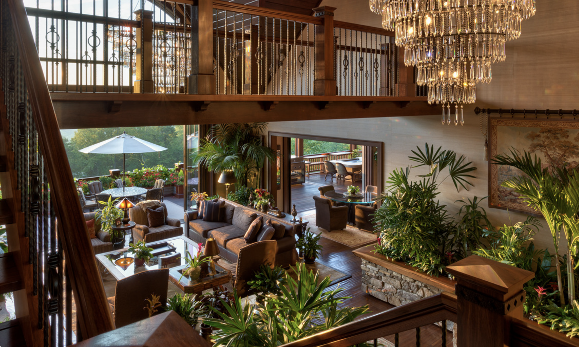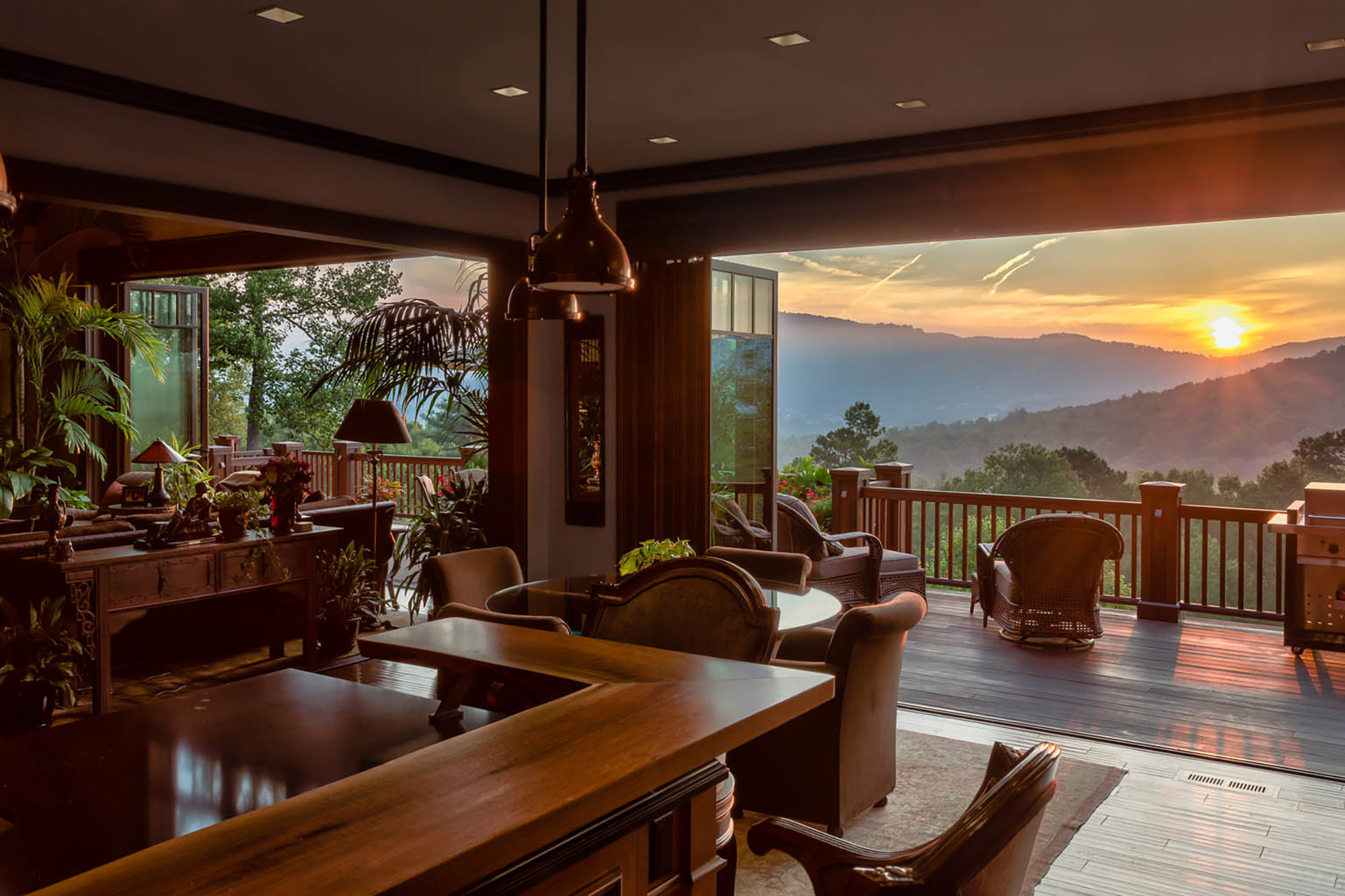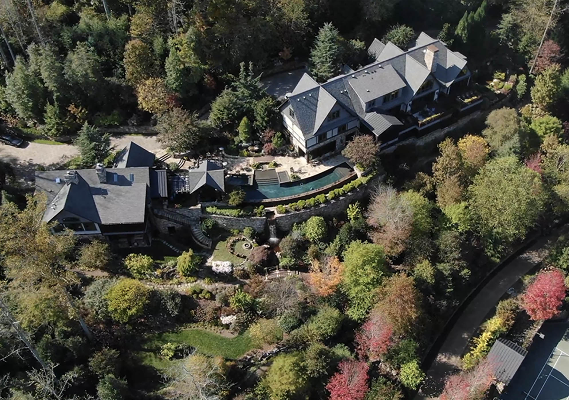 Deerhaven Gardens is one of America’s most private and exquisite treasures. It possesses the charm and grandeur of a country estate while sitting on an east-facing mountain ridge just 5 miles from beautiful downtown Asheville.The estate, approximately 5 miles south of downtown Asheville, sits high upon the east-facing mountain ridge overlooking the community of Deerhaven. The community was originally settled around 1840. Prior to this time, the entire area, including the adjacent Biltmore Estate, was part of the Cherokee Nation. All total, 6 En Suite Bedrooms and a luxurious bunk room comfortably sleep 16; 7 full and 5 half baths, a full spa, media room, indoor bar and billiard room, a 100 linear foot deck, a 100 linear foot screened-in patio, screened in Hibachi style grill and eating porch, separately controlled air-conditioning zones, blackout shades, electronic security, Crestron, Direct and Apple TV and Wi-Fi throughout; 4 separate laundries.Great Room: Includes the parlor, a fully equipped gourmet Viking kitchen; 4 choices for dining: casual, formal, Japanese style Hibachi, and patio. climate controlled 3-car garage. The great room area has three sets of Weiland doors which completely fold back to open the space to the view and sound of nearby waterfalls. The 20’ floor-to-ceiling stone fireplace, the east-facing floor-to-ceiling windows, and beamed cathedral ceiling with a bridge to the upstairs bedrooms add a dramatic flair to the main level parlor. 60” TV, second TV; Sonos sound system.Master: Weiland doors open the east side of the room completely to the 100’ deck overlooking two separate nearby waterfalls and the 50-mile NE view to Mt. Mitchell; hardwood floors; oriental carpets; 20’ vaulted ceiling; remote control blackout shades, bug screens, and sunshades; separate temperature control; sitting area with stone fireplace and a 65 inch 4K TV; California King bed; 1,000 thread count sheets and fine duvet.En Suite Master Bath: En suite featuring a 64 square foot light therapy rain head steam shower surrounded on 3 sides by etched glass; 18’ valet; separate ultra-quiet jacuzzi style bath; 200+ million-year-old petrified wood his and her vanities and bath surround; makeup table; exotic stone floor, oriental carpets; TV.Upper Master: Mountain and waterfall view; hardwood floors; oriental carpets; blackout shades; sitting area, leather writing desk; California King bed; 1,000 thread count linens and fine duvet; separate temperature control; large walk-in closet.Upper Master Bath: En Suite overlooks pool; etched class trim; his and hers stone and copper vanities; stone shower, stone surround bath; oriental carpeting; TV.Upper-Level Bedroom Suite: This three-room suite includes a large sitting room with hardwood floors, oriental carpeting, TV and stone morning bar; Queen bed with 1,000 thread count sheets and duvet cover; mountain view; writing desk; TV; separate; blackout shades; separate temperature control.Upper-Level En Suite Bath: Mountain view; hand carved his and her wood vanities, stone floor with oriental carpeting; stone and glass shower.
