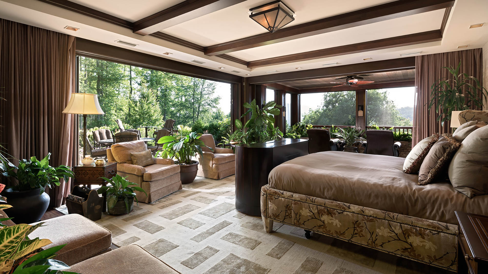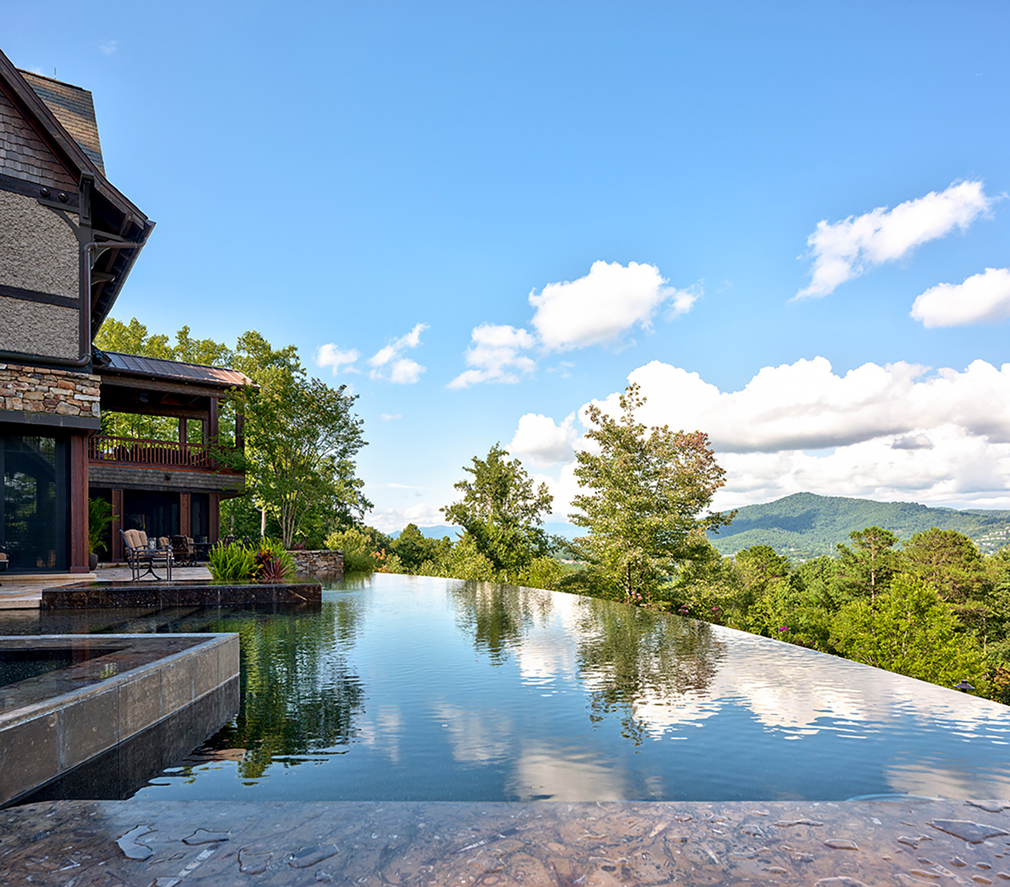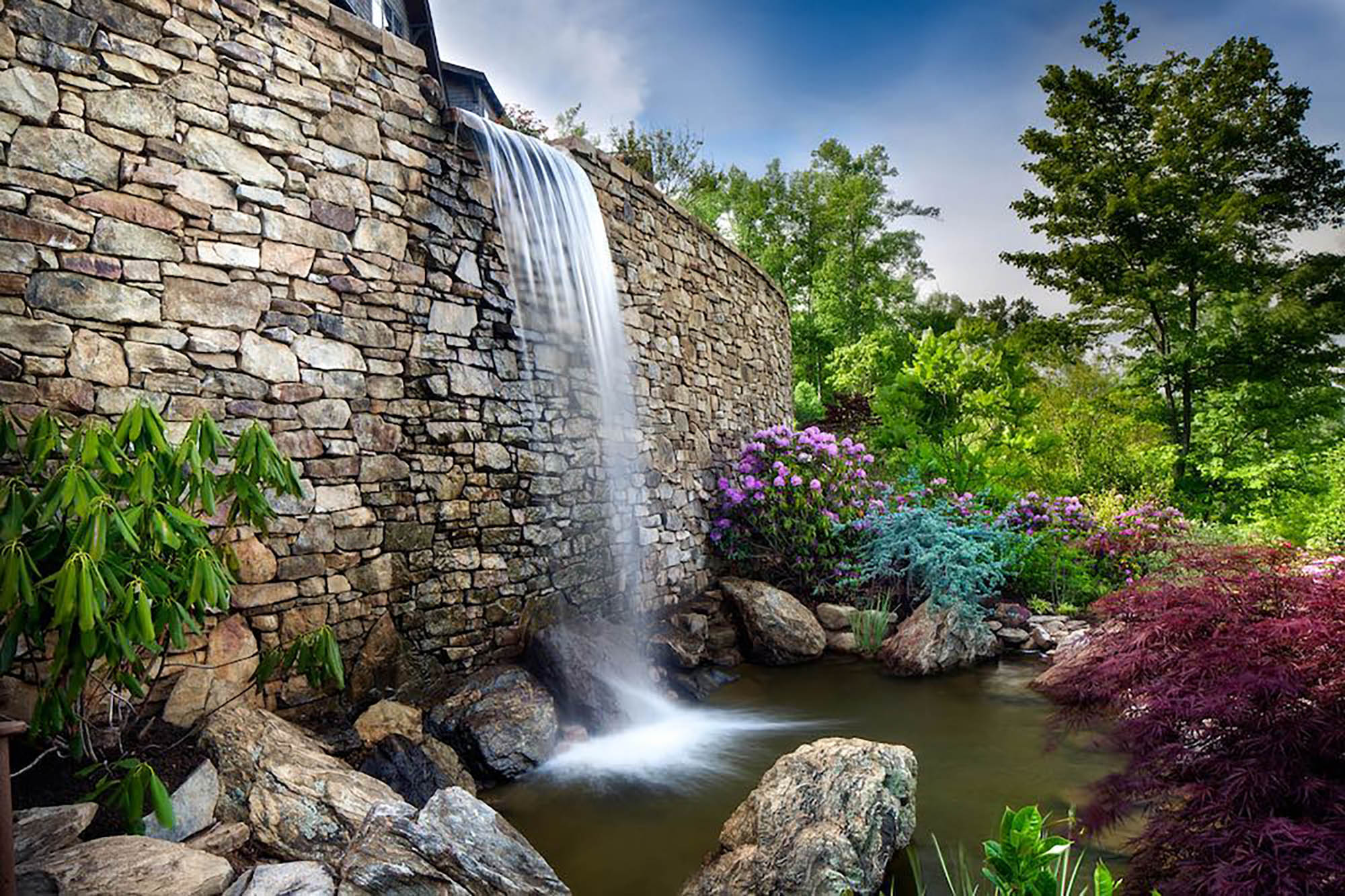 Deerhaven Gardens is one of America’s most private and exquisite treasures. It possesses the charm and grandeur of a country estate while sitting on an east-facing mountain ridge just 5 miles from beautiful downtown Asheville.The estate, approximately 5 miles south of downtown Asheville, sits high upon the east-facing mountain ridge overlooking the community of Deerhaven. The community was originally settled around 1840. Prior to this time, the entire area, including the adjacent Biltmore Estate, was part of the Cherokee Nation. All total, 6 En Suite Bedrooms and a luxurious bunk room comfortably sleep 16; 7 full and 5 half baths, a full spa, media room, indoor bar and billiard room, a 100 linear foot deck, a 100 linear foot screened-in patio, screened in Hibachi style grill and eating porch, separately controlled air-conditioning zones, blackout shades, electronic security, Crestron, Direct and Apple TV and Wi-Fi throughout; 4 separate laundries.Great Room: Includes the parlor, a fully equipped gourmet Viking kitchen; 4 choices for dining: casual, formal, Japanese style Hibachi, and patio. climate controlled 3-car garage. The great room area has three sets of Weiland doors which completely fold back to open the space to the view and sound of nearby waterfalls. The 20’ floor-to-ceiling stone fireplace, the east-facing floor-to-ceiling windows, and beamed cathedral ceiling with a bridge to the upstairs bedrooms add a dramatic flair to the main level parlor. 60” TV, second TV; Sonos sound system.Master: Weiland doors open the east side of the room completely to the 100’ deck overlooking two separate nearby waterfalls and the 50-mile NE view to Mt. Mitchell; hardwood floors; oriental carpets; 20’ vaulted ceiling; remote control blackout shades, bug screens, and sunshades; separate temperature control; sitting area with stone fireplace and a 65 inch 4K TV; California King bed; 1,000 thread count sheets and fine duvet.En Suite Master Bath: En suite featuring a 64 square foot light therapy rain head steam shower surrounded on 3 sides by etched glass; 18’ valet; separate ultra-quiet jacuzzi style bath; 200+ million-year-old petrified wood his and her vanities and bath surround; makeup table; exotic stone floor, oriental carpets; TV.Upper Master: Mountain and waterfall view; hardwood floors; oriental carpets; blackout shades; sitting area, leather writing desk; California King bed; 1,000 thread count linens and fine duvet; separate temperature control; large walk-in closet.Upper Master Bath: En Suite overlooks pool; etched class trim; his and hers stone and copper vanities; stone shower, stone surround bath; oriental carpeting; TV.Upper-Level Bedroom Suite: This three-room suite includes a large sitting room with hardwood floors, oriental carpeting, TV and stone morning bar; Queen bed with 1,000 thread count sheets and duvet cover; mountain view; writing desk; TV; separate; blackout shades; separate temperature control.Upper-Level En Suite Bath: Mountain view; hand carved his and her wood vanities, stone floor with oriental carpeting; stone and glass shower.