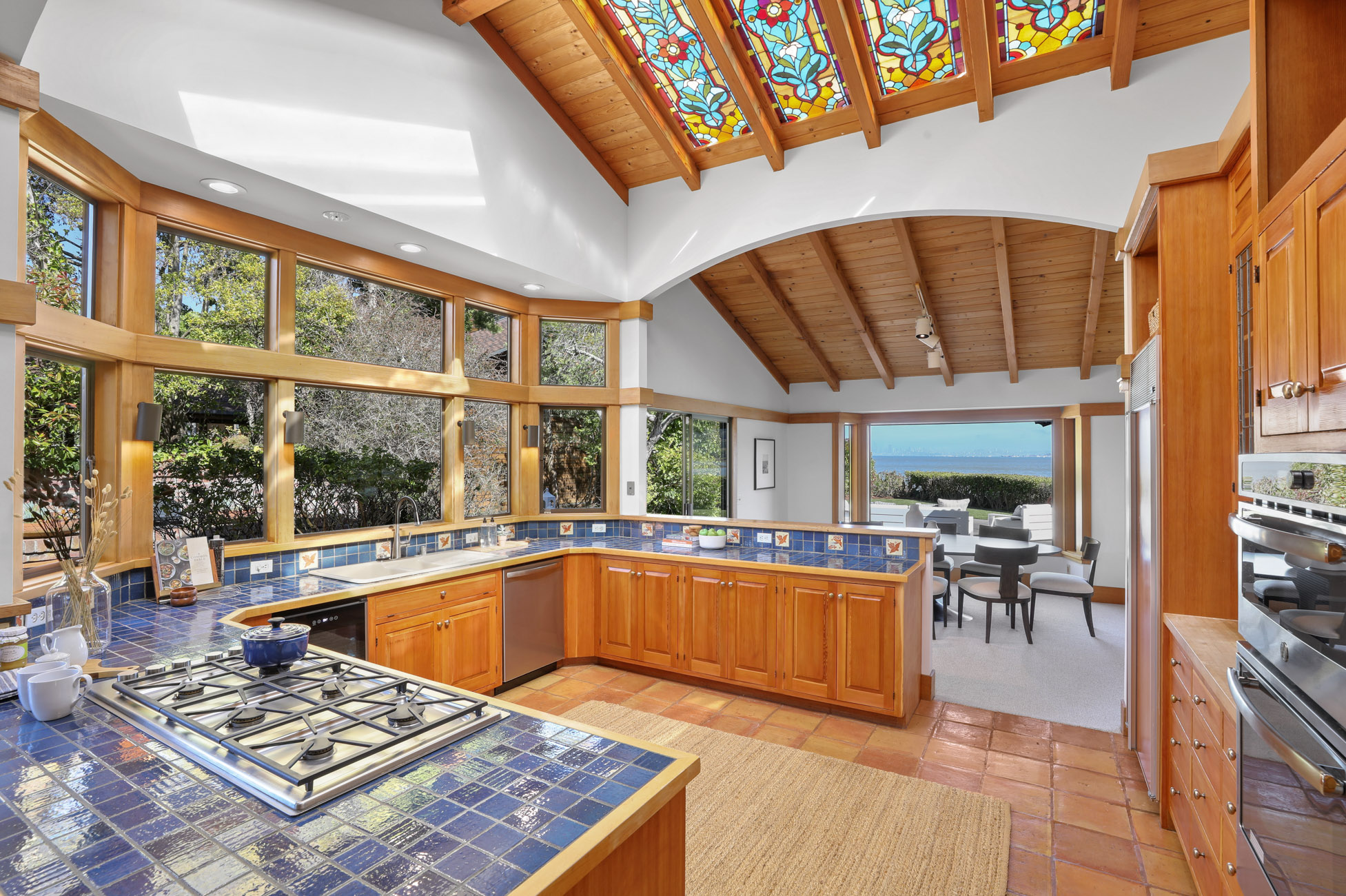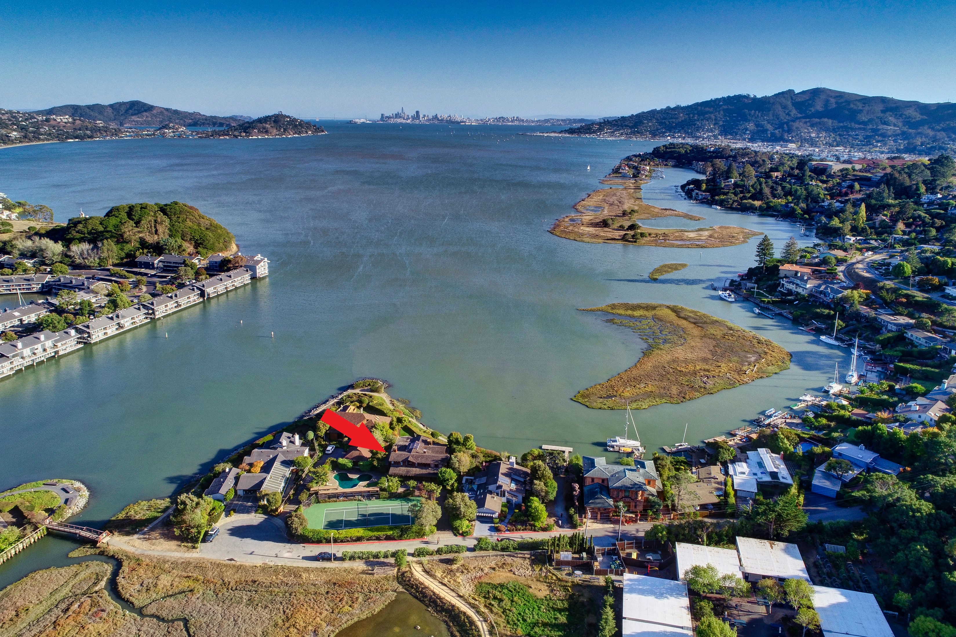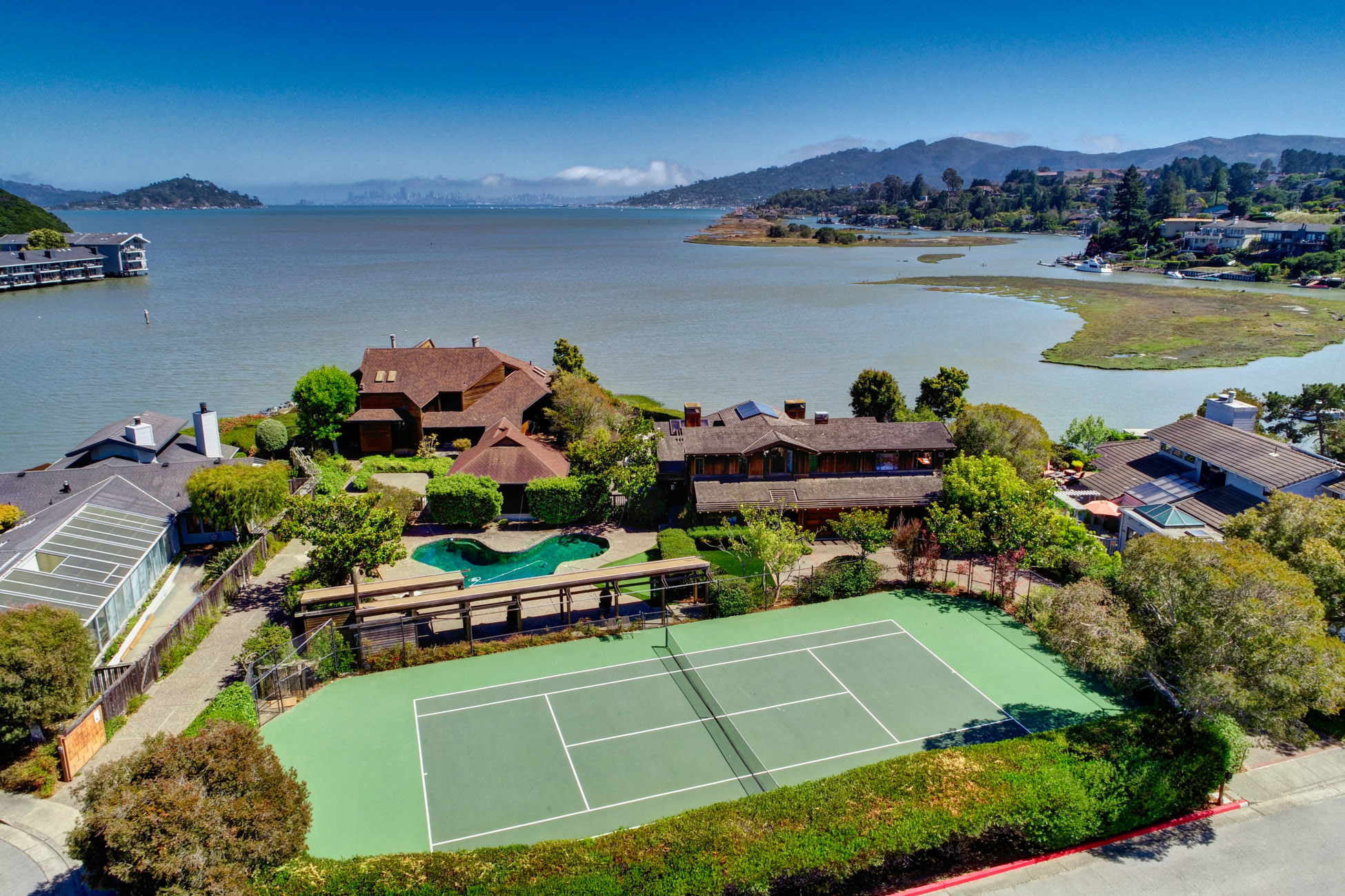 A unique opportunity presents itself in the offering of this gated waterfront residence with private tennis court and large pool.The first time on the market in 40 years, this architecturally appealing home boasts unobstructed views of San Francisco, the Bay Bridge and Sausalito, 4 bedrooms, 2.5 bathrooms and is complete with custom wood detailing throughout.This special enclave of waterfront homes is one of Mill Valley’s best-kept secrets and only minutes to all your conveniences.This distinctive shingled Mill Valley retreat offers an easy open floor plan with a main level primary suite, a large office (or the 4th bedroom), volume ceilings and walls of glass bring the outdoors in providing effortless indoor – outdoor living for the entertaining enthusiast.Upon entering you are immediately drawn to the magical views of San Francisco, amazing sunlight and captivating architecture.The dramatic living room highlights intricate architectural detail, perfectly framing the picturesque views of San Francisco and the bay, and seamlessly connects to the outdoors.The thoughtfully designed great room with kitchen, family room and dining room has open beam ceilings with stained glass, a gas start wood burning fireplace and is perfect for hosting large groups and cozy family gatherings.Generous in size, the light filled primary suite on the main level offers a wall of windows capturing spectacular bay views, high ceilings, an inviting sitting area, a gas start wood burning fireplace, new carpeting, and a changing room with custom wardrobe built-ins.The primary bathroom features a jetted spa bathtub, separate stall shower, dual vanities and custom cabinetry.The main level office (or 4th bedroom) features built in cabinetry and opens to the outdoors.The upper level landing features a sitting area with views perfectly framing San Francisco and the bay.Oversized 2nd bedroom or a perfect den/family room (with plenty of room for a bathroom addition) offers a wall of built-in shelving, a built-in desk, new carpeting, and opens to a private terrace.The 3rd bedroom with built-in desk, and a tiled guest bathroom with a stall shower are also located on upper level.The laundry room and powder bathroom are conveniently located on the main level.The magnificent grounds flourish year round and provide the ultimate sanctuary for tranquil living sure to delight the most discerning buyer.The outdoor living includes a wrap around entertainment deck, a sparkling swimming pool, tennis court, patios, turf lawns and a putting green.This special residence is the ideal “vacation at home” whether part time or full time and provides the opportunity to style and renovate to your own desire.Situated at the end of the culdesac in Strawberry's most sought after enclaves, this special residence embodies the essence of casual modern living. Vacation at home with waterfront pathways outside your back door, dock access for boating and paddle board activities, and only a short distance to the Cove and Strawberry Shopping Center, Strawberry Point School, Strawberry Recreation Center, The Club at Harbor Point, Blackies Pasture, and Hwy 101.3 car garage and off street parking for multiple vehicles.