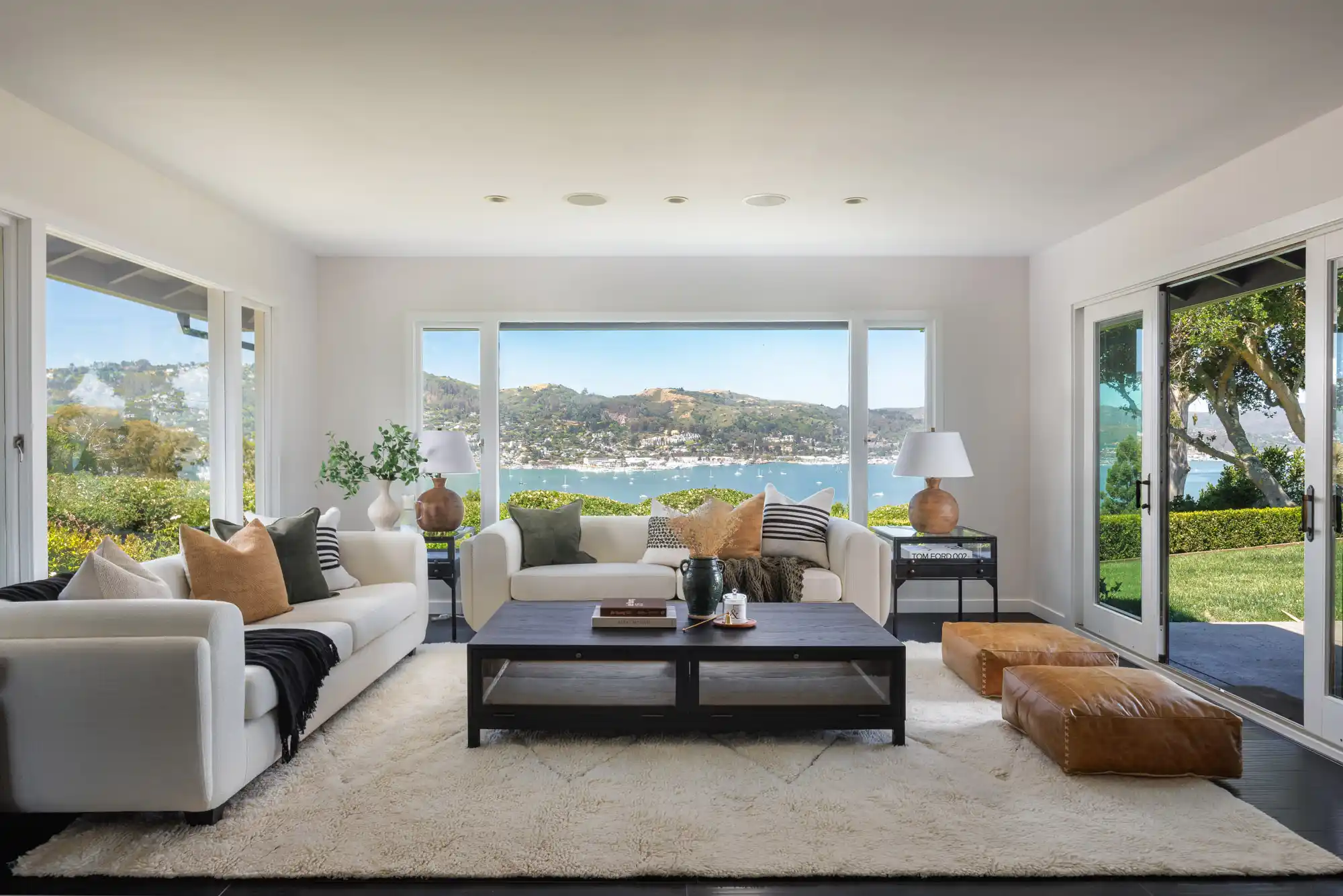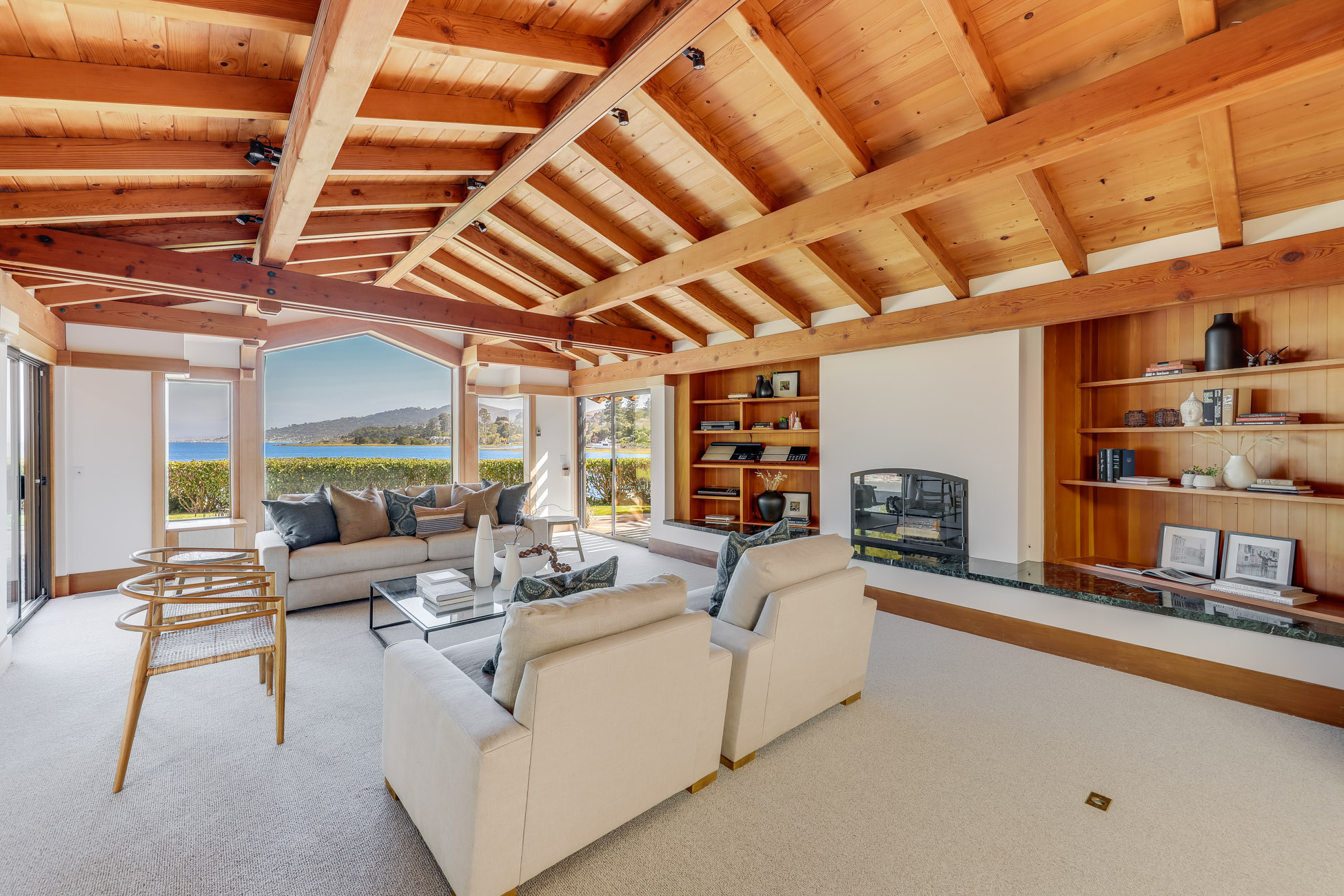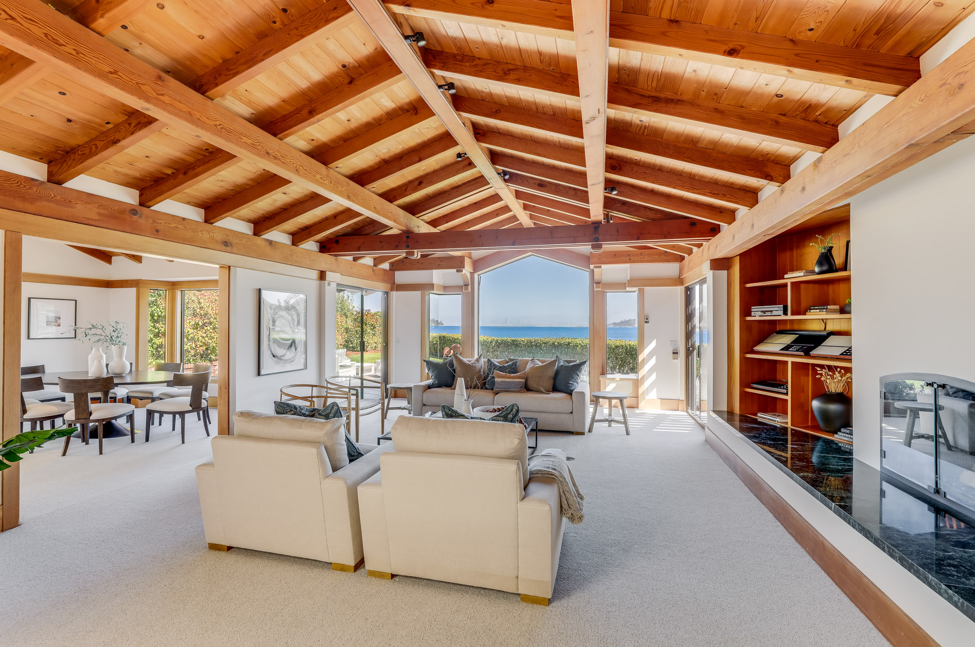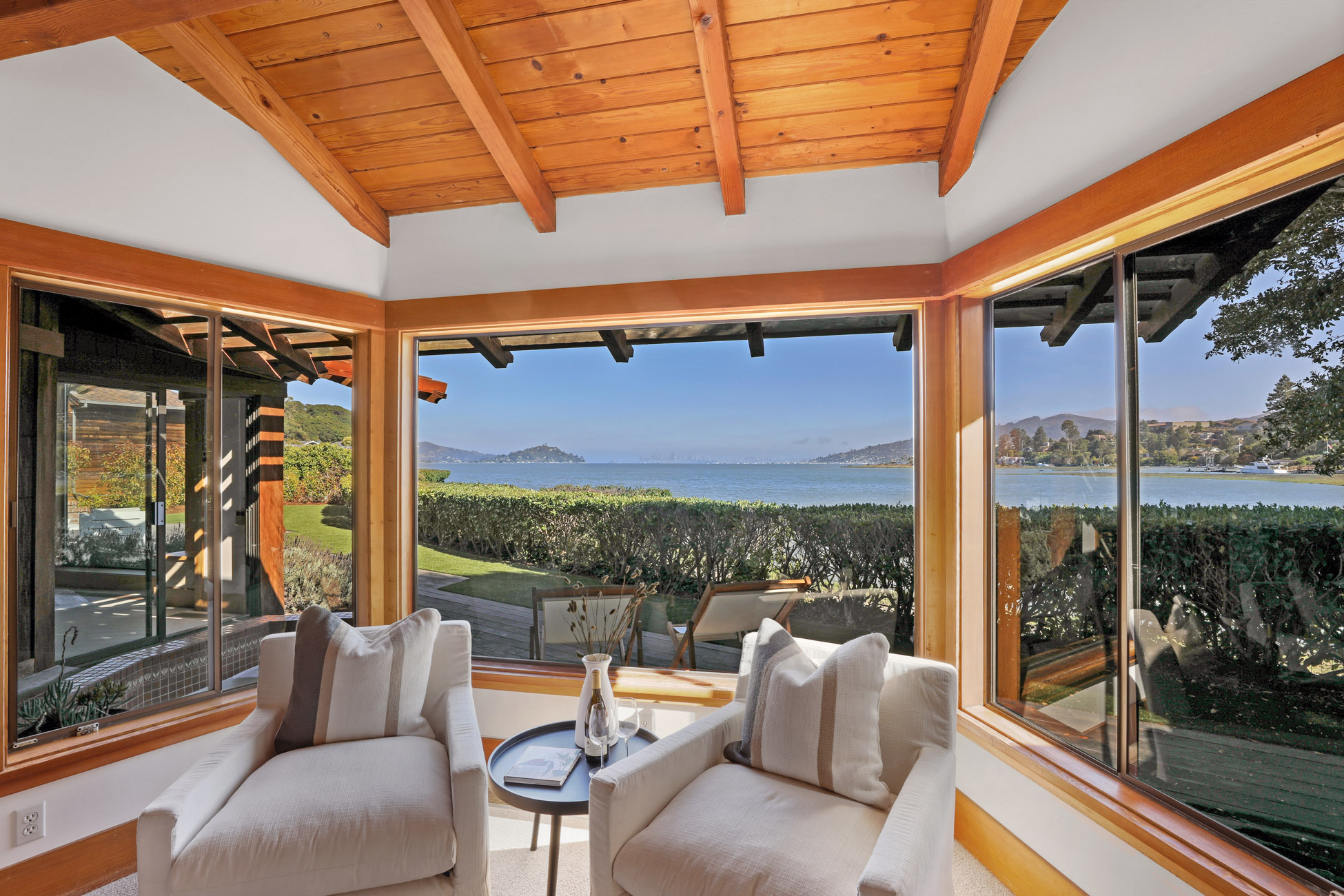 Situated on nearly half an acre on one of Belvedere Island’s most sought-after west side streets, Crest Road, this extraordinary mid-century single-story residence boasts a level and private site, an easy layout, and sweeping views of Sausalito, Richardson Bay, Mount Tamalpais, the Golden Gate Bridge towers, and the surrounding vistas.