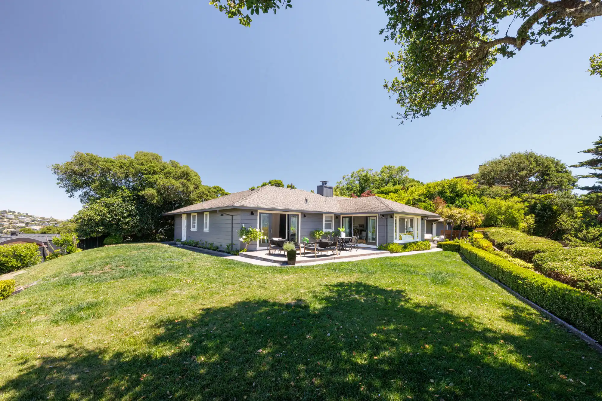 Situated on nearly half an acre on one of Belvedere Island’s most sought-after west side streets, Crest Road, this extraordinary mid-century single-story residence boasts a level and private site, an easy layout, and sweeping views of Sausalito, Richardson Bay, Mount Tamalpais, the Golden Gate Bridge towers, and the surrounding vistas. The outdoor living spaces are an entertainer’s dream, featuring an expansive backyard with a sprawling lush lawn, multiple patios, manicured landscaping, privacy hedges, rose bushes, and raised garden beds.Elevating the outdoor living experience, the backyard boasts panoramic views that stretch from the iconic Golden Gate Bridge towers across Sausalito to Richardson Bay and the inspiring peaks of Mount Tamalpais, a coveted vista that showcases the unmatched beauty of Marin County.This one-of-a-kind location provides an incredible opportunity to build your dream home or thoughtfully renovate the current single-level residence, with the added potential for multiple Accessory Dwelling Units (JADU-ADU), offering flexibility for extended family living, guest accommodations, or rental income.Bathed in natural light, the open and airy living room features a wood-burning fireplace, recessed lighting, and sliding glass doors opening to the outdoors with oversized windows framing picturesque views of Sausalito, Richardson Bay, and Mount Tamalpais.The dining room seamlessly connects the living room and kitchen, enhancing the ease of entertaining with sliding glass doors that open to the outdoor spaces.The functional and open chef’s kitchen boasts a center island with counter seating, newly painted white cabinetry, refinished countertops, recessed lighting, extensive storage, and stainless steel appliances, including a 5-burner gas range, Monogram refrigerator and wine fridge, and a Bosch oven, dishwasher, and microwave.The spacious family room features recessed lighting, a large closet, expansive windows offering stunning views, and direct access to the outdoors and gardens, making it a perfect spot for relaxation and family gatheringsOffering captivating views of Mount Tamalpais, Richardson Bay, and Sausalito, the primary suite features a walk-in closet, two built-in wardrobe closets, a built-in dresser, recessed lighting, and sliding glass doors leading to the entertainment patio. Featuring beautiful earth-toned limestone floors and countertops, the primary bathroom offers a vanity with dual sinks, a stall shower, and recessed lighting.The second bedroom offers a spacious closet, stunning views of Mount Tamalpais and Richardson Bay, and direct access to the backyard.The third bedroom features a walk-in closet and picturesque views of the rolling hills of Tiburon.Offering wonderful natural light, the fourth bedroom is the ideal home office or cozy guest bedroom.A full bathroom complete with tile flooring, a vanity with limestone countertops and freshly painted cabinetry, and a shower/tub combination completes this wing of the residence.Conveniently located off the family room, the fifth bedroom is perfect for guests, featuring an adjacent full bathroom with a stall shower.Attached two car garage and motor court with parking for multiple vehicles.Unlimited possibilities await on this desirable and private view lot, with tremendous upside potential for expansion.This premier location offers close proximity to waterfront pathways, island pathways, Belvedere Park, local schools, and San Francisco and Angel Island ferry services; just minutes away from downtown Tiburon’s Main Street, waterfront restaurants, and trendy shops.