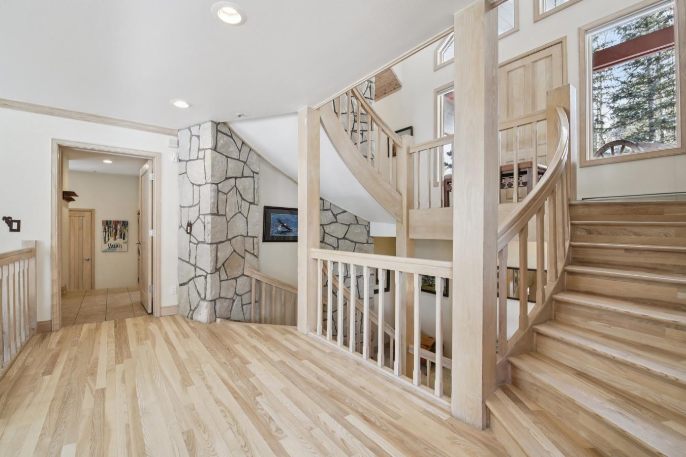 This thoughtfully re-crafted mountain home is nestled in the coveted Weisshorn neighborhood, just a short walk from downtown Breckenridge. Originally inspired by a classic 1968 ski chalet, Breckenridge’s premier builder Ivan Stanley has transformed it into a striking blend of mountain charm and timeless modern design. The main level centers around a dramatic great room, where a floor-to-ceiling stone fireplace sets the tone for cozy evenings and effortless entertaining. The space flows into the dining area and a well-appointed kitchen, where style and function come together beautifully. The rich hickory floors, vaulted ceilings, and granite surfaces lend a warm, refined feel throughout. Just off the great room, a light-filled sunroom offers an inviting space to start the day with coffee, unwind with a book, gather with friends and family, or get creative with your music or art. Upstairs, the spacious primary suite serves as a quiet retreat, complete with two separate closets and a generous bath. Guest and family bedrooms are thoughtfully separated, offering flexibility for kids, visitors, or multi-generational living. Two additional flex rooms can serve as extra sleeping areas, an art studio or workout room. Outdoors, the experience continues with an open-air patio, hot tub, fire pit, and a stand-alone sauna cabin—creating a private, year-round escape. Whether you're watching the stars emerge by the fire or soaking after a day on the mountain, the setting is effortlessly serene. An oversized three car garage with built-in storage provides room for all your gear, while the preserved historic shed adds a touch of character and practical storage.