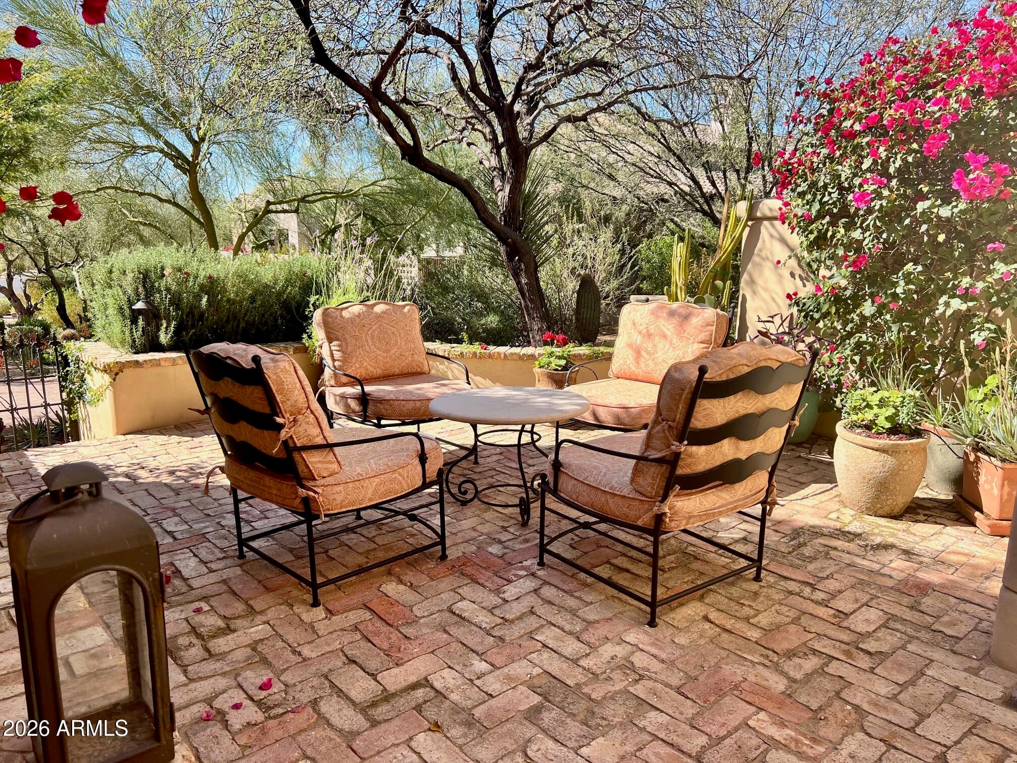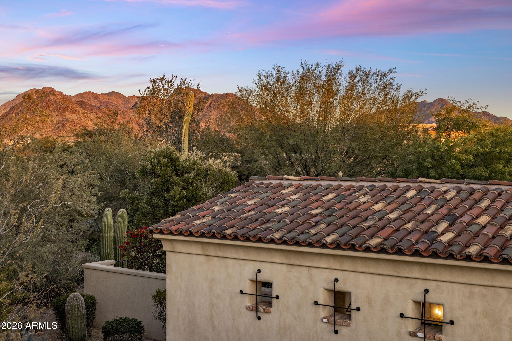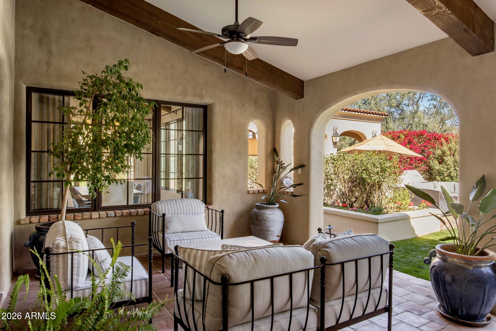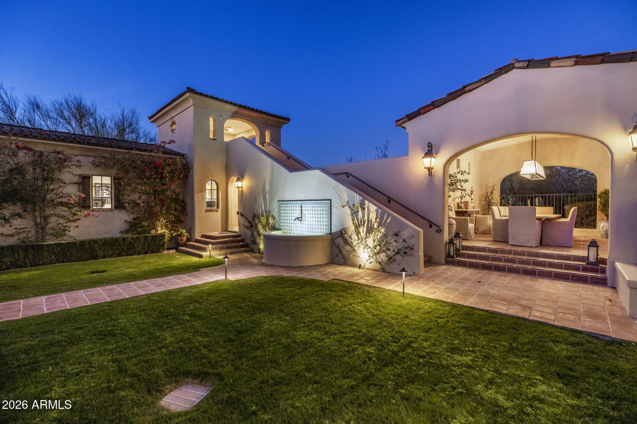 Situated on a 1.07-acre lot within the Country Club at DC Ranch neighborhood, this Spanish-inspired custom home blends timeless, classic design with modern, high-end touches. Accented with hand-made roof tiles, and rustic tile and brick patios, the exterior of the home is surrounded by graceful, mature landscaping creating a private and tranquil setting, while multiple courtyards, patios, and garden spaces encourage a seamless connection between interior and exterior living. Inside, reclaimed wood flooring and vaulted beamed ceilings establish a sense of enduring craftmanship while artisanal tiles, textured finishes and curated light fixtures add depth and character to the living spaces. The kitchen is a case study in form meets function - a neutral color palette, custom arched cabinets, Quartzite countertops, and a patterned tile backsplash create a warm and refined aesthetic, while premium Wolf and SubZero appliances including a 6-burner cooktop with griddle, double gas ovens, a steam oven, separate refrigerator and freezer and a Scotsman icemaker enhance functionality and flow. The windowed dining area overlooks the backyard and is perfect for both casual and formal dining, while a butlers pantry provides additional prep space and includes a built-in wine fridge, beverage drawers, microwave, and added storage. The kitchen opens naturally to the primary living area, which is anchored at one end by a floor to ceiling fireplace and offers access to the back patio. The main level includes the primary suite and two ensuite guest bedrooms, one of which is currently being used as a den. Upstairs, the layout is intentionally limited to an additional guest bedroom, bathroom and an office that overlooks the primary living space below. The primary suite is a refined retreat with a quaint fireplace, custom window coverings, and direct access to the backyard and outdoor living spaces. The ensuite bath, elegantly refreshed in 2024, offers dual vanities, a free-standing soaking tub, tiled shower, a custom closet, and natural light from an arched window that overlooks a small, enclosed courtyard with custom tile detail. The backyard continues the homes architectural character with a cozy covered patio with tiled fireplace, a European style pool with water features and a raised spillover spa, Saltillo tile and brick patios and decking, an outdoor kitchen with built in barbeque and side burner, large covered dining ramada, an elevated covered deck, grassy lawns, and lush, resort-style landscaping professionally designed and recently refreshed. Approved plans exist for a 680-sf guest house. The heavy lifting has been done for you with 3 HVAC systems replaced in the last couple of years. Throughout this residence, craftsmanship and attention to detail are evident in each warm and welcoming space. From custom cabinetry and premium materials to distinctive tile treatments and architectural elements, the home balances classic elegance with modern luxury and refined indoor/outdoor living. Some furnishings are available by separate bill of sale, offering the opportunity for a turnkey transition if desired. The guard-gated Country Club neighborhood of DC Ranch is located just minutes from the 101 Freeway and offers residents over 50 miles of landscaped trails and paths and 2 community centers, including the 15,000 sq ft Desert Camp Community Center with a state-of-the-art fitness center, lap pool, kids splash pool, tennis and pickleball courts, basketball court, playground, grassy play area, and resident gathering spaces. DC Ranch is located adjacent to the McDowell Sonoran Preserve and just 5 minutes north of the 101 Freeway in North Scottsdale. The property is also conveniently located within a miles walking distance to Market Streets retail shops and restaurants.