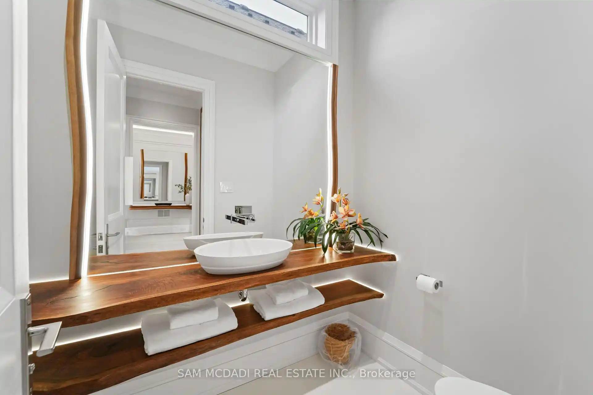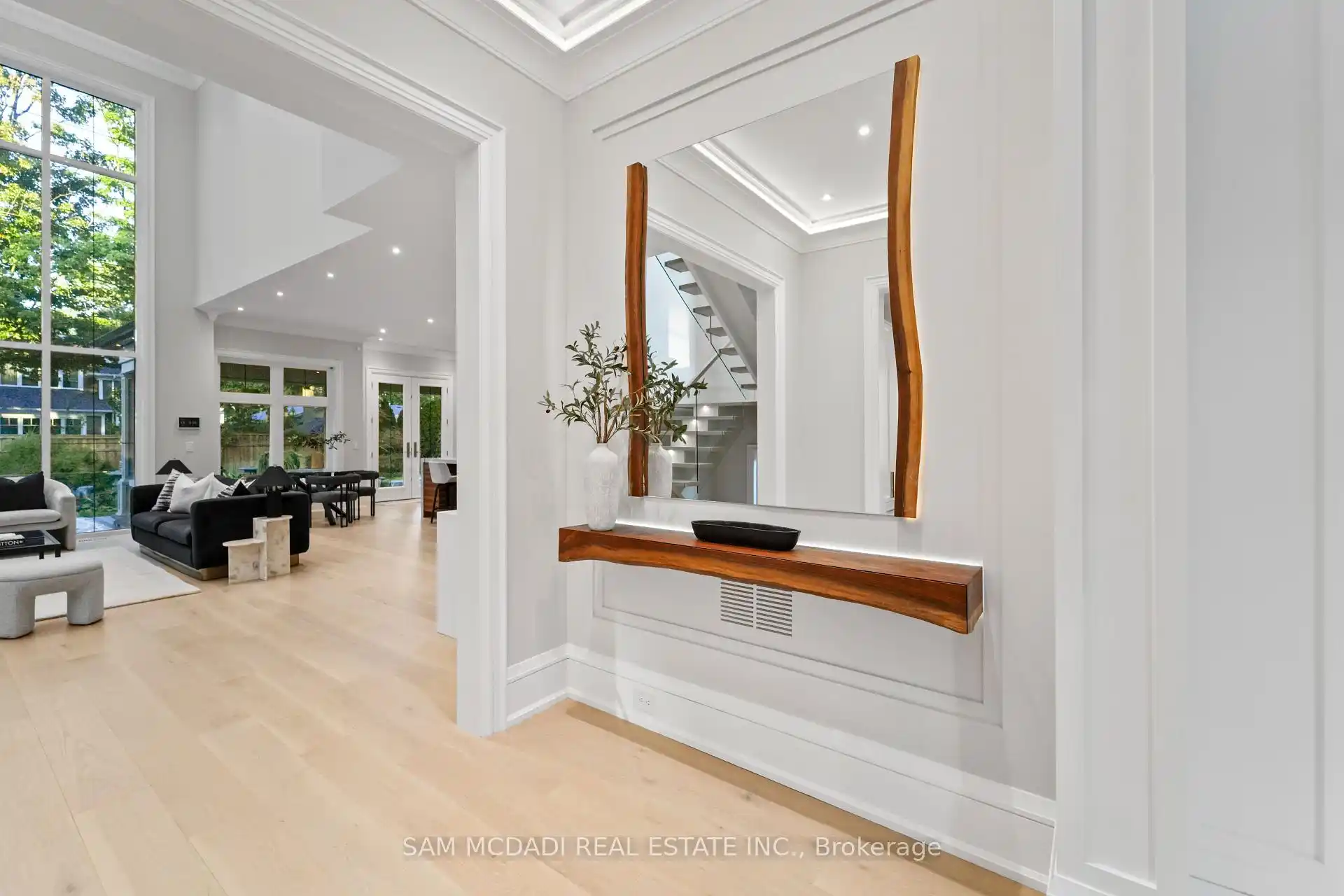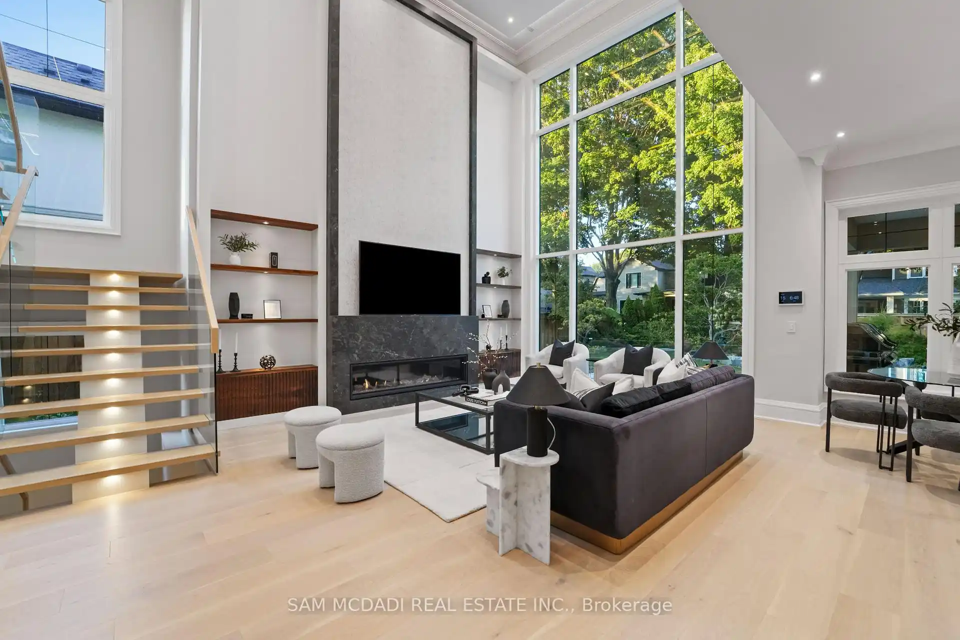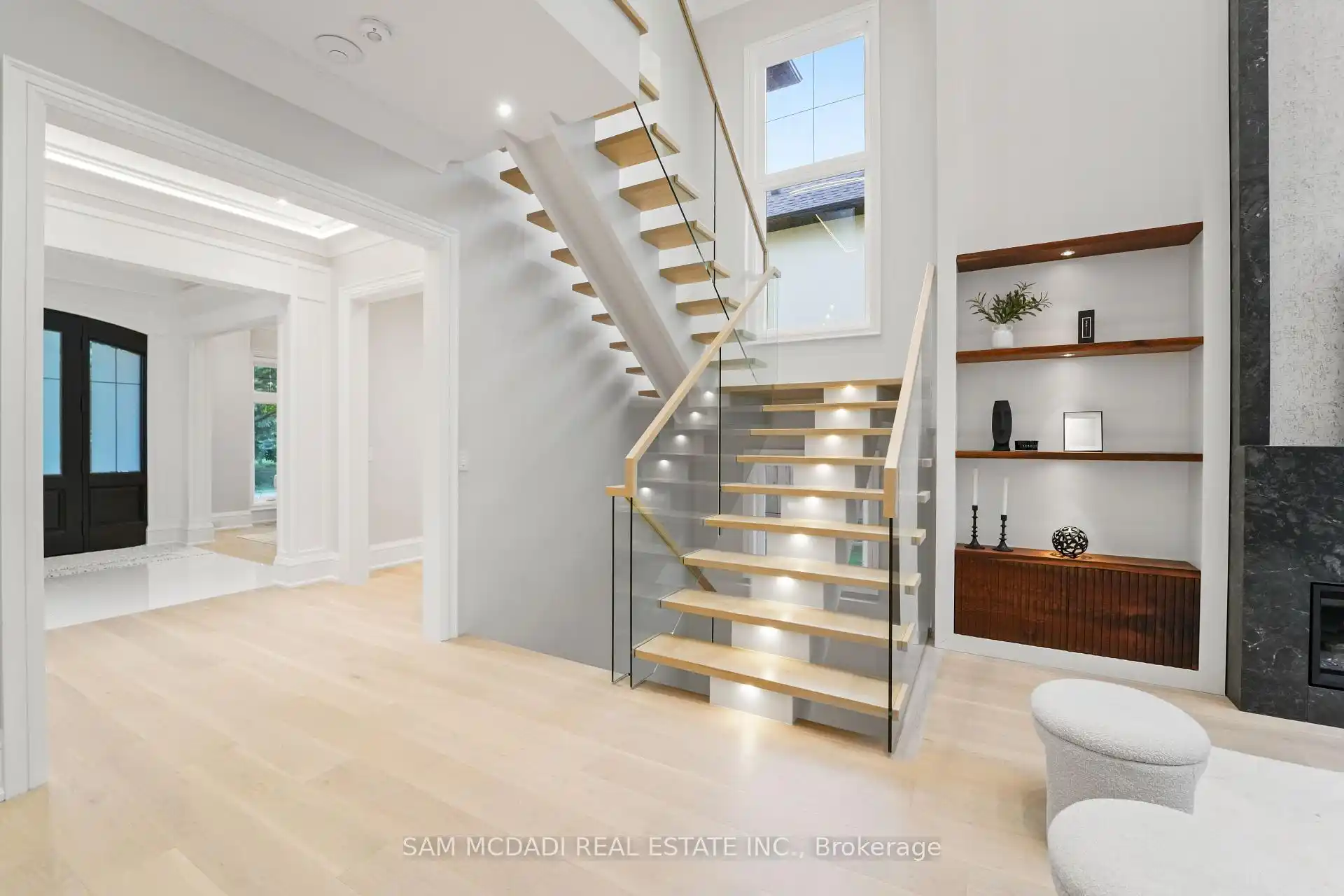 Welcome to 371 Willis Drive, an extraordinary custom-built estate by award-winning architect Keeren Design, ideally located in West Oakville. Inspired by classic French chateau architecture, this home features a timeless white stone exterior, elegant black-framed windows and meticulously landscaped grounds. Spanning 7,500+ SF across three levels, it offers 4+3 bedrooms and 7 bathrooms, each crafted with exceptional detail. The main level features an open-concept layout with 10-ft ceilings and premium finishes. The chef's kitchen is a masterpiece with an oversized island, GEOLUXE porcelain countertops and backsplash, and Thermador built-in appliances including a 6-burner cooktop & 72" refrigerator. It flows seamlessly into the great room, where 20-foot ceilings, a linear gas fireplace, custom built-ins & expansive floor-to-ceiling windows create a grand and inviting atmosphere. A formal dining room, living room, bar, home office, powder room & mudroom complete this level. An oak staircase with glass railings leads to the upper floor, home to a primary suite with a custom walk-in closet & spa-inspired ensuite featuring radiant heated floors, freestanding tub, dual vanities & double rainfall shower. Additional bedrooms each have walk-in closets & private ensuites. The finished lower level adds 3 bedrooms, a full bathroom, modern kitchen, recreation area, media room & office. Elegant design elements are found throughout, including tray ceilings with LED lighting, large aluminum curtain wall skylights, built-in speakers & wide-plank oak flooring. Outdoors, enjoy a private backyard oasis with a covered concrete patio, koi pond, Hydropool swim spa & lush gardens. The front offers a heated granite driveway on reinforced concrete for up to 8 cars, leading to a 3-car garage with concrete flooring. Located near Appleby College, top schools, parks, Lake Ontario & major highways, this residence epitomizes modern luxury living in one of Oakville's most prestigious neighborhoods.