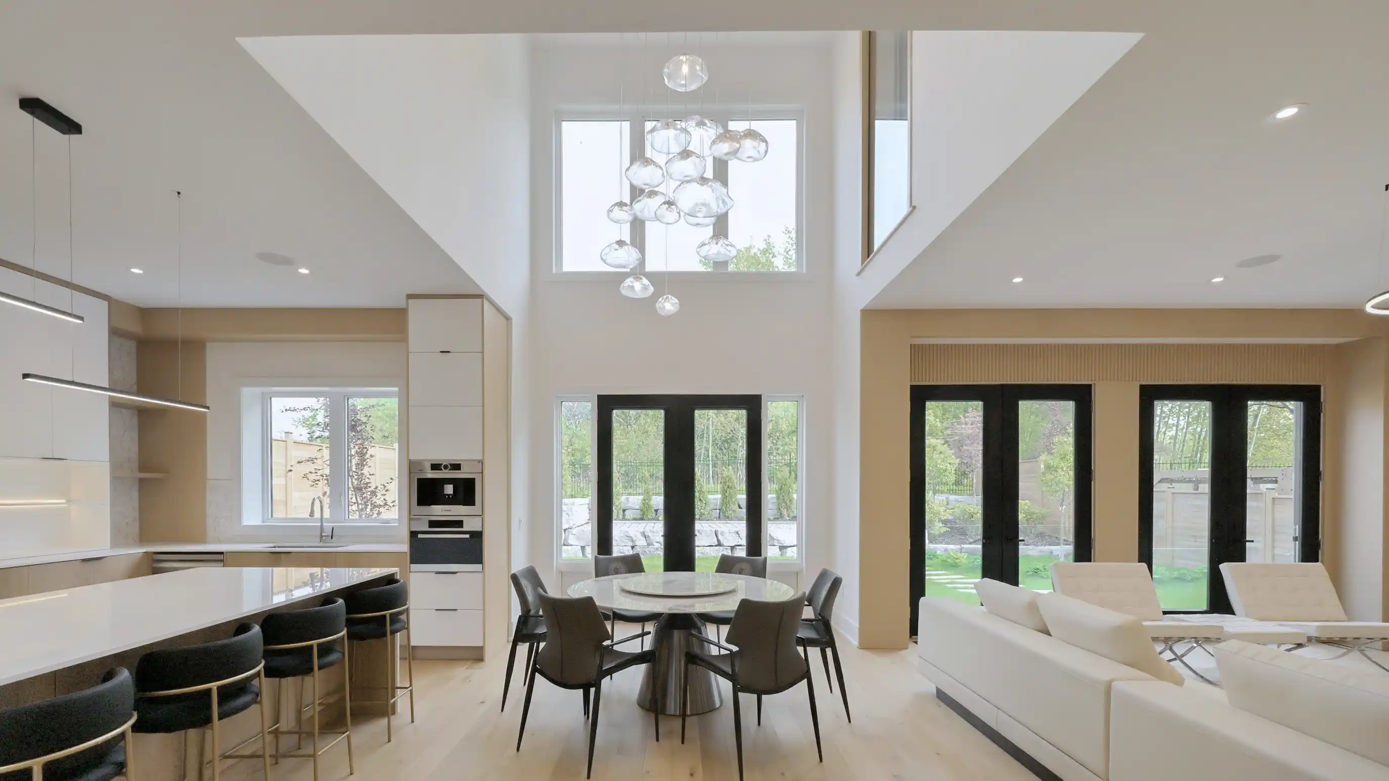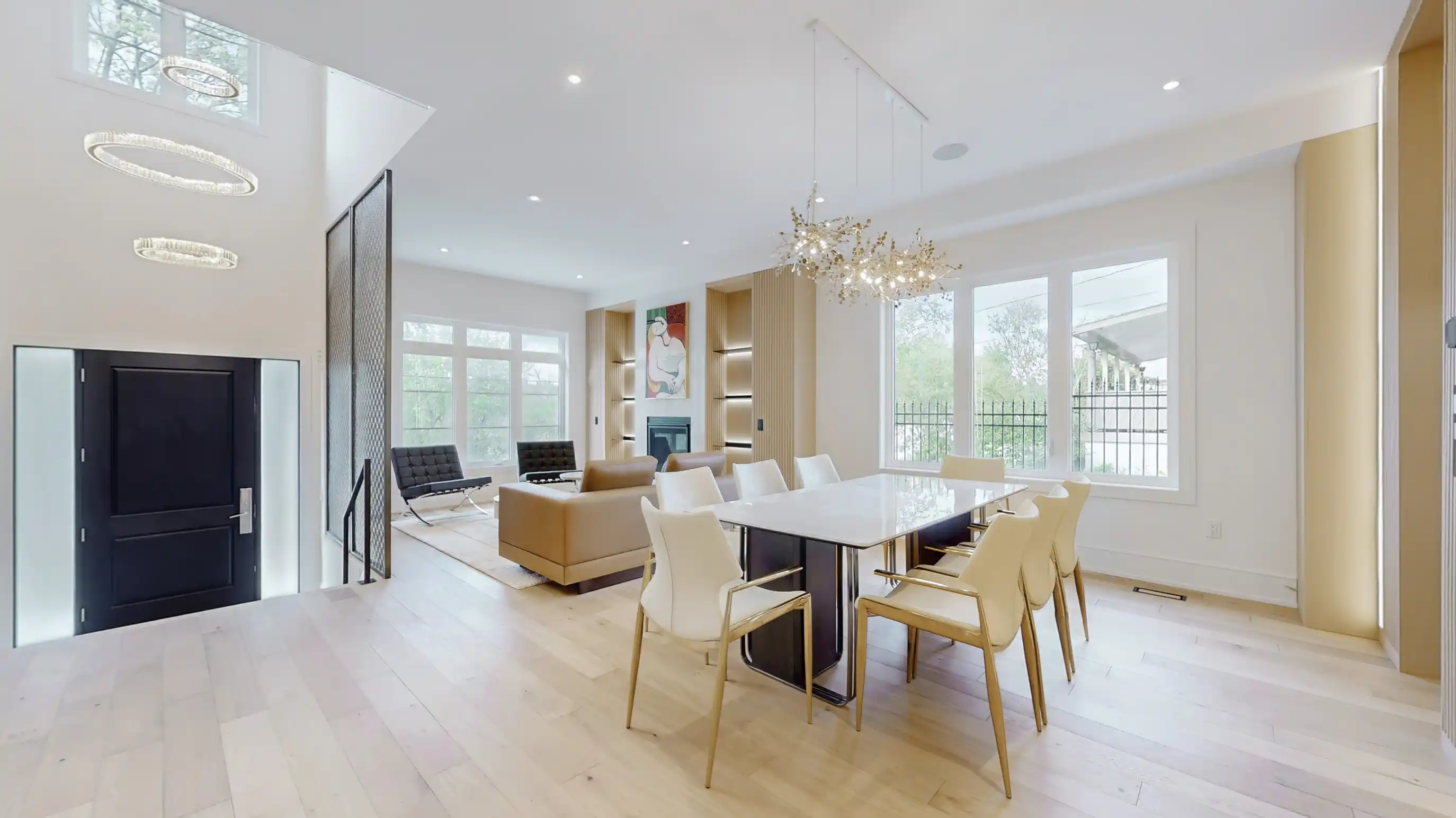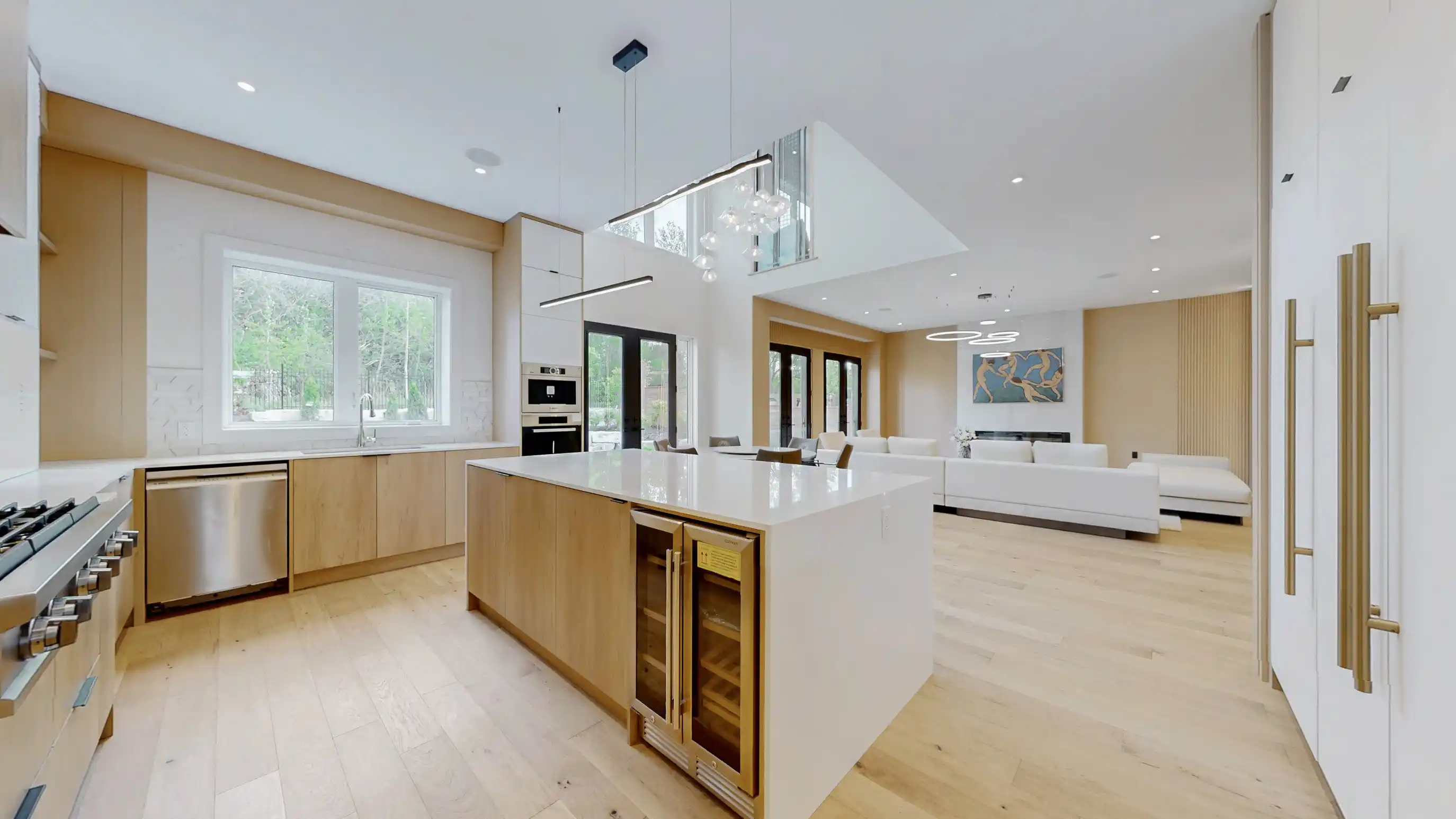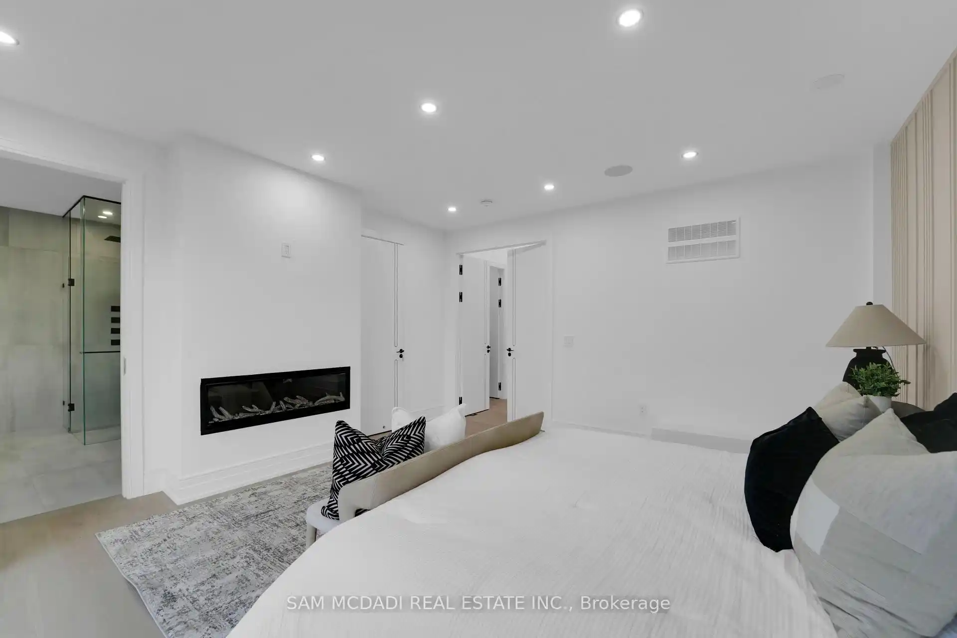 Discover the epitome of upscale living in this contemporary masterpiece nestled in the heart of West Oakville. Offering an exquisitely finished space, this custom home features 5 spacious bedrooms, 6 luxurious bathrooms, and thoughtful details throughout including a dedicated pet spa. Designed for both luxurious everyday living and unforgettable entertaining, the grand foyer flows seamlessly into a breathtaking open-concept living area. Soaring 23-foot floor-to-ceiling windows fill the space with natural light, framed by premium German hardware systems and high-end aluminum gliding windows. Engineered white oak hardwood floors and ambient pot lighting enhance the homes bright, airy atmosphere. The chef-inspired kitchen is a true showpiece, featuring top-of-the-line Dacor appliances, custom cabinetry, a sleek waterfall island, and generous space for casual meals or elegant dinner parties. Striking feature walls add architectural interest and modern artistry throughout the home. Relax by the Napoleon fireplaces in both the living and family rooms, or host guests comfortably in the main-floor bedroom complete with a private ensuite; ideal for visitors or multi-generational living. A Cambridge hydraulic elevator provides seamless, wheelchair-accessible access to all levels. Upstairs, you'll find three serene bedrooms, each with spa-like ensuite bathrooms and walk-in closets. The beautifully finished lower level features radiant heated floors, an oversized cold room, and a walkout to the backyard, offering even more space to unwind or entertain. Additional highlights include a Control4 automation system, central vacuum, walkout basement, swimming pool, aluminum and glass fencing, and so much more. Every detail of this home reflects exceptional craftsmanship and timeless contemporary elegance.