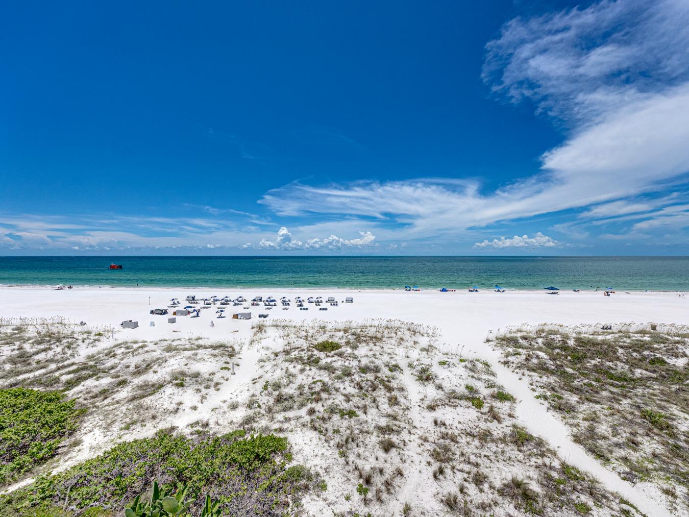 Start the New Year with the purchase of your dream home on the sand in beautiful St. Pete Beach! With only 6 units, each of which span the entire floor from east to west, The Dunes on St Pete Beach is like no other. Owned by the Developer, this exquisite condominium home has only had one meticulous owner. Located on the sugary, white sand of St. Pete Beach, the oft-voted #1 beach in the USA and top 5 in the world, the vistas from the 486sf western-facing balcony are simply stunning. From this enviable vantage point, the setting sun is a highlight of every day. And yet, as if in competition, incredible sunrises grace the eastern balcony, which boasts another formidable 265sf of covered space with sweeping and vast views across the boulevard and over the water and beyond to the iconic skyline of Downtown St. Petersburg and the Sunshine Skyway Bridge. Indoors the expanse between the balconies is 4,245 acsf of exceptional living space: 3 bedrooms, 3 full baths, 1 half bath, a formal dining room, office, gym area, and media room. The centerpiece is an enormous room that would not be adequately described with the more common term of great room. Spectacular Room is more fitting. There you will find a well-appointed open-floor plan, including the kitchen, large pantry, dining area, expansive living room and, of course, a stunning Gulf view which spans almost its full width of 23. A true "Chefs kitchen," this area was painstakingly designed for form and function and features all-wood cabinetry, granite countertops, Sub-Zero and Wolfe appliances, dual sinks providing both a prep area and a cleanse and clear area and more, much more. The primary bedroom encompasses a suite of rooms, including a large bedroom area that also enjoys fabulous views of the Gulf, two walk-in closets with California Closet style built-ins and an enormous primary bath suite that is unique to this building. It has two separate water closets, a massive shower enjoying natural light, dual sinks and an abundance of cabinetry and granite countertop space. There are two guest bedrooms, both en suite. The larger is at the eastern boundary of the condo, as is an office and work-out area. The other guest bedroom was used as an office and features a custom-made bookcase. Unit 400, which is located on the fifth floor, has a single, very convenient under-building parking space. There is also a 1-car garage. This is a rare opportunity to realize your dream of The Beach Life at its finest. Please note that no units at The Dunes experienced any storm damage. And, with a whole-house generator that services all six units, residents do not have to worry about electricity outages! Built in 2008, all living areas are above base flood and all homes here were high & dry at The Dunes. Unit 400 had new impact sliders installed beachside in the summer of 2024. (They are not featured in the photos here.) Only two other units have come to the market since their original sale. As you would expect, the Condominium Association is well-funded and the property is well-maintained. The home may be sold with furnishings. Note that many items are staged, including art & decor, which do not convey.