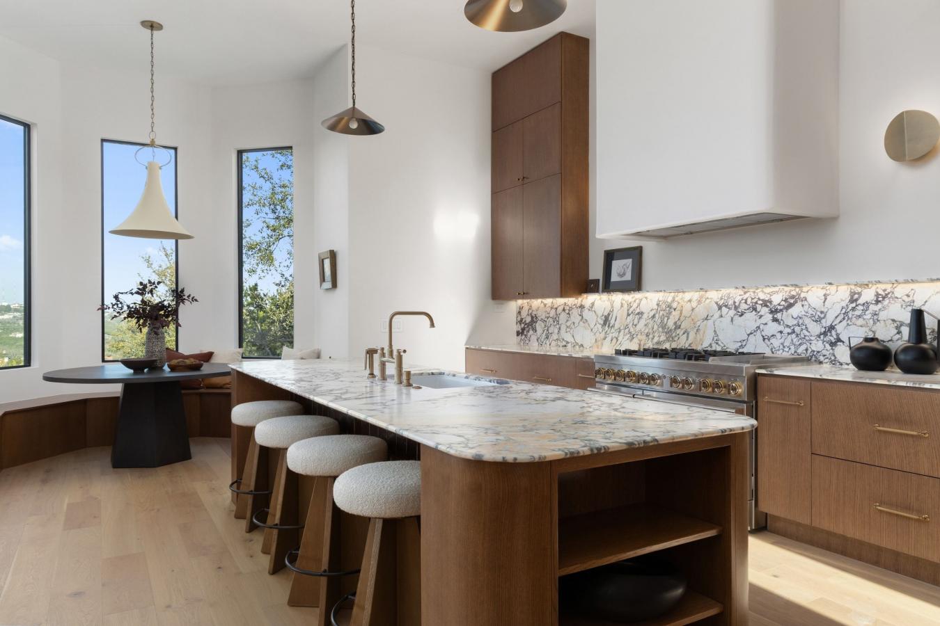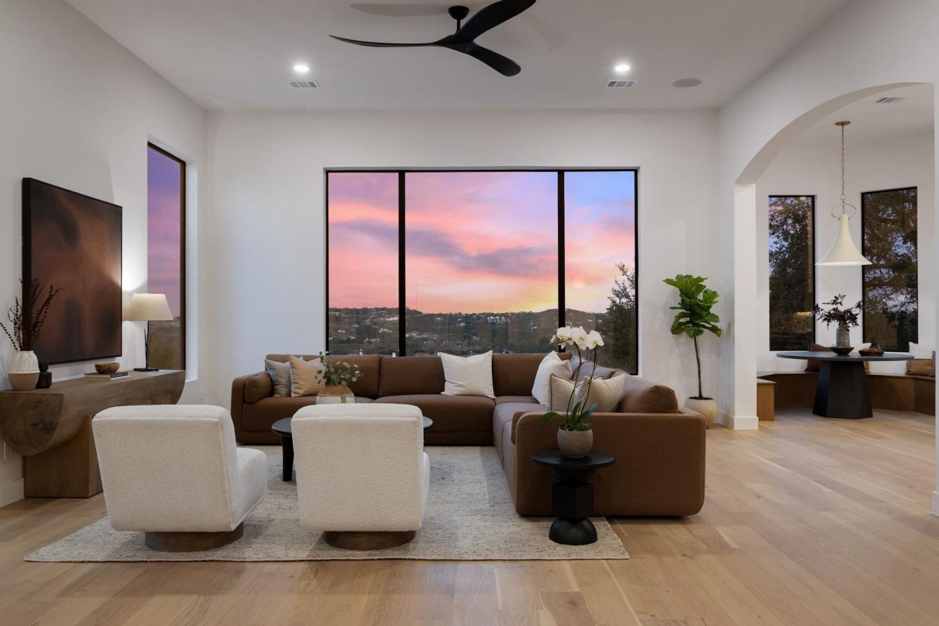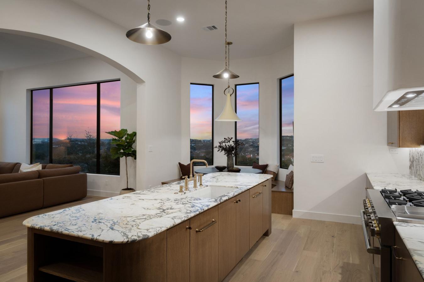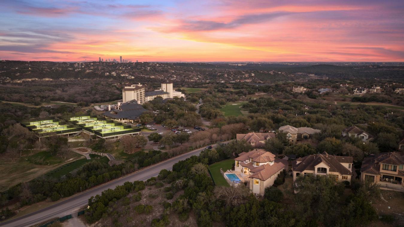 The Villa on Governors Hill is a rare offering in Barton Creek, defined by sweeping 180-degree views, refined design, and exceptional privacy. Set within a secure gated enclave, this residence delivers an elevated lifestyle where sophistication meets everyday comfort. Situated on a .55-acre lot, the fully reimagined 4,147-square-foot home is the result of a 7-figure collaboration between New Edge Renovations and Begonia Designs, with meticulous attention to detail throughout and finishes often reserved for homes twice this price. Wide-plank French white oak floors run seamlessly across the home-no carpet in sight-complemented by custom windows and doors, including striking arched black steel entry and office doors. Designer lighting, updated plumbing fixtures, custom lighting design, and integrated Sonance surround sound by Sonos create a polished, turnkey experience built for both entertaining and effortless living. The oversized heated pool captures panoramic views and has been completely renovated with new heating and cleaning systems, new tile, and fully replastered pool and spa surfaces-delivering a resort-level backdrop for gatherings or sunset evenings. Inside, an open-concept layout flows naturally into a chefs kitchen outfitted with a JennAir appliance package, dedicated wine and beverage refrigeration, and an oversized island topped with Capanelli marble imported from Italy and curated specifically for this home. Custom cabinetry reaches to the top of the 20 ceiling height and conceals a functional butlers pantry with direct access for caterers or those important Costco runs. The pantry features prep space, a wine refrigerator, and a steam/speed oven. With four bedrooms and four baths, including a private study with direct access to the primary suite, the floor plan offers both functional work-from-home flexibility and private retreats for guests. The primary bath is finished top to bottom in micro cement, which is as functional as it is beautiful. Residents enjoy access to community amenities including a clubhouse, pool, and tennis courts, along with a Barton Creek Country Club social membership. World-class golf sits directly across the street. All just minutes from the best of Austins renowned dining, boutique shopping, cultural experiences, and endless outdoor recreation.