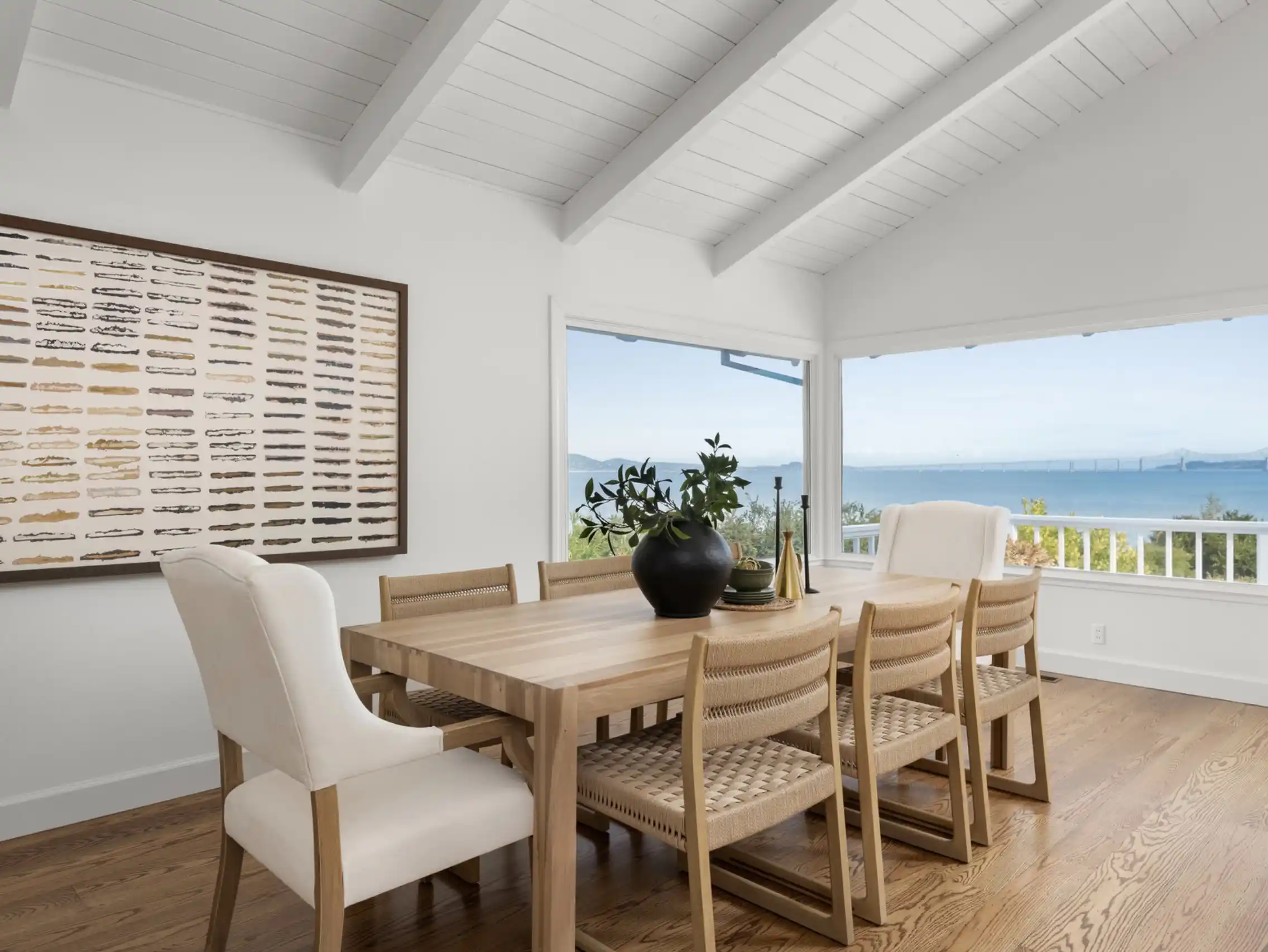 Situated amongst an exclusive enclave of custom homes in the sought-after Seafirth Estates community, this inviting residence offers outstanding outdoor living spaces and incredible water views. This private residence is an entertainer’s dream, featuring beautifully landscaped grounds, a sunny backyard, multiple entertaining spaces, a spacious deck, brick patios and walkways, and beautiful gardens, creating an idyllic setting for both entertaining and everyday living.Beautiful hardwood floors throughout the main living spaces.The open and airy, grand-scale living room is the heart of the residence, showcasing vaulted open-beam ceilings, expansive windows framing panoramic bay views, a gas-start fireplace, and French doors opening to an inviting deck.The spacious kitchen features a large center island with counter seating and a butcher block countertop, skylights, new quartz countertops and backsplash, and a wall of built-in cabinetry with a desk area and abundant storage.Vaulted ceilings with exposed beams extend over the adjacent dining area, where garden views, French doors opening to a brick patio, and a gas-start fireplace create a warm and welcoming everyday gathering space.The spacious primary suite serves as a private retreat, featuring new carpet, crown molding, a gas-start fireplace, a sauna, a walk-in closet, a large primary bathroom, and French doors open to the outdoors with serene bay views.The two additional bedrooms offer wonderful natural light, hardwood floors, ample closet space, and a connecting full bathroom.Attached two car garage and large motor court with parking for multiple vehicles.This unique community offers access to a community pier, an amazing pool and clubhouse, sport court, and a private beach.