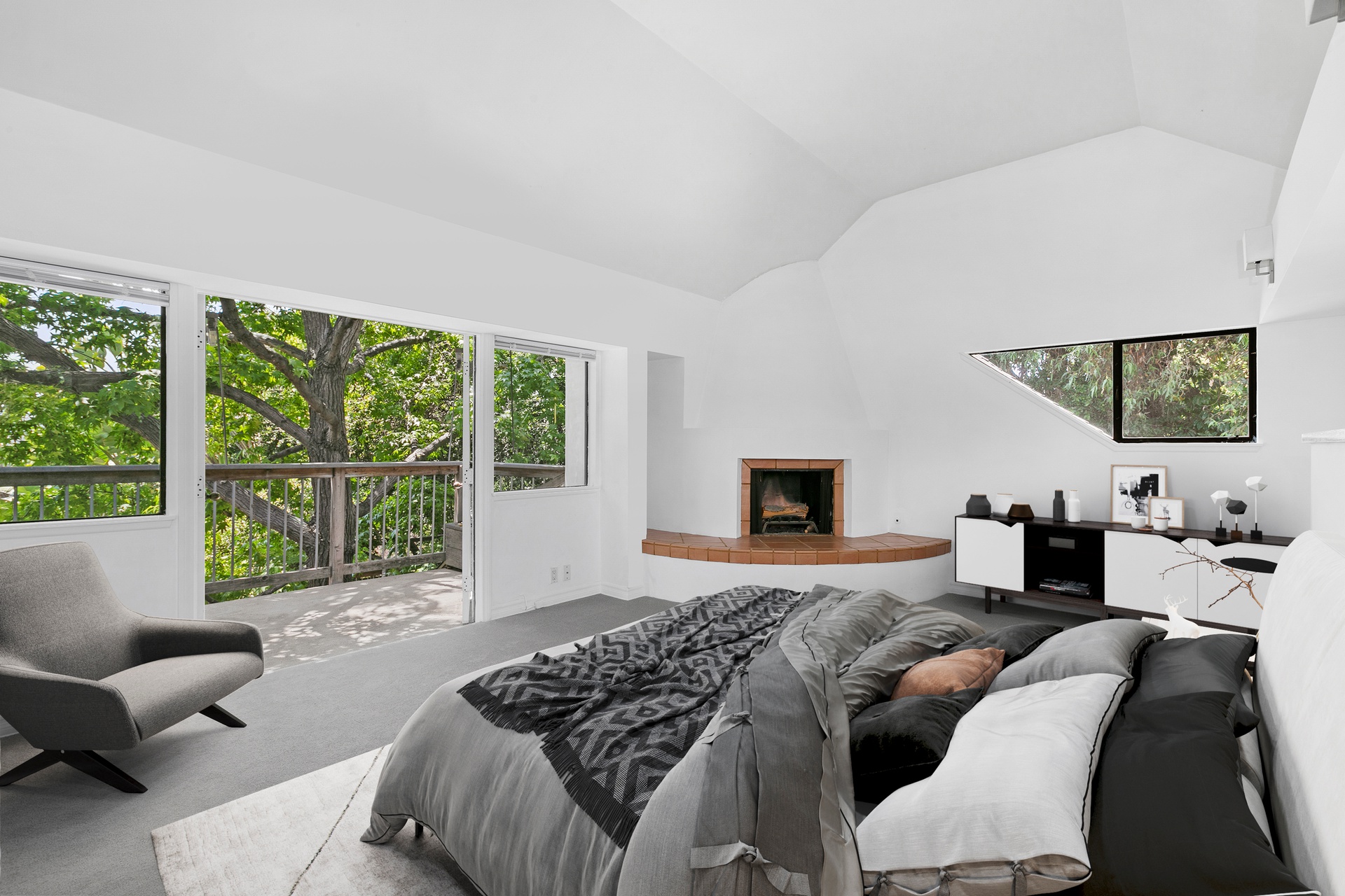Sited behind gates on 1/2 acre of lush grounds and located on exclusive gated Oak Pass Road this home boasts striking mountain and canyon views. Surrounding the inviting pool is a serene natural backdrop, creating a peaceful haven within this expansive 4,000+ square foot abode. Step into the main level and be captivated by its open and spacious design, boasting a charming living, dining, and entertaining room adorned with vaulted ceilings and a central fireplace. The expansive kitchen, perfectly suited for hosting, features a sizable center island, breakfast nook, ample storage, and top-of-the-line Bosch appliances. Two guest rooms on the main level offer hardwood floors and built-in features for comfort and convenience. On the upper level resides the master bedroom with a fireplace, private balcony, ensuite bathroom, and separate closets for him and her. The lower level offers a versatile bonus room, which could be an additional bedroom, playroom, studio or a theater, complete with a private entrance and a convenient 3/4 bath.
