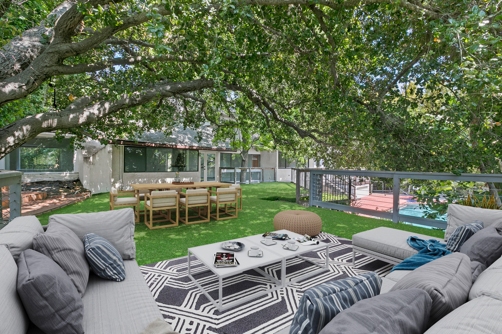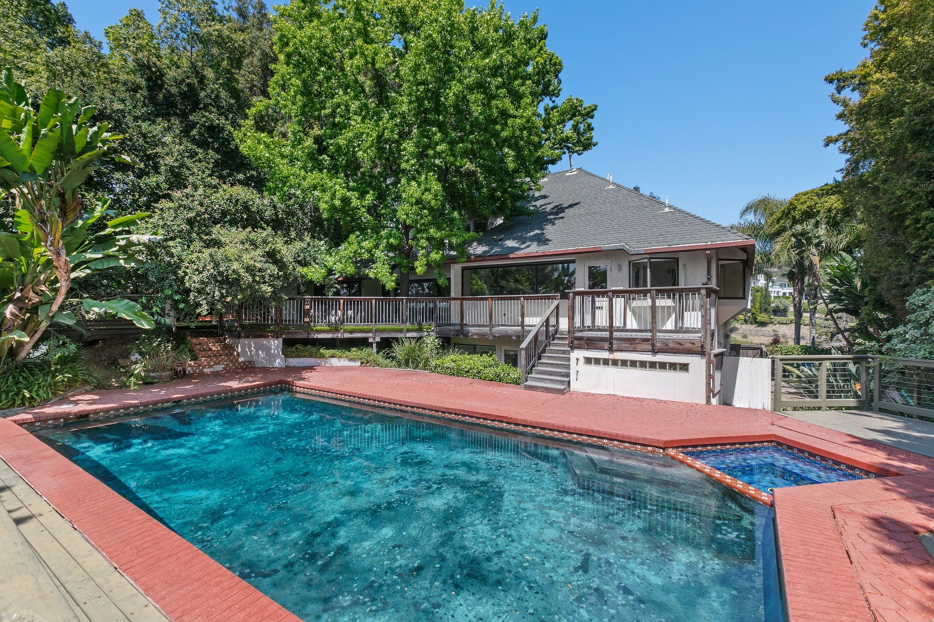 Sited behind gates on 1/2 acre of lush grounds and located on exclusive gated Oak Pass Road this home boasts striking mountain and canyon views. Surrounding the inviting pool is a serene natural backdrop, creating a peaceful haven within this expansive 4,000+ square foot abode.