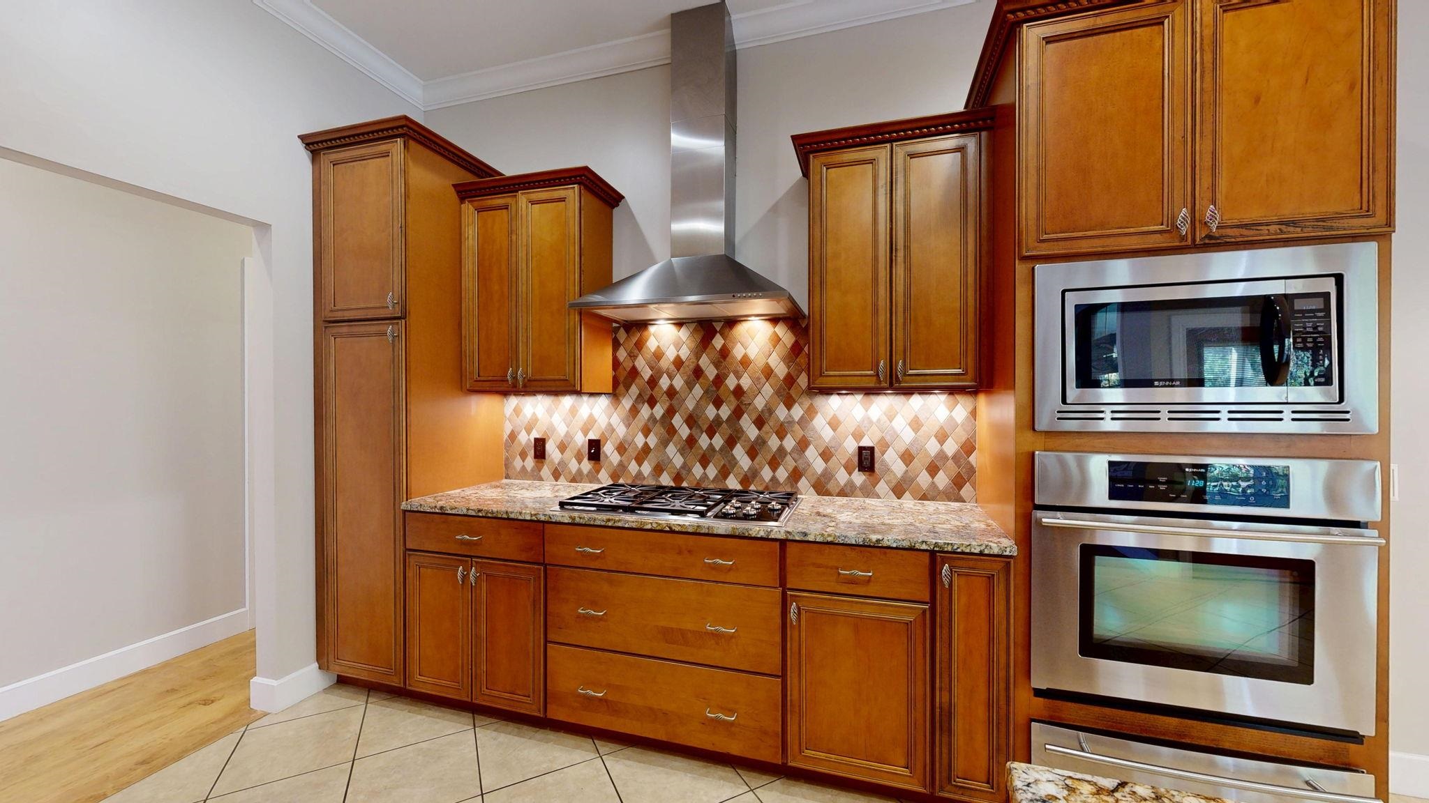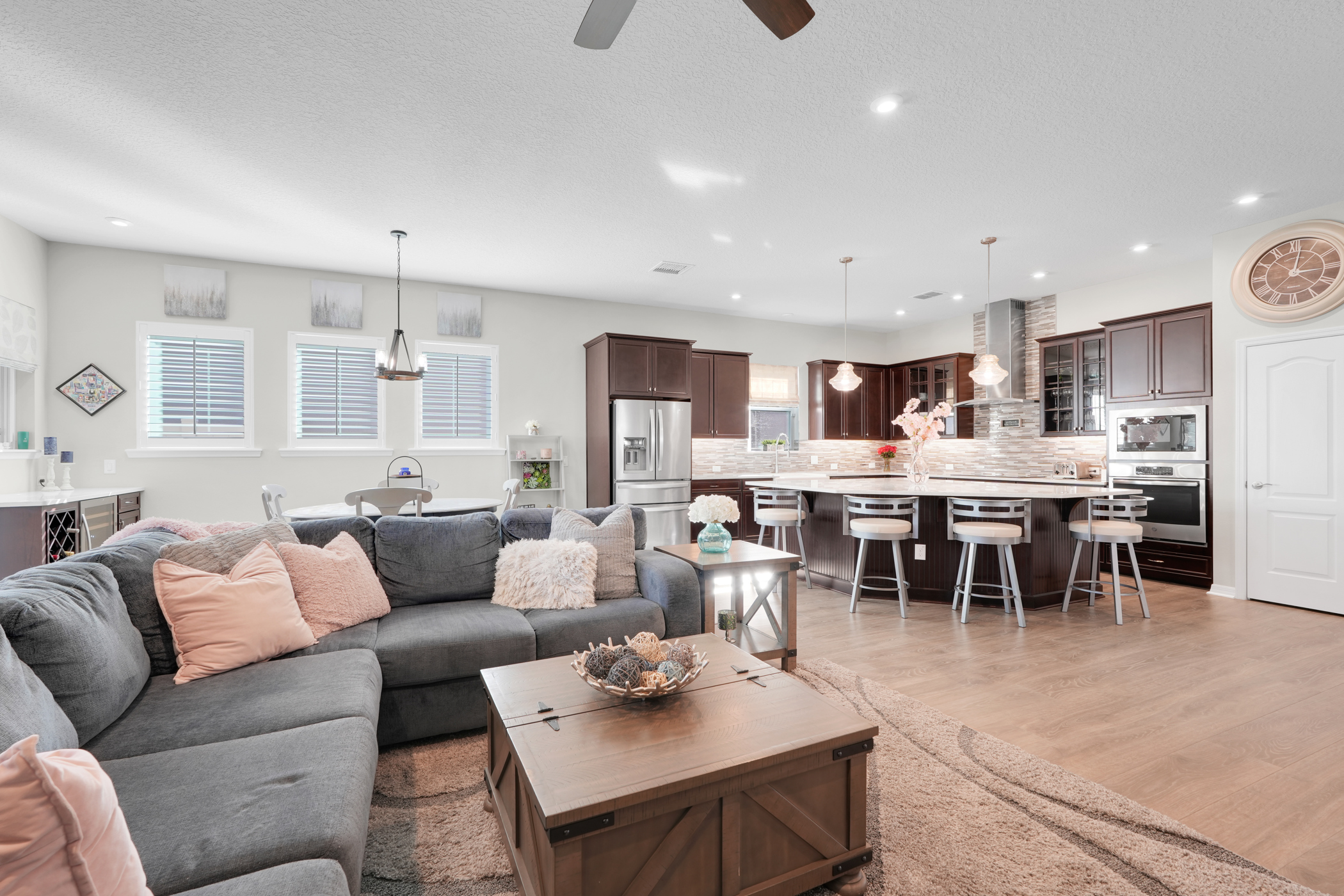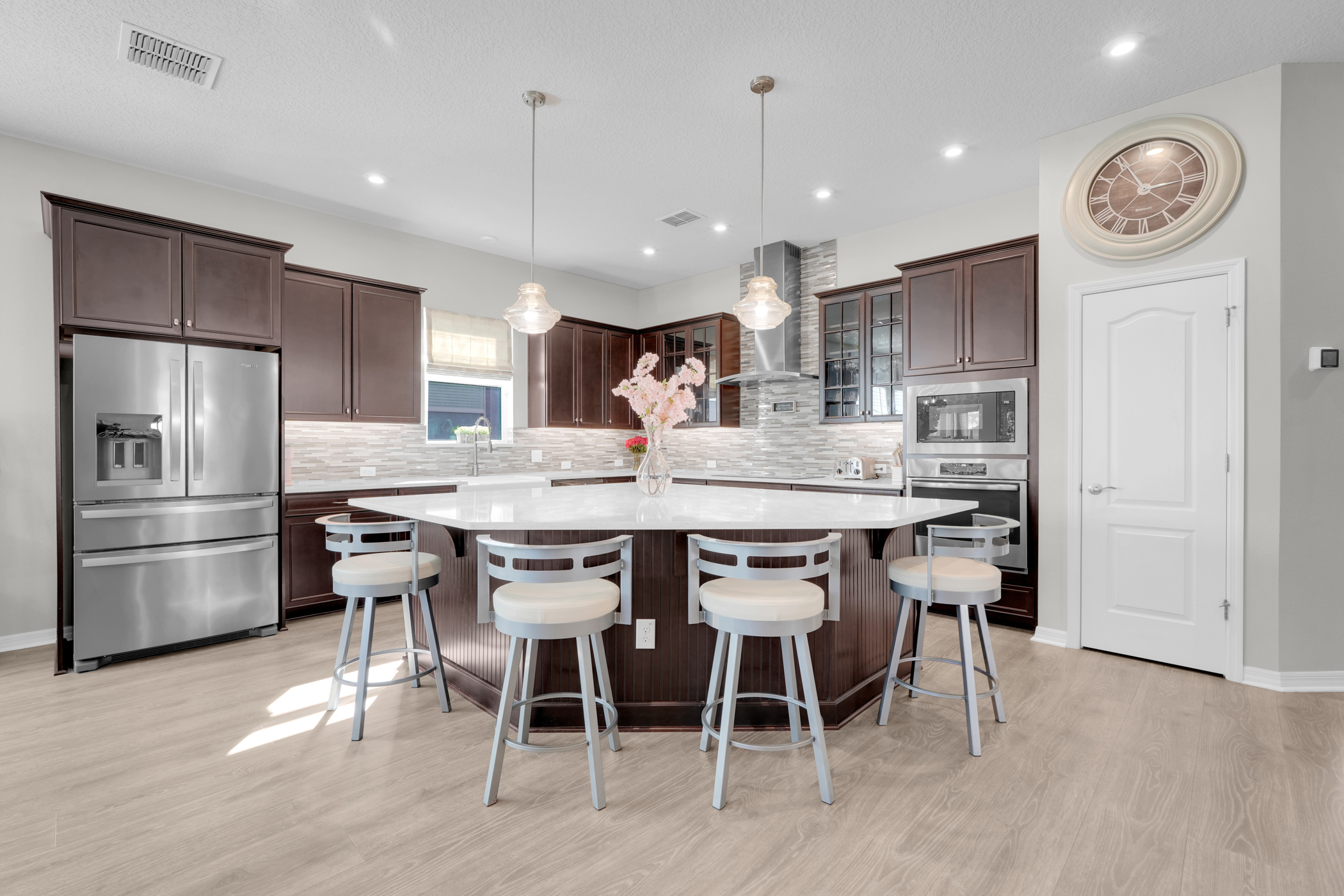 This impressive home boasts 3 bedrooms, 2 baths plus bonus room/ flex space and is located in the highly sought-after John’s Lake Landing community! This beautiful property featuring tall ceilings, architectural archways, plantation shutters and custom window treatments, wood laminate flooring, mud room space, and exterior paint completed in 2025. The home has a bright foyer that opens into a spacious, open-concept design where the living area, kitchen, and breakfast nook blend seamlessly. The gourmet kitchen is thoughtfully designed with elegant quartz countertops, stainless steel appliances including a cooktop and built-in wall oven, statement vent hood, farmhouse sink, custom tile backsplash, and glass-front cabinetry. The adjoining breakfast nook features a built-in wine bar complete with wine refrigerator, creating the perfect for gatherings. The generous primary suite is tucked at the rear of the home offering a relaxing retreat with spa like bathroom featuring dual sinks, an oversized super shower, and a custom walk-in closet. Two additional bedrooms and a full guest bath are at the front of the home, with the guest bath showcasing upgraded tile, a decorative niche, and a glass-enclosed shower. The laundry room includes built-in cabinetry, counter space, and a utility sink for added convenience. Enjoy outdoor living on the screened lanai, equipped with dual ceiling fans and plumbed for an outdoor kitchen. The backyard is prewired for a future pool with a 60-amp electrical pre-wire and outdoor shower connection. Residents of John’s Lake Landing enjoy access to a community pool and playground, all conveniently located near top-rated schools, shopping, dining, hospitals, beautiful lakes, rolling hills and major highways including the Turnpike. Call today for your showing!