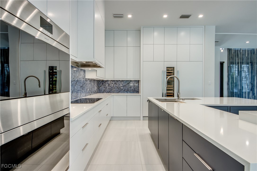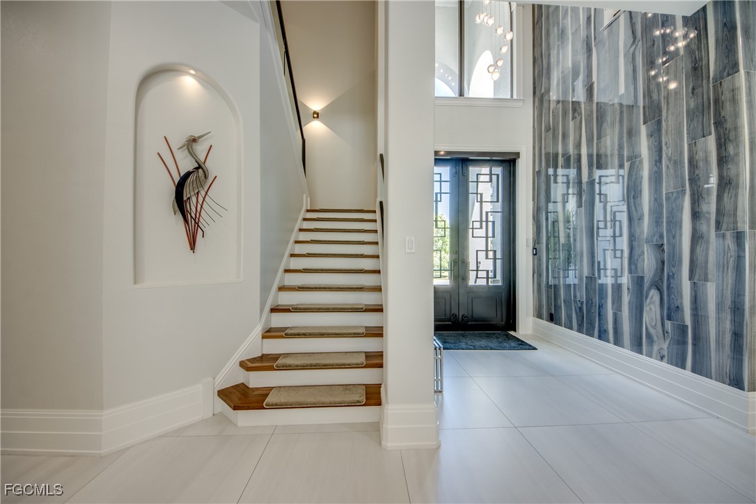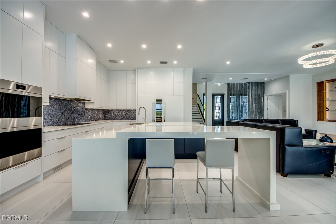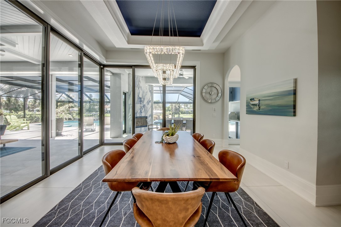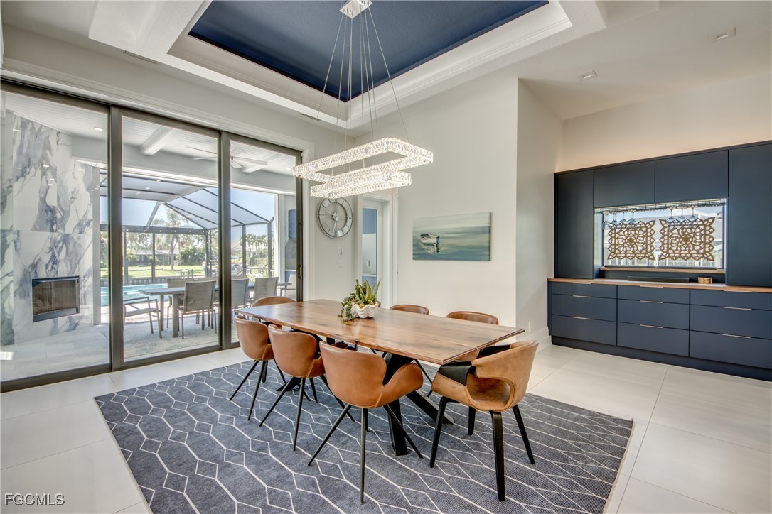 Discover an extraordinary residence that defines luxury living in one of Cape Coral's most sought-after locations. This spectacular 5-bedroom den 2-story Gulf Access property offers nearly 6,000 sq. ft. of meticulously designed living space, sold TURNKEY with exclusive high-end furnishings and curated art pieces.Originally crafted in 2011 by a renowned luxury builder and masterfully renovated with modern upgrades, this estate showcases exquisite materials, including Turkish marble, 50x50 porcelain flooring, 12-foot ceilings, 10-inch custom baseboards, solid core doors, and intricate ceiling details.The expansive great room with gas fireplace flows seamlessly into the dining room and open-concept chef's kitchen, featuring quartz countertops, exclusive backsplash, Wolf appliances, Sub-Zero refrigerator, dual-zone wine fridge, two dishwashers, induction cooktop, butler's pantry with cooling drawers, and a stylish coffee bar.Designed for both comfort and sophistication, the primary suite boasts spa-inspired bathrooms, custom his-and-hers walk-in closets, and motorized window treatments. Guest accommodations include spacious bedrooms with luxury en-suites, plus a second-level game room with kitchenette and sundeck—ideal for hosting.Modern conveniences abound with smart home technology, elevator, smart lighting, AirVac system, three elevated A/C units, and dual electric panels. A huge laundry room with built-in dog wash plus a second laundry room offer everyday practicality with luxury flair.Step outside to your private resort-style oasis: Oversized pool with sun ledge, curved 6x6 spa with knife-edge finish, expansive covered lanai, outdoor gas fireplace, and full outdoor kitchen with commercial-grade hood. The Storm Smart shutters with hidden rails, picture window screen, and oversized pool deck ensure both style and durability.For boating enthusiasts, the private dock with 13,000 lb lift and canopy accommodates vessels up to 27 ft, providing quick Gulf access. Recent updates include a new roof (2023) and garage doors (2024), along with transferable flood insurance at only 1,300/year.This estate represents the pinnacle of Cape Coral living—elegance, innovation, and waterfront luxury combined.