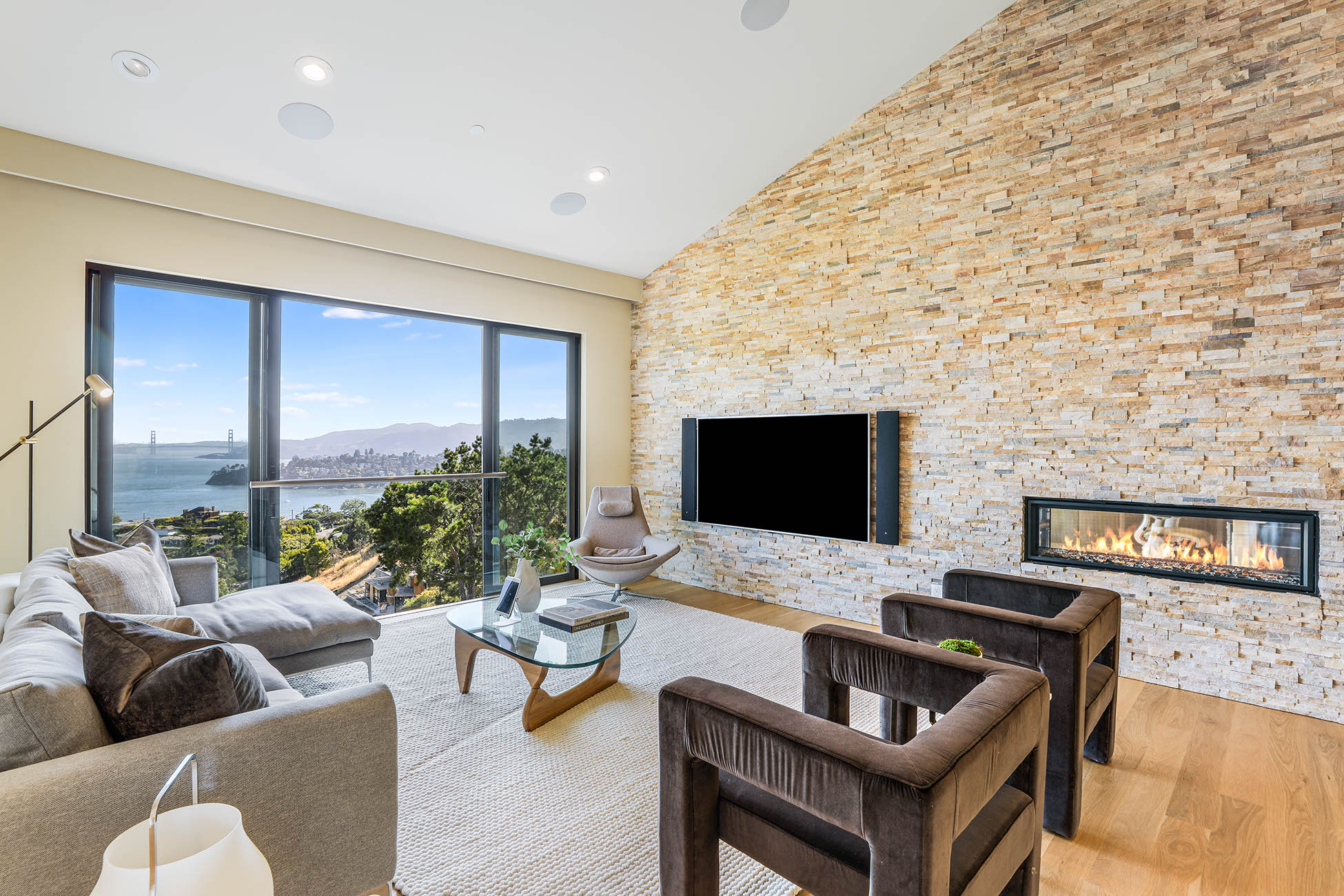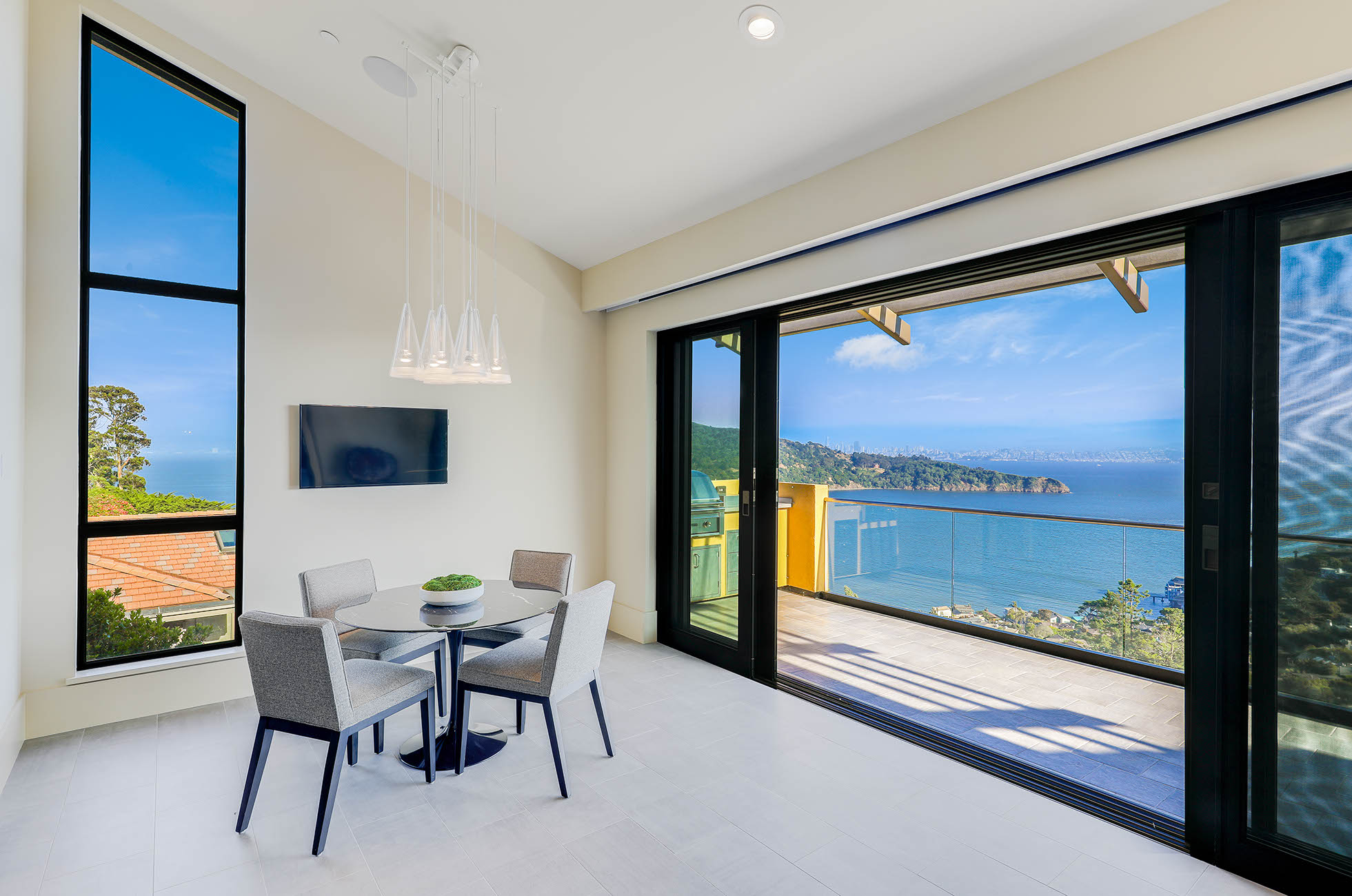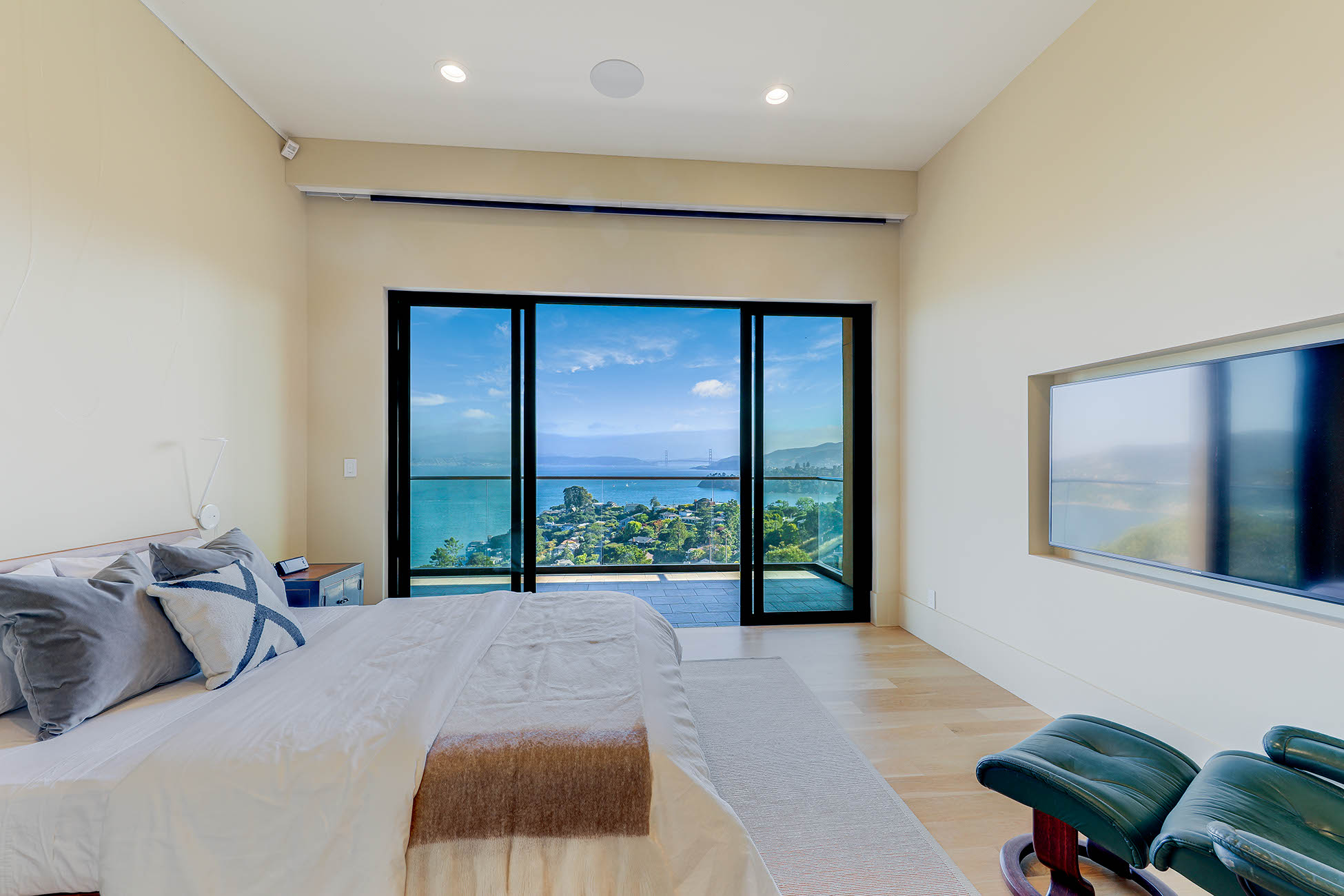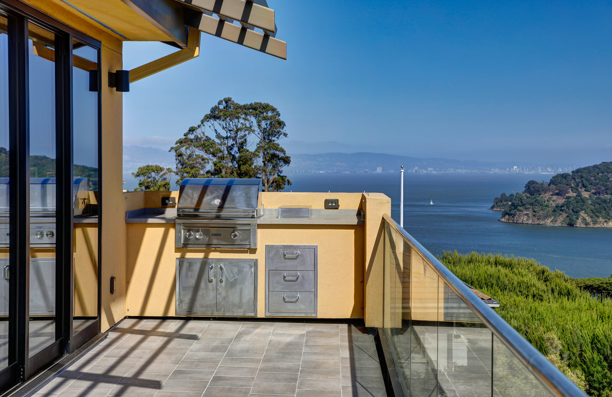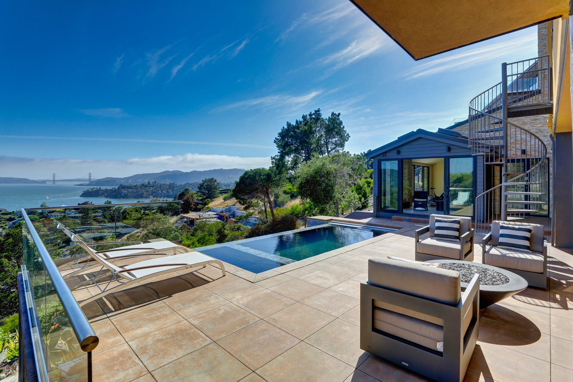 Situated on one of the most exclusive streets on the Tiburon Peninsula, this custom-built residence boasts impeccable design, extraordinary quality, and a paramount location, offering world-class panoramic views spanning San Francisco, the Golden Gate Bridge, Angel Island, to Mount Tamalpais. Constructed from an environmental point of view with the intention of maximizing the surrounding views, this timeless architectural masterpiece showcases incredible attention to detail.Construction completed in 2017 by Kasten Builders.Nothing short of spectacular, the outdoors offer a Bluestone pool with a vanishing edge design and a wave generator, an integrated jacuzzi, private outdoor shower, a gas fireplace, meandering pathways, and drought-tolerant landscaping throughout.The environmentally friendly building materials are recurring themes best exemplified by the widespread use of low-emission concrete, recycled Caesar stone countertops, no exotic wood species, PV solar system, and two 2500-gallon rainwater collection tanks for irrigation.Equipped with cutting edge technology, all features of the home are controlled by Control4 home automation system which includes video and audio in 9 different zones, lighting, heating, alarm system, pool features, electronic shades, and video surveillance.The dining room, kitchen, and office/family room feature sliding glass doors that slide away to provide seamless access to the terrace and stunning views.The sophisticated living room was thoughtfully designed featuring an intricate floor-to-ceiling ledgestone accent wall with a stunning double-sided linear gas fireplace, an LED TV, surround sound system with double subwoofer system, and sliding glass doors perfectly framing views of the Golden Gate Bridge and the bay.Grand-scale in design, the sleek, open kitchen is outfitted with vaulted ceilings, skylights, recycled Caesarstone countertops, recessed lighting and Flos Fucsia Pendants, a large center island with seating for 5, a rotating glass-window wood stove, and high-end appliances; Gaggenau induction stove, steam oven, standard oven, microwave, wine fridge, coffee maker, warming drawer, Sub-Zero refrigerator and freezer, a Miele extra quiet model dishwasher, and a walk-in pantry with an additional freezer.The casual dining area leads to the entertainment terrace featuring a built-in gas BBQ and stove, and unparalleled views of Angel Island, San Francisco, the Golden Gate Bridge, and the bay.Ideal for hosting intimate dinners or large gatherings, the formal dining room seamlessly connects with the living room, kitchen, and entertainment terrace; an original Brand van Egmond modern-art chandelier completes this beautifully designed space.The private office/family room on the main level features a desk computer-to-TV display set up, surround system with subwoofer, an intricate floor-to-ceiling ledgestone accent wall, Artemide Pendants, and a view terrace.Retreat to the lower floor and enjoy the serene sanctuary of the primary suite, with stunning views, a private covered terrace, an intricate floor-to-ceiling ledgestone accent wall, and an impressive custom closet with a Louis Poulsen Pendant. The lavish spa-style primary bathroom features a jacuzzi bathtub, a steam shower, swiss-made mirror cabinets, a towel warming rack, and a spiral staircase leading to the exercise room.The spacious in-law-unit (4th bedroom) with its own private outdoor entrance features a patio, a bathroom with a shower/tub combination and towel warming racks, a covered terrace, and a kitchenette with a Miele dishwasher, Perlick drawer fridge, and a Bosch microwave cooking oven; the interior door can be locked from both sides, making it ideal for live-in personnel, an au-pair, or guests.The two additional bedrooms offer spectacular views, wonderful natural light, and a beautiful shared bathroom with a large stall shower; one of the bedrooms has a staircase that leads to the pool and rear yard.2 car garage with elevator access to all levels of the residence.Laundry room with built-in cabinetry, a sink, and washer/dryer.This one-of-a-kind custom residence offers a modern balance of quality, elegance, and environmental efficiency. An outdoor person’s dream with the finest mountain top trails in Marin County only moments away. Located 5 minutes down the hill to Tiburon’s Shoreline Park and Main Street with San Francisco and Angel Island ferry service, trendy new restaurants and shops including the new Michael Mina Bungalow Kitchen, Squalo Wine Bar, Malibu Farm, Caviar Co. tasting cafe and Sam’s Anchor Cafe. Whether site seeing, dining, or commuting, you are sure to enjoy the seaside lifestyle of the Belvedere Tiburon Peninsula.*NOTE: Personal art collection included in the price - details upon requestAdditional Features and Improvements:• Control 4 Home Automation System - This system allows the following features to run through one unified interface: video and audio in 9 different zones (including audio on the pool deck) lighting, heating, alarm system, pool features, electronic shades on all South facing windows (and additionally black-out shades in the bedrooms), video surveillance and entrance gates. This system is accessed and controlled through the Control 4 smartphone app, the dedicated iPads, programmed keypad switches, and dedicated remote controls• Security System - Alarm system with motion sensors are installed throughout the home with additional security cameras installed on the exterior and in some parts on the home• Energy Security - An emergency off-grid electric supply is provided by the transformer-less SMA inverter, providing power to phones/computers and the refrigerator during the daytime while keeping energy consumption at a minimum• Solar Panels - 6.8kW PV solar system on the roof• Rain Water Collection Tanks - two 2,500 gallon rainwater collection tanks are used for the garden irrigation• Automated Smart Irrigation System - Drought tolerant landsca